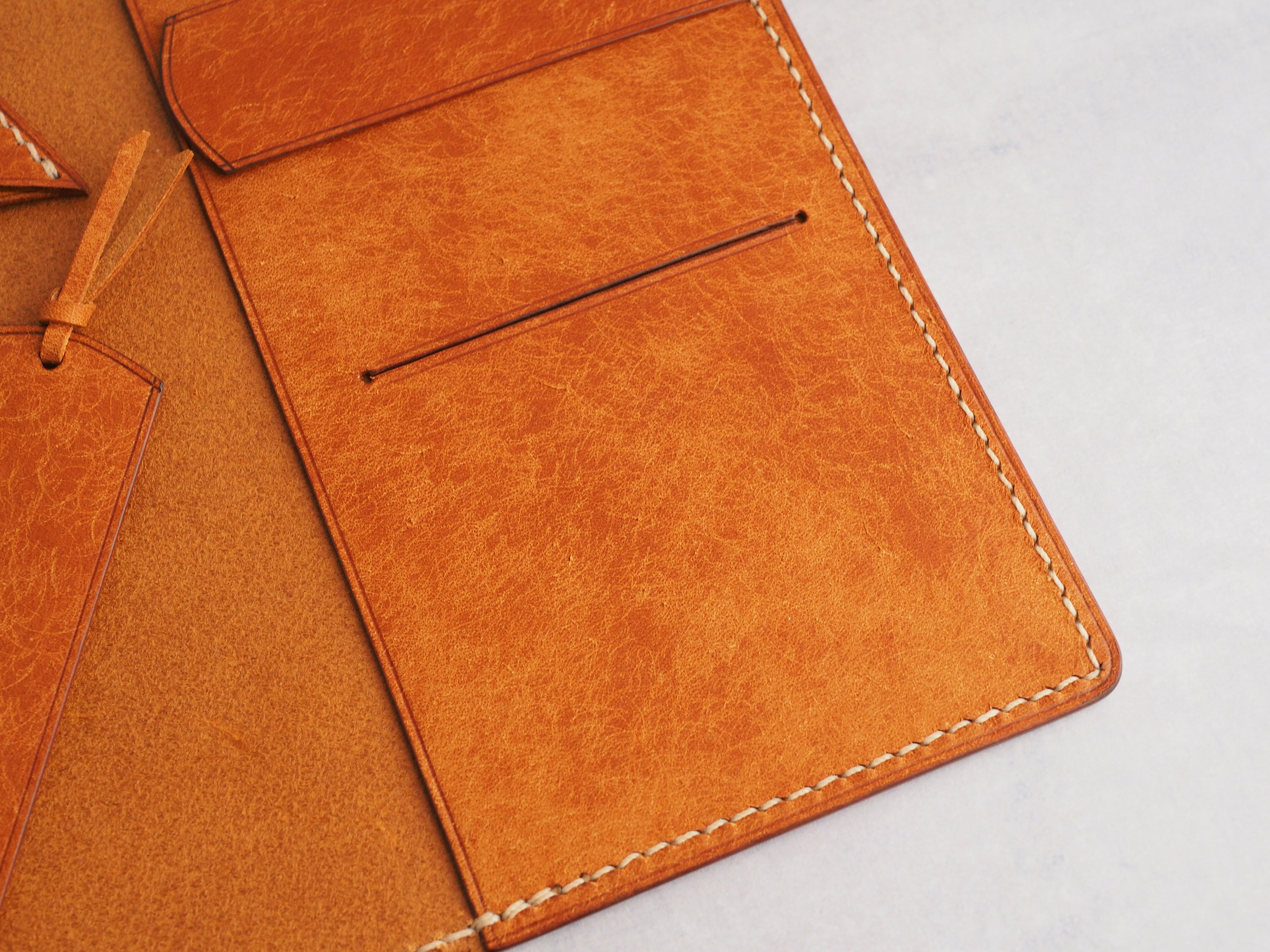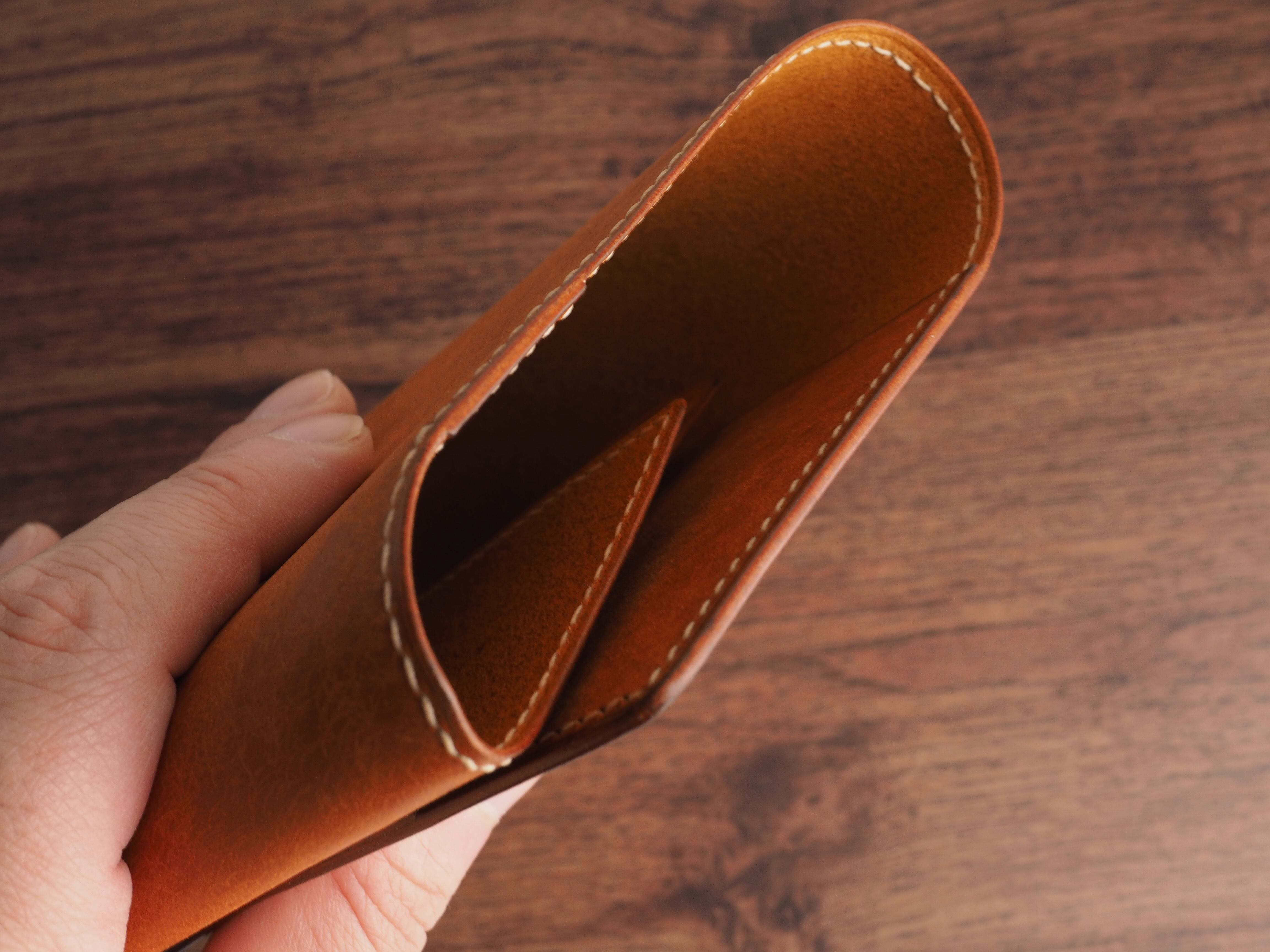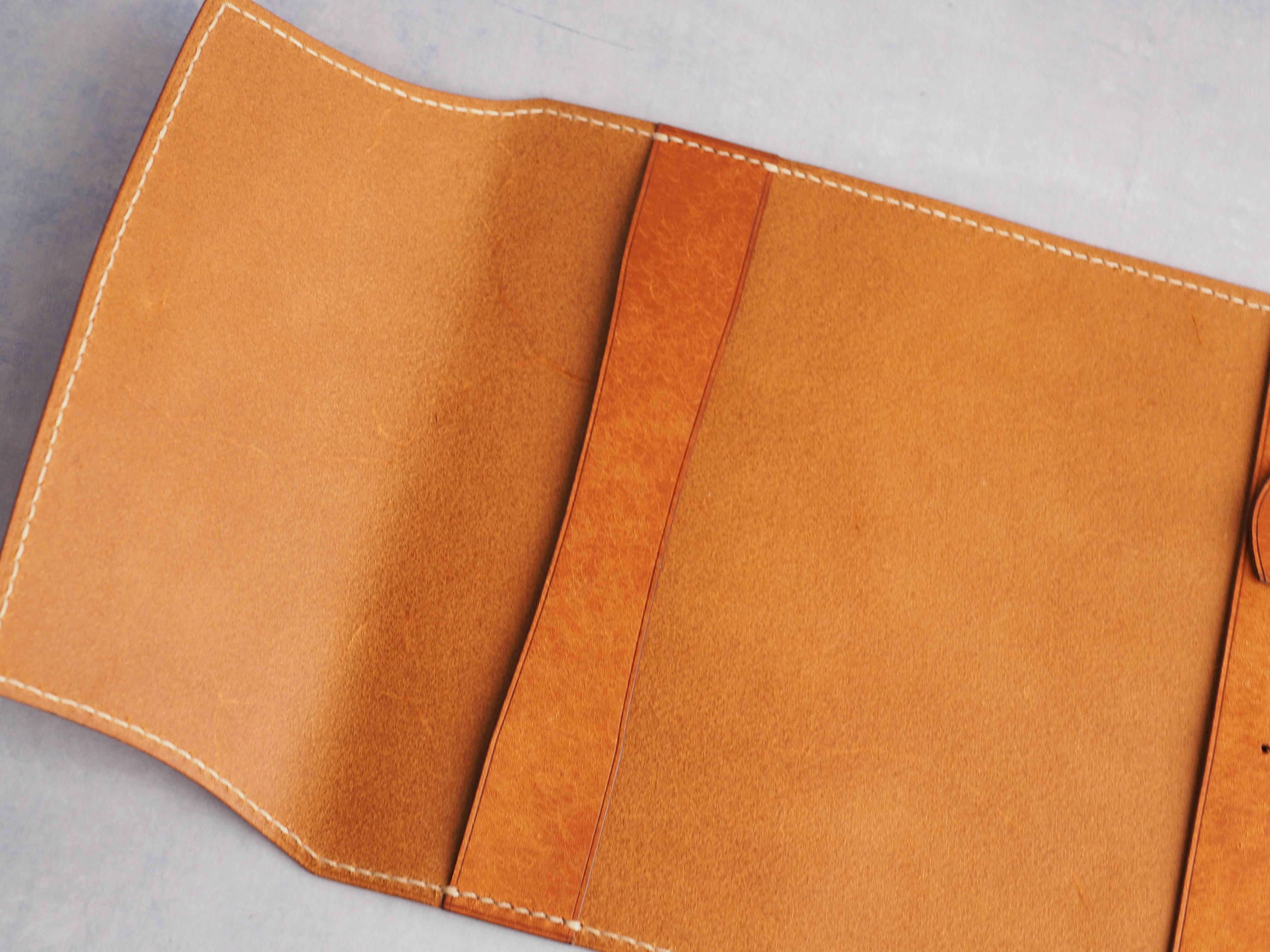 コバは植物性のロウを含む磨き剤を使い、周囲に飾り稔を施しています。手縫いで周りを一手一手縫うことで補強、伸び防止、装飾の効果があります。
