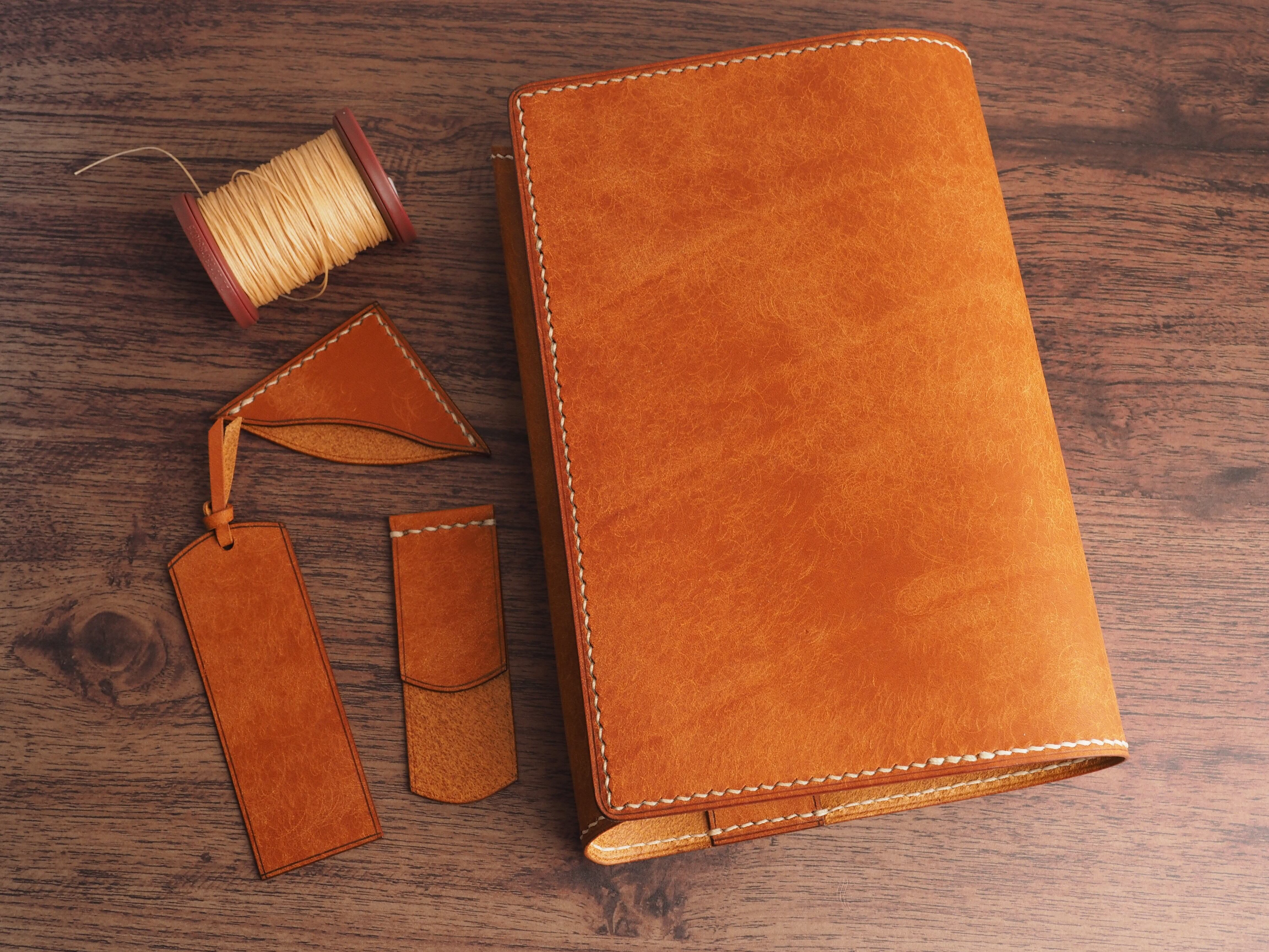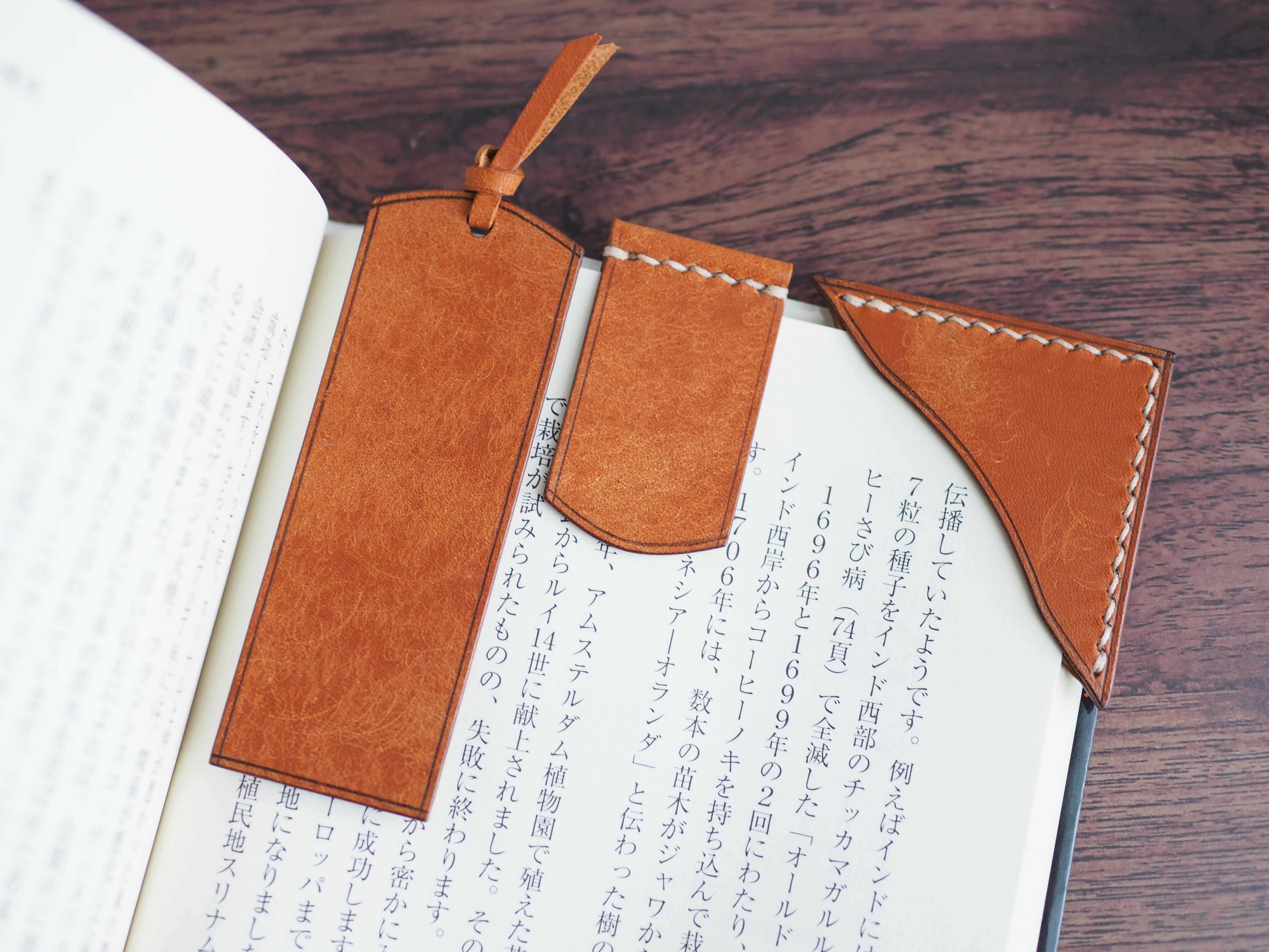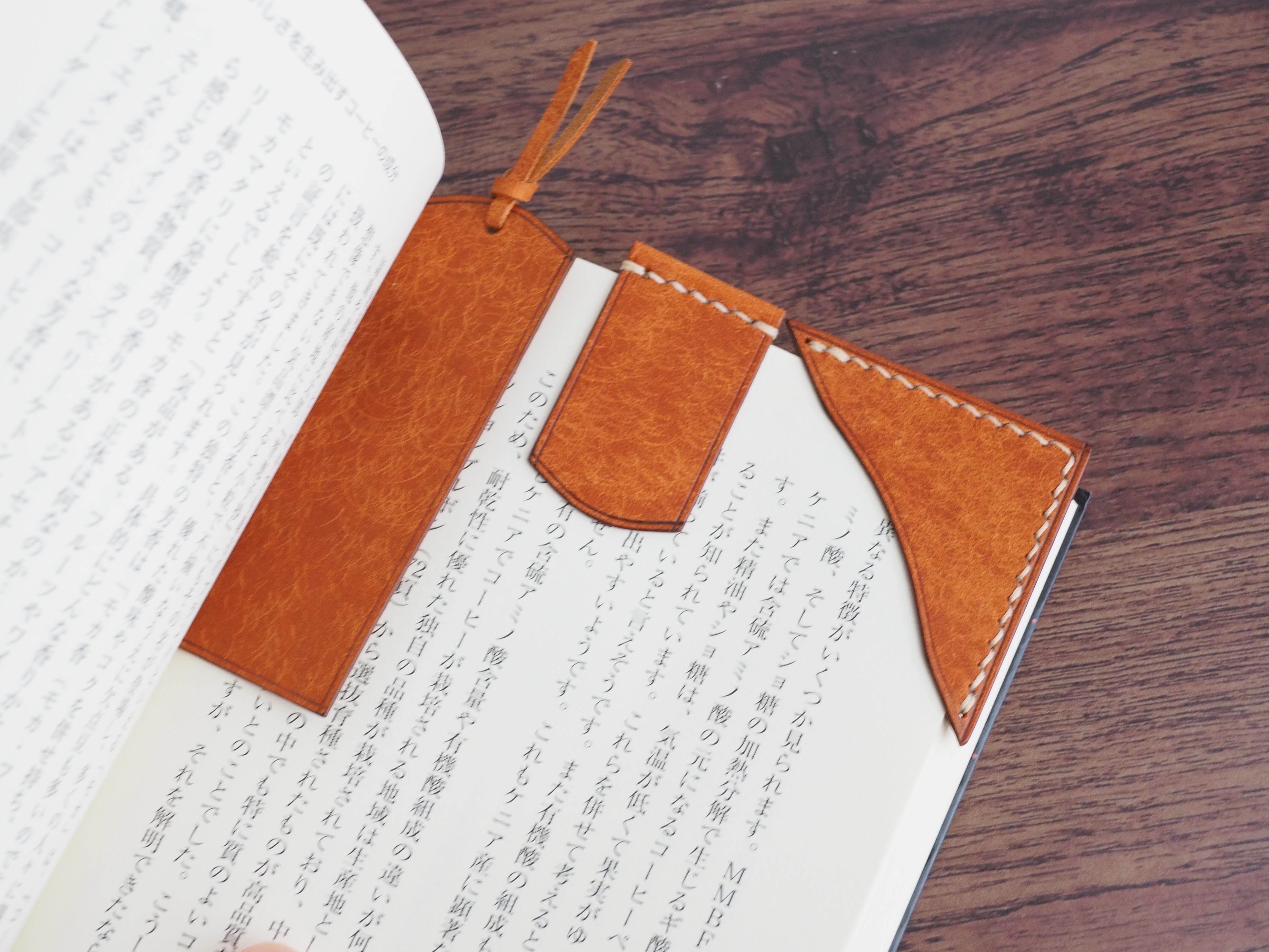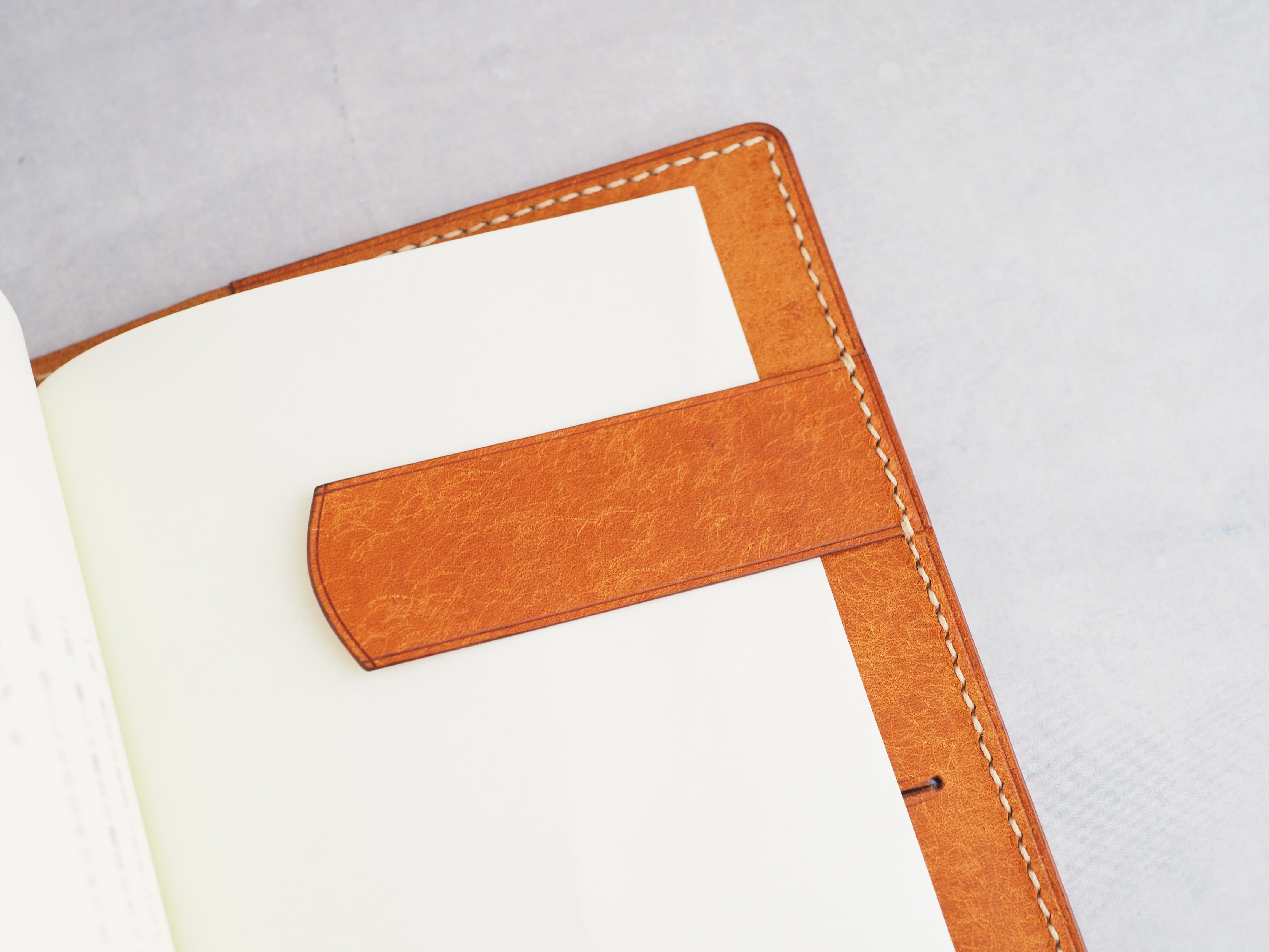 イタリアンレザーマルゴー、フィエーノ(キャメル)を使用した文庫本用のブックカバーになります。新型のハヤカワ文庫(15.6cm)は未対応です。本体備え付けの帯状のブックマークと今回は形、付ける場所の違う3種類のブックマークを付属しています。自分好みの読書スタイルを選んでいただけるようにです。初めての方にも革に触れる機会を増やそうと思い扱いやすいように設計しました。革は1ミリ前後の厚さのものを使用おり、首や肩周り、背中から切り出しています。よく動かす部位であるため革の表面にトラ(皺が虎の模様に見えるため)が入りやすい部分です。しなやかで丈夫なためお腹側に比べて強度があります。今回は革の素材感を生かすためにあえてシワ等を避けずに使用しています。こういったトラや血筋は革の魅力の一つであり、一部の方々に大変人気があります。自分好みのトラ模様を探す人、血筋の個体差を楽しむ革好きの方が増えているようです。