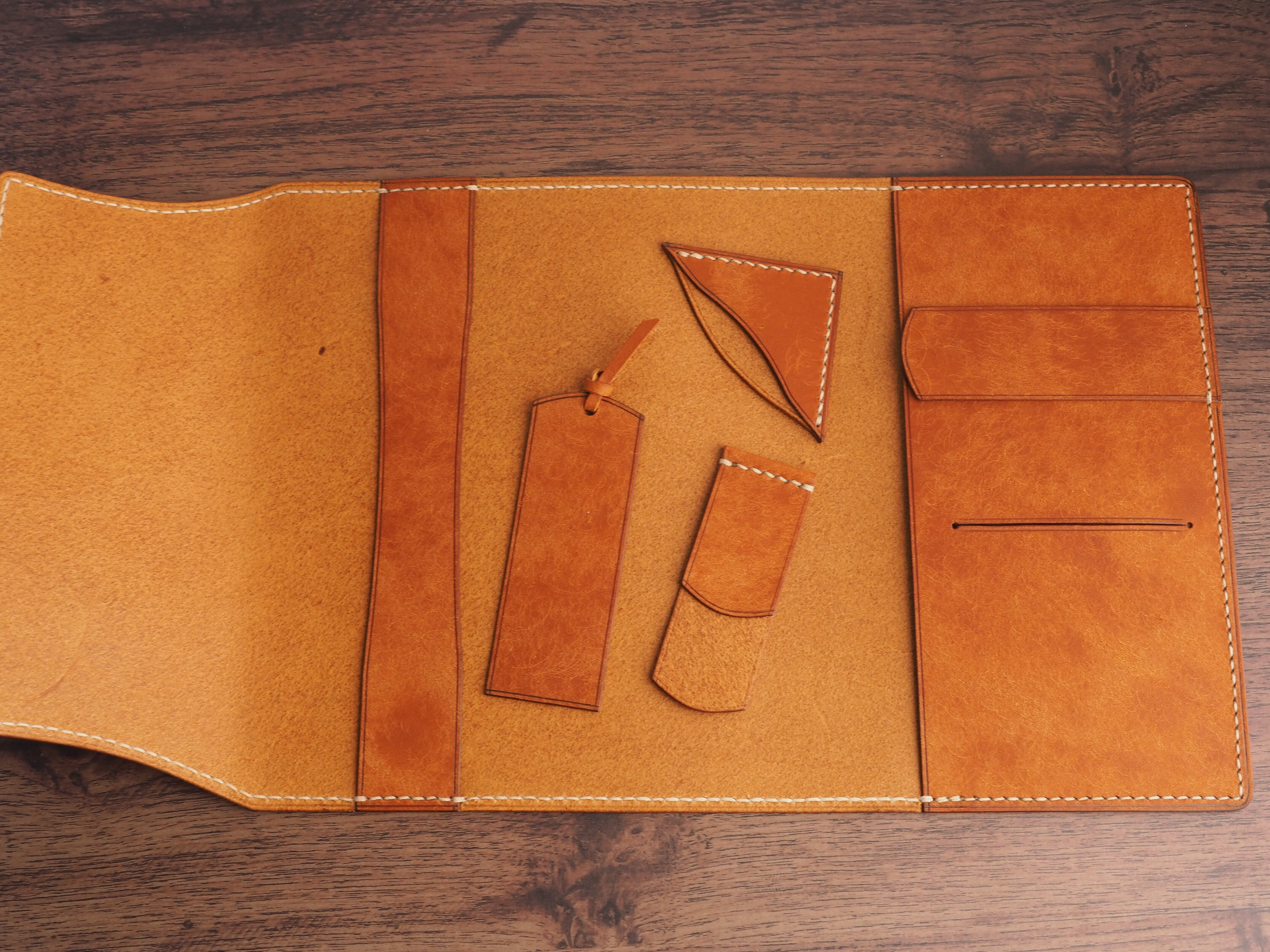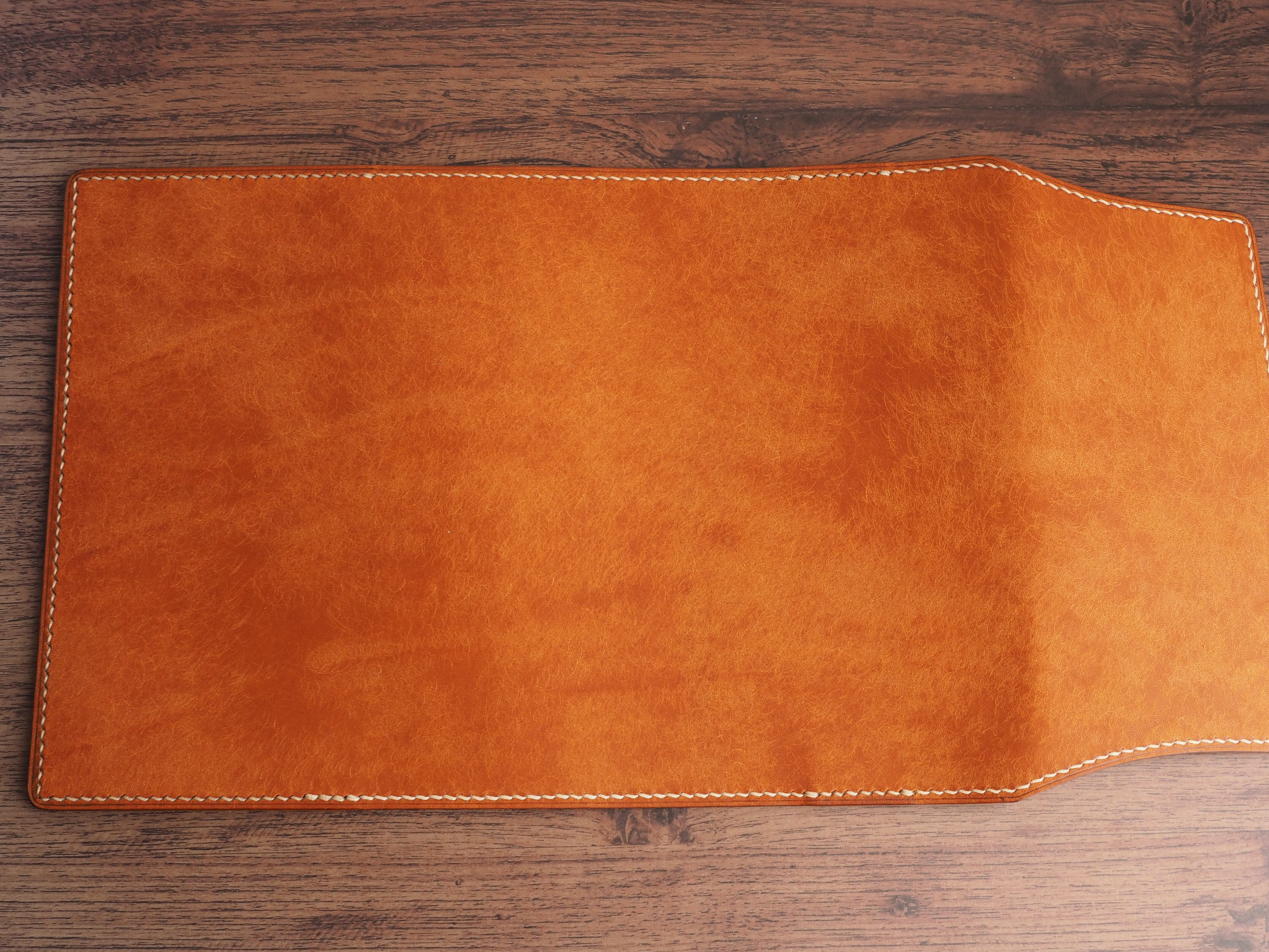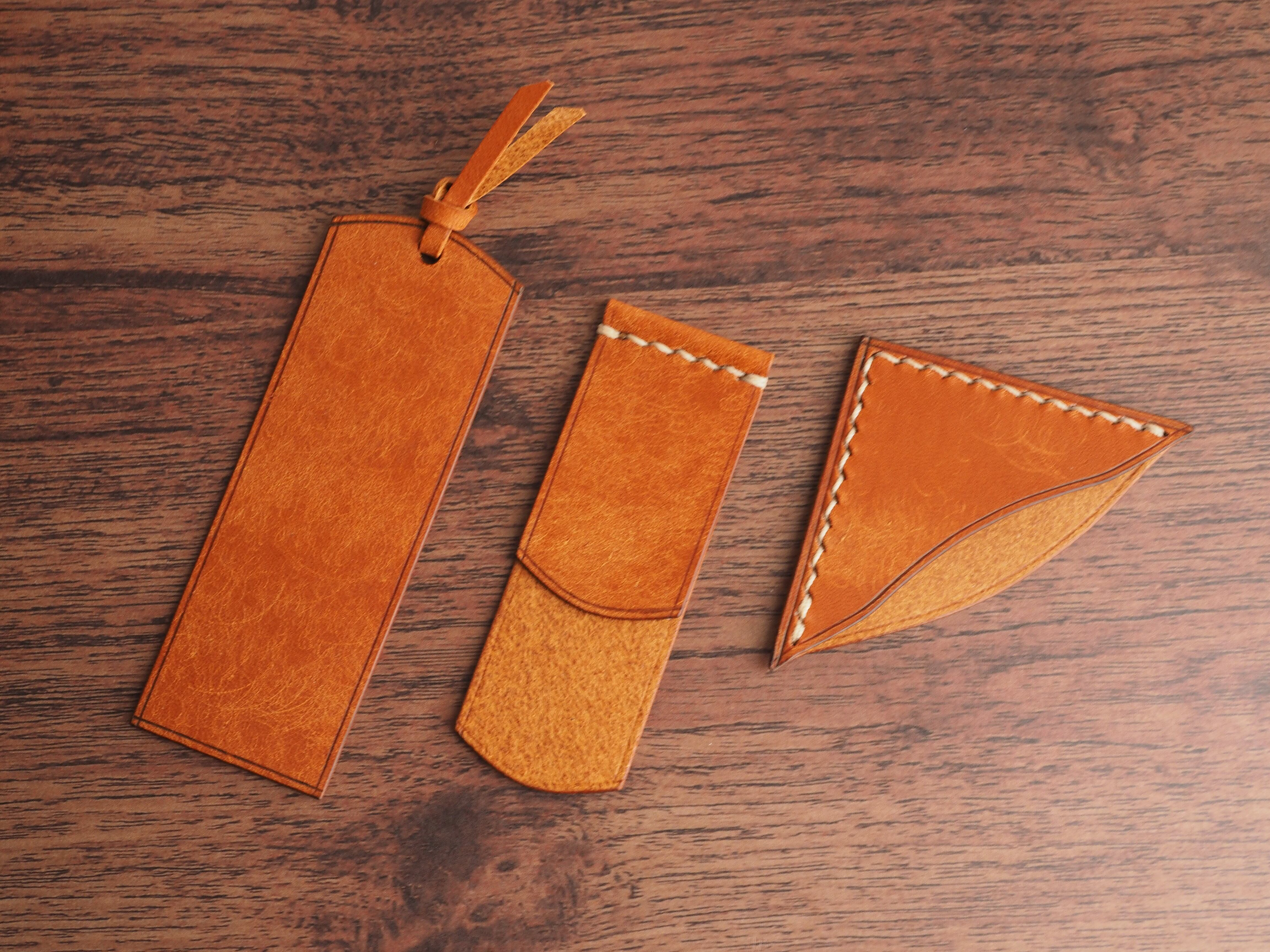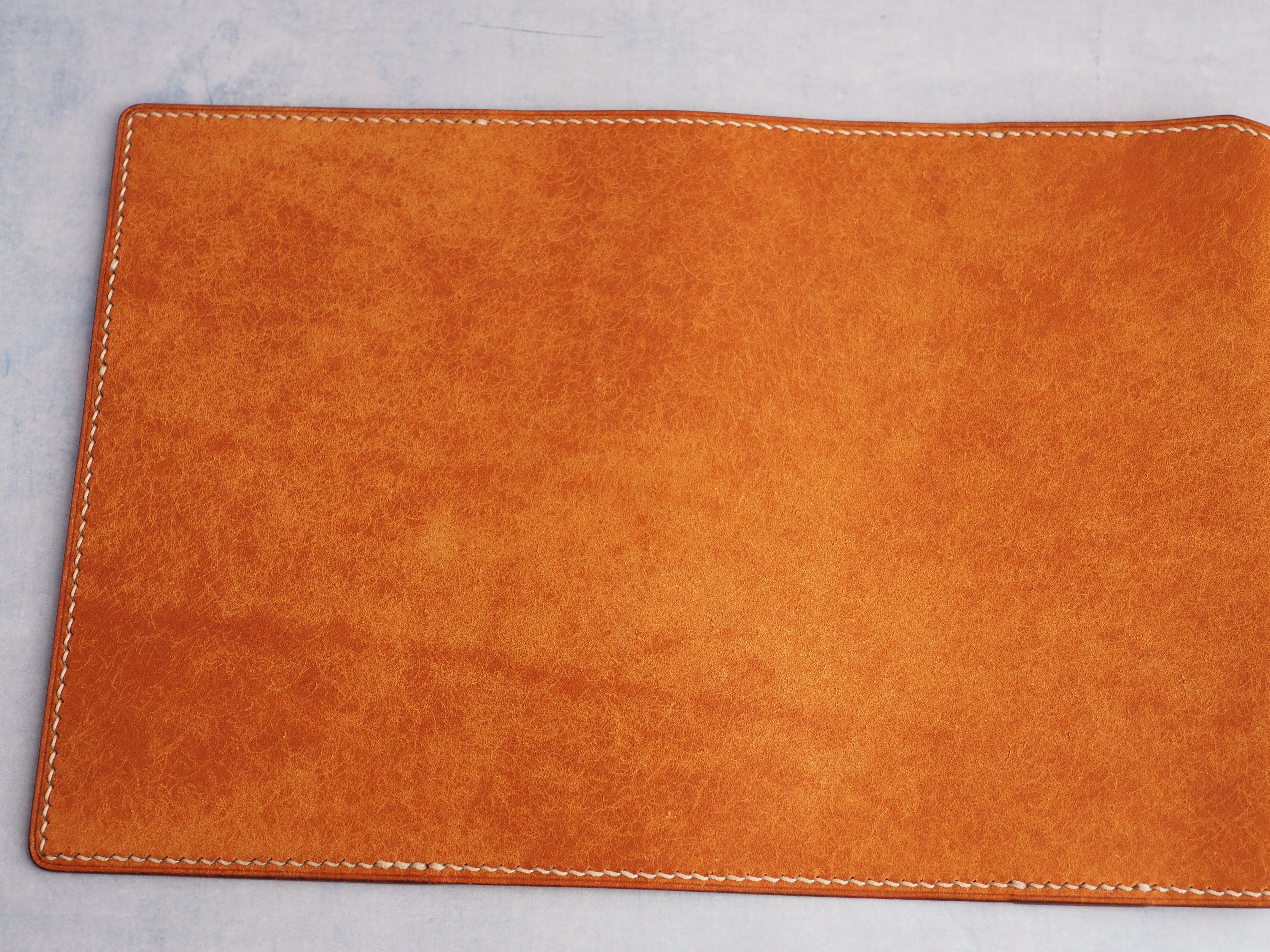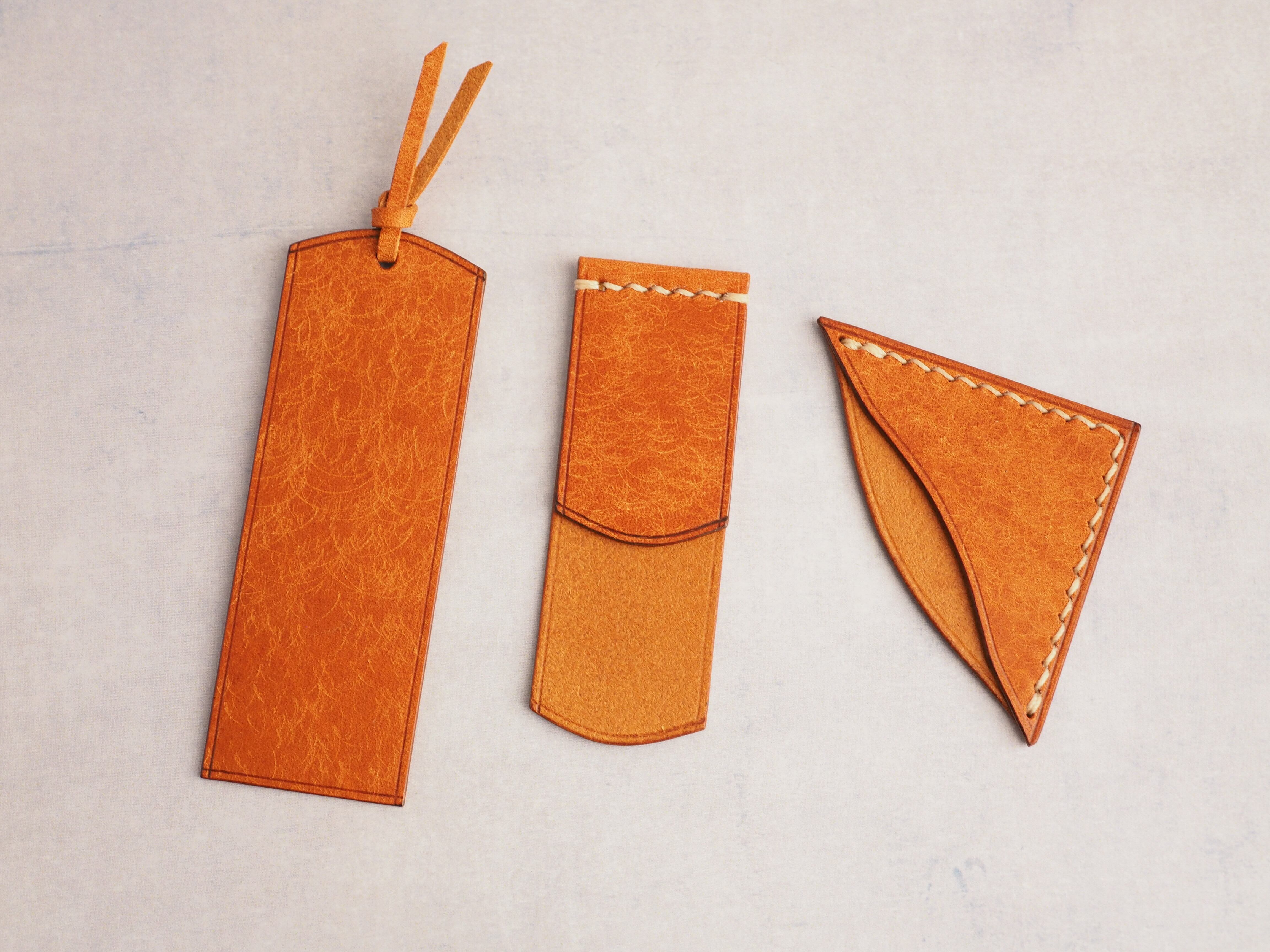 イタリアンレザーマルゴー、フィエーノ(キャメル)を使用した文庫本用のブックカバーになります。新型のハヤカワ文庫(15.6cm)は未対応です。本体備え付けの帯状のブックマークと今回は形、付ける場所の違う3種類のブックマークを付属しています。自分好みの読書スタイルを選んでいただけるようにです。初めての方にも革に触れる機会を増やそうと思い扱いやすいように設計しました。革は1ミリ前後の厚さのものを使用おり、首や肩周り、背中から切り出しています。よく動かす部位であるため革の表面にトラ(皺が虎の模様に見えるため)が入りやすい部分です。しなやかで丈夫なためお腹側に比べて強度があります。今回は革の素材感を生かすためにあえてシワ等を避けずに使用しています。こういったトラや血筋は革の魅力の一つであり、一部の方々に大変人気があります。自分好みのトラ模様を探す人、血筋の個体差を楽しむ革好きの方が増えているようです。