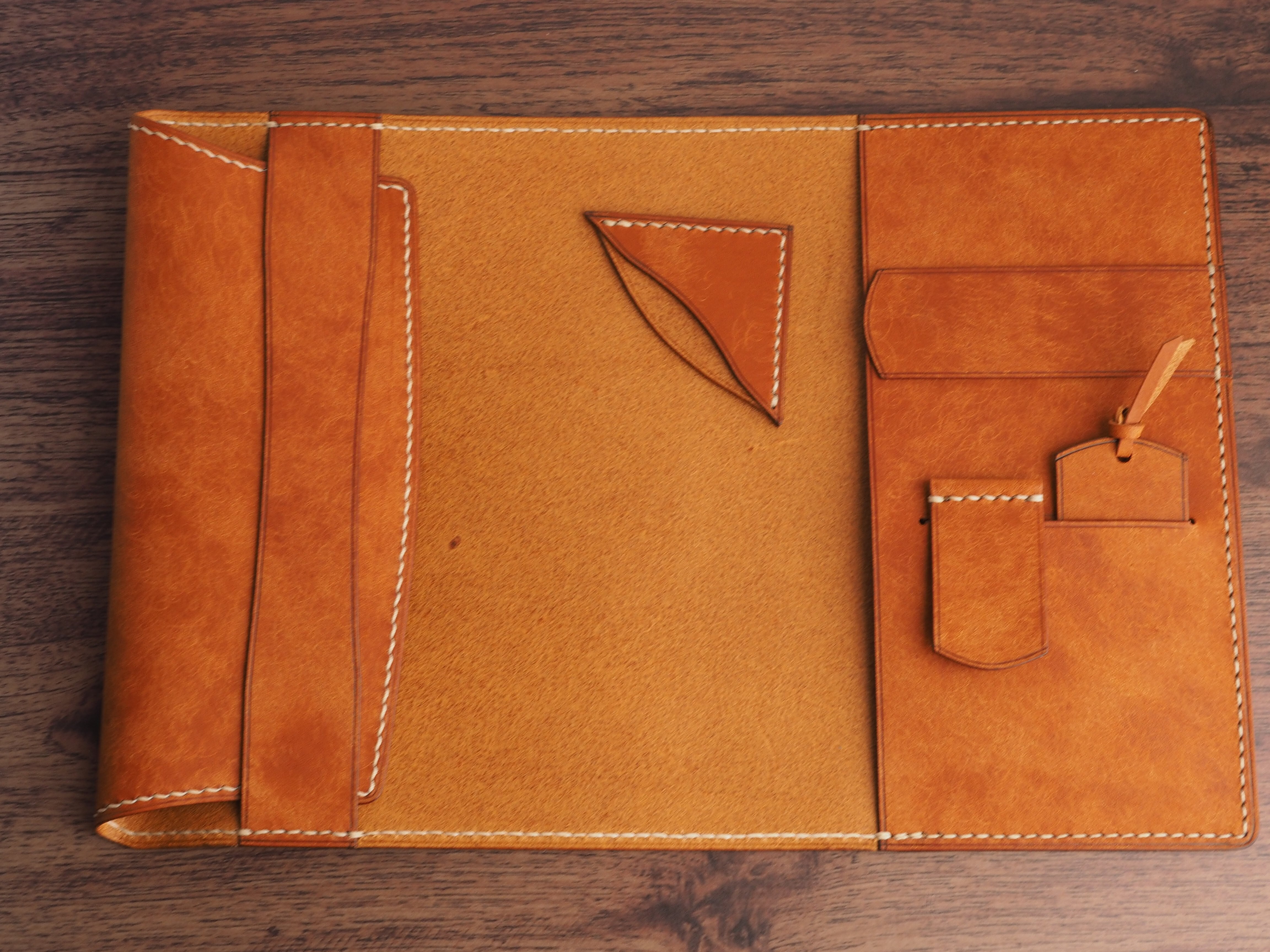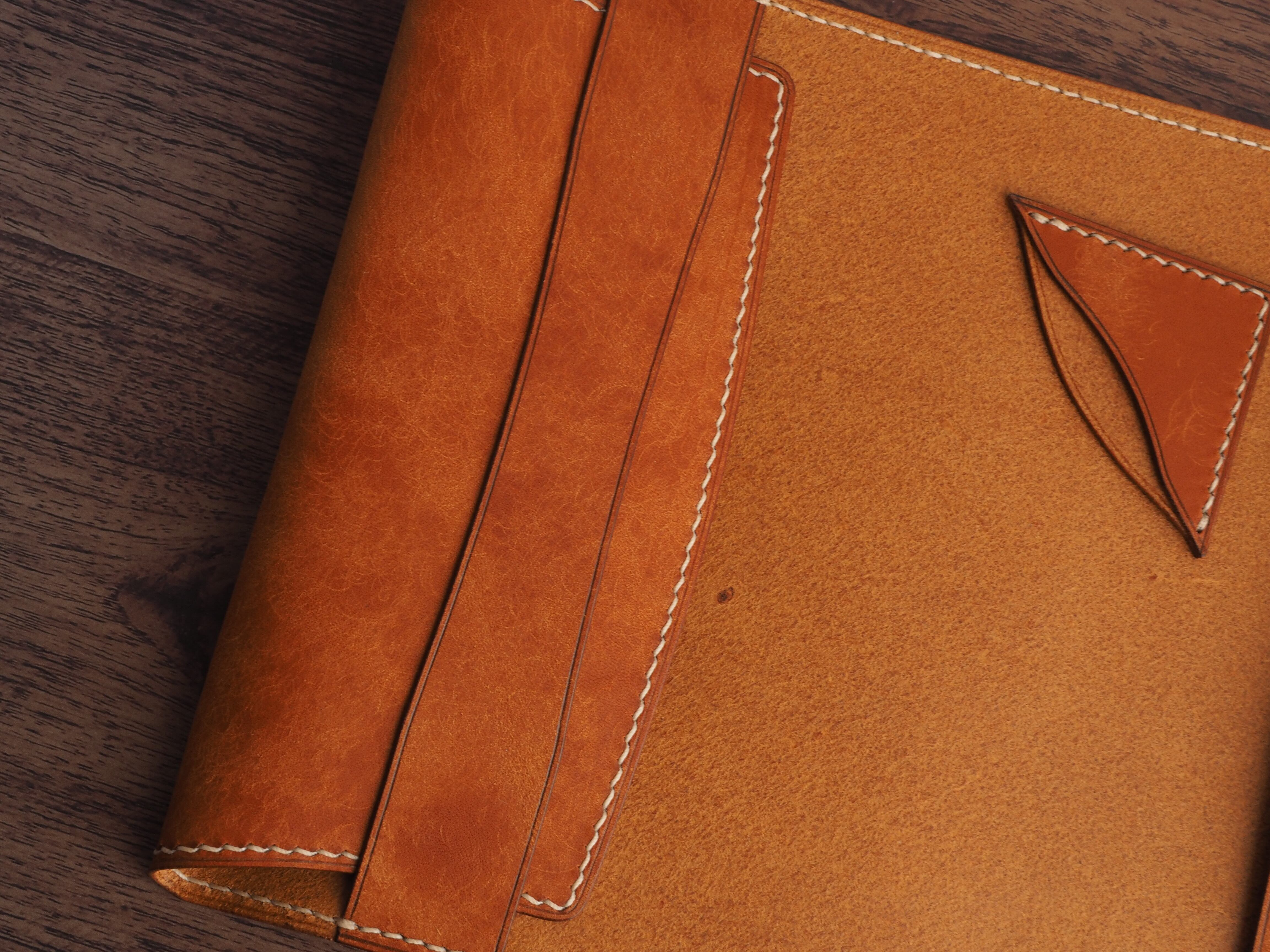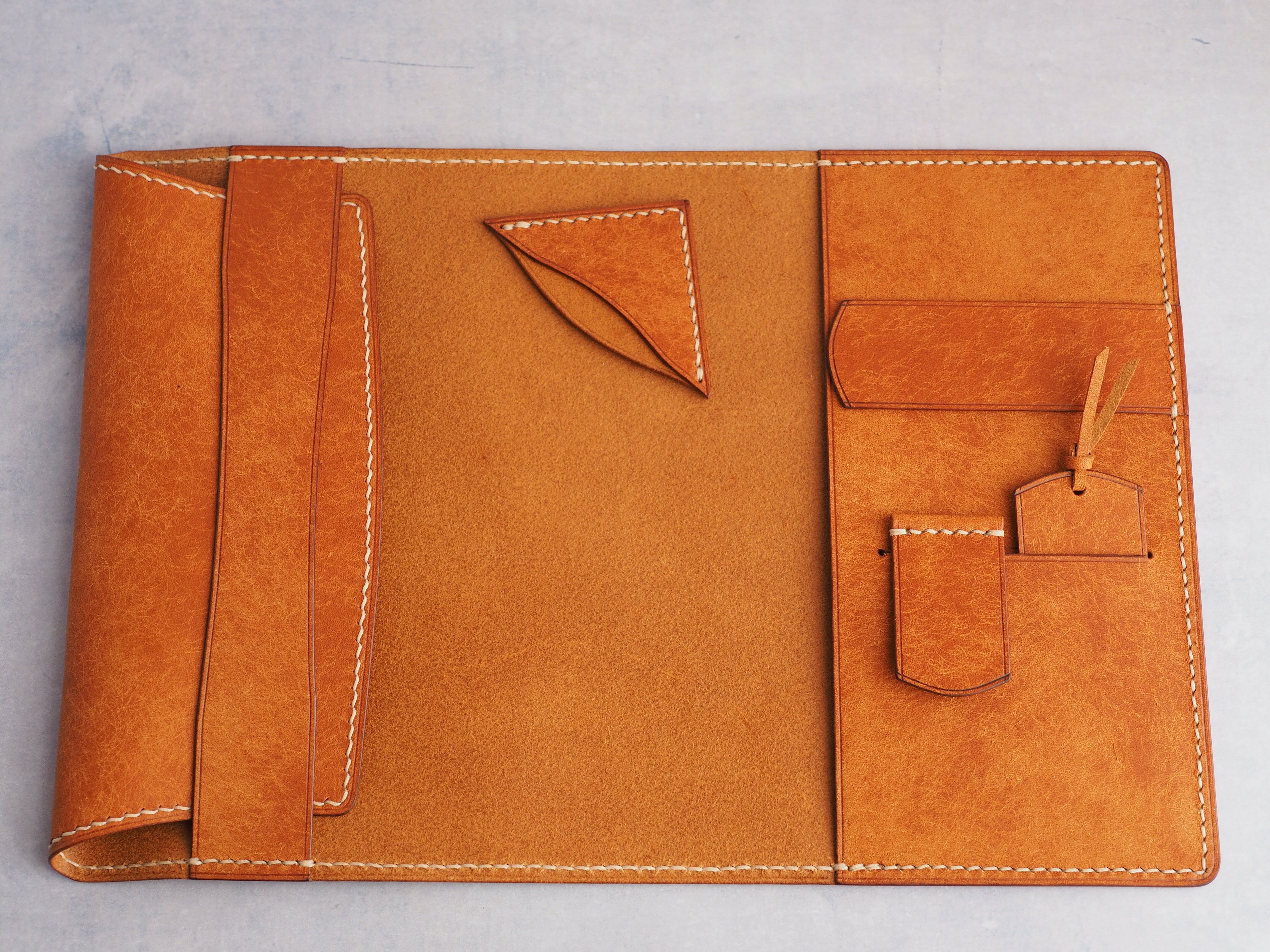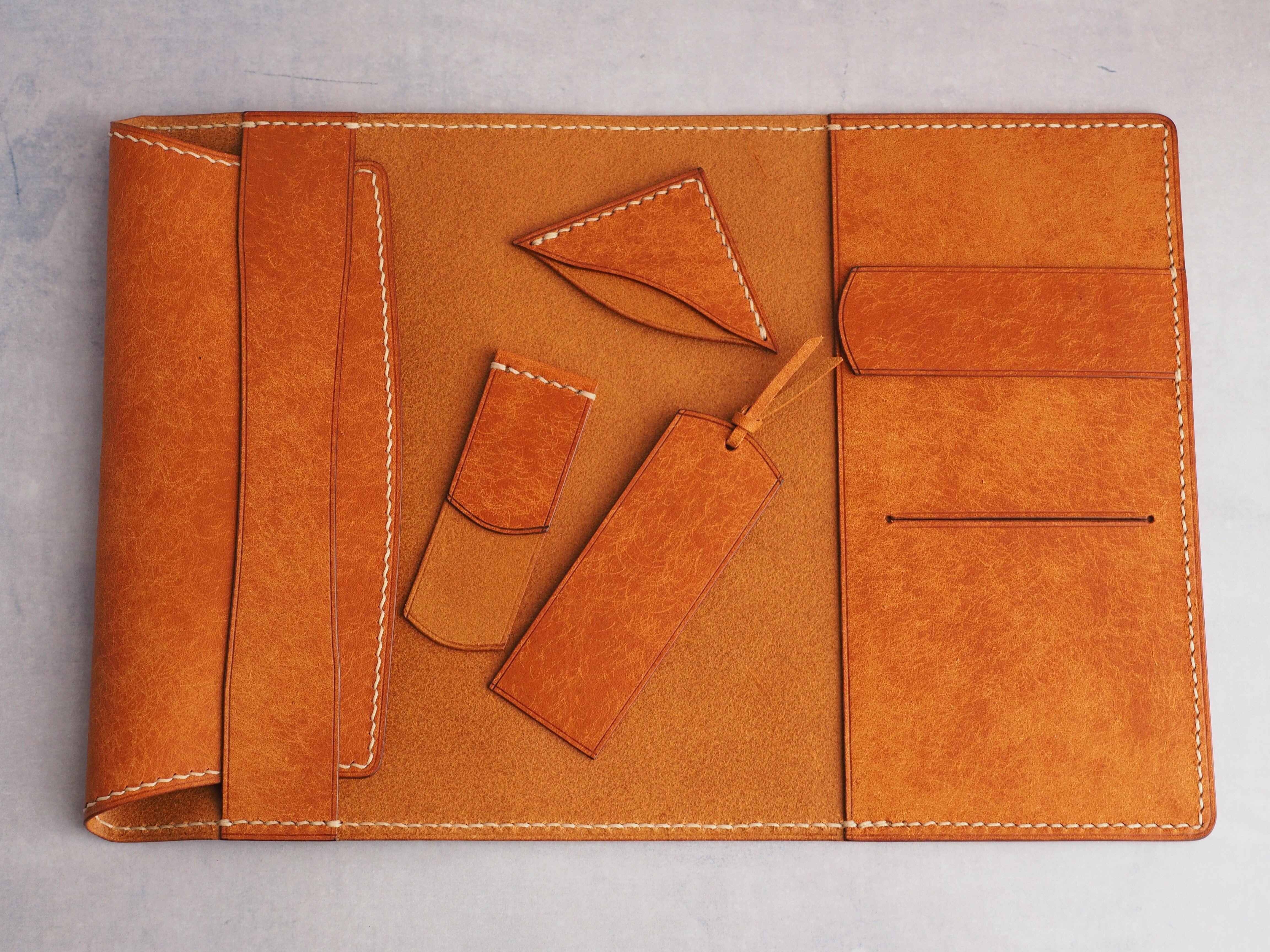 イタリアンレザーマルゴー、フィエーノ(キャメル)を使用した文庫本用のブックカバーになります。新型のハヤカワ文庫(15.6cm)は未対応です。本体備え付けの帯状のブックマークと今回は形、付ける場所の違う3種類のブックマークを付属しています。自分好みの読書スタイルを選んでいただけるようにです。初めての方にも革に触れる機会を増やそうと思い扱いやすいように設計しました。革は1ミリ前後の厚さのものを使用おり、首や肩周り、背中から切り出しています。よく動かす部位であるため革の表面にトラ(皺が虎の模様に見えるため)が入りやすい部分です。しなやかで丈夫なためお腹側に比べて強度があります。今回は革の素材感を生かすためにあえてシワ等を避けずに使用しています。こういったトラや血筋は革の魅力の一つであり、一部の方々に大変人気があります。自分好みのトラ模様を探す人、血筋の個体差を楽しむ革好きの方が増えているようです。