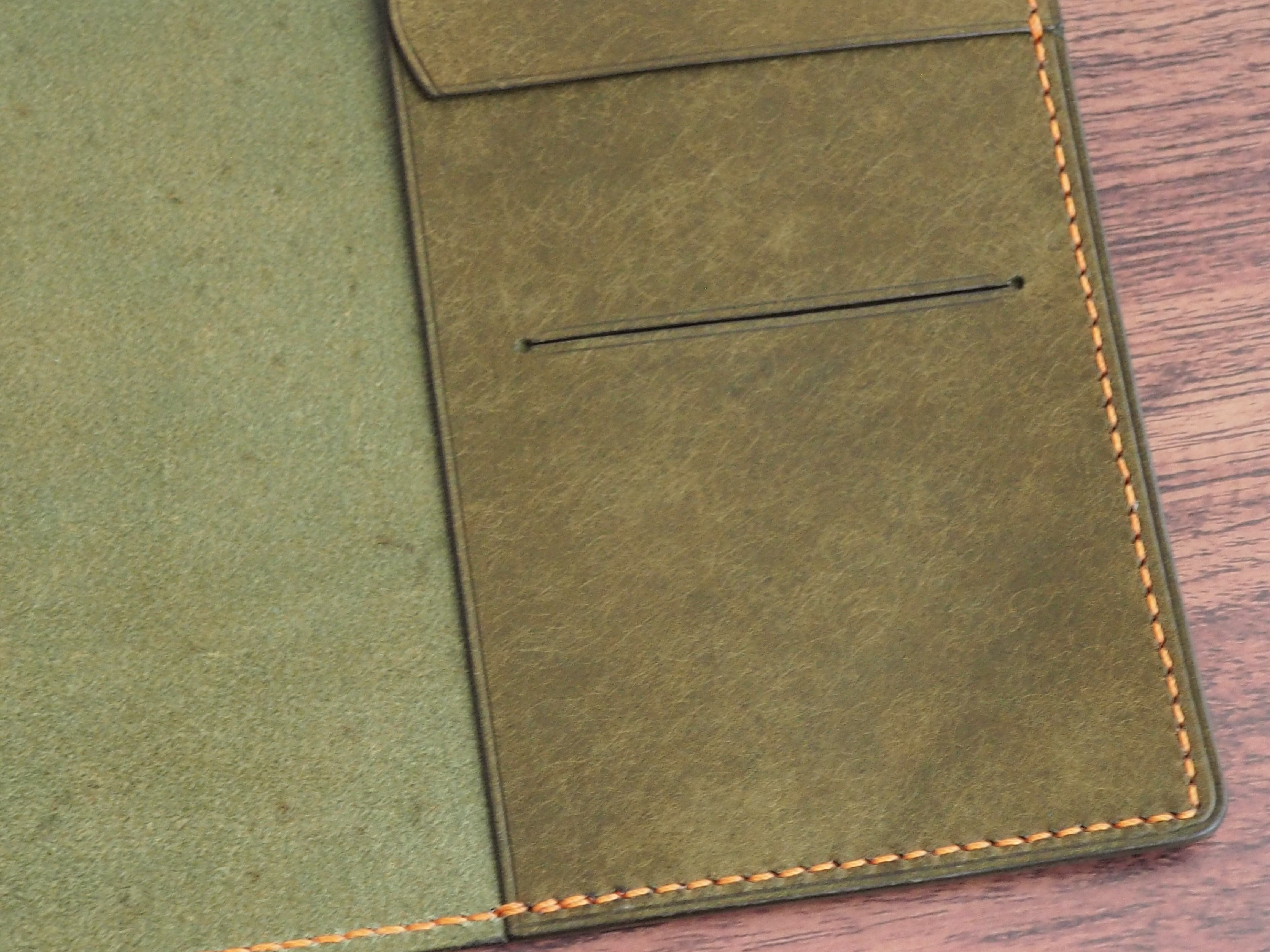 イタリアンレザーマルゴー、ボスコ(オリーブ色)を使用した文庫本用のブックカバーになります。ハヤカワ文庫(15.6cm)は未対応です。本体備え付けの帯状のブックマークと今回は形、付ける場所の違う3種類のブックマークを付属しています。自分好みの読書スタイルを選んでいただけるようにです。初めての方にも革に触れる機会を増やそうと思い扱いやすいように設計しました。革は1ミリ前後の厚さのものを使用おり、首や肩周り、背中から切り出しています。よく動かす部位であるため革の表面にトラ(皺が虎の模様に見えるため)が入りやすい部分です。しなやかで丈夫なためお腹側に比べて強度があります。今回は革の素材感を生かすためにあえてシワ等を避けずに使用しています。こういったトラや血筋は革の魅力の一つであり、一部の方々に大変人気があります。自分好みのトラ模様を探す人、血筋の個体差を楽しむ革好きの方が増えているようです。