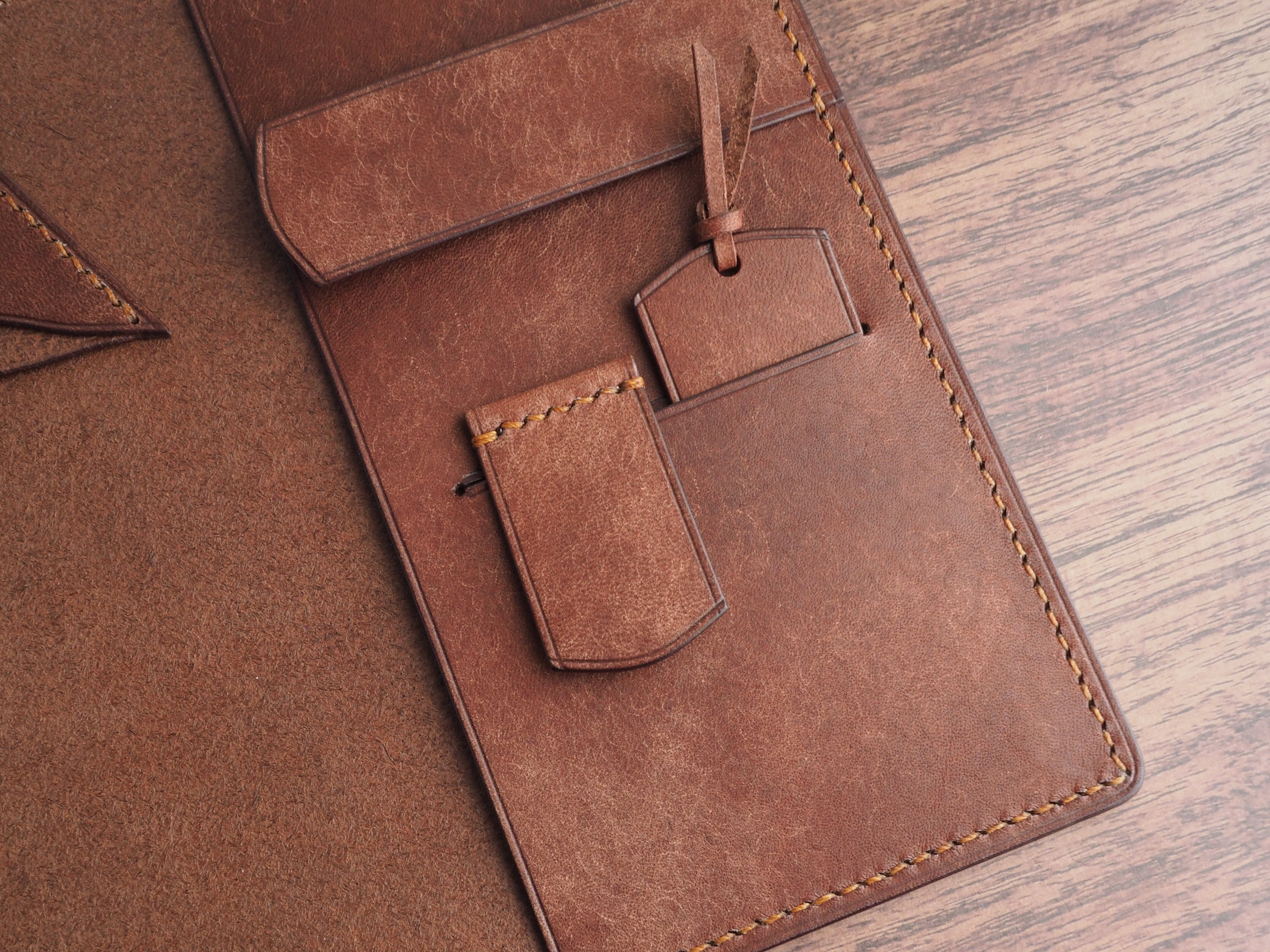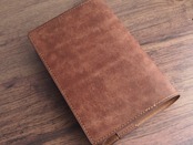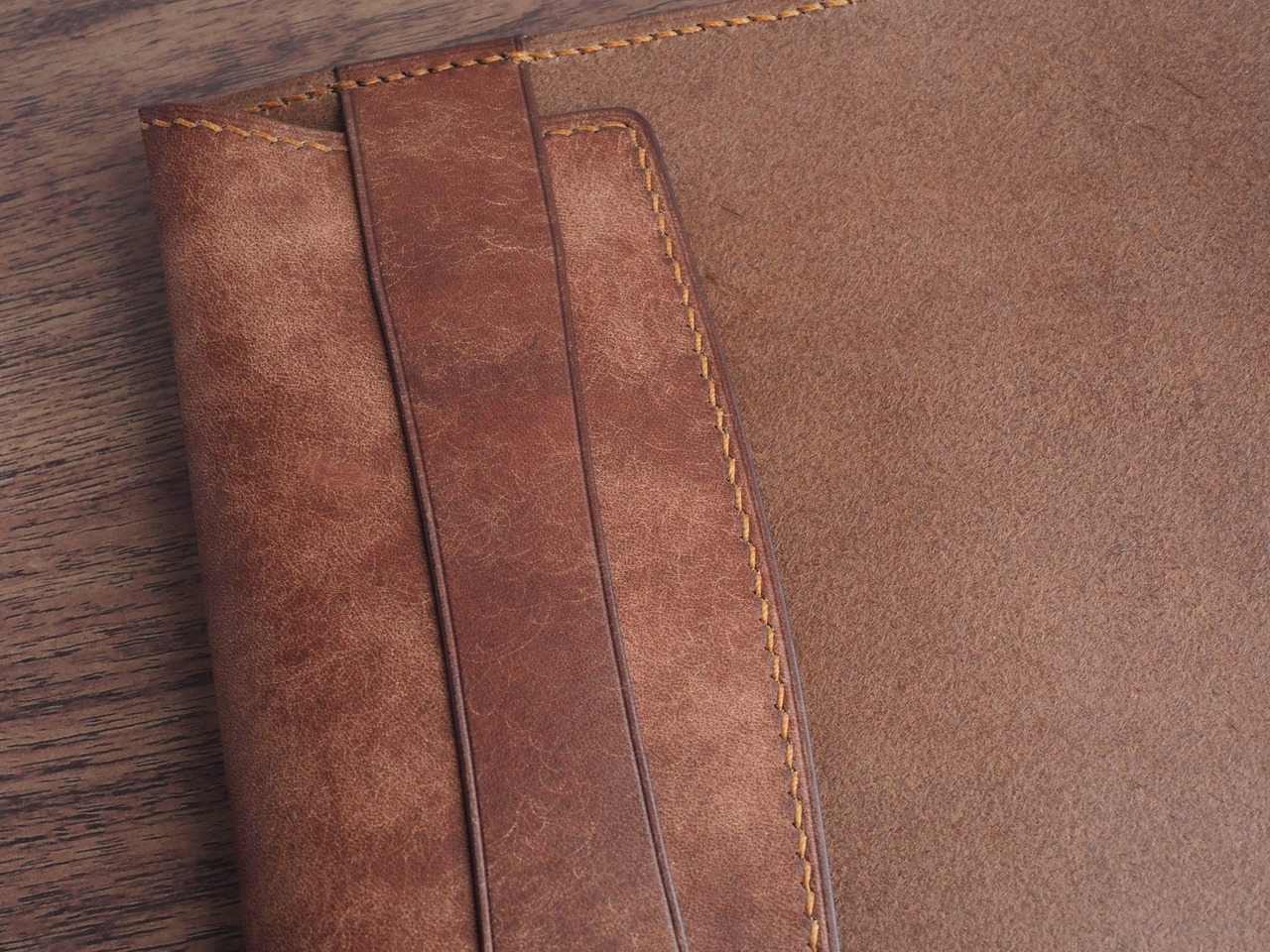 イタリアンレザーマルゴー、ダークブラウンを使用した文庫本用のブックカバーになります。新型のハヤカワ文庫(15.6cm)は未対応です。本体備え付けの帯状のブックマークと今回は形、つける場所の違う3種類のブックマークを付属しています。自分好みの読書スタイルを選んでいただけるようにです。初めての方にも革に触れる機会を増やそうと思い扱いやすいように設計しました。革は1ミリ前後の厚さのものを使用おり、首や肩周り、背中から切り出しています。よく動かす部位であるため革の表面にトラ(皺が虎の模様に見えるため)が入りやすい部分です。しなやかで丈夫なためお腹側に比べて強度があります。今回は革の素材感を生かすためにあえてシワ等を避けずに使用しています。こういったトラや血筋は革の魅力の一つであり、一部の方々に大変人気があります。自分好みのトラ模様を探す人、血筋の個体差を楽しむ革好きの方が増えているようです。