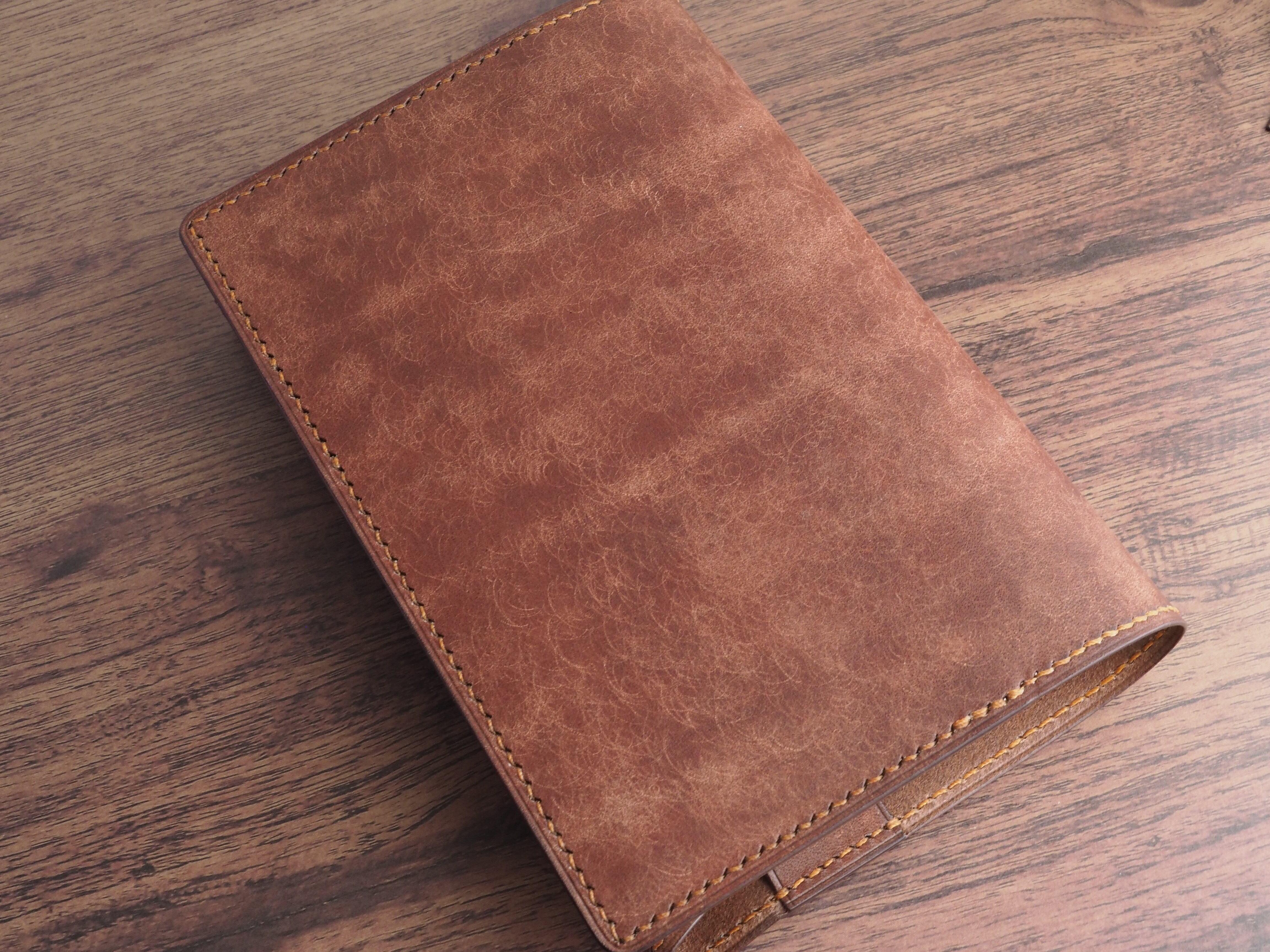 表面にスクラッチ加工が施された革で、オイルを多めに含んでいます。初めは和紙のようなざらついた触感ですが、使い込むことで艶が生まれ深い色味になっていきます、一般的な革と比べ経年変化が早いことも特徴の革です。オイルをしっかり含んでいるので乾燥に強く、しばらくの間は特別な手入れは必要ありません。ブラッシングや柔らかい布で軽くふいてあげ、表面の汚れやほこりを落としてあげると全体的に綺麗に経年変化していきます。
