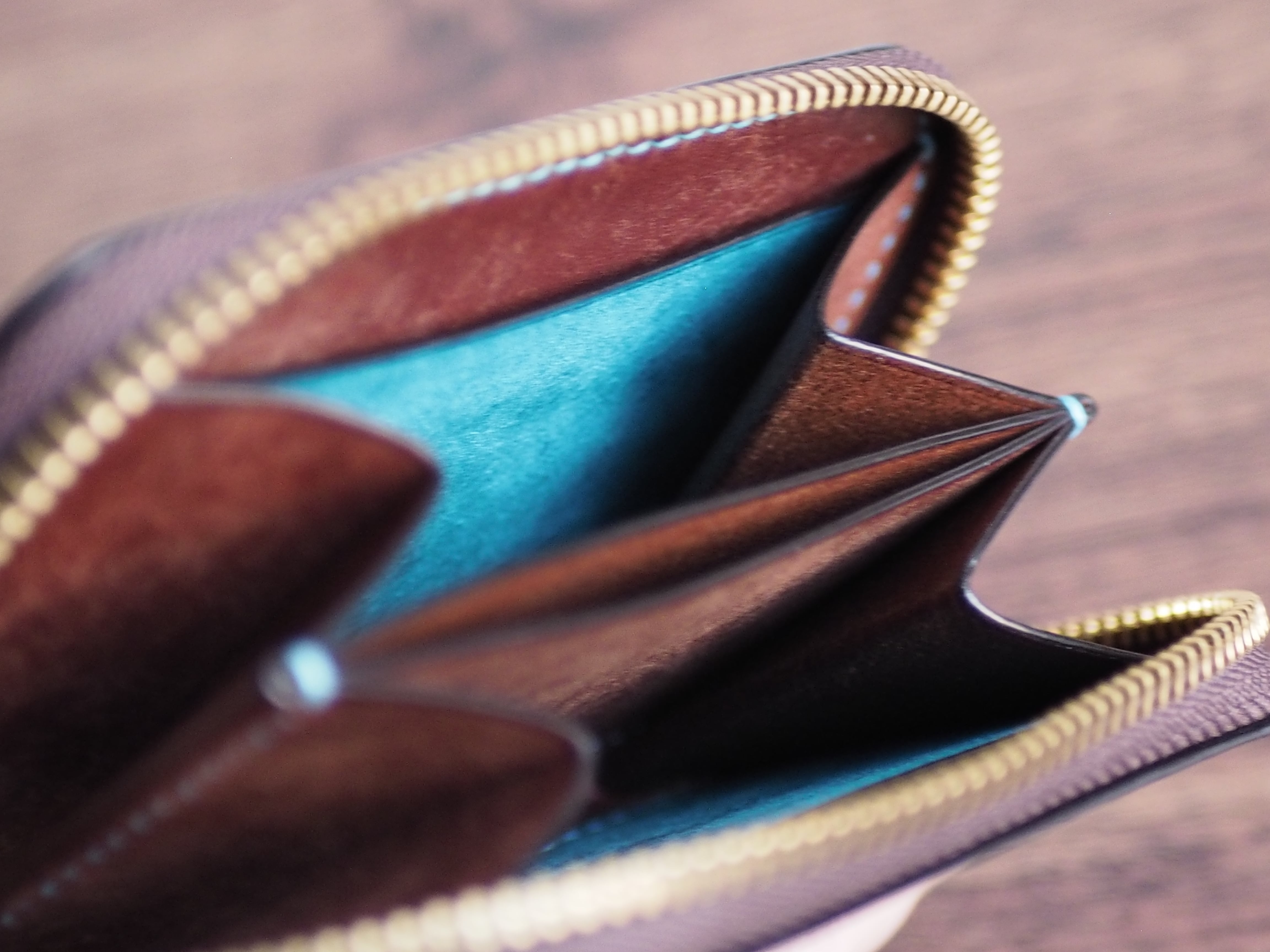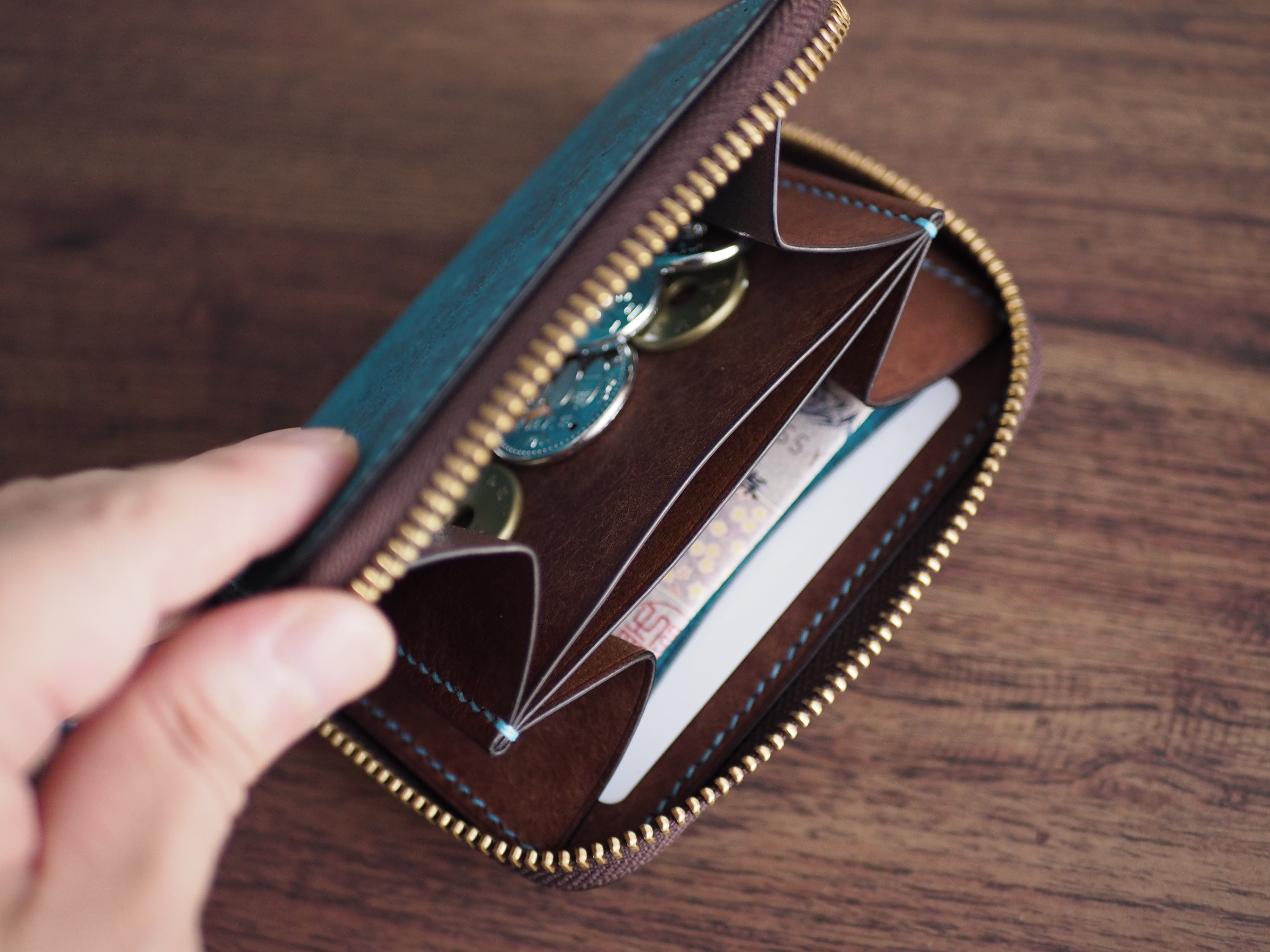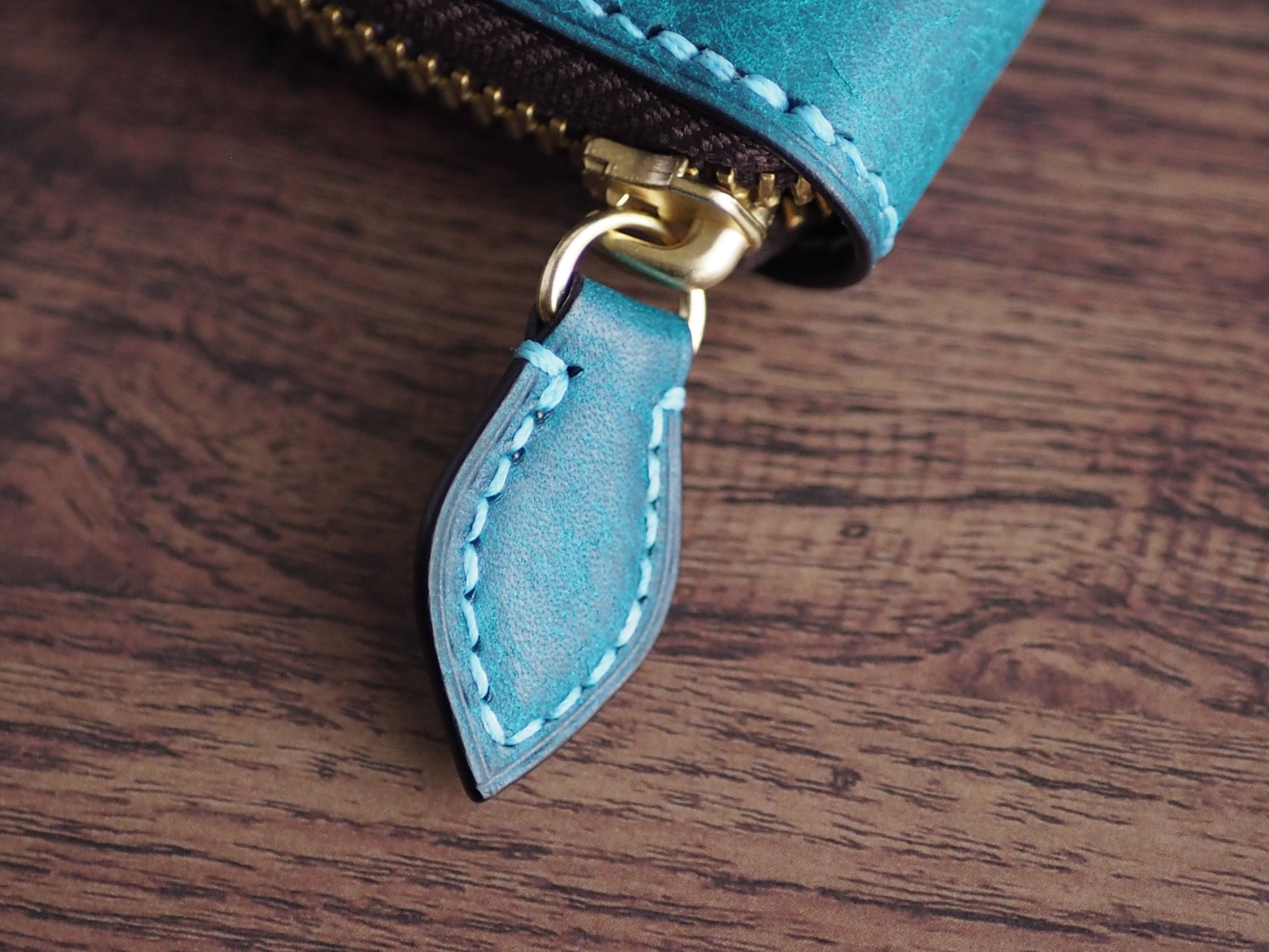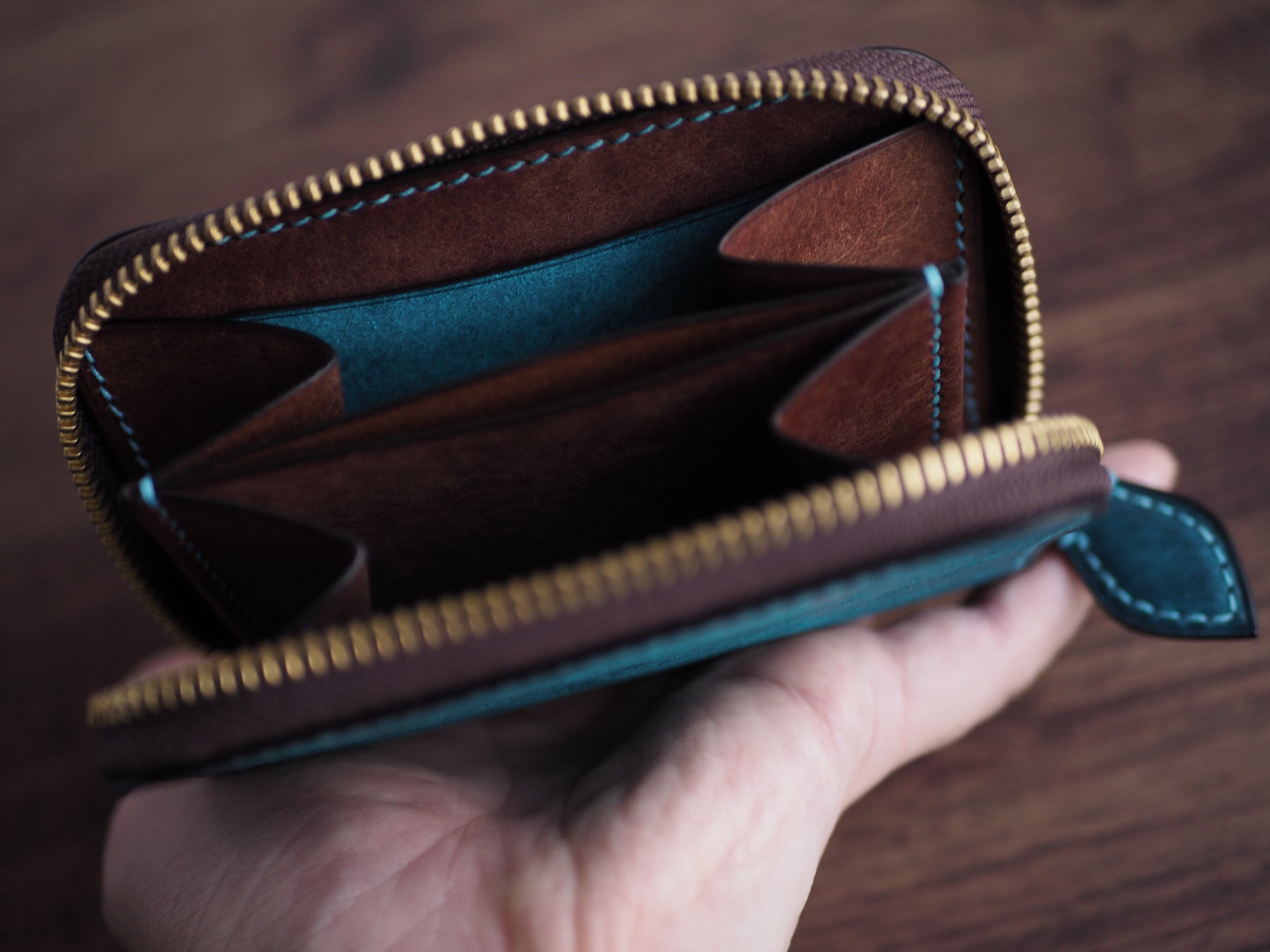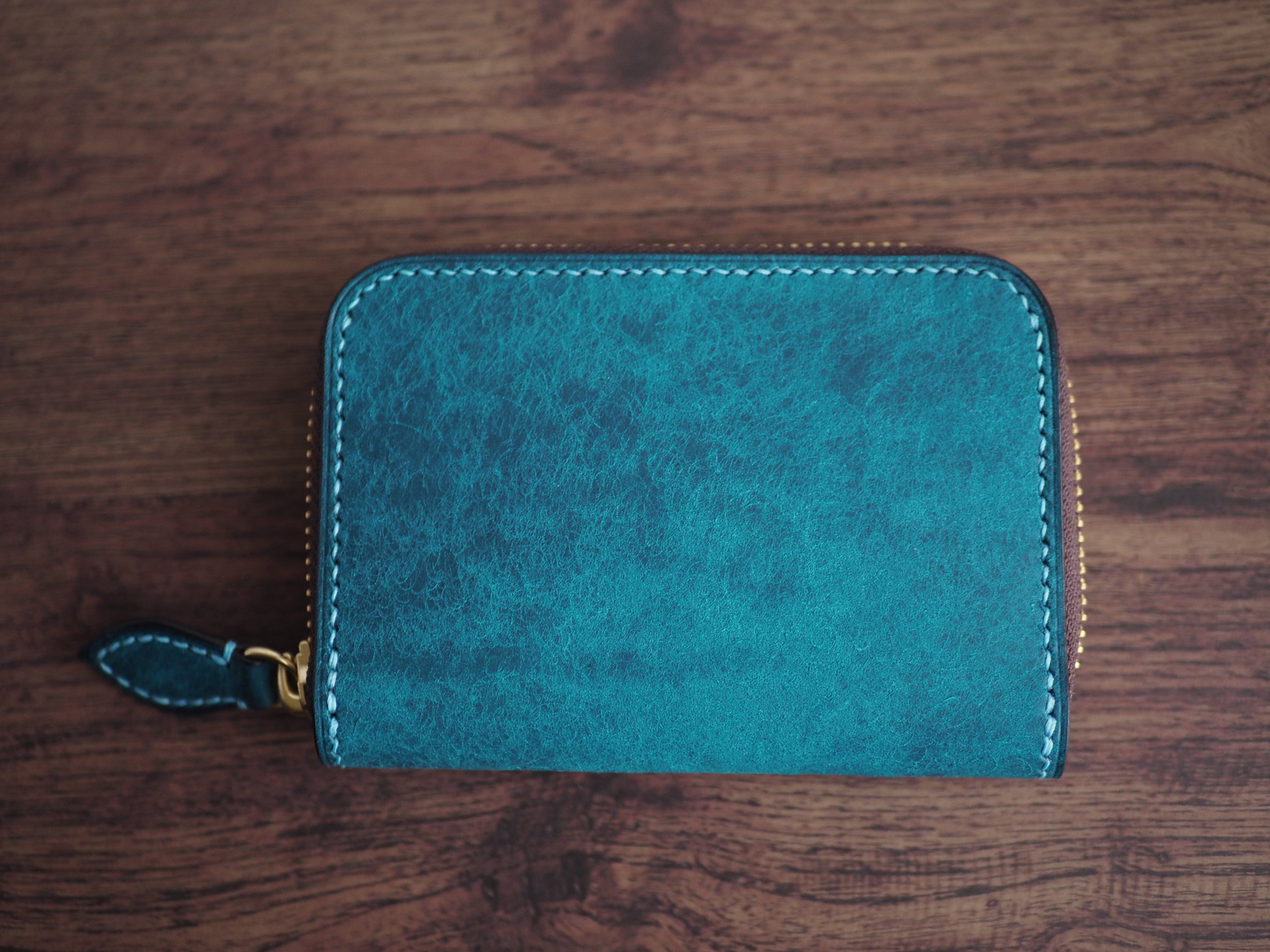 こちらは、外装に稀少なイタリアンレザー「マルゴー」のトルケーゼ(ターコイズ)、内装にマルゴーのダークブラウンを使用し、全工程を手縫いで丁寧に製作したラウンドファスナーミニウォレットです。鮮やかなバイカラーの中に、本革ならではの劇的なエイジングと作り手のこだわりを凝縮しました。