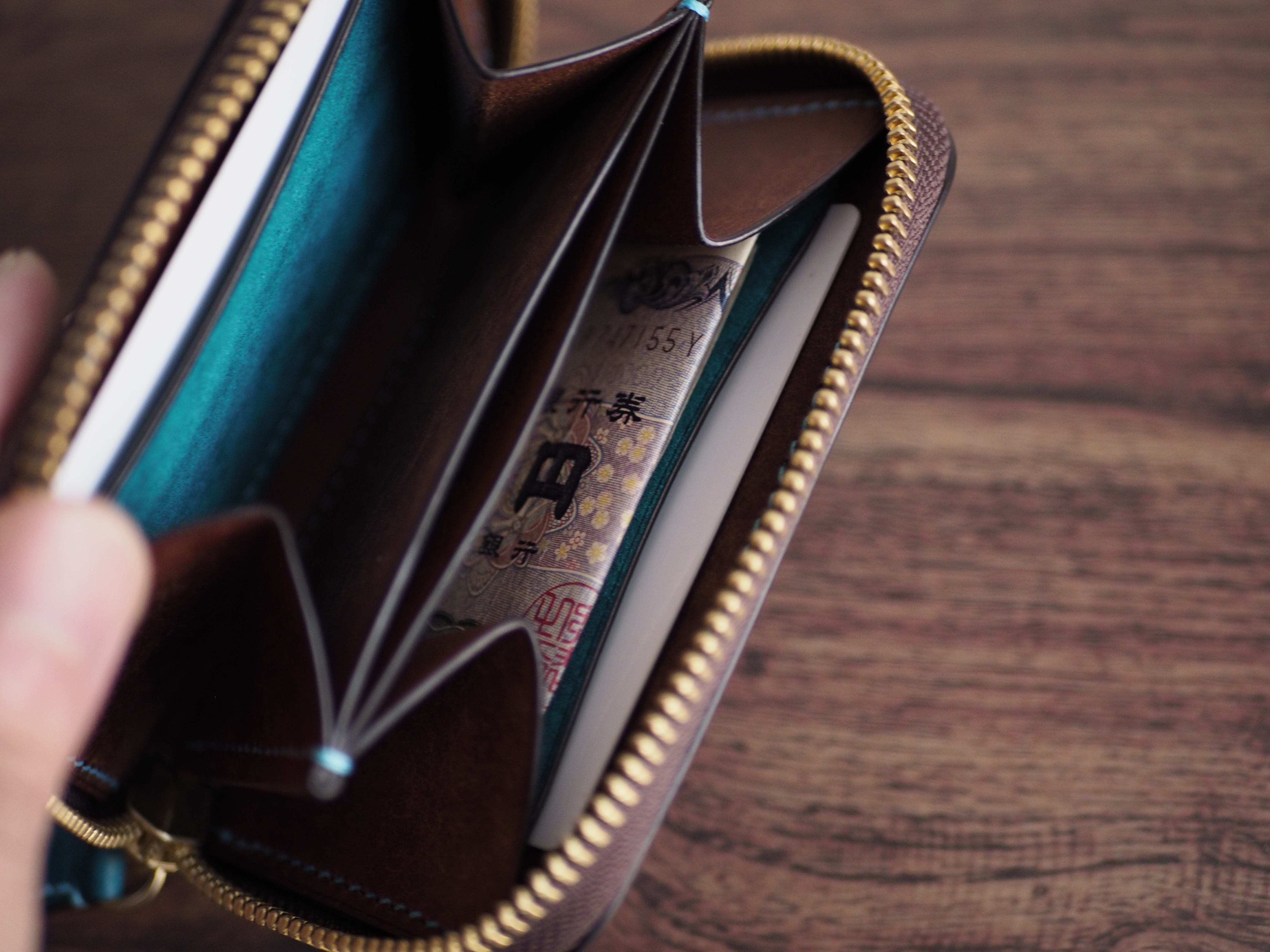 イタリアンレザーマルゴー 手縫い ラウンドファスナーミニウォレット(トルケーゼ × ダークブラウン)