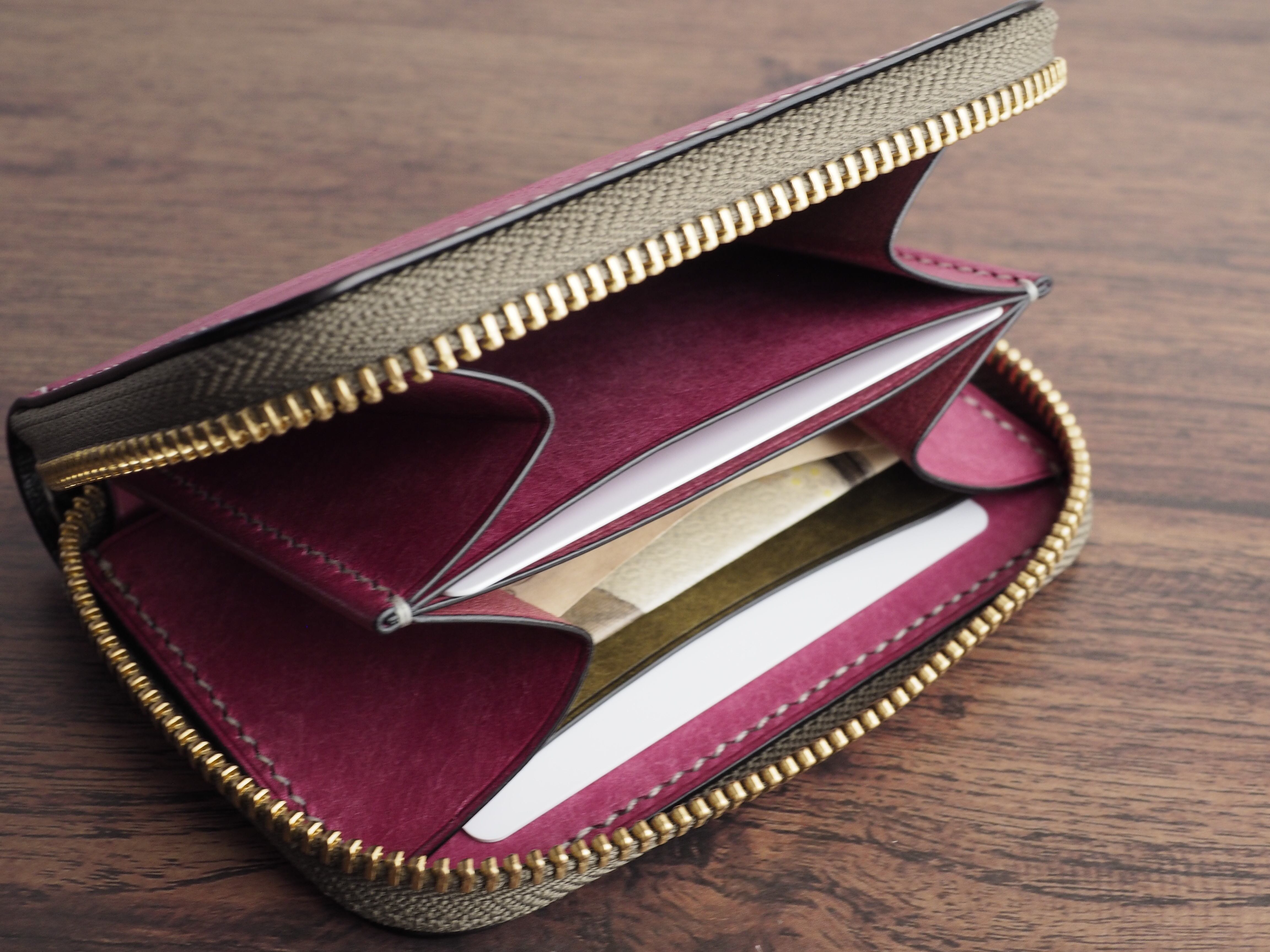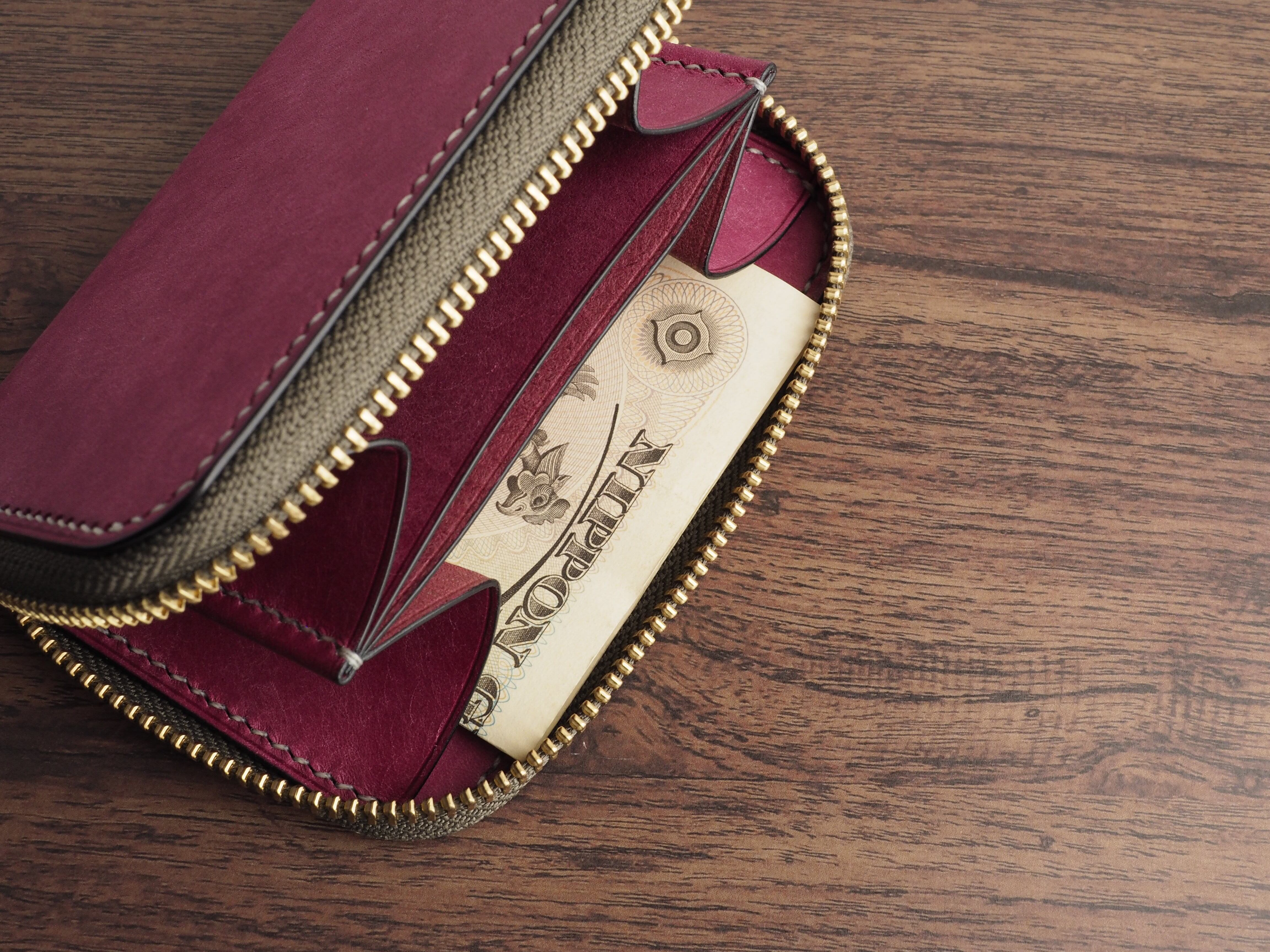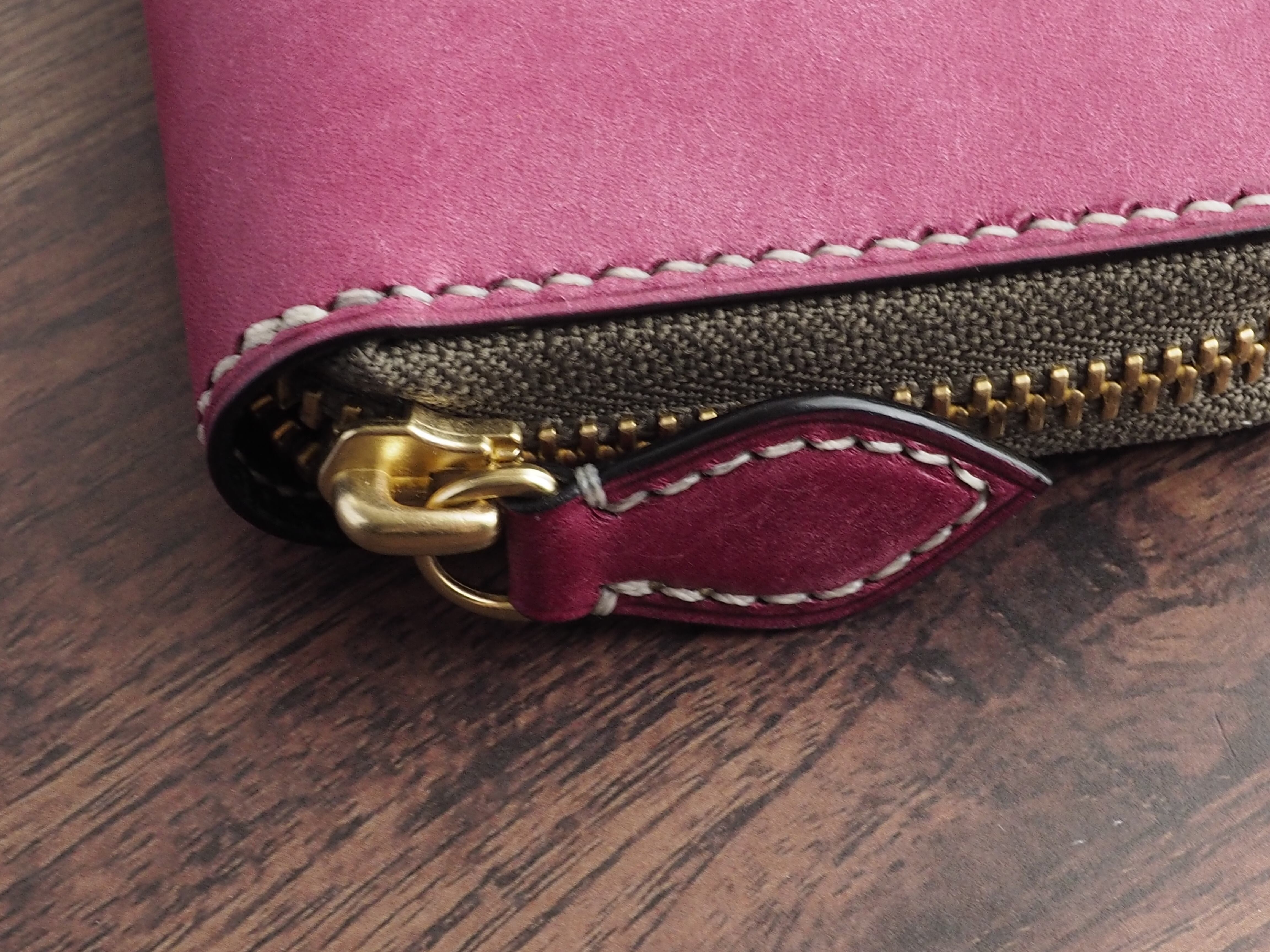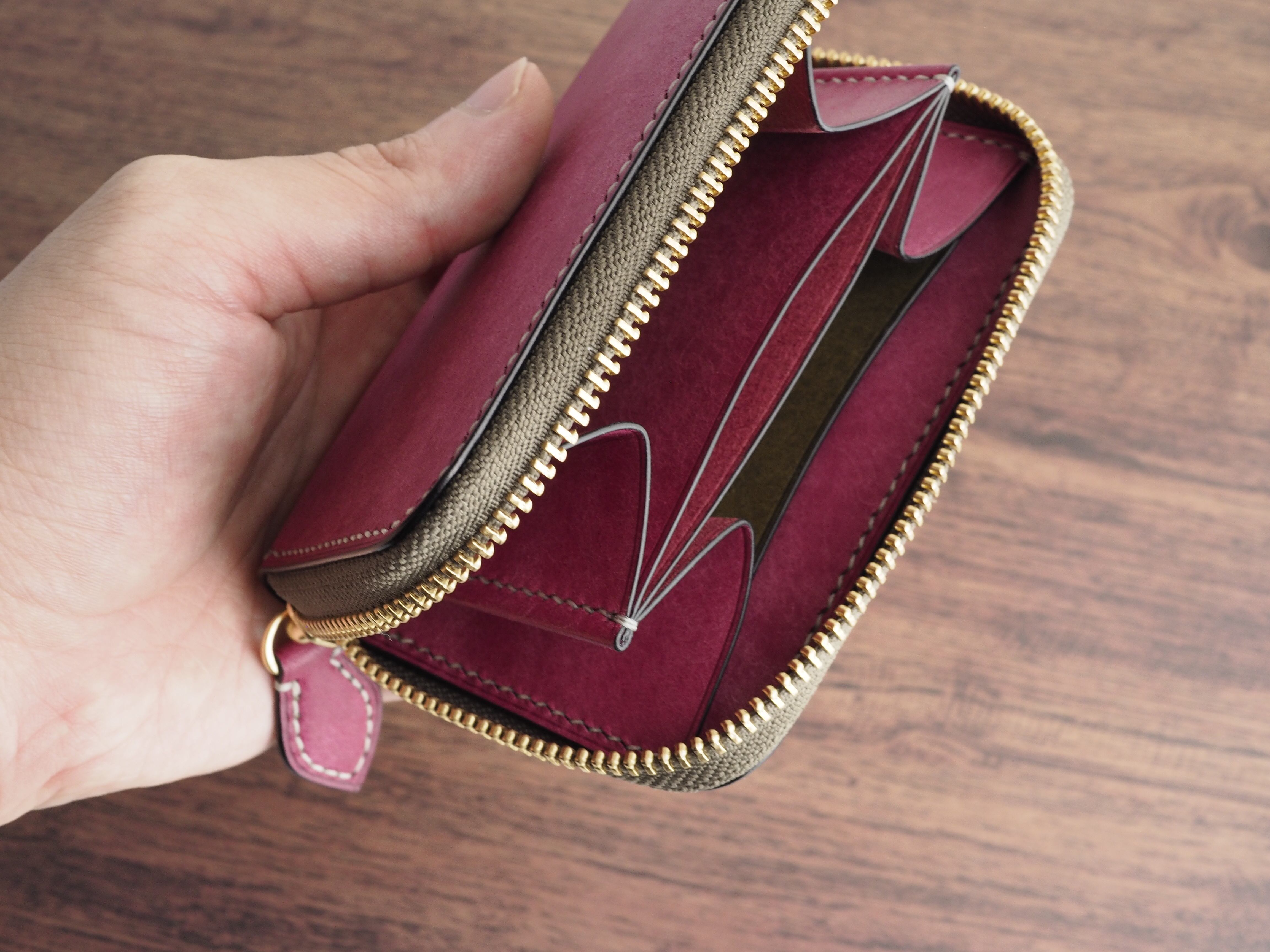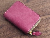 イタリアンレザーのマルゴーを使い手縫いで製作したラウンドファスナーのミニウォレットになります。