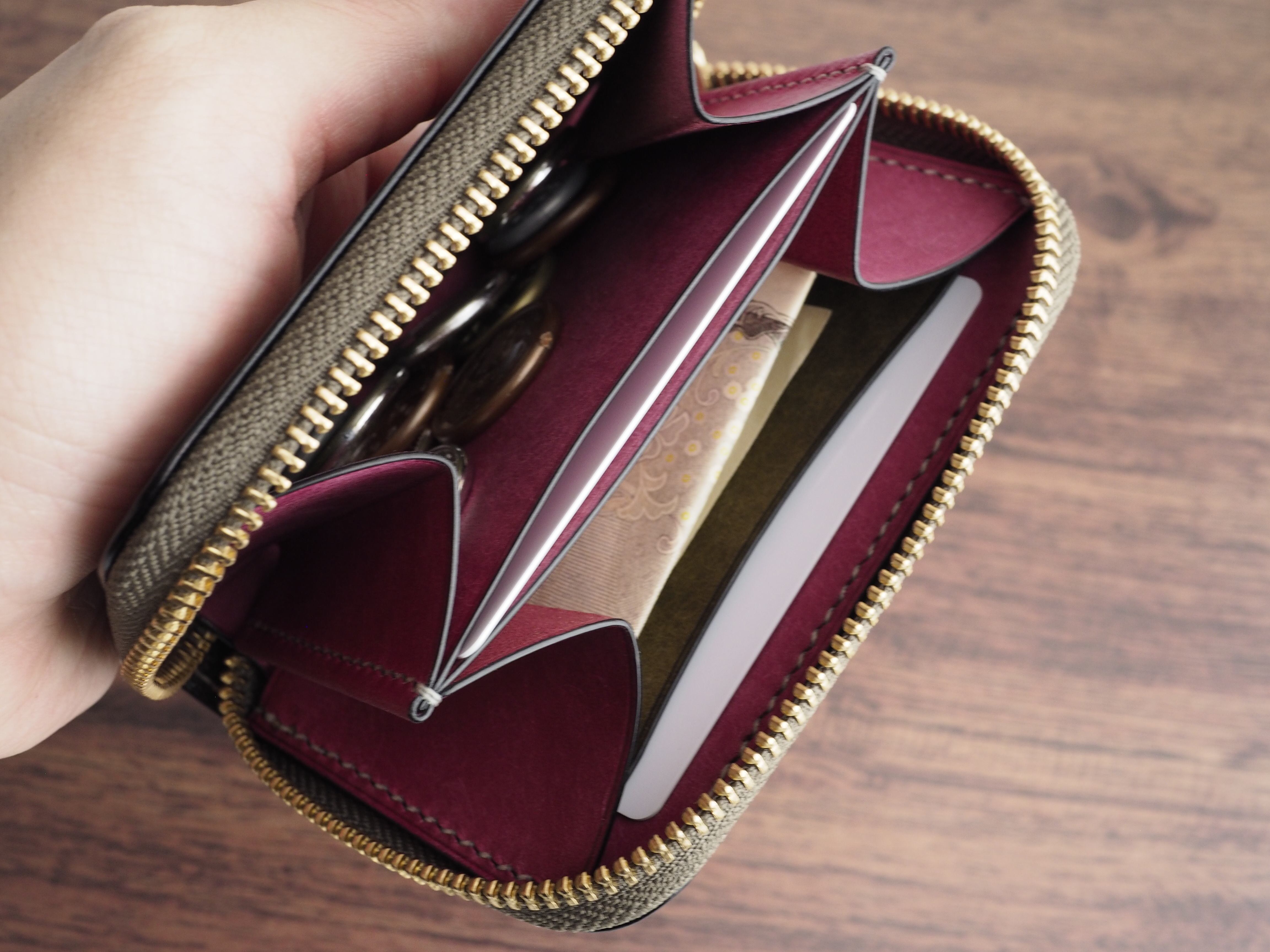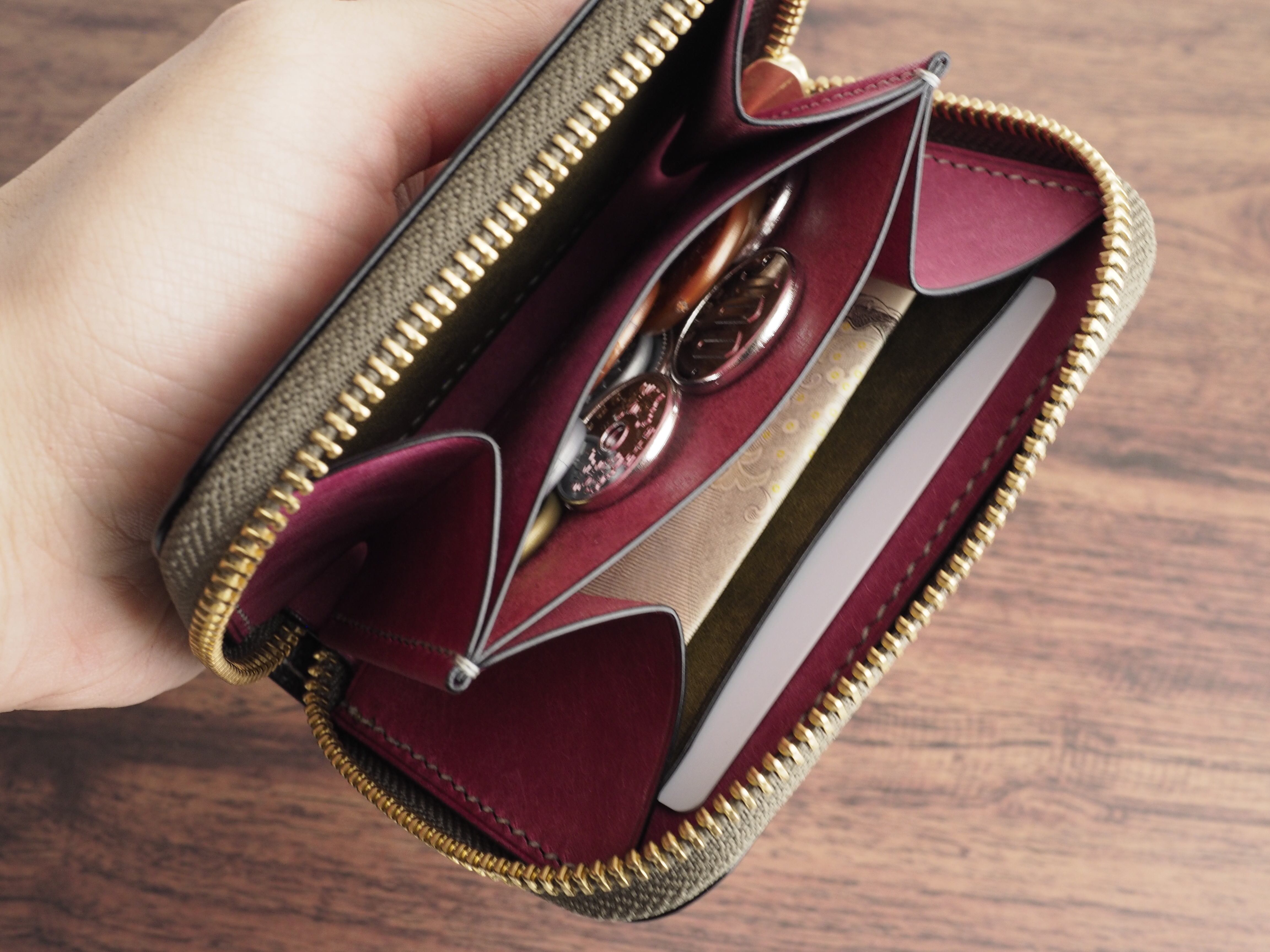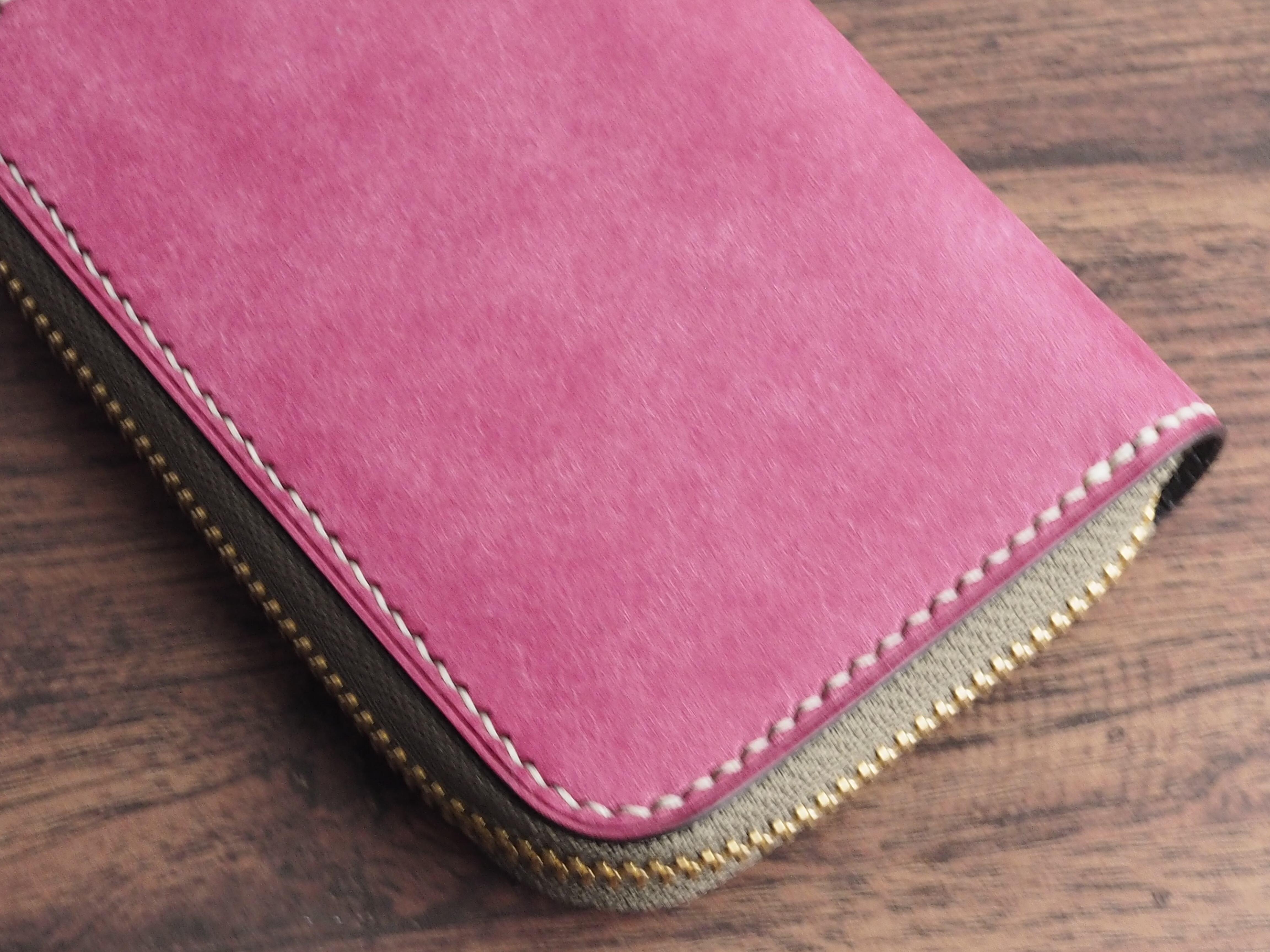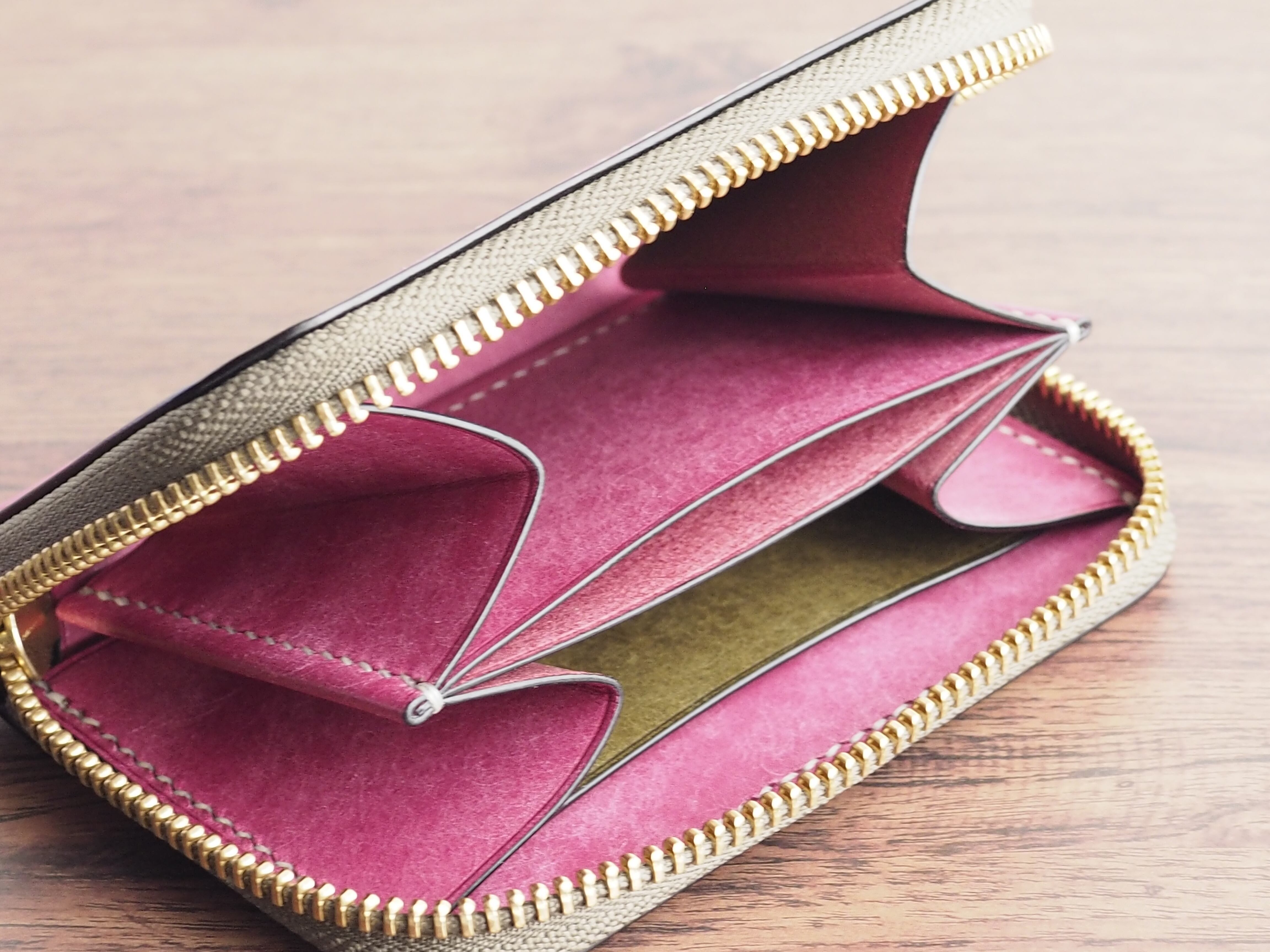 イタリアンレザーのマルゴーを使い手縫いで製作したラウンドファスナーのミニウォレットになります。
