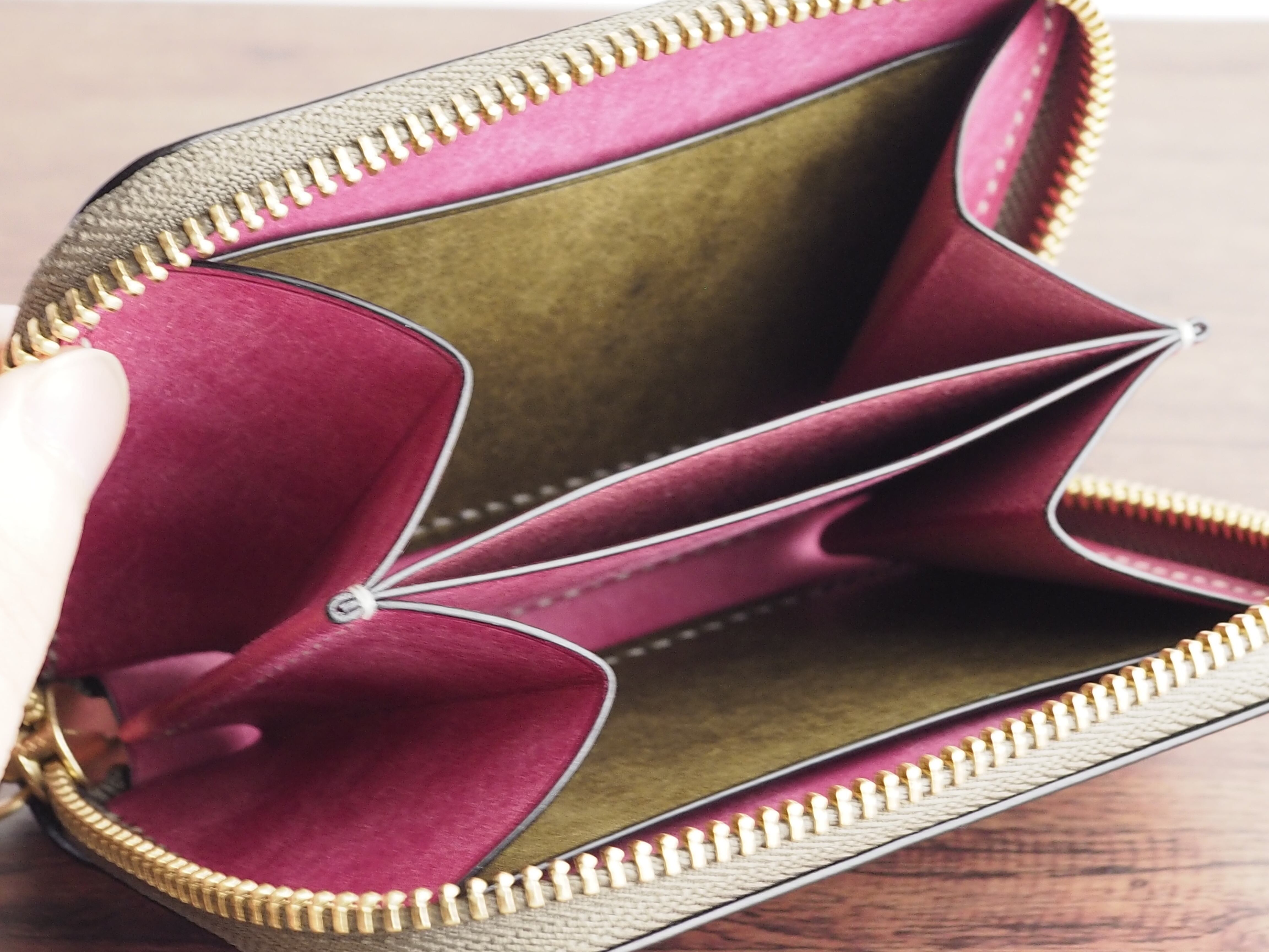 マチがあるフリースペース2ヵ所とカードポケットが量側面に2ヵ所、中央部にカードポケット(コインの使用が少ないかたはコインケースとしてもご利用頂けます)を備えた作りです。お札のほうは基本は3つ折りで収納になります。2つ折りにした場合は数枚程度ならば収納可能です(入れすぎるとファスナーを開ける際に金具に干渉します)。