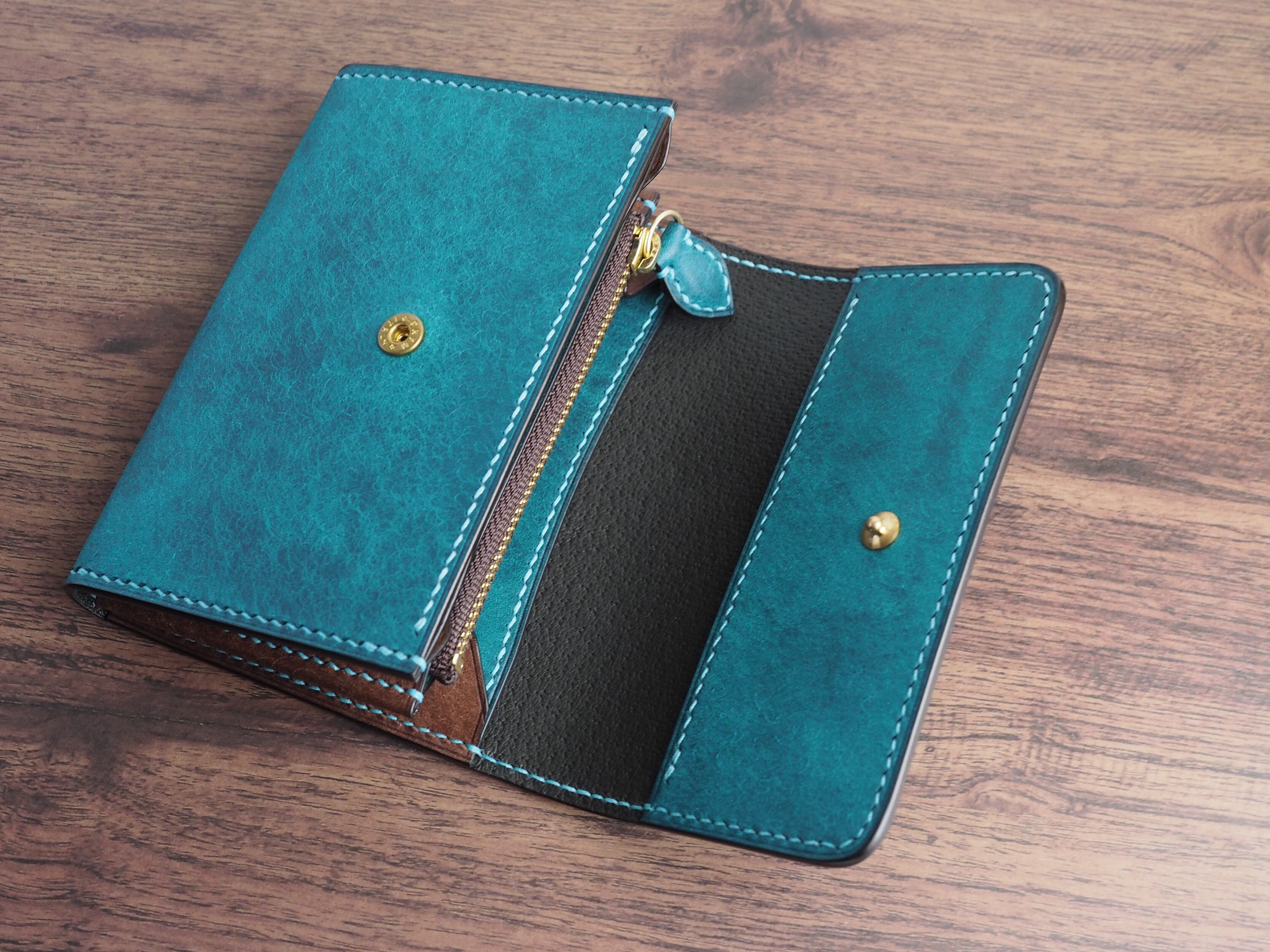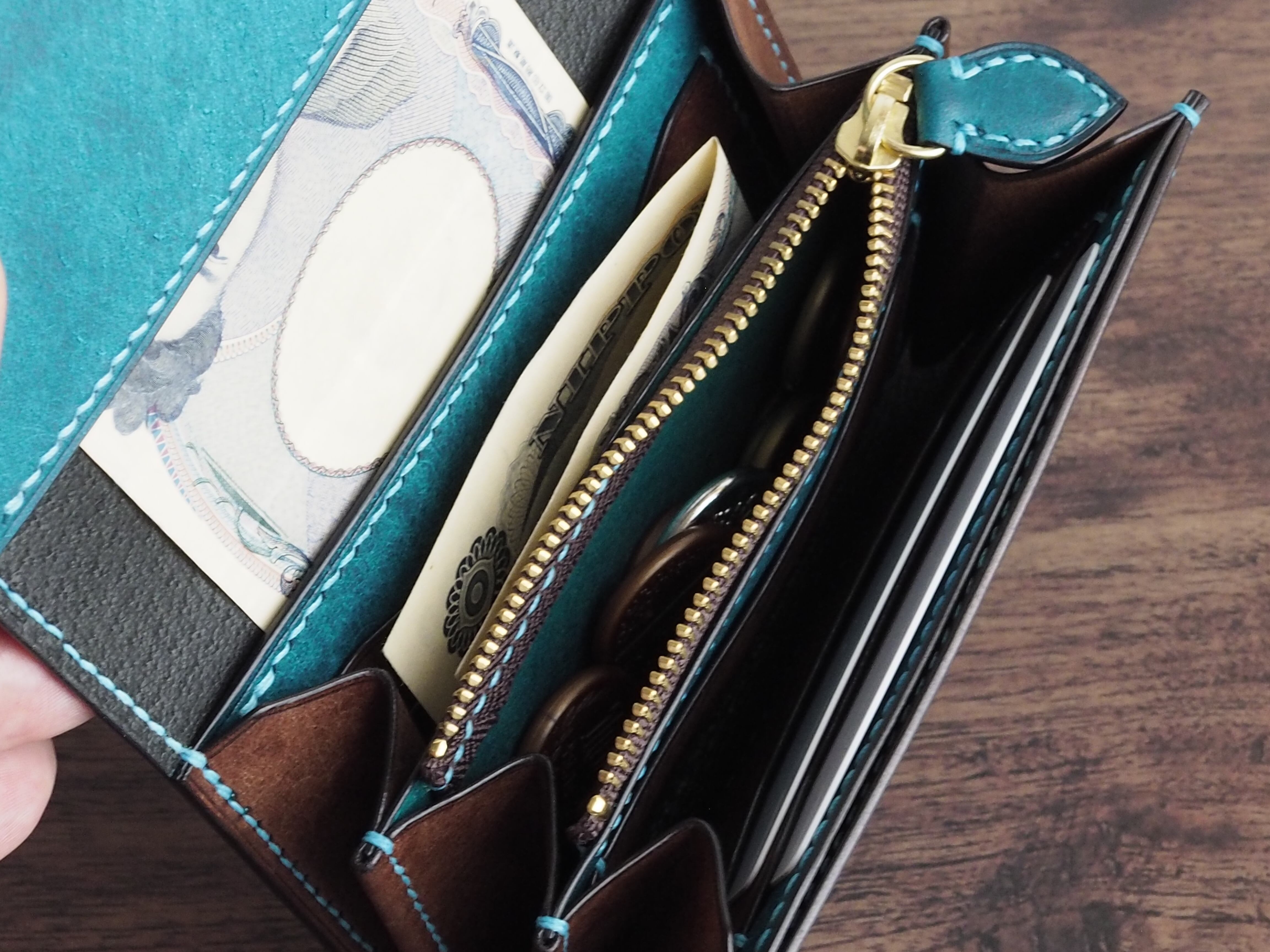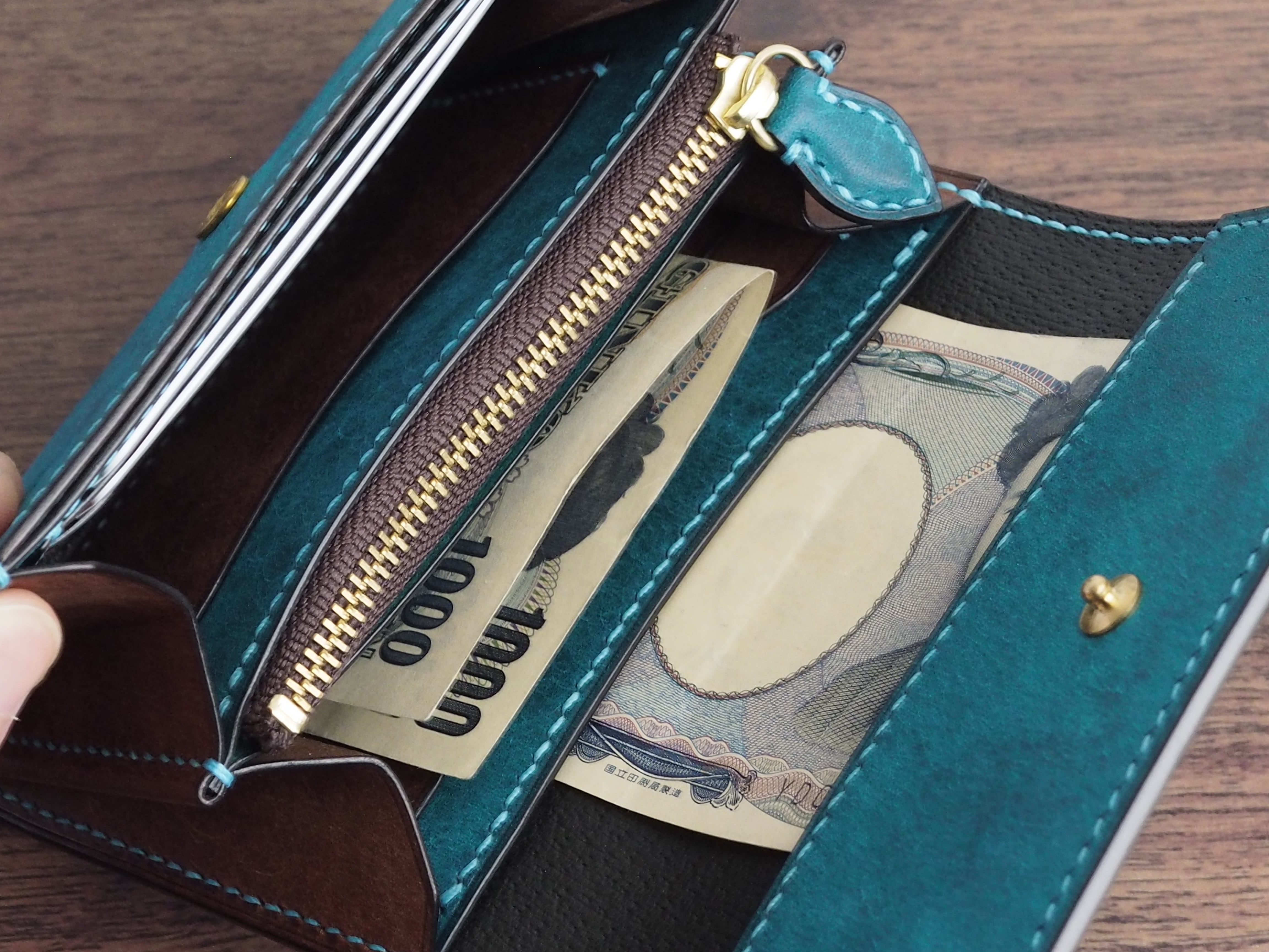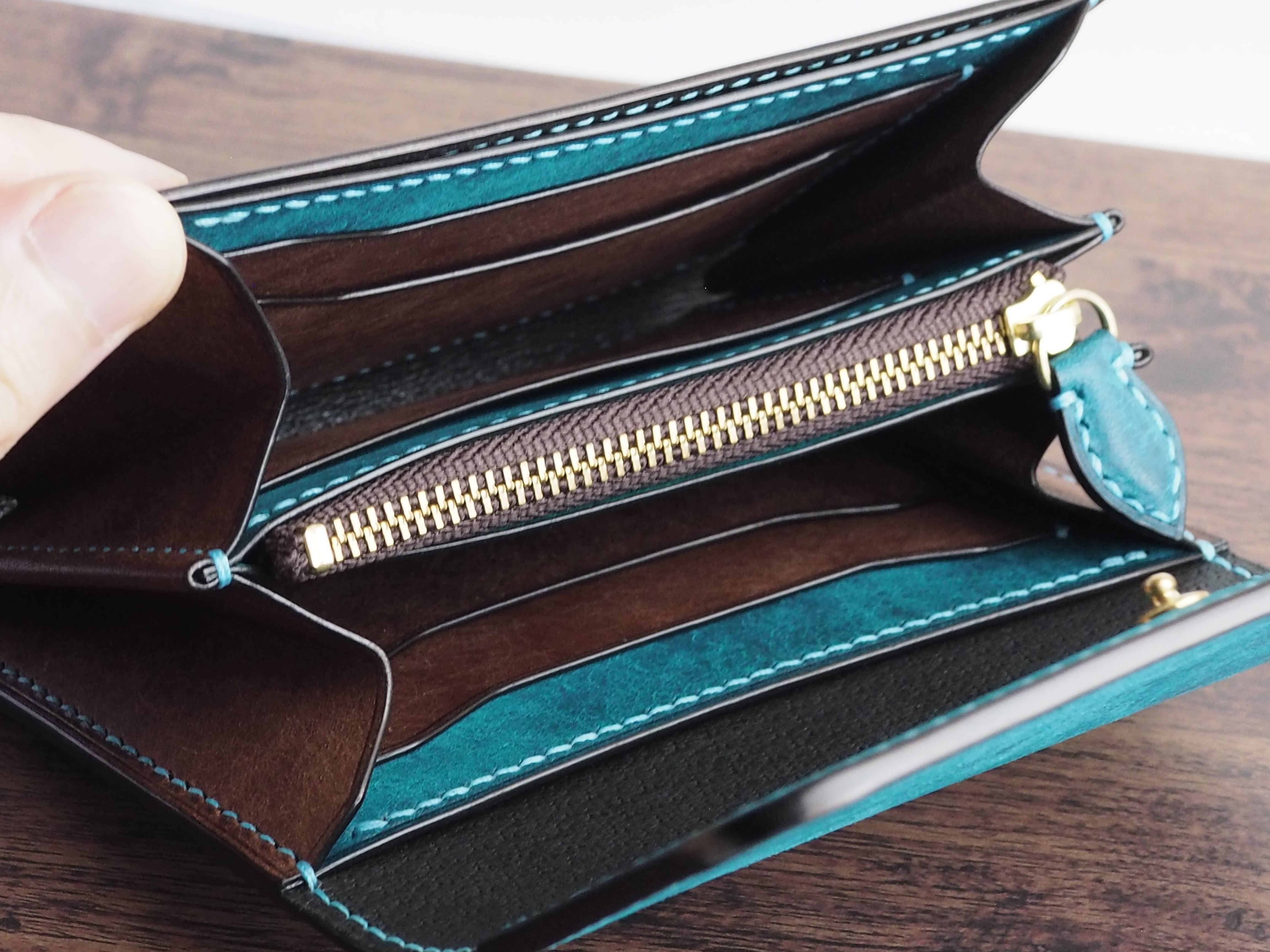 外装に目を引く鮮やかなトルケーゼ、カードポケットとマチに落ち着いたダークブラウンを採用。開くたびに豊かな表情を見せ、長く使っても飽きさせません。