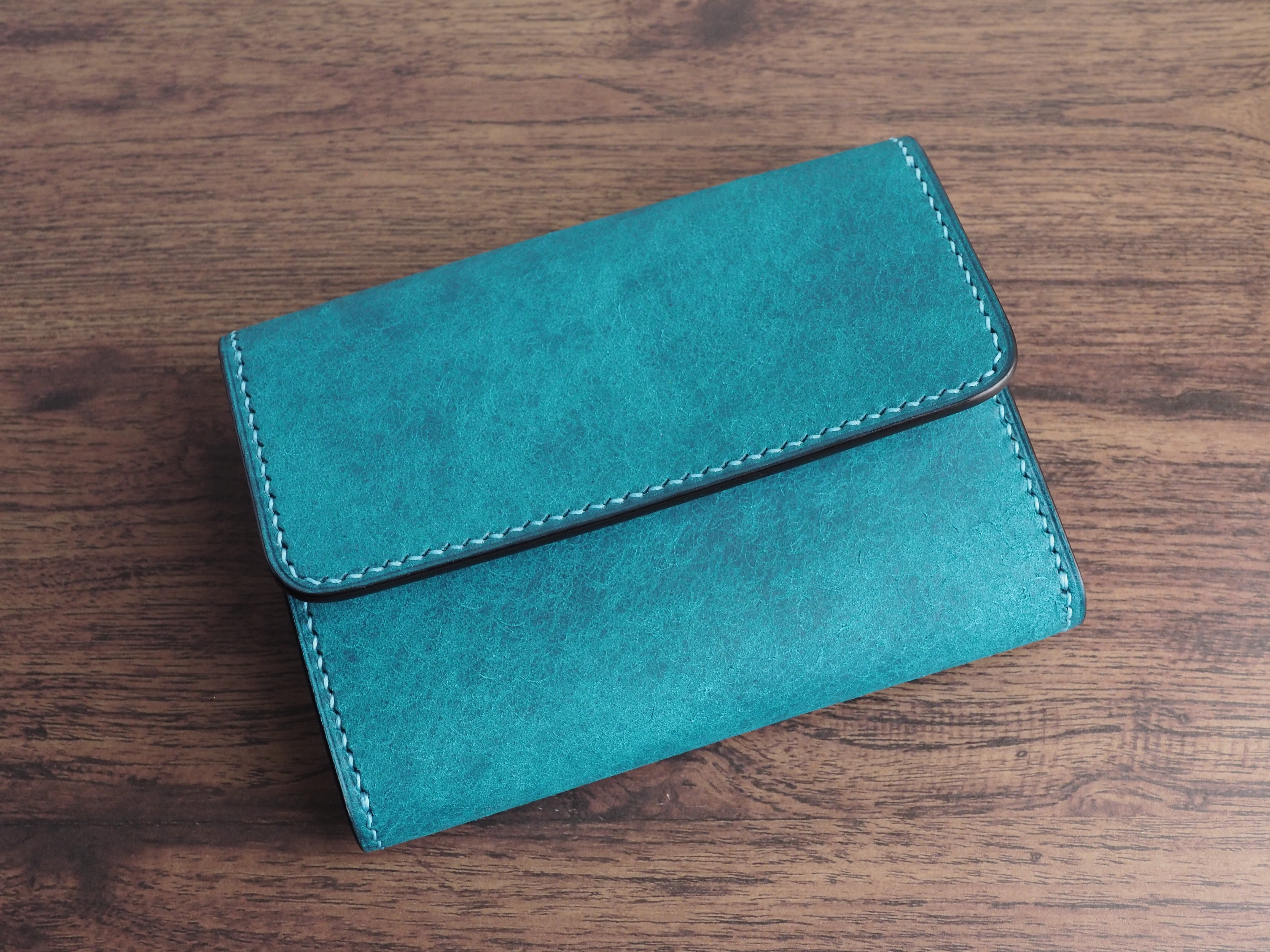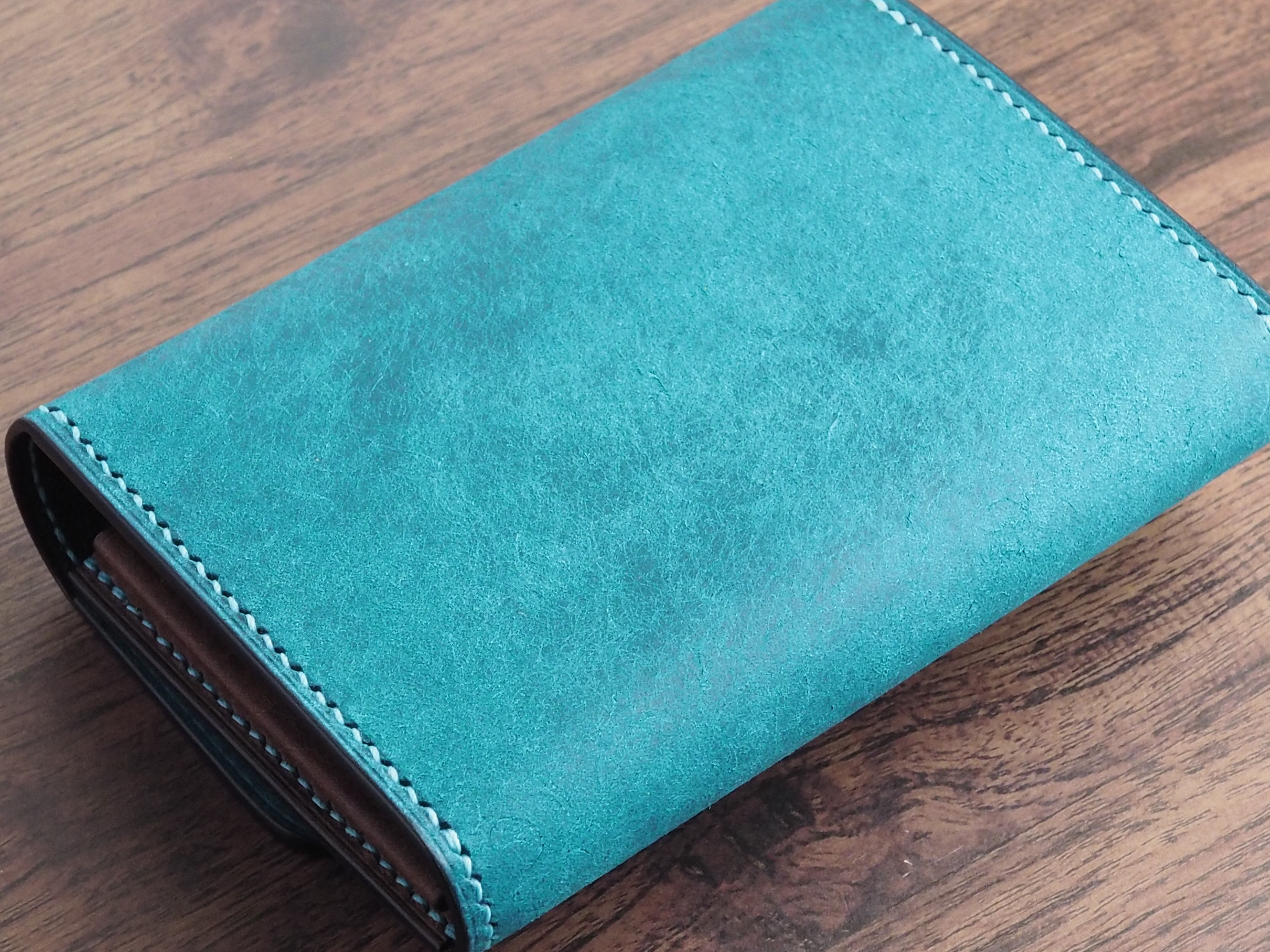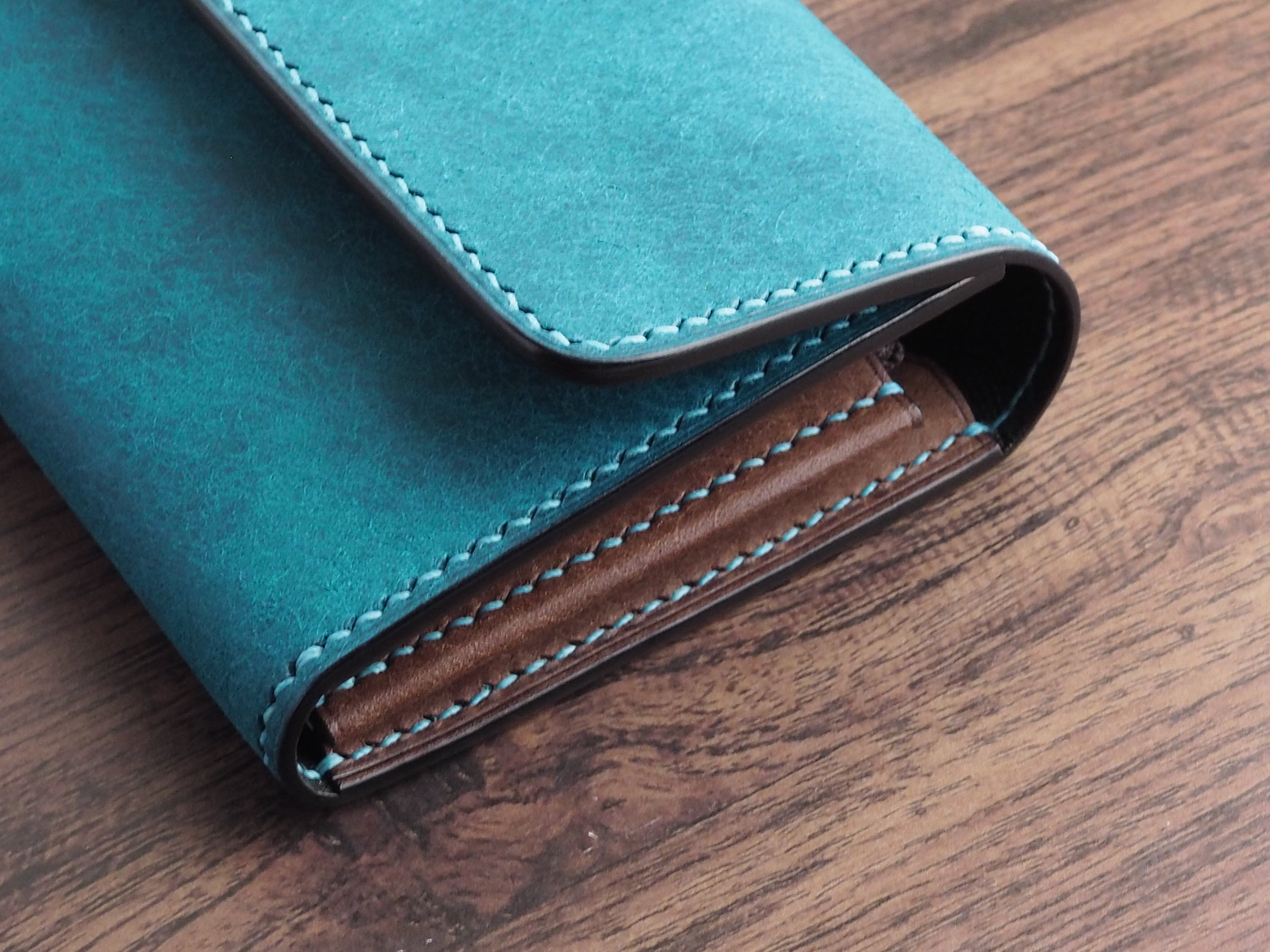 こちらは、稀少なイタリアンレザー「マルゴー」を使用し、手縫いで丁寧に製作したハーフサイズウォレットです。深みのあるトルケーゼ(トルコ石色、ターコイズ)とダークブラウンのバイカラー仕立てが、開くたびに個性を際立たせます。エイジングを早く楽しめる、本革を「育てる」喜びを知るための特別な逸品です。