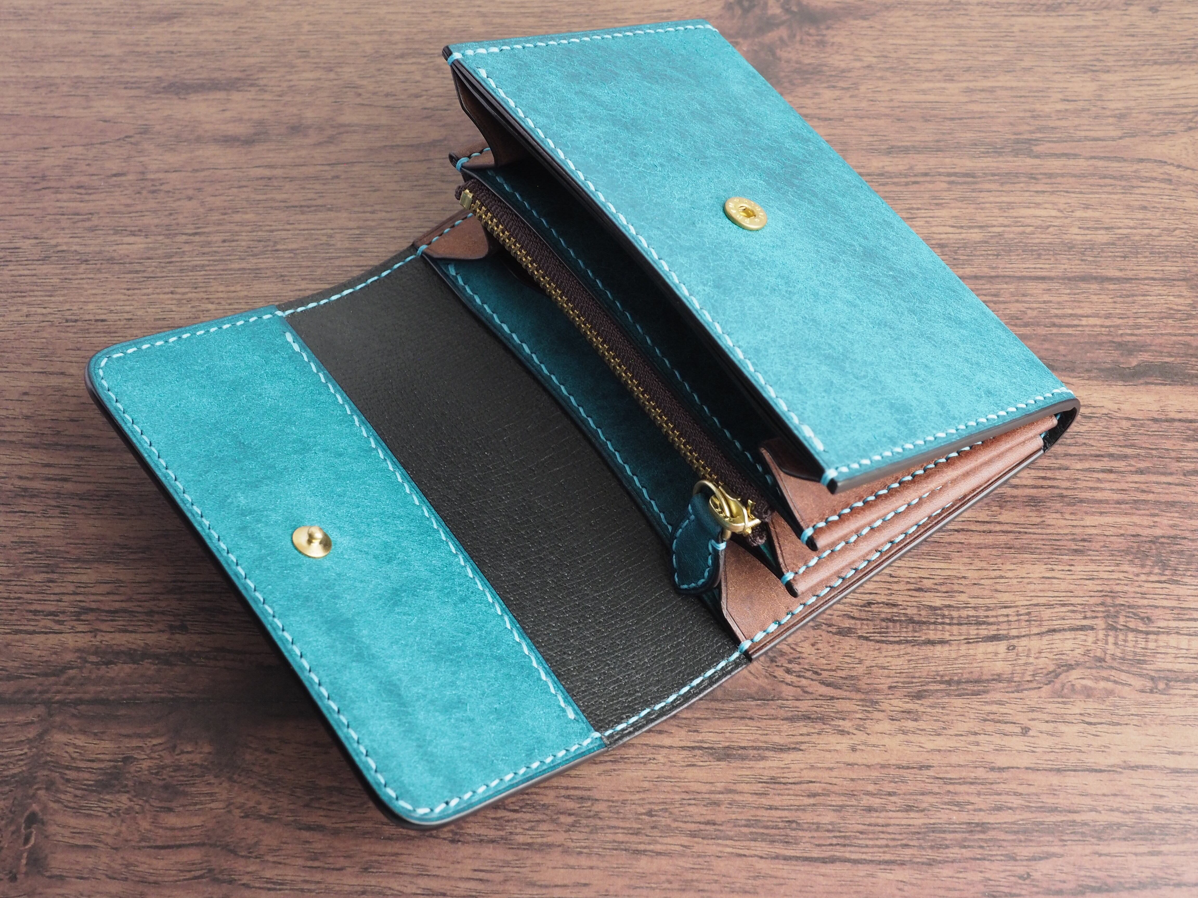 【手縫い/バイカラー】イタリアンレザー「マルゴー│ハーフサイズウォレット│トルケーゼ(ターコイズ)×ダークブラウン│