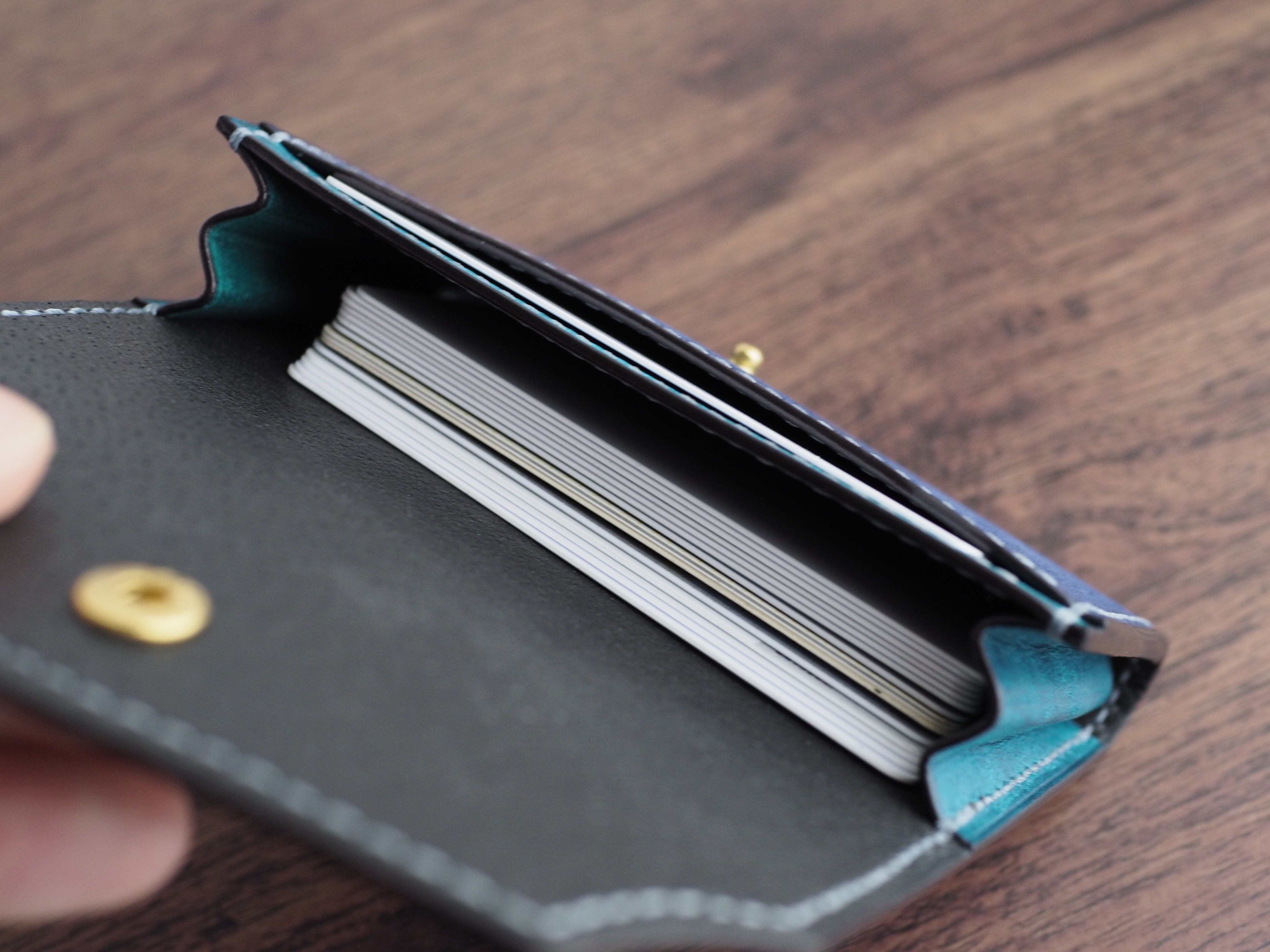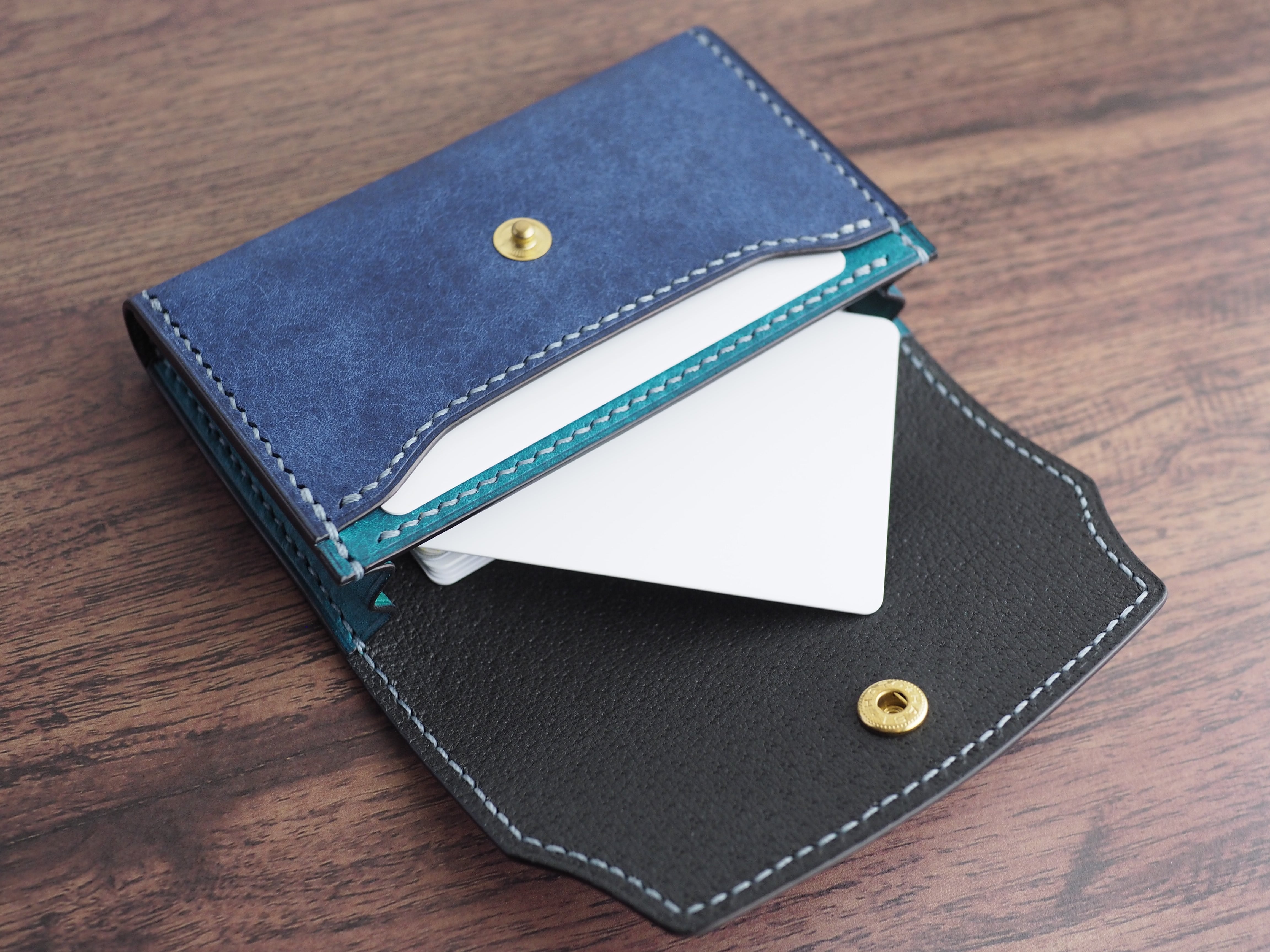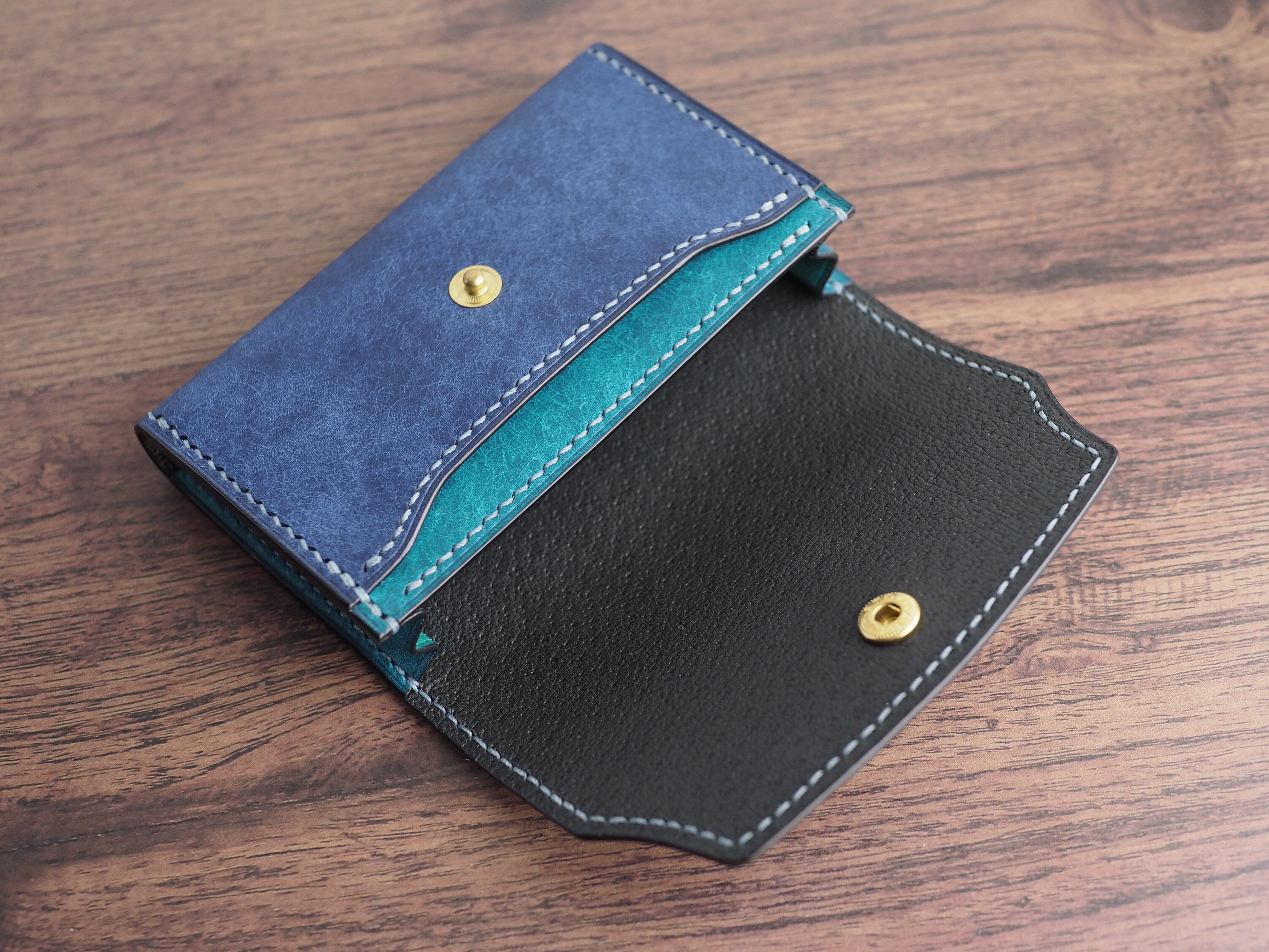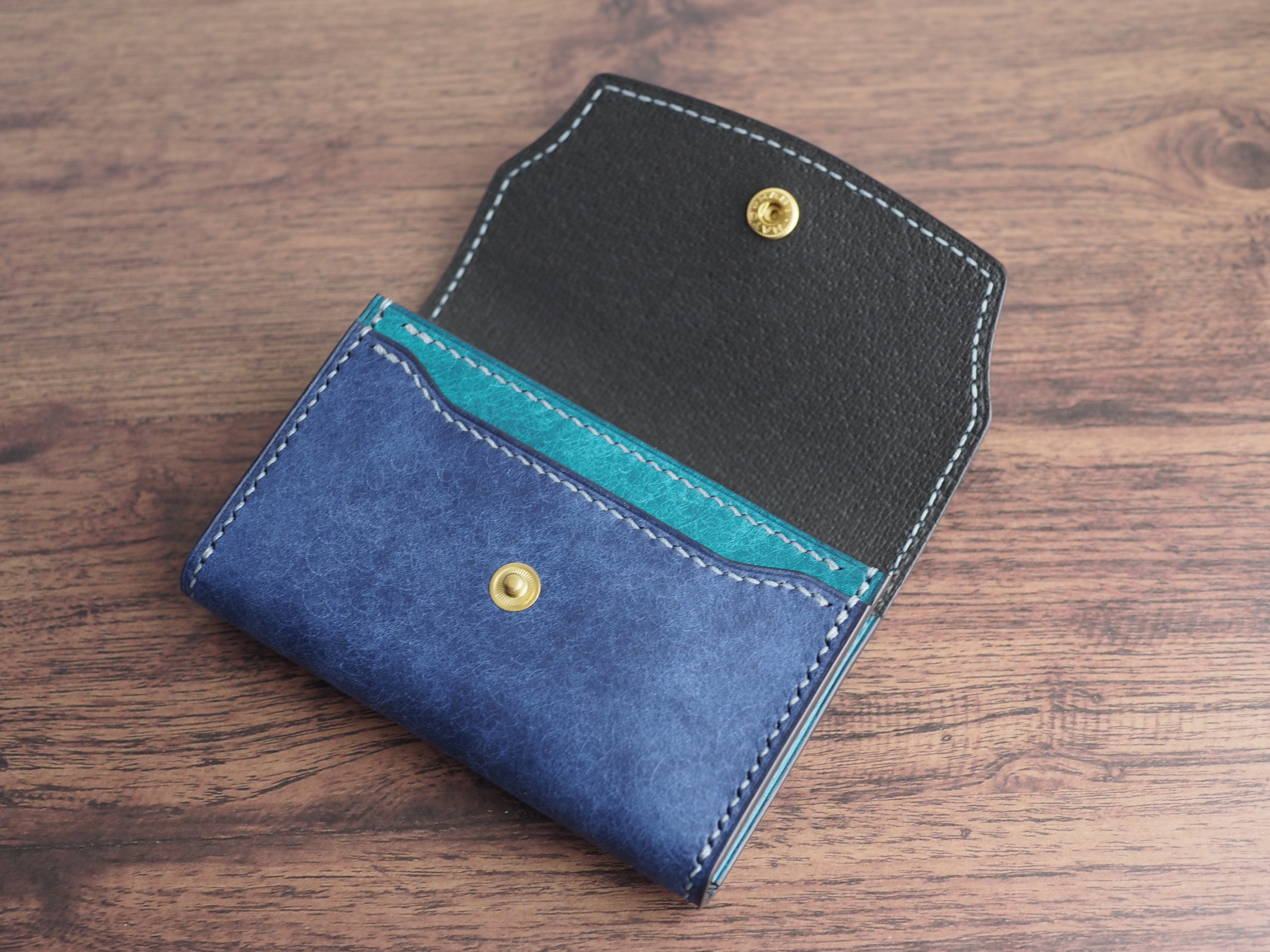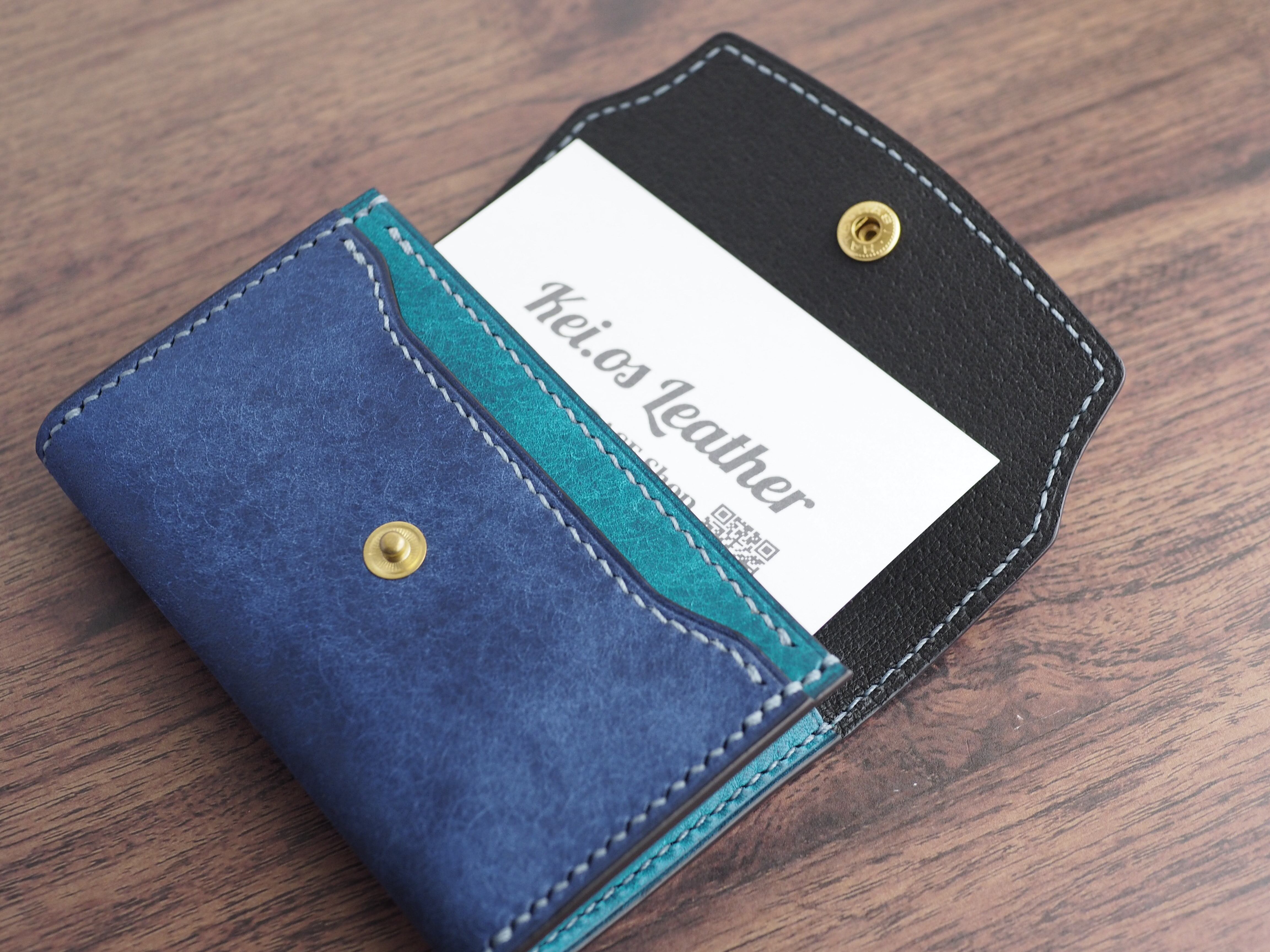 【手縫い/くるみボタン】マルゴーレザー カードケース(名刺・コイン対応)コバルト×トルケーゼ(ターコイズ)