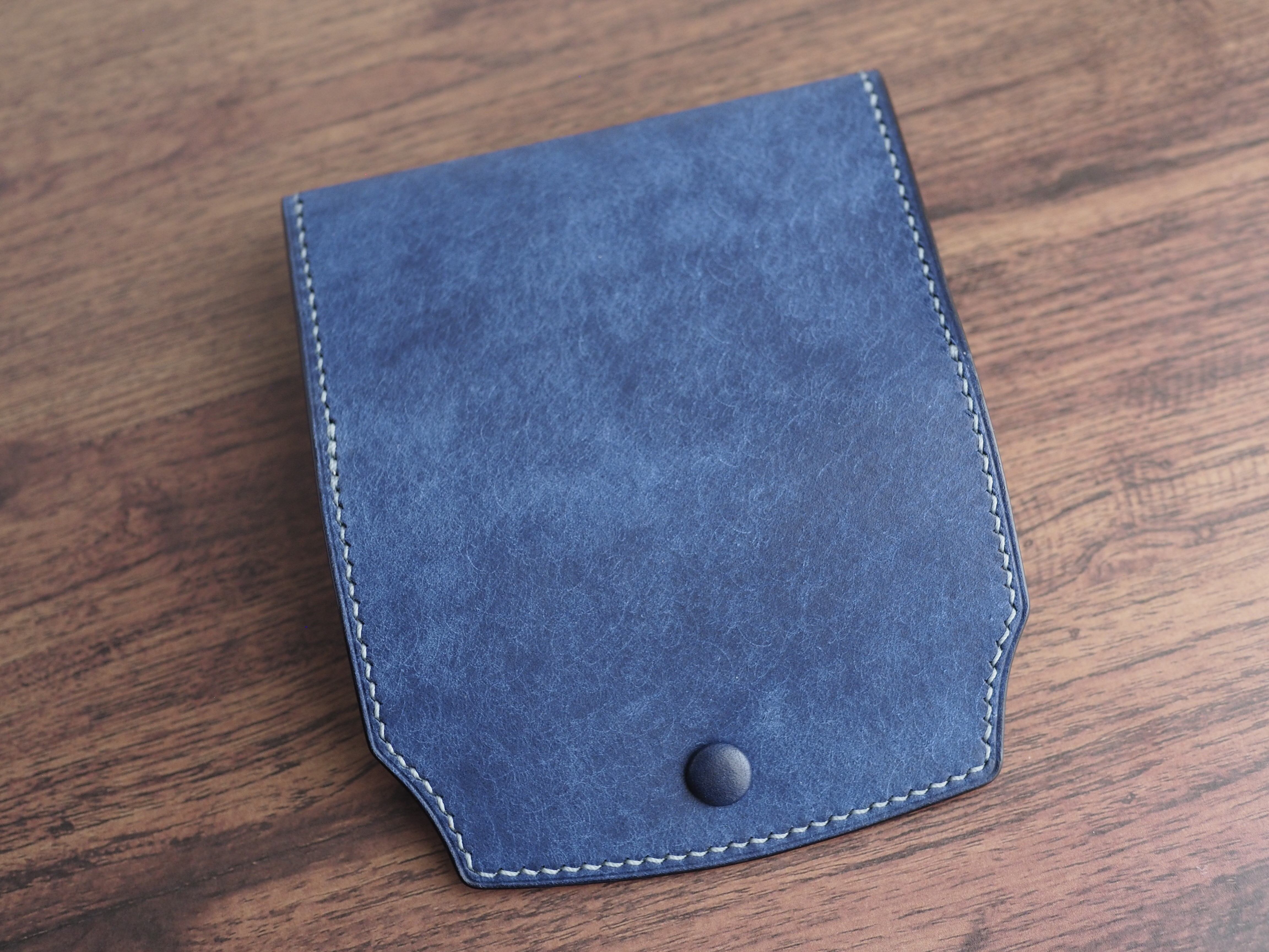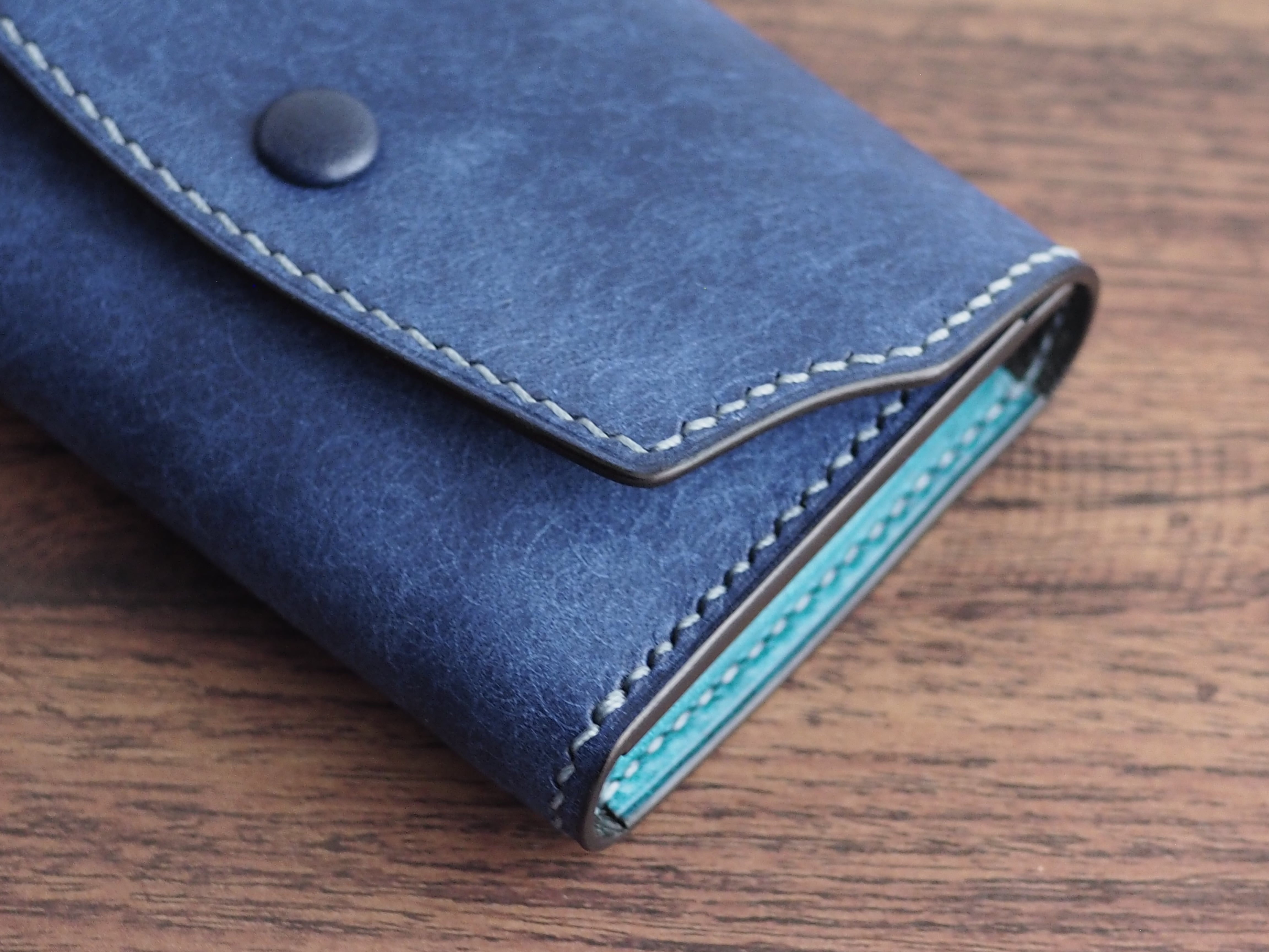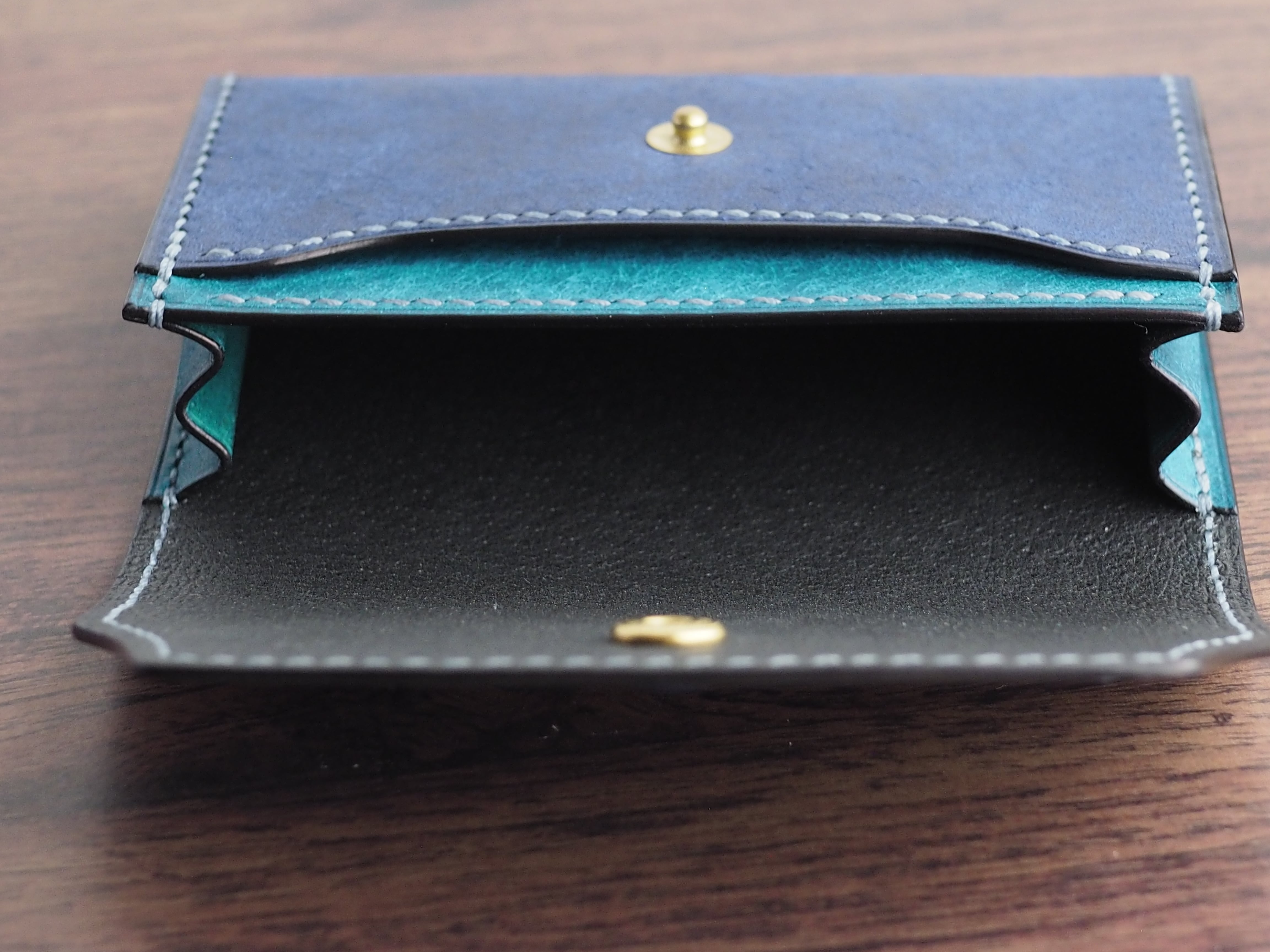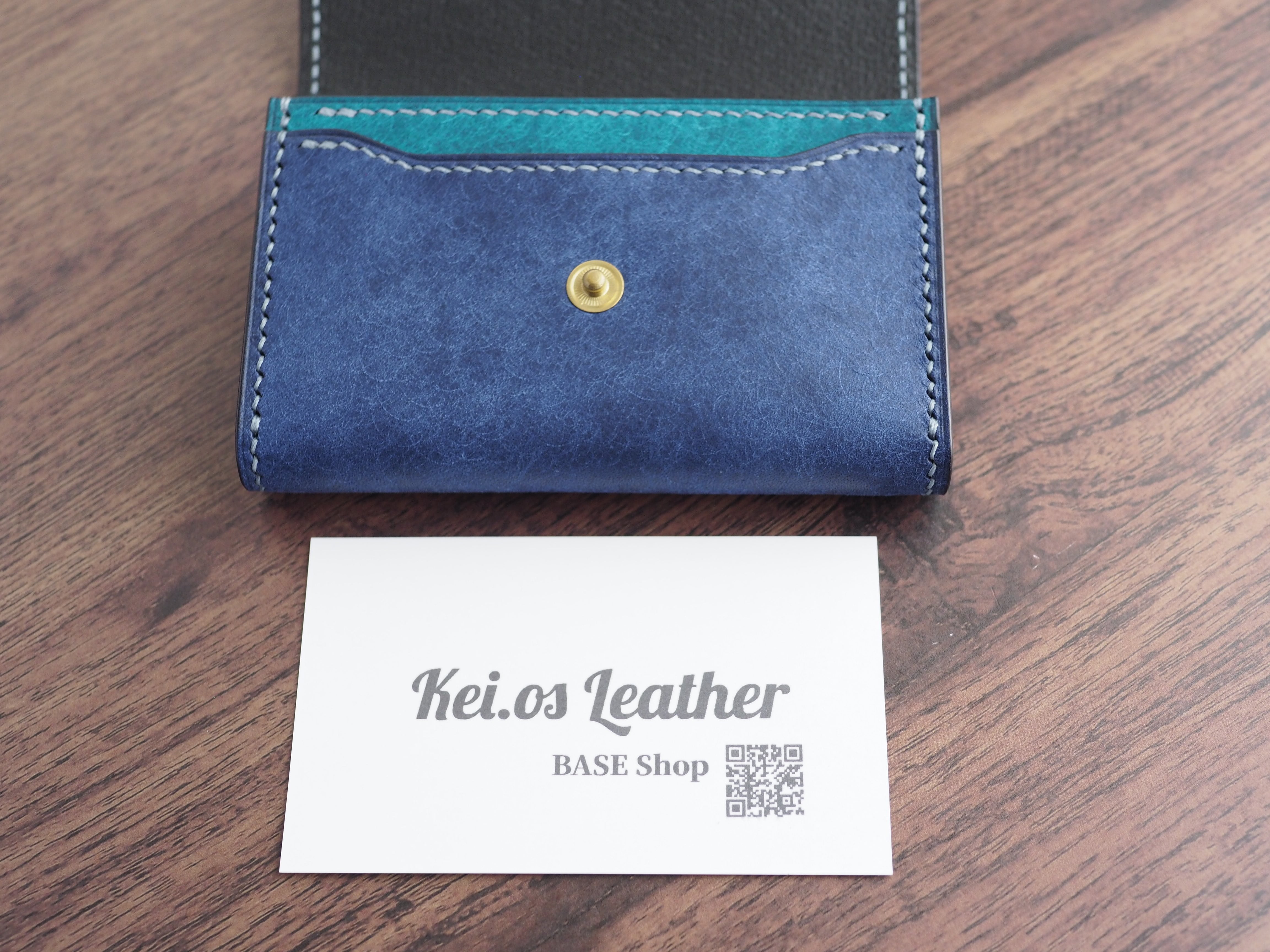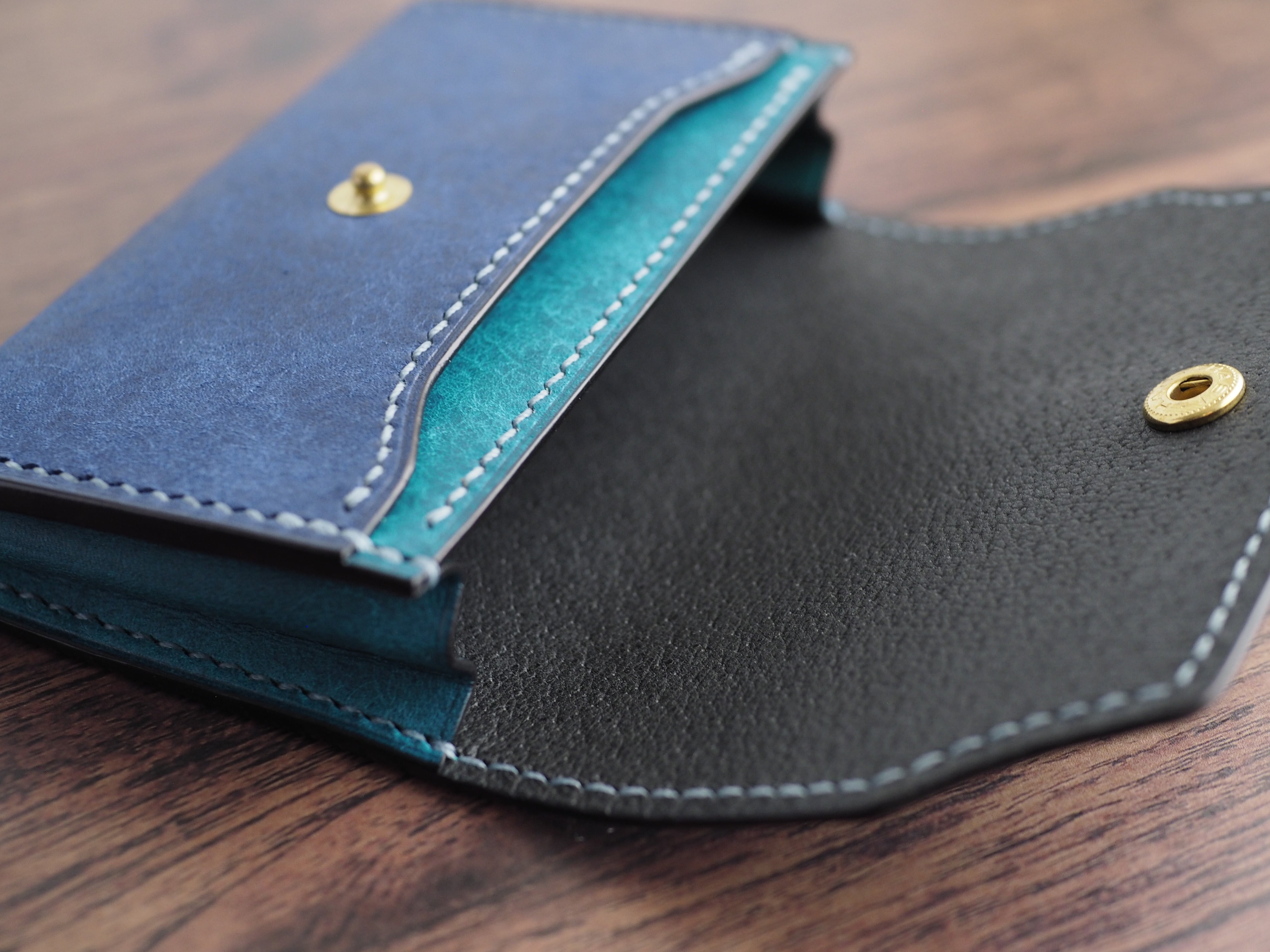 【手縫い/くるみボタン】マルゴーレザー カードケース(名刺・コイン対応)コバルト×トルケーゼ(ターコイズ)