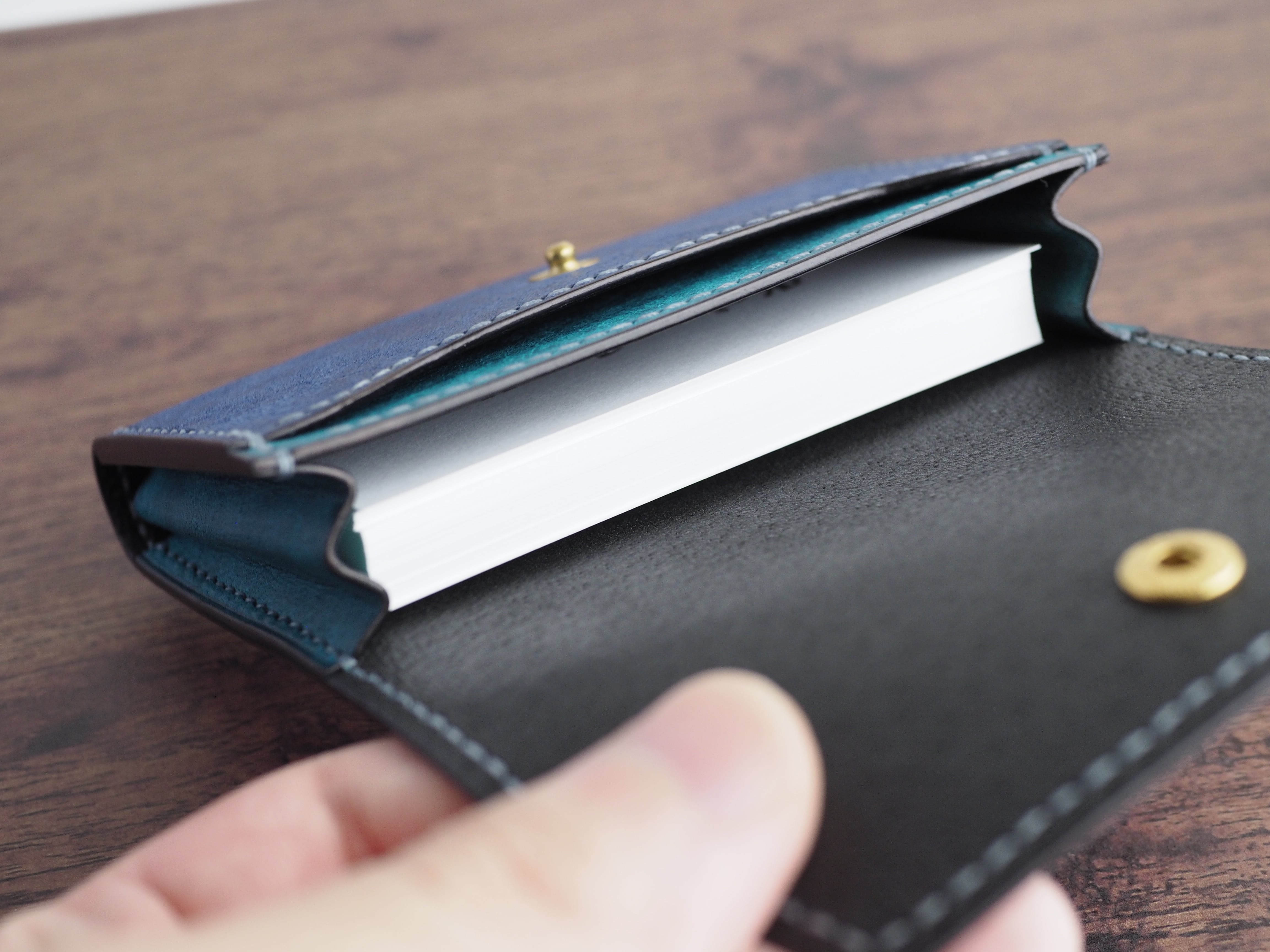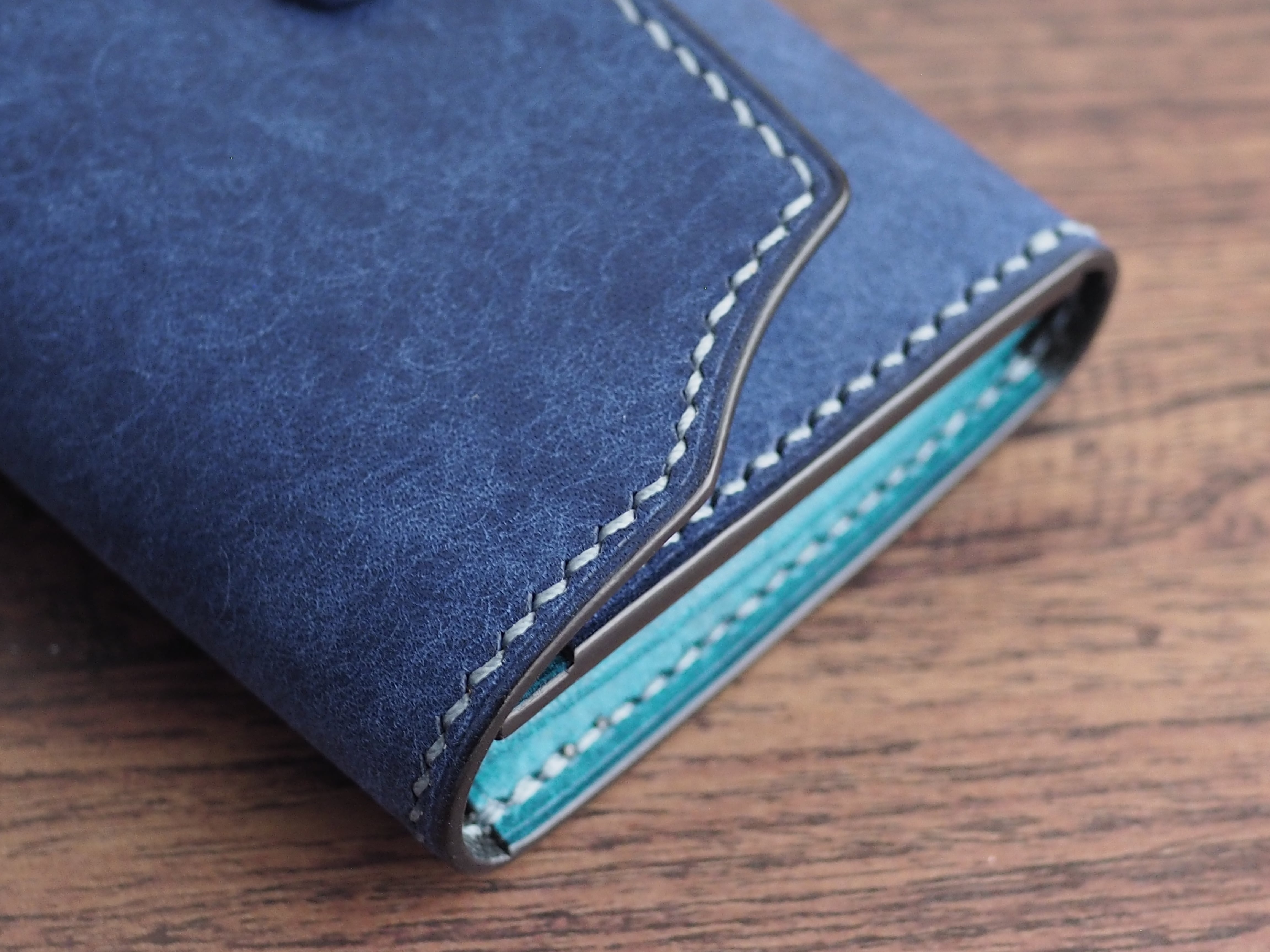 4.美しいバイカラー: 外装の鮮やかなコバルトと、マチに使用したトルケーゼの対比的なバイカラーが、開くたびに個性を際立たせます。