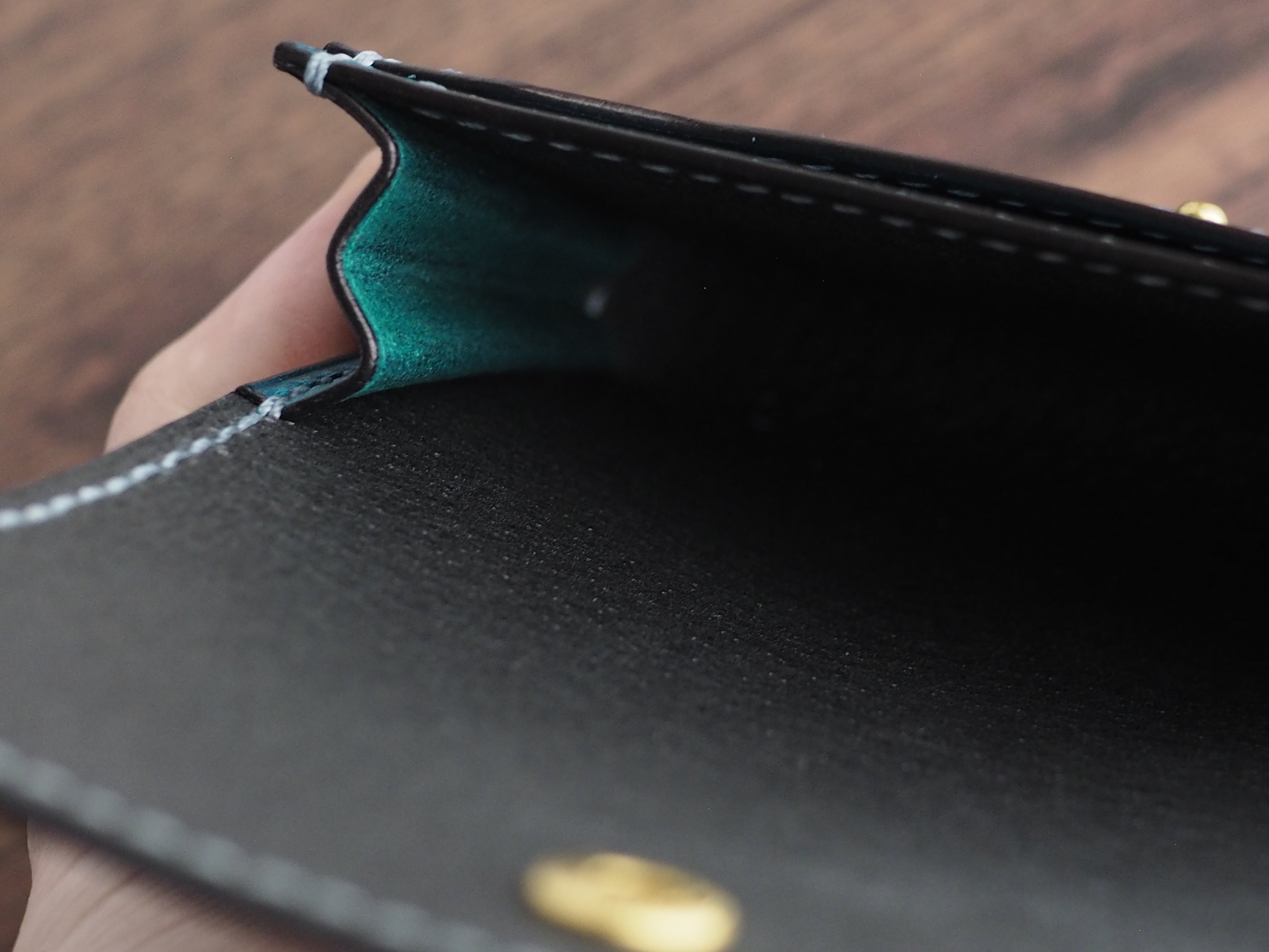 マチの柔軟性: マチ部分の革のみ、柔軟性の確保のため一枚革で仕立てています。これは、カードやコインの出し入れをスムーズにするための、機能性を重視した仕様です。