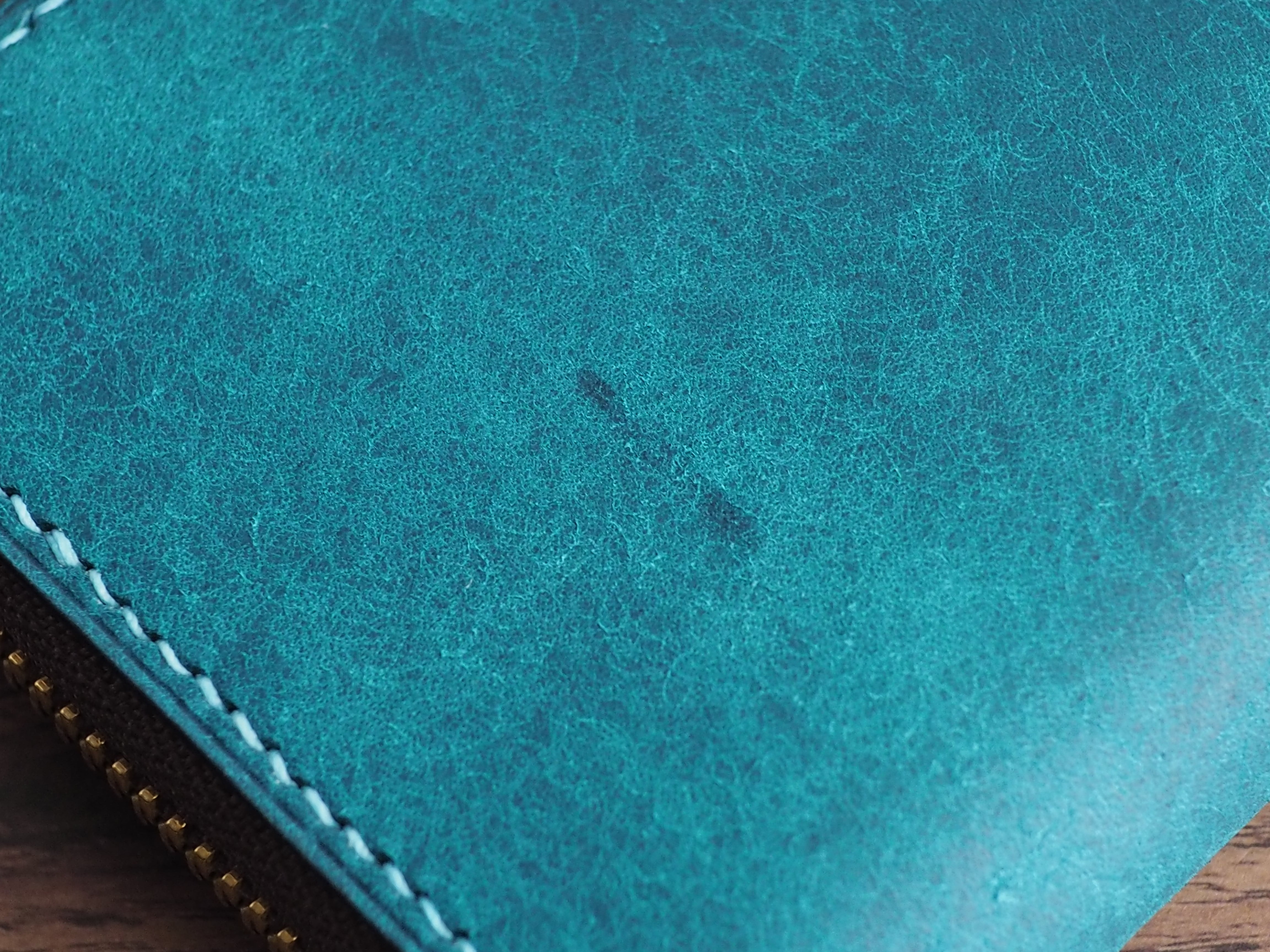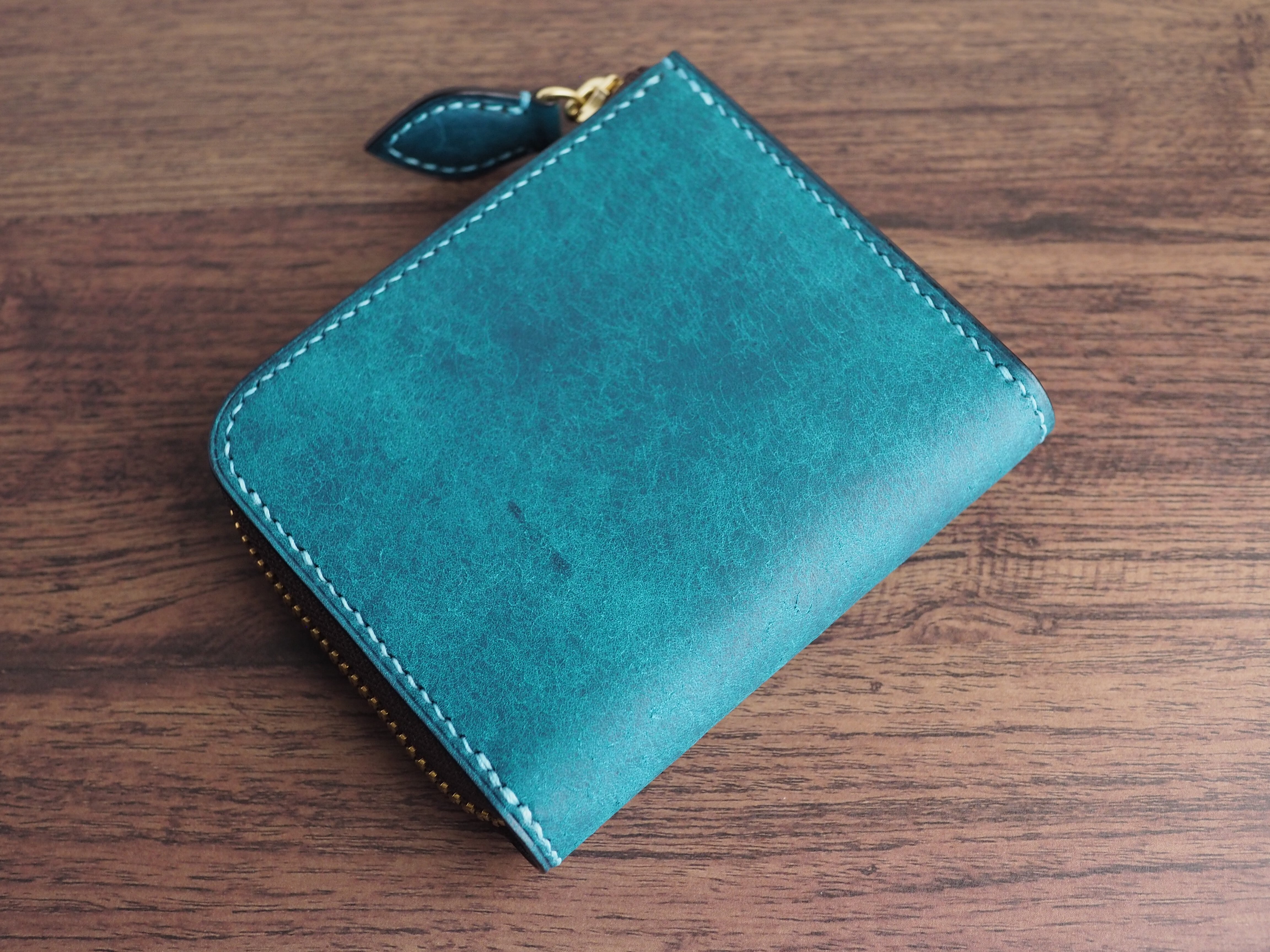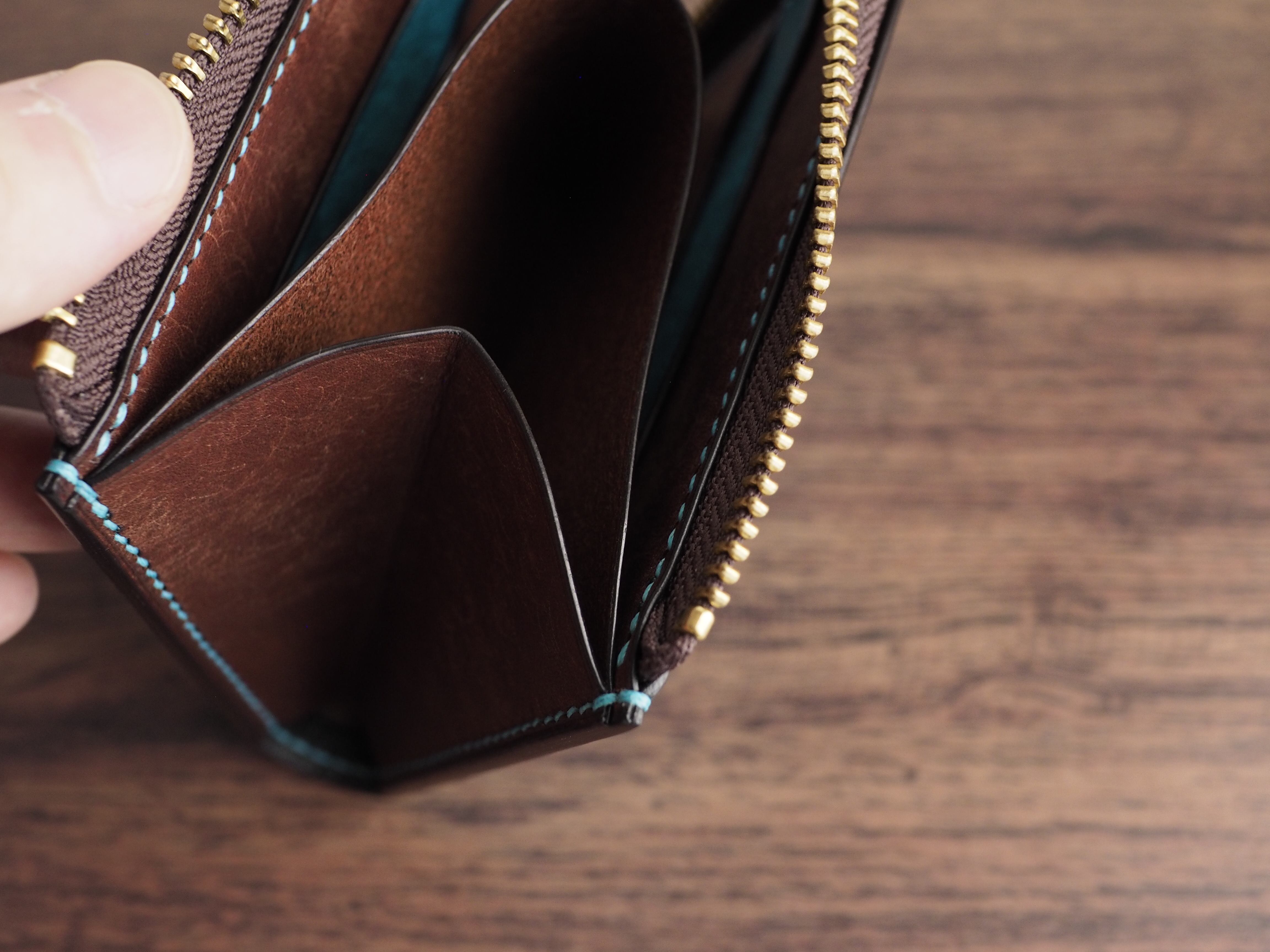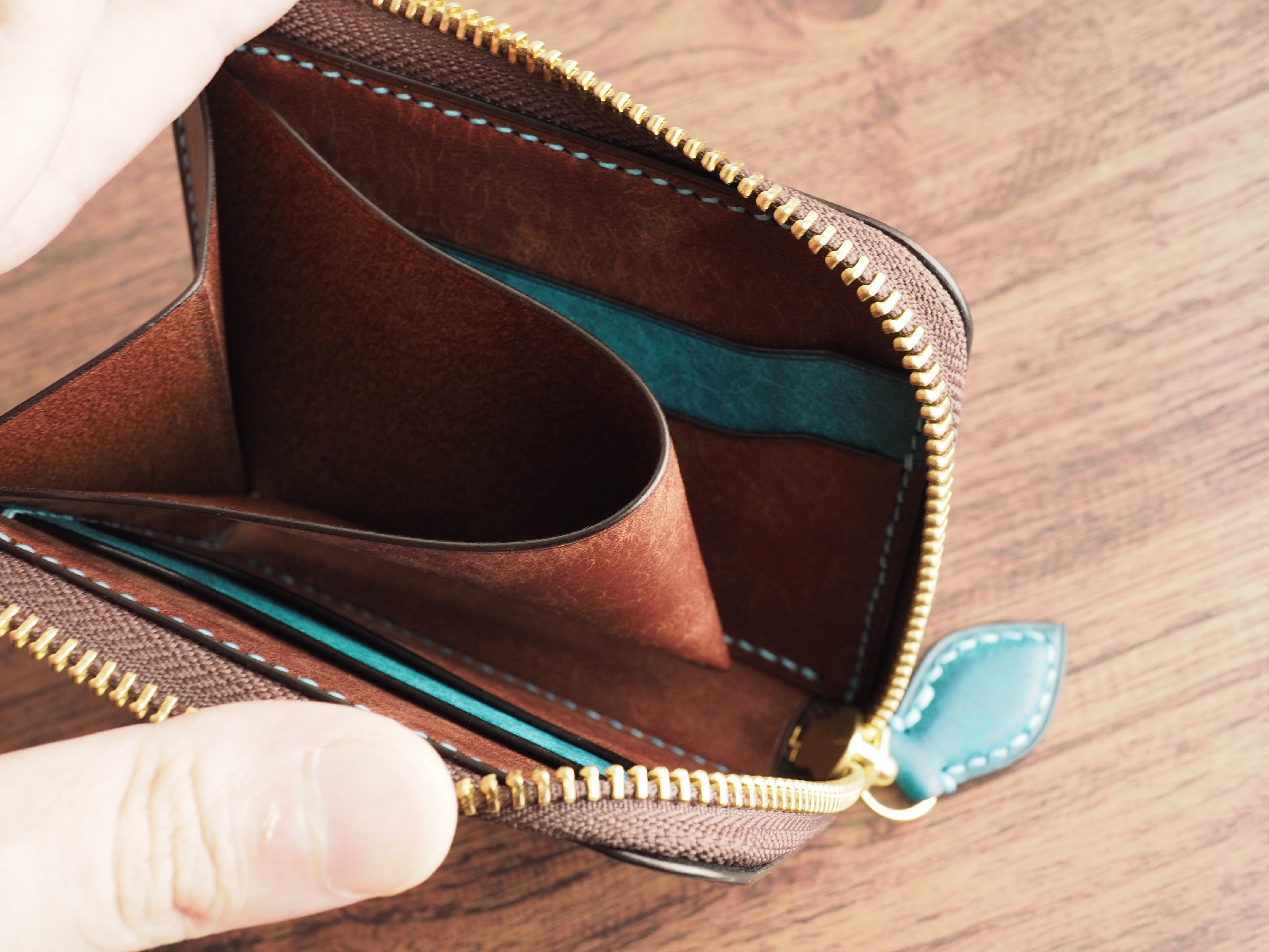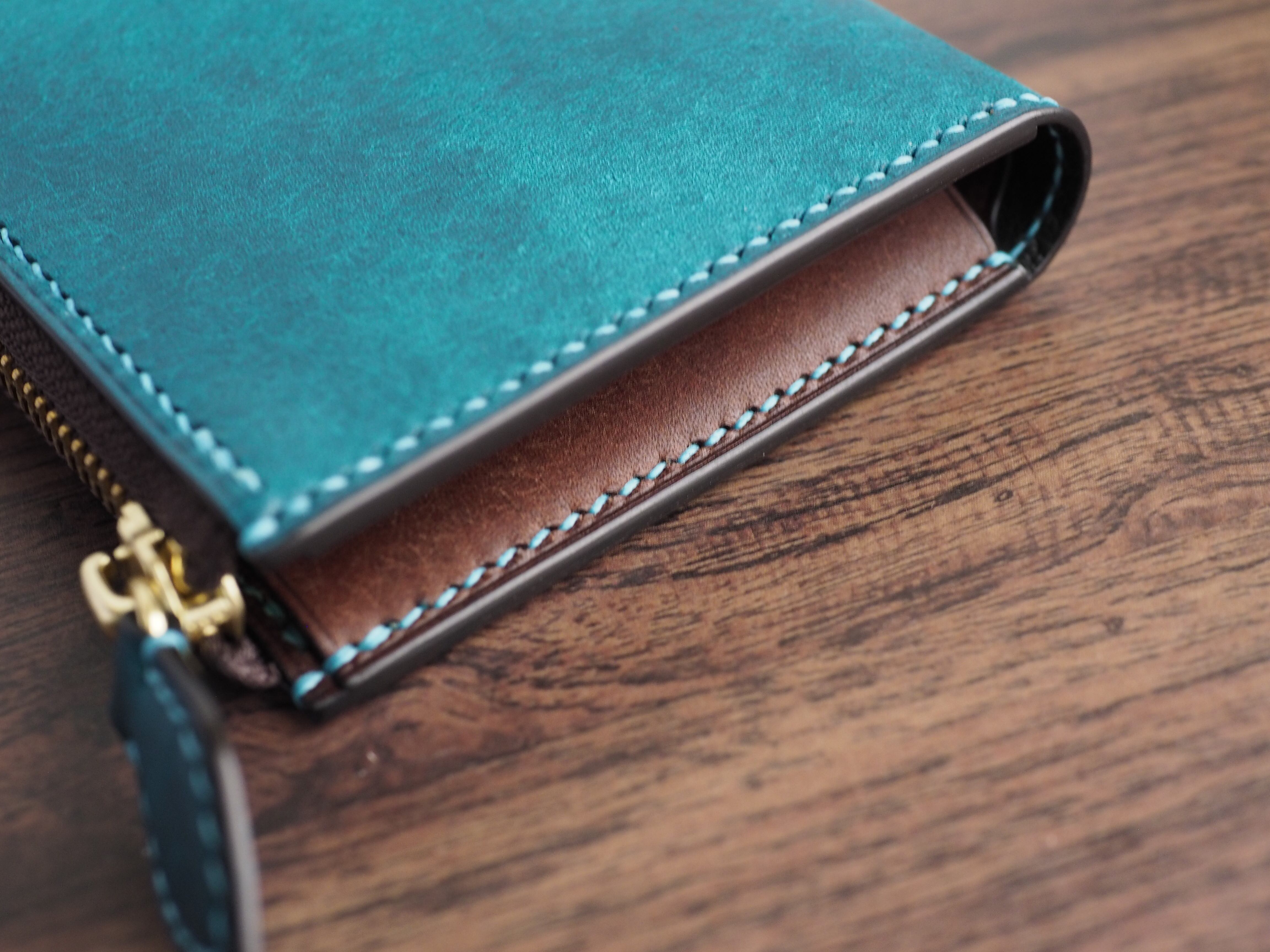 イタリアンレザーのマルゴーを使い手縫いで製作したL字ファスナーミニ財布(ハーフジップウォレット)になります。色はトルケーゼ(ターコイズ)とダークブラウンを使用しています。外装にはアメ豚を裏貼りすることで強度と張りを調整しています。