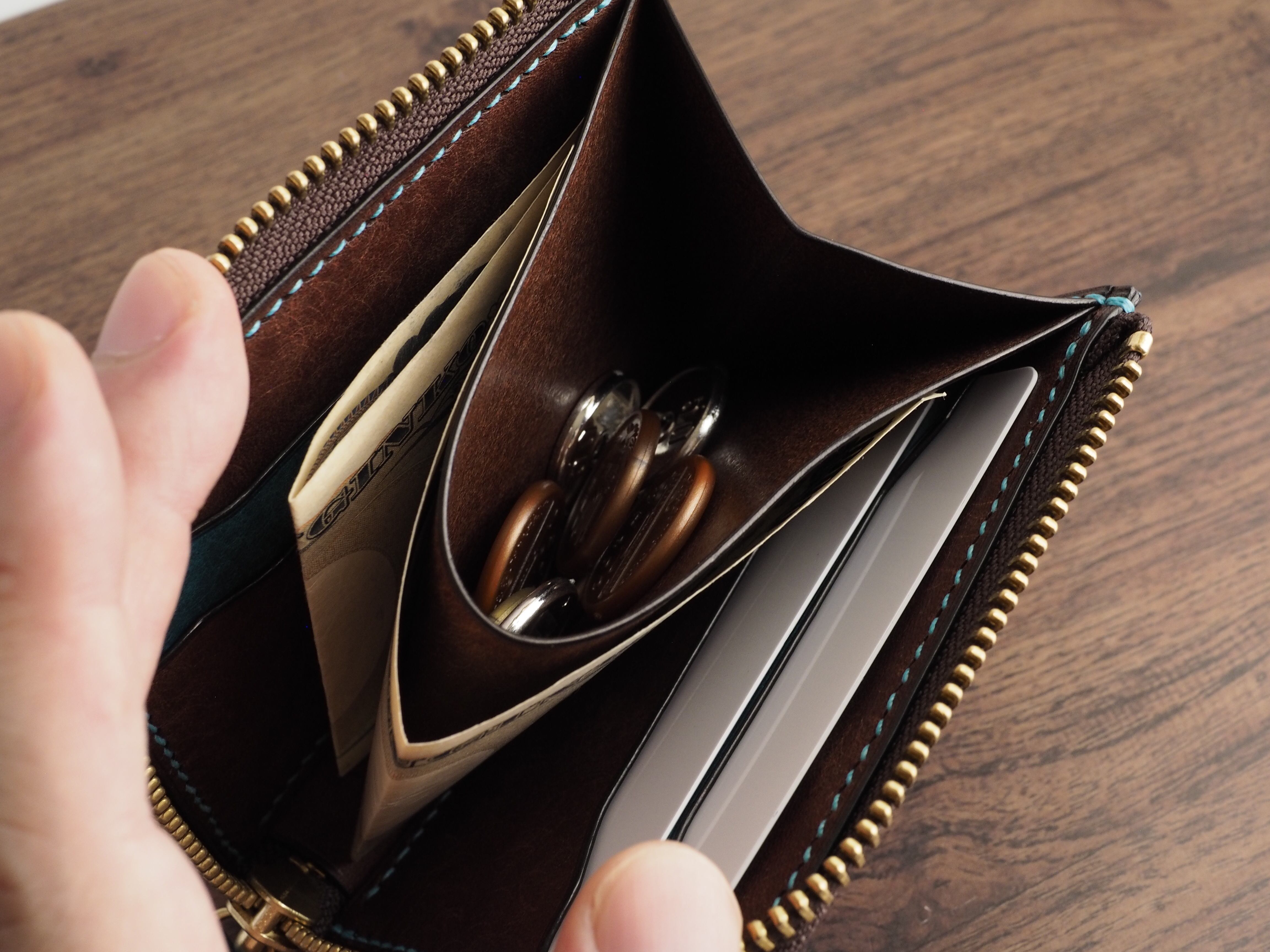 コインポケットは柔軟さを出すために裏貼りなどをせず床面を磨いて一枚革で仕立てており、大きめのマチを備え、内部の視認性を良くすることでコインを取り出しやすくなっています。