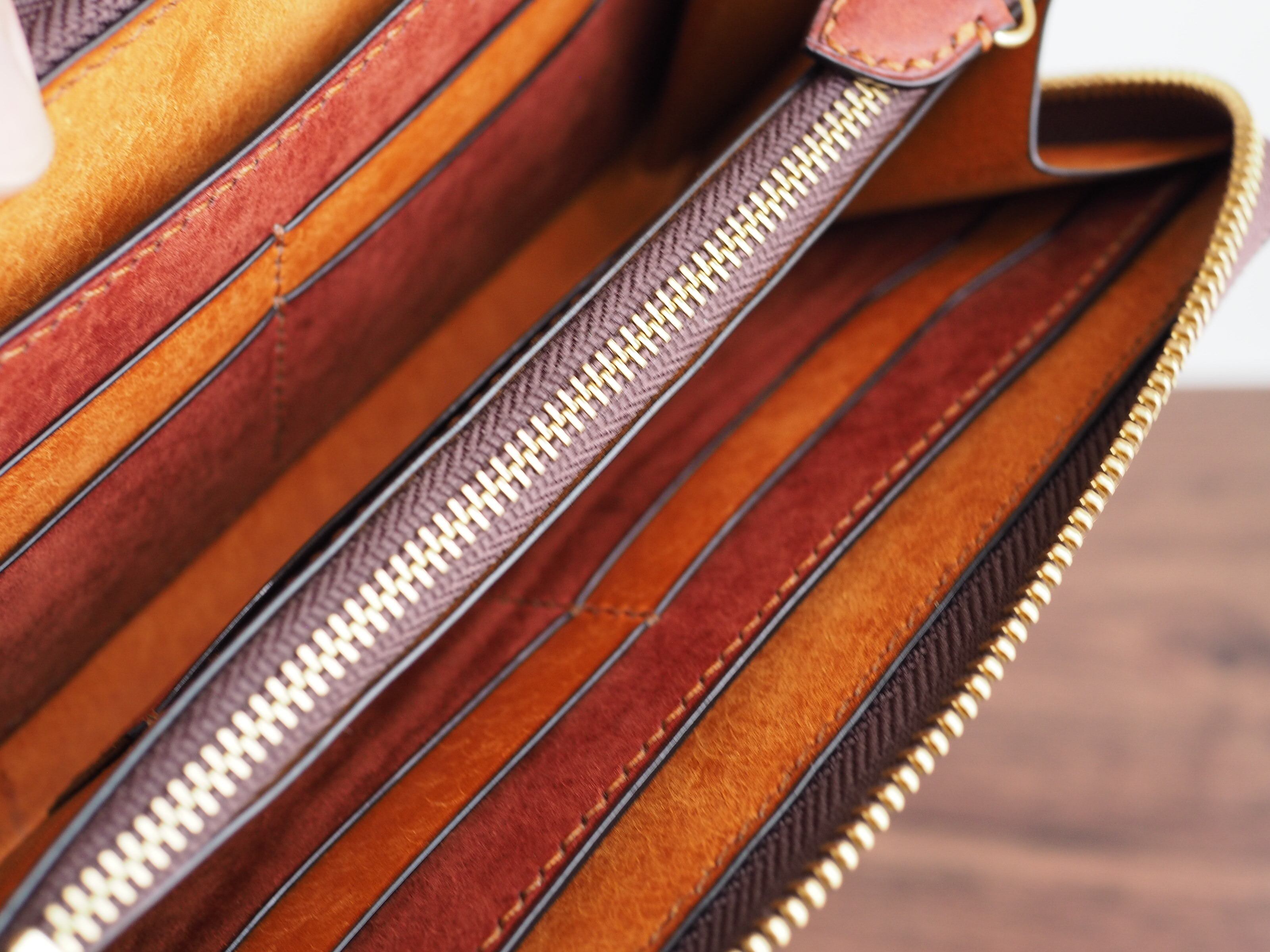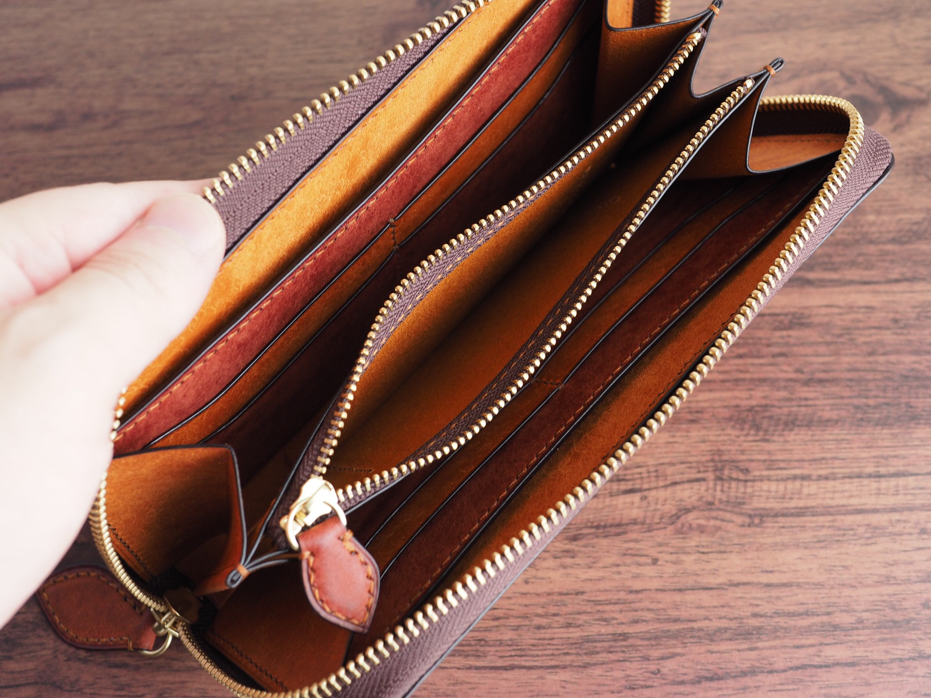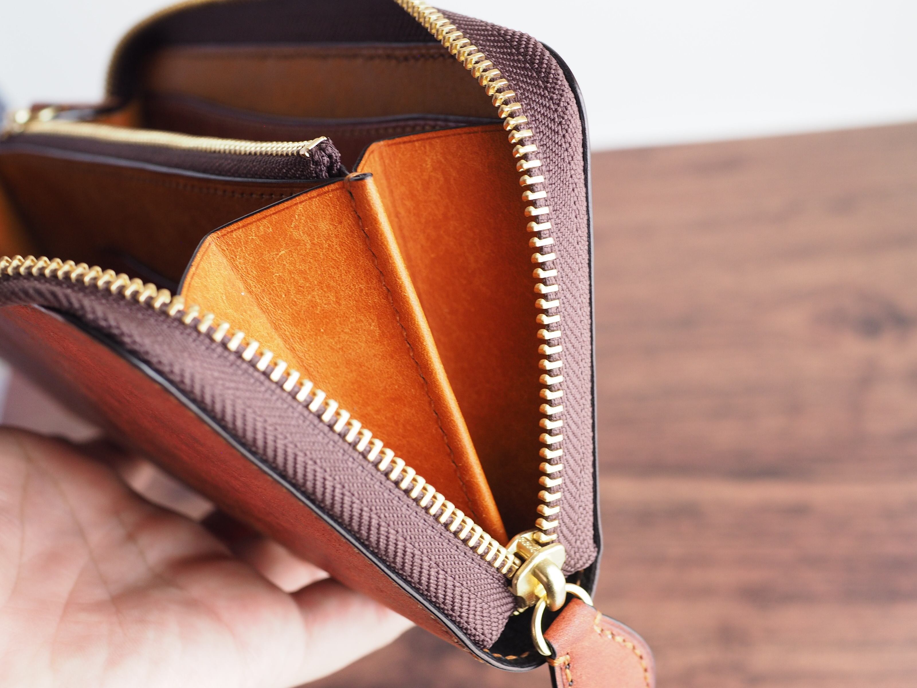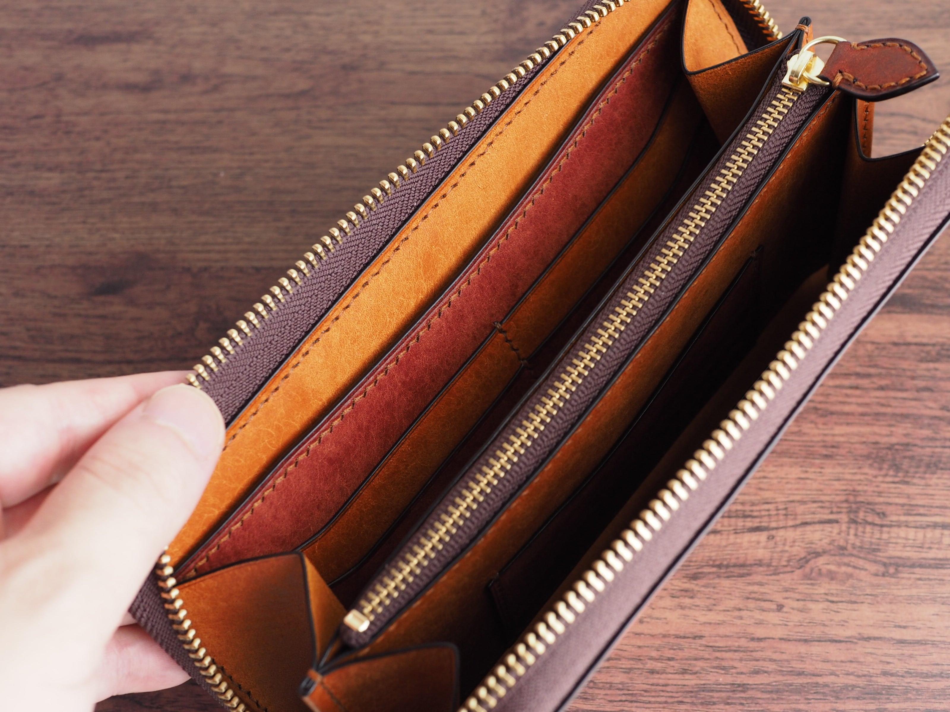 外装に落ち着いた赤みのバーガンディ、内装に明るく鮮やかなフィエーノ(キャメル)を採用。2色の革を交互に配置するバイカラーデザインは、開いた時に豊かな表情を見せ、長く使っても飽きさせません。