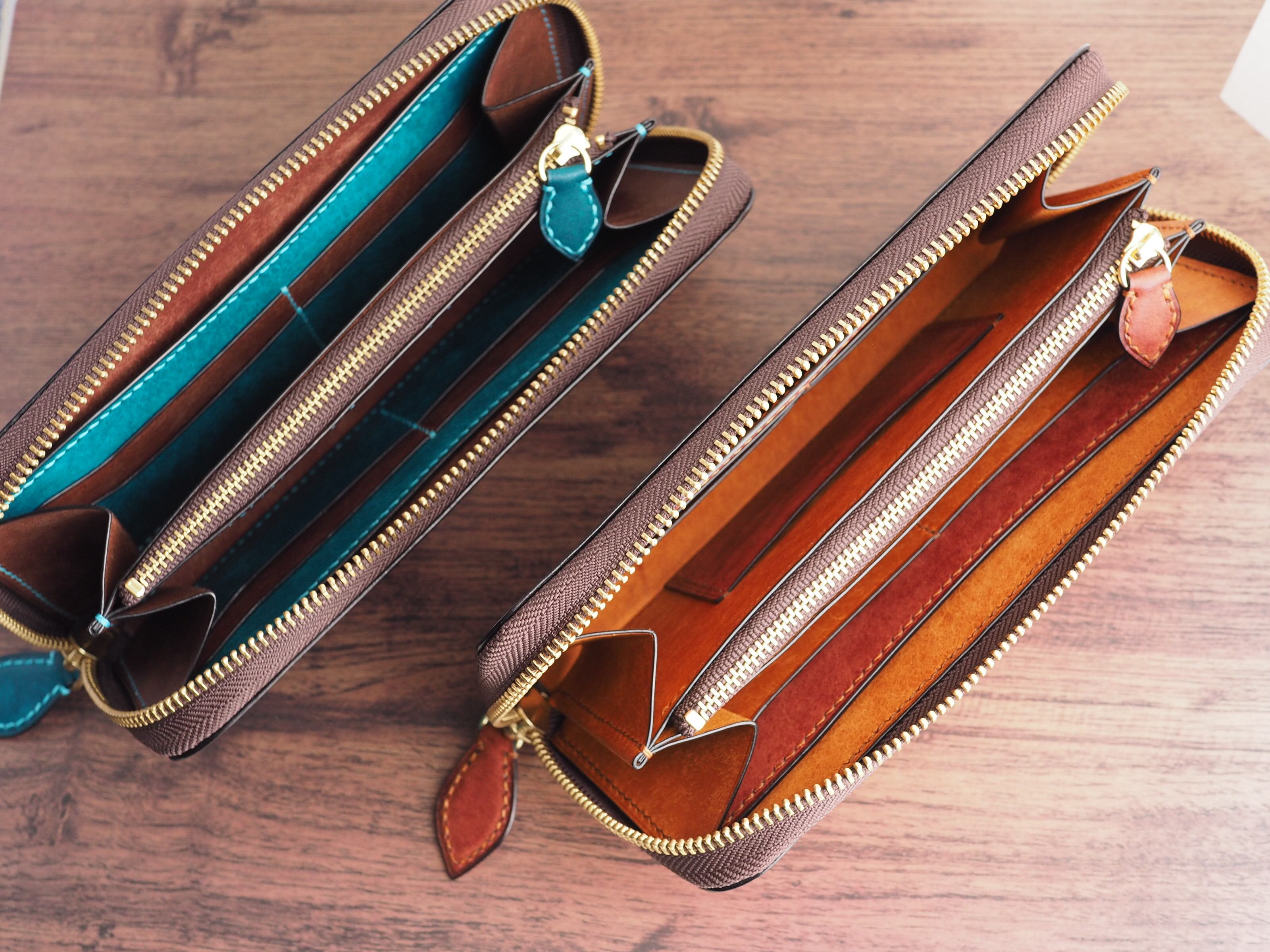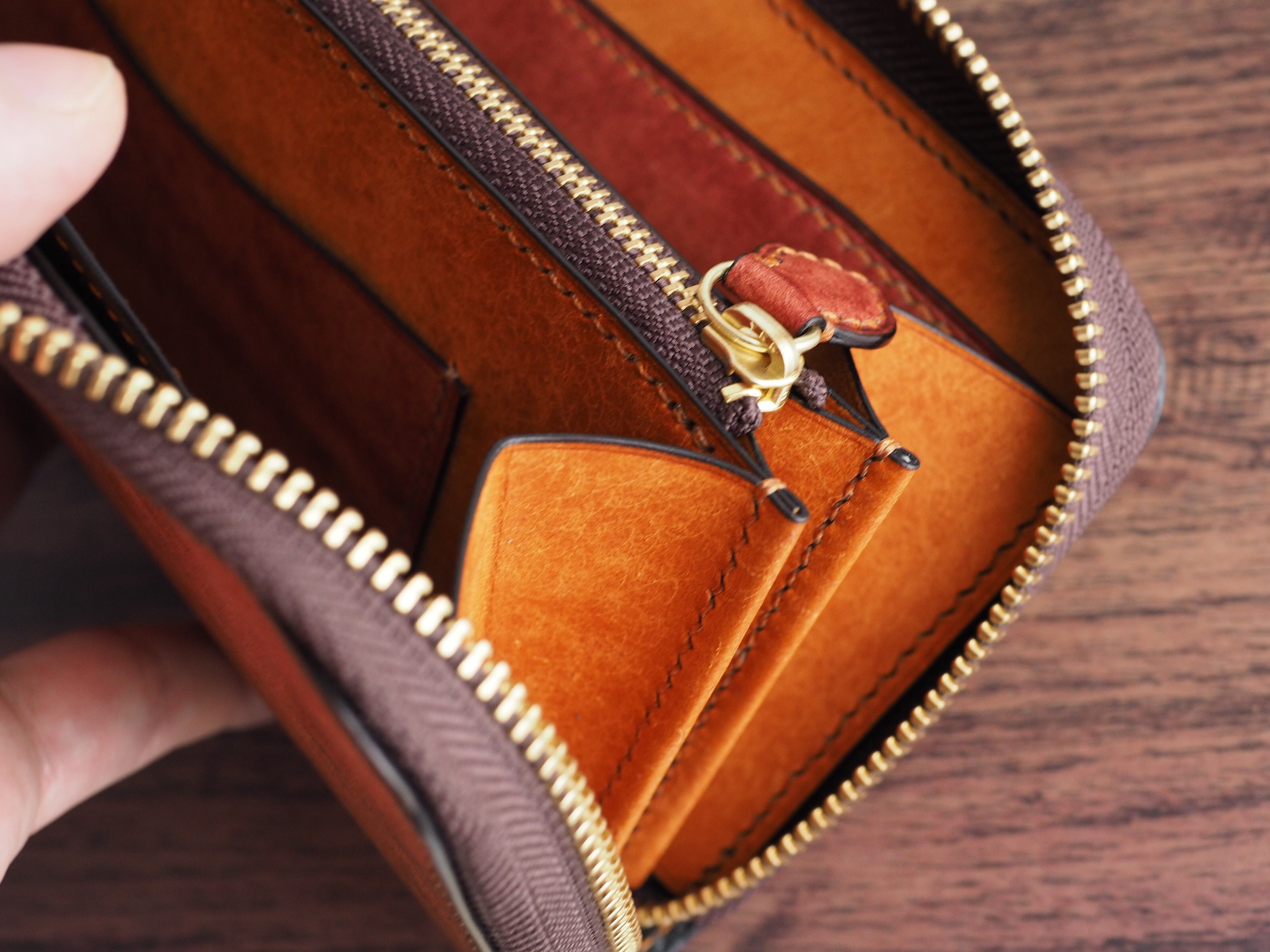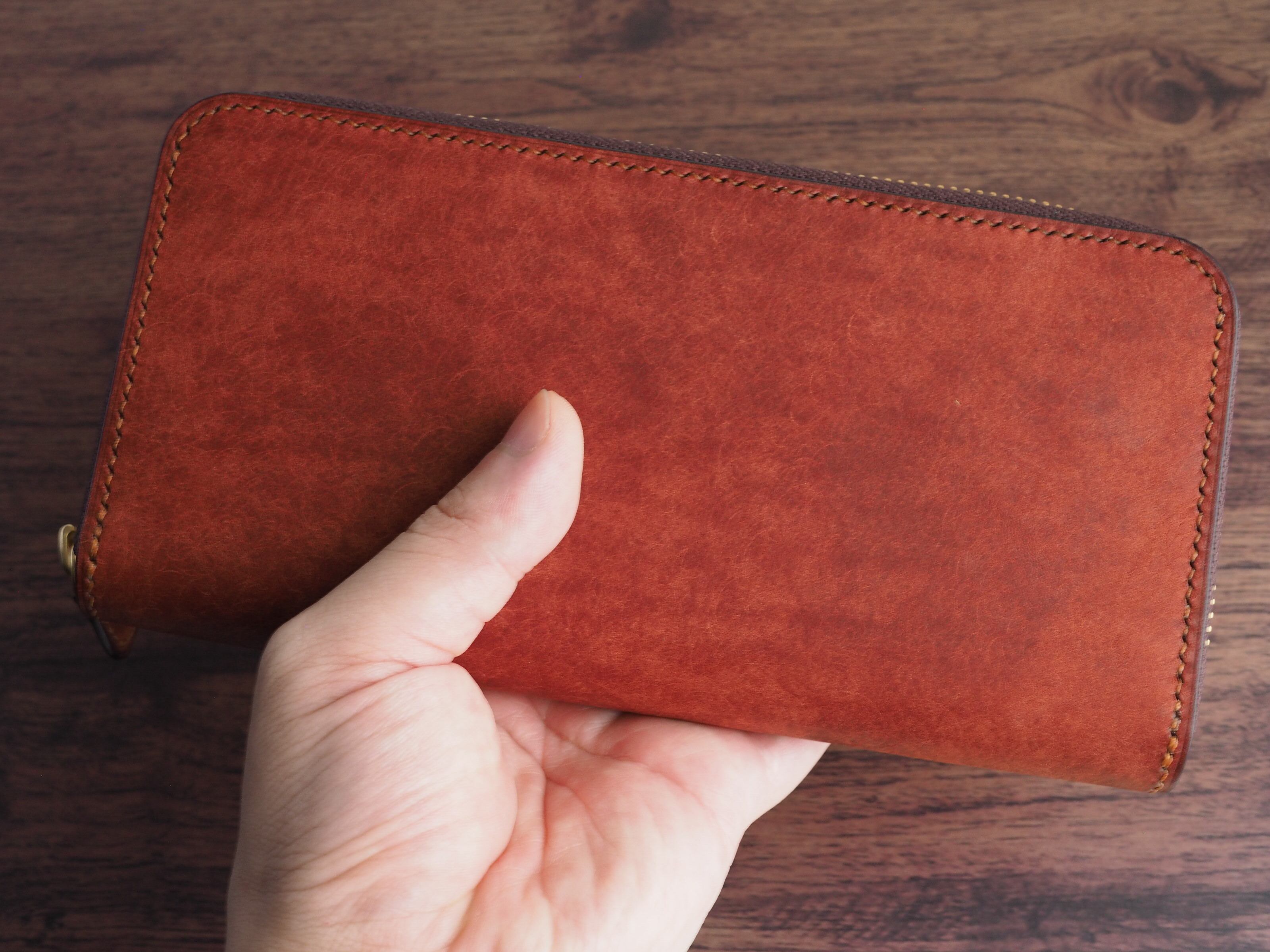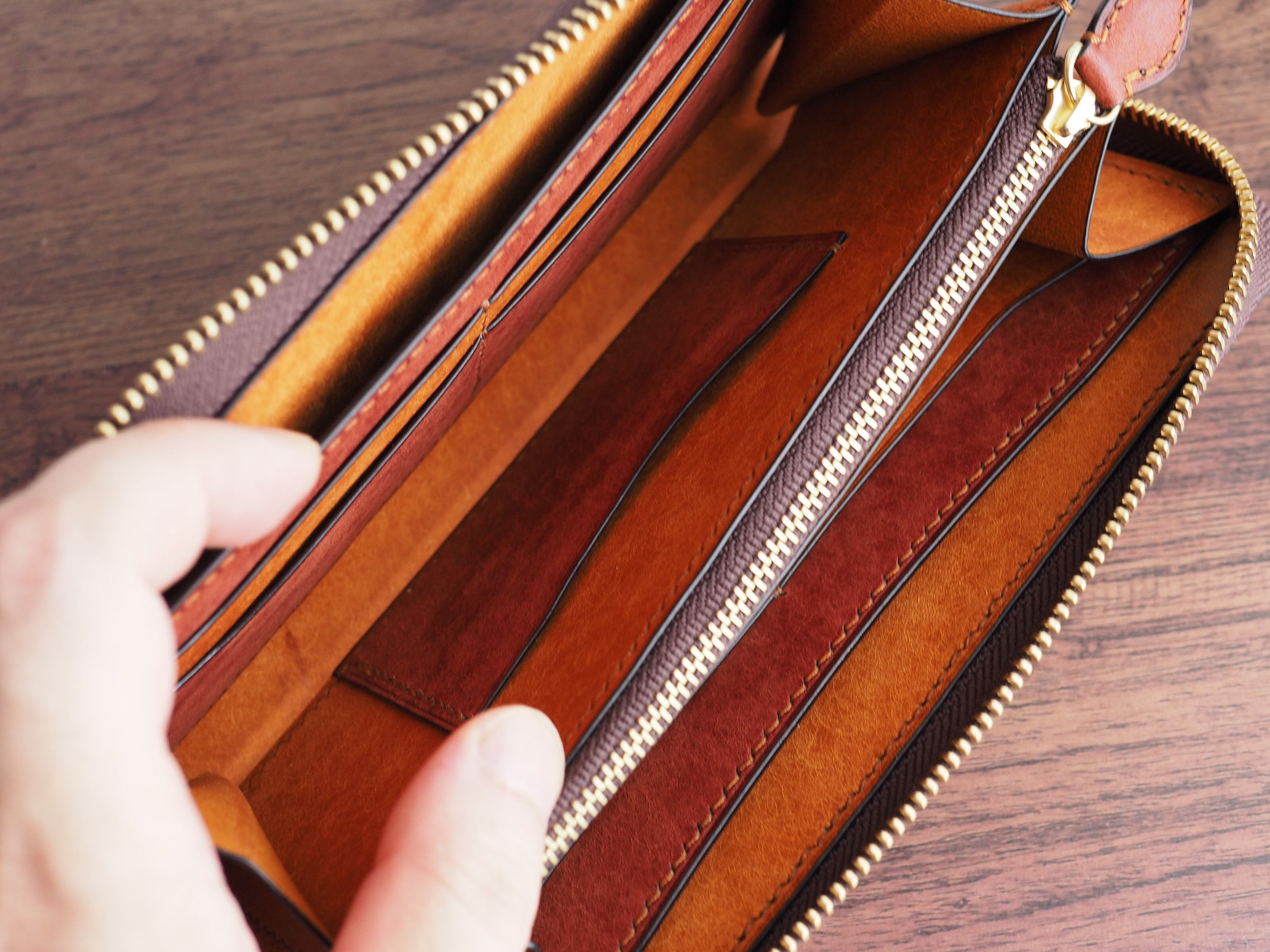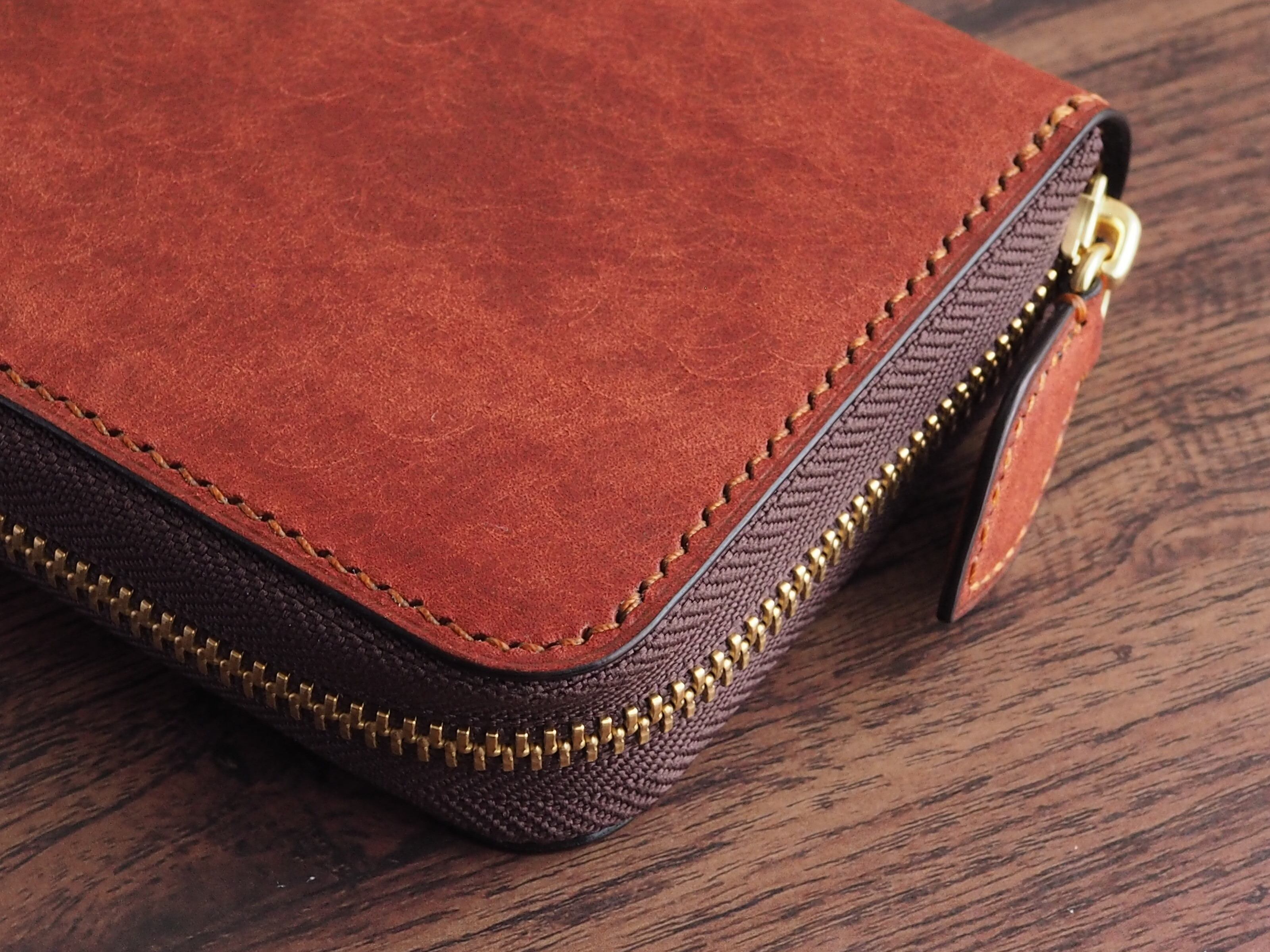 こちらは、稀少なイタリアンレザー「マルゴー」を使用し、革職人が手縫いで丁寧に製作したラウンドファスナー長財布です。深みのあるバーガンディと鮮やかなキャメルのバイカラー仕立てが、開くたびに個性を際立たせます。エイジングを早く楽しめる、本革好きのための特別な逸品です。