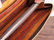 コバ(革の断面)は、染色後に蜜蝋を熱で溶かし込み、滑らかになるまで丹念に磨き上げました。さらに、コバと糸の間に「稔」を引くことで、革の表情が引き締まり、全体に高級感のある印象を与えます。