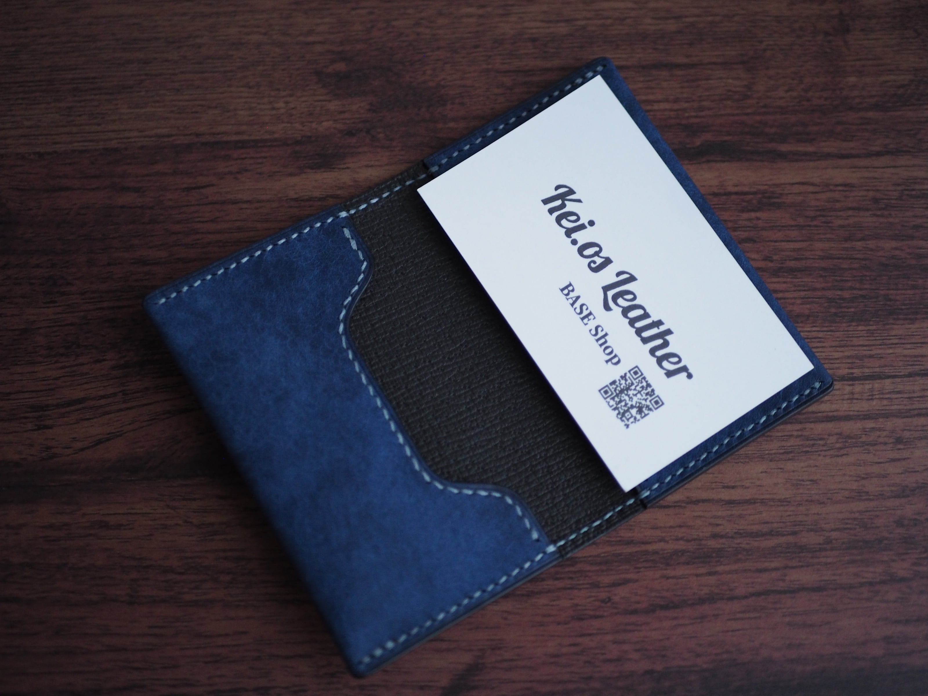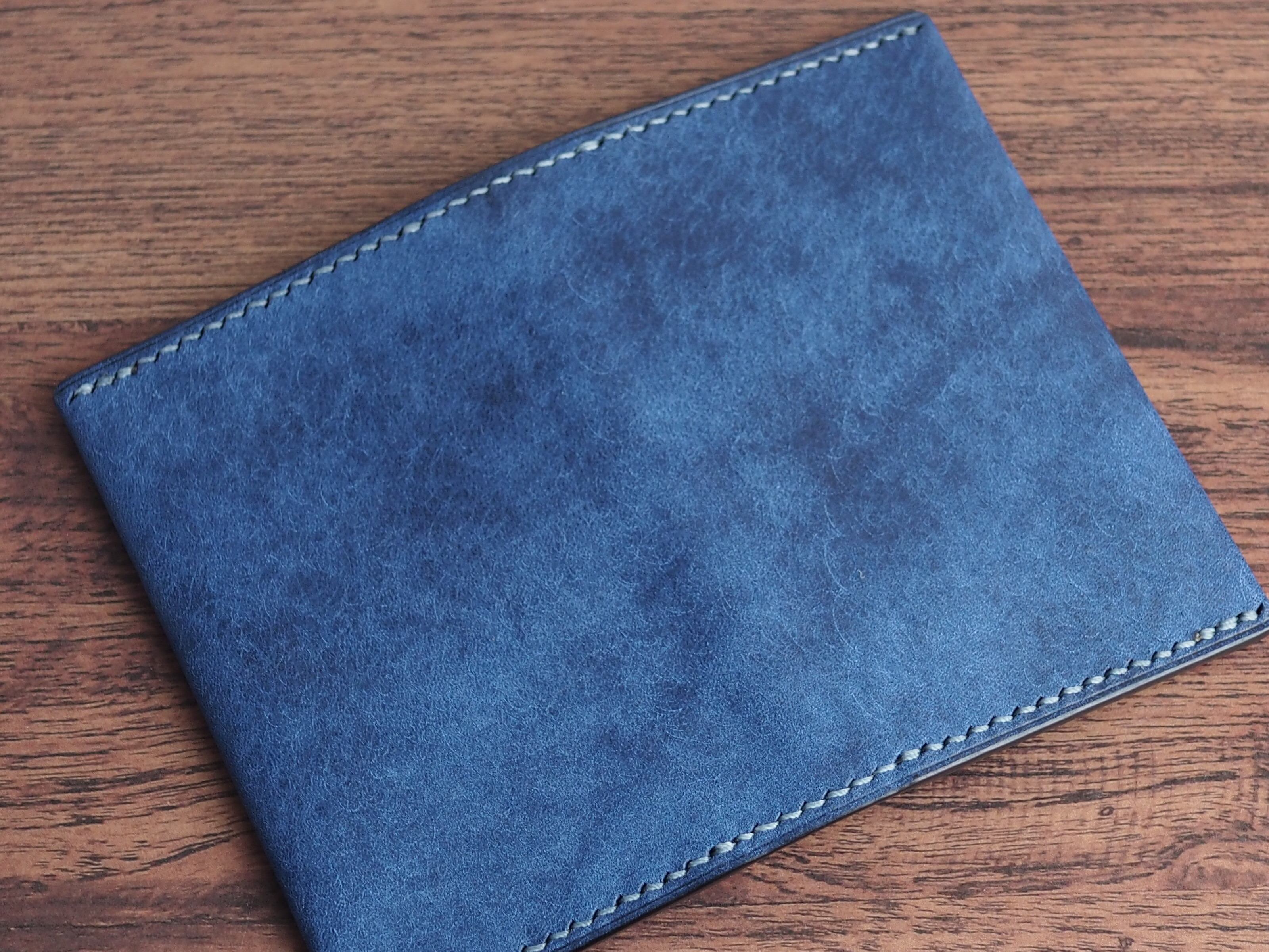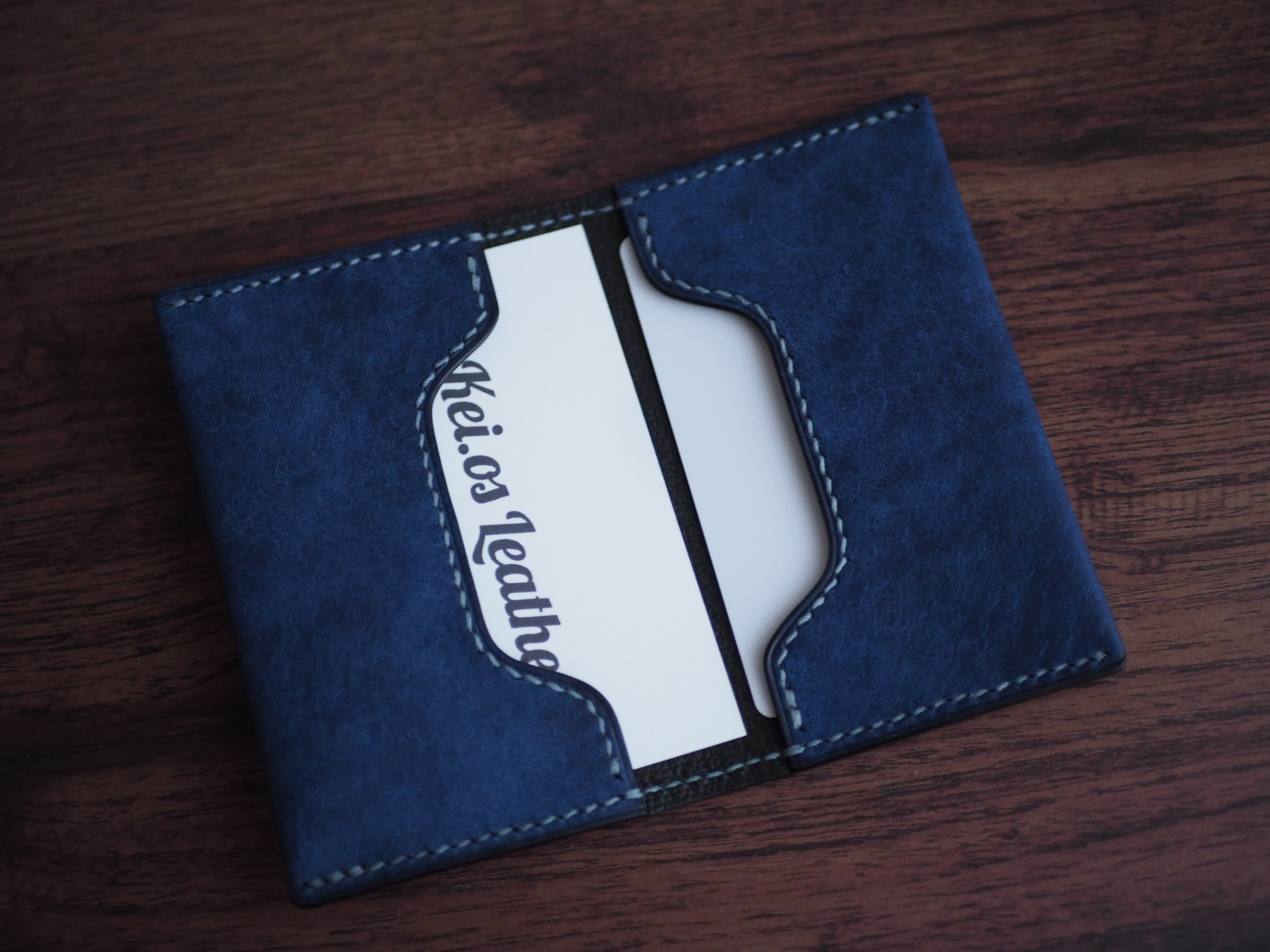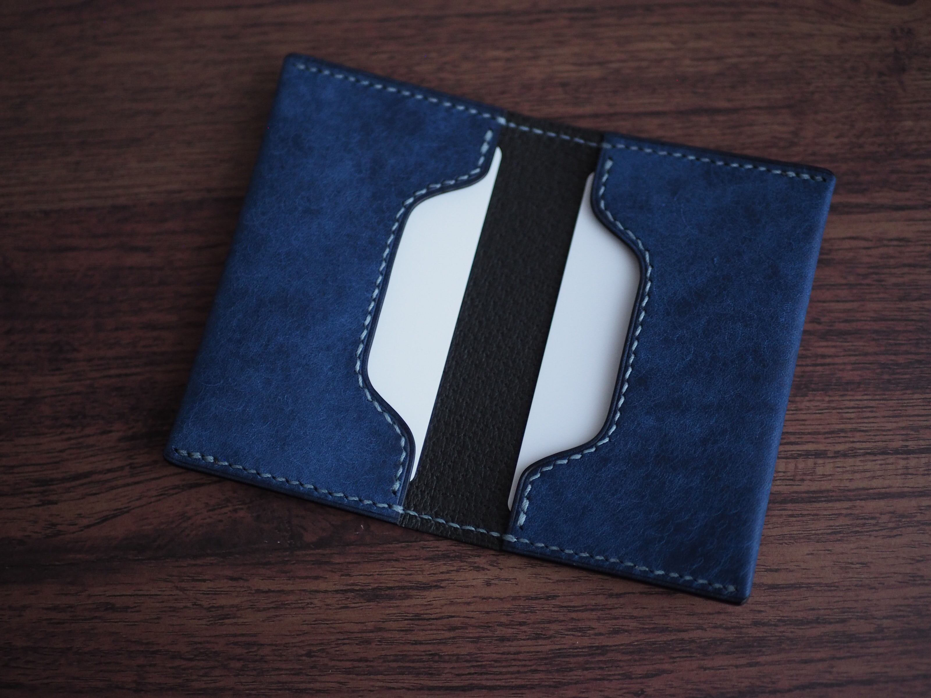 こちらは、外装に稀少なイタリアンレザー「マルゴー」のコバルト、内装に摩擦に強い「アメ豚ソフト」の黒を使用し、全工程を手縫い(六花0.4 ウィンターミスト)で丁寧に製作した二つ折りカードケースです。シンプルを極めたデザインの中に、本革ならではの劇的なエイジングと作り手のこだわりを凝縮しました。