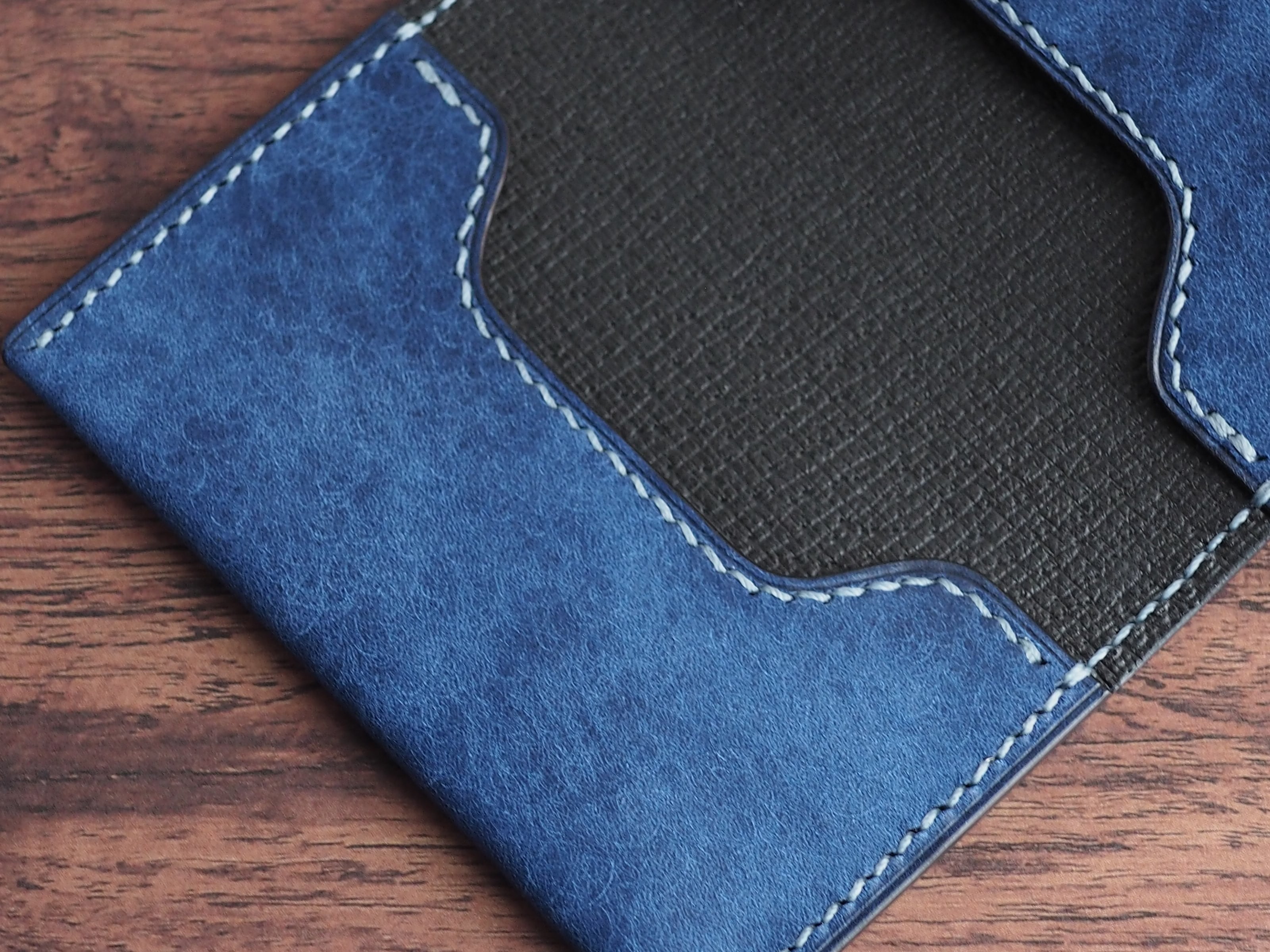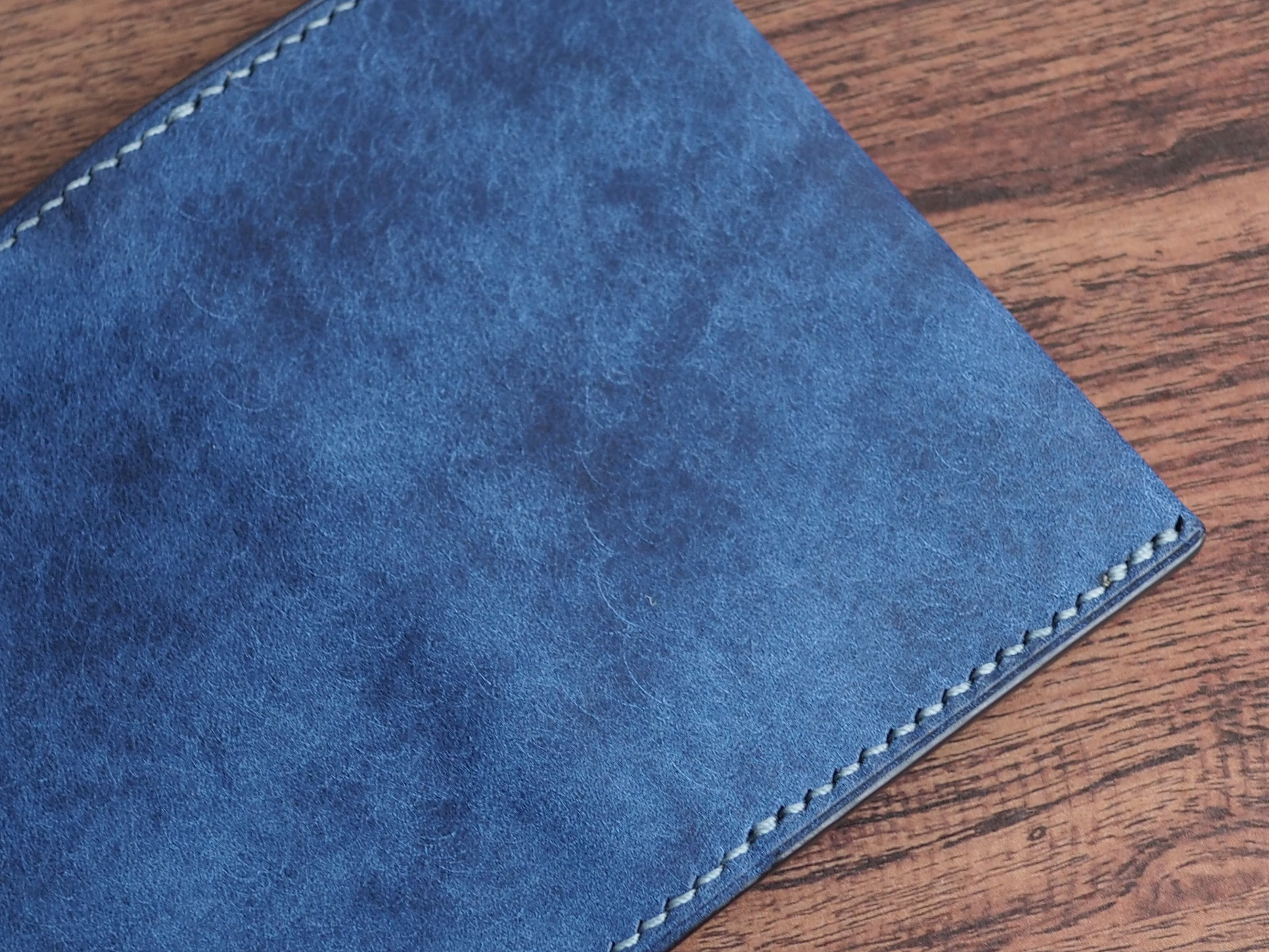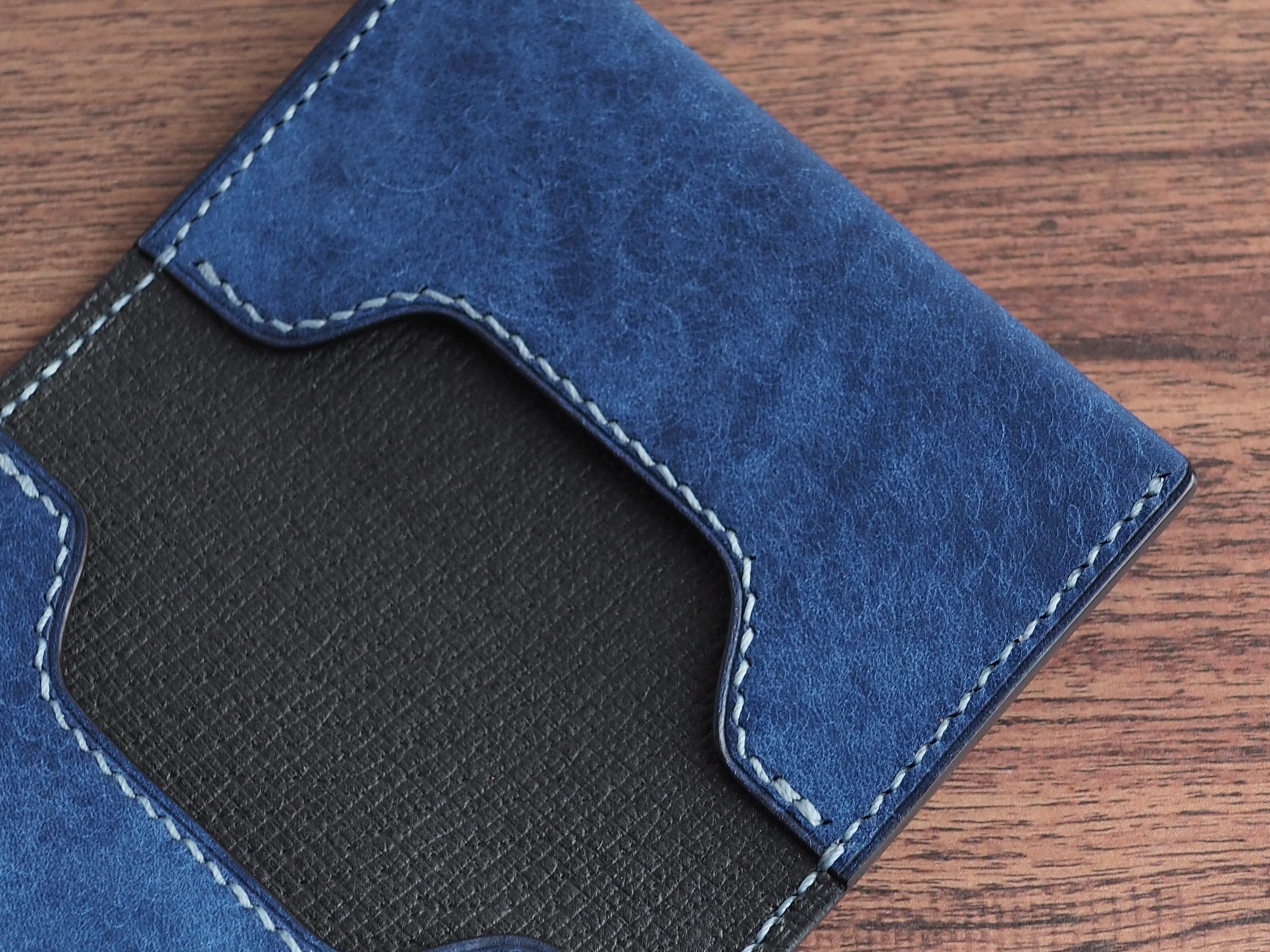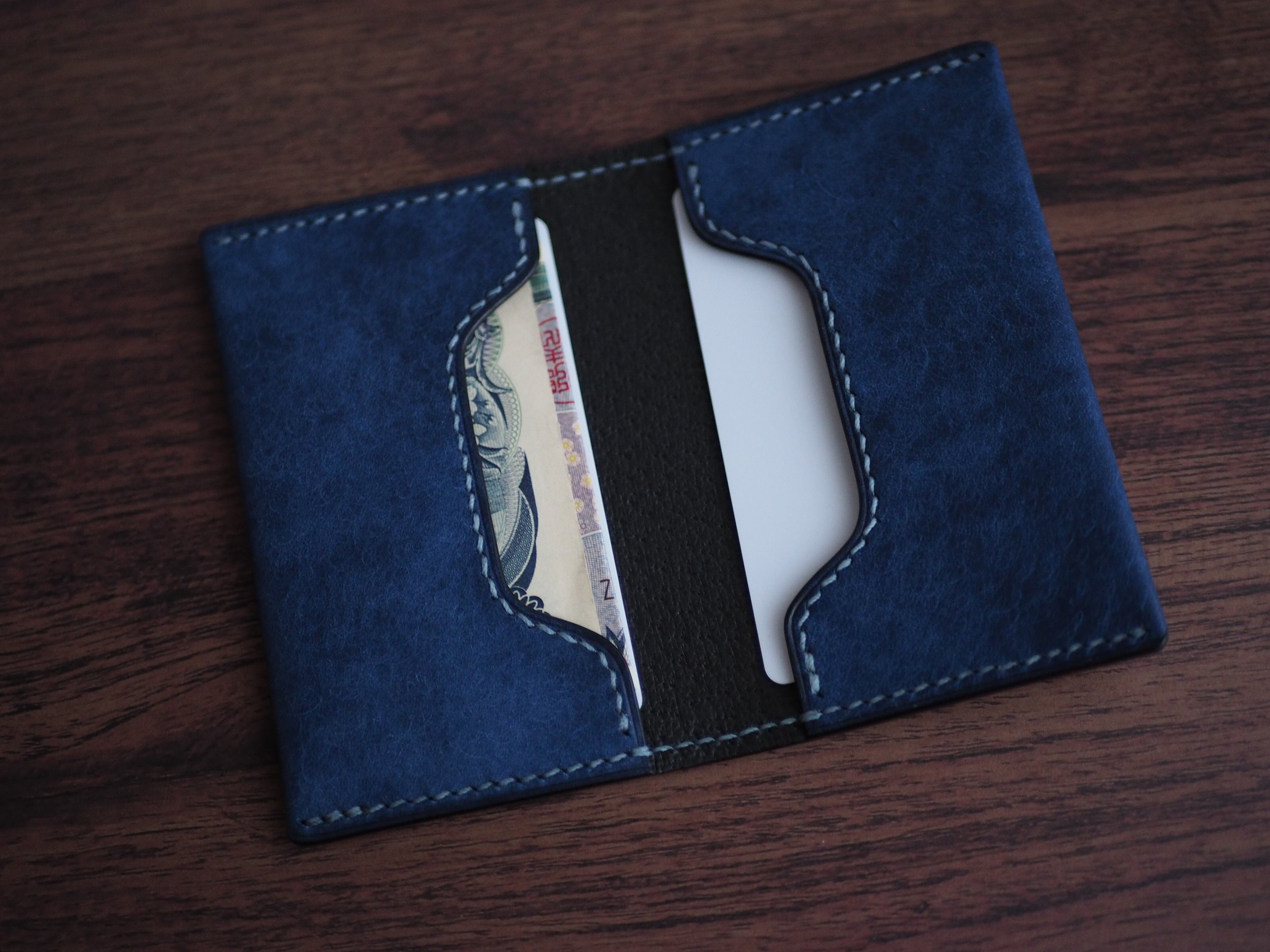 こちらは、外装に稀少なイタリアンレザー「マルゴー」のコバルト、内装に摩擦に強い「アメ豚ソフト」の黒を使用し、全工程を手縫い(六花0.4 ウィンターミスト)で丁寧に製作した二つ折りカードケースです。シンプルを極めたデザインの中に、本革ならではの劇的なエイジングと作り手のこだわりを凝縮しました。