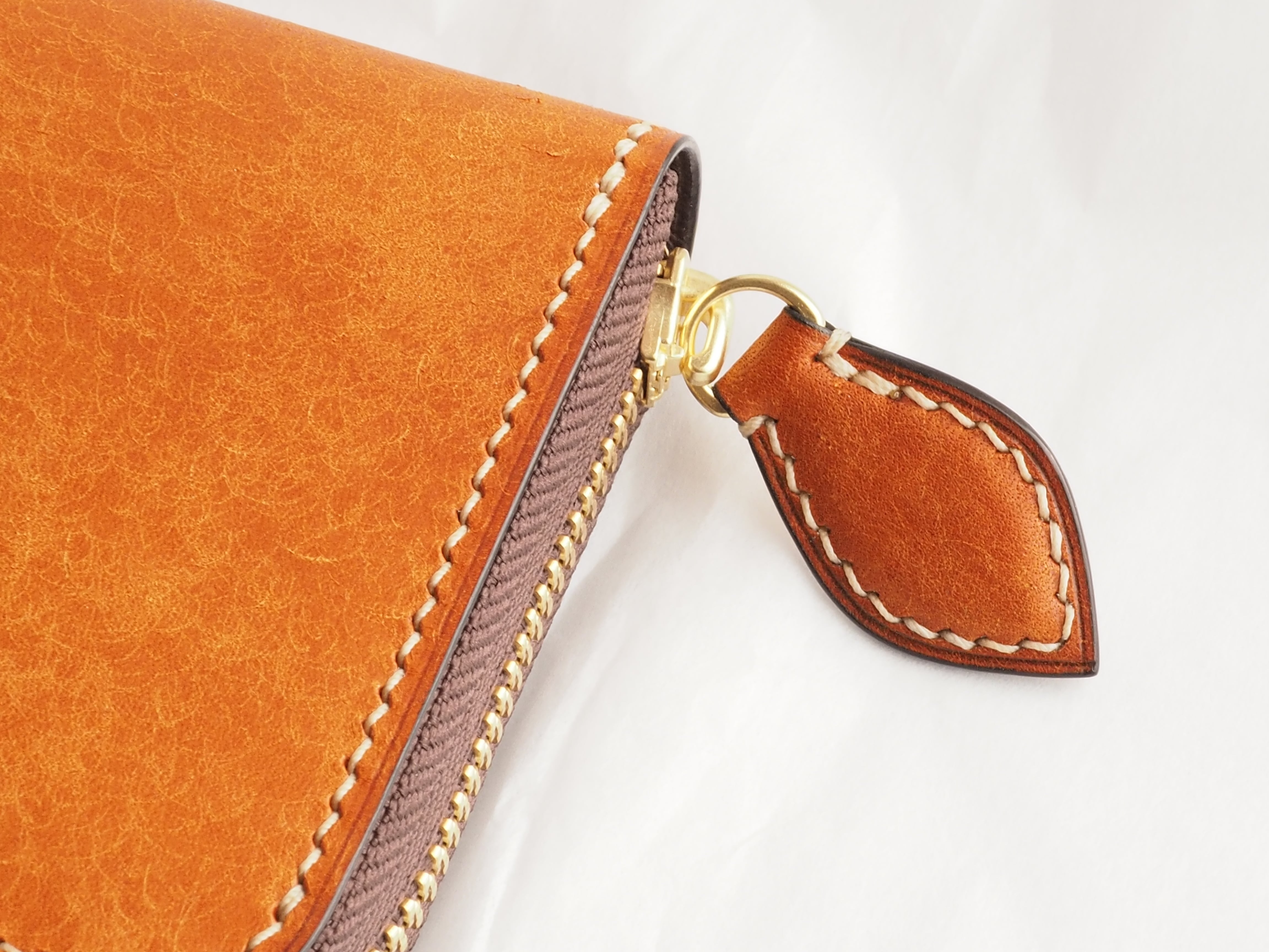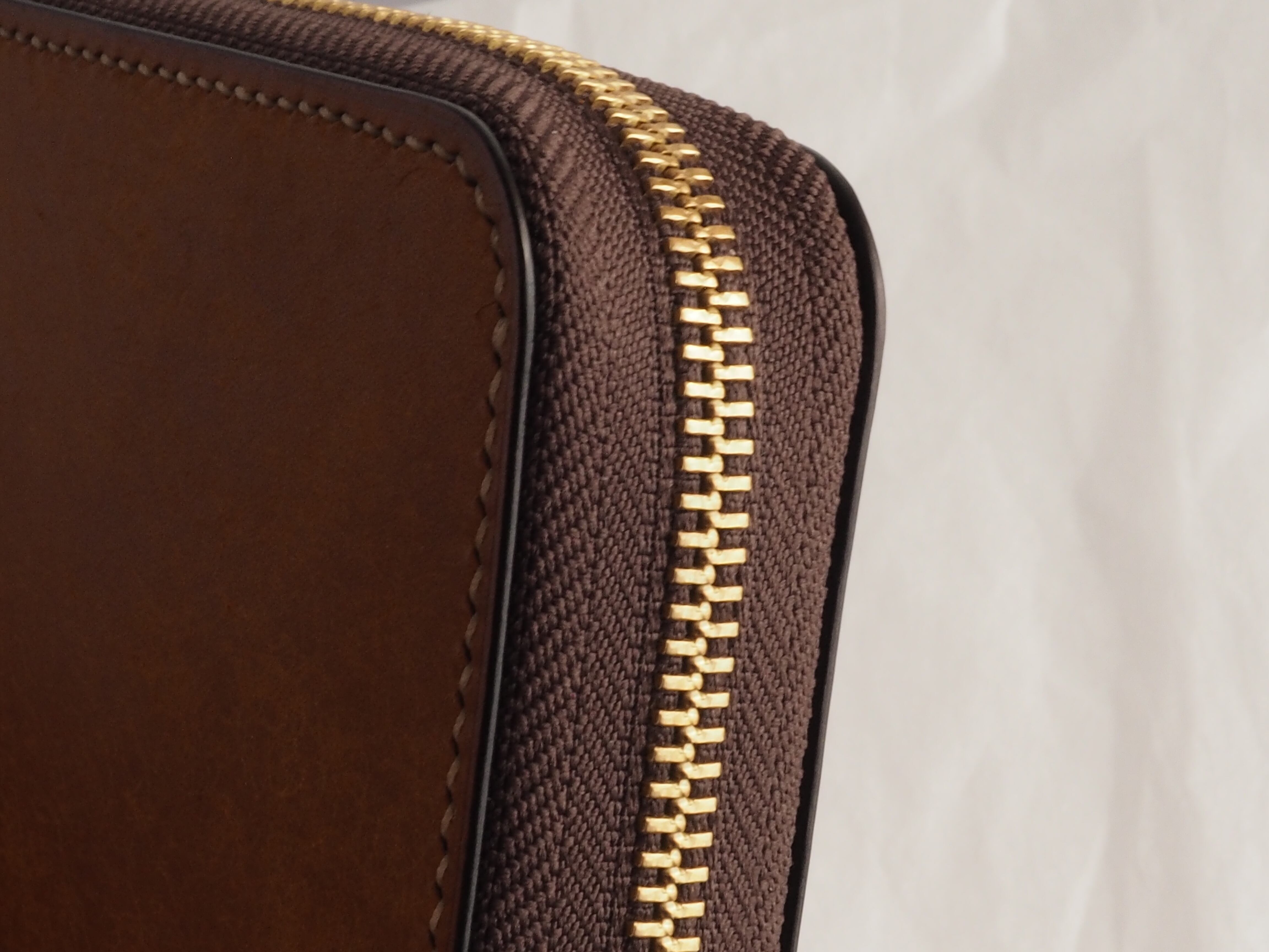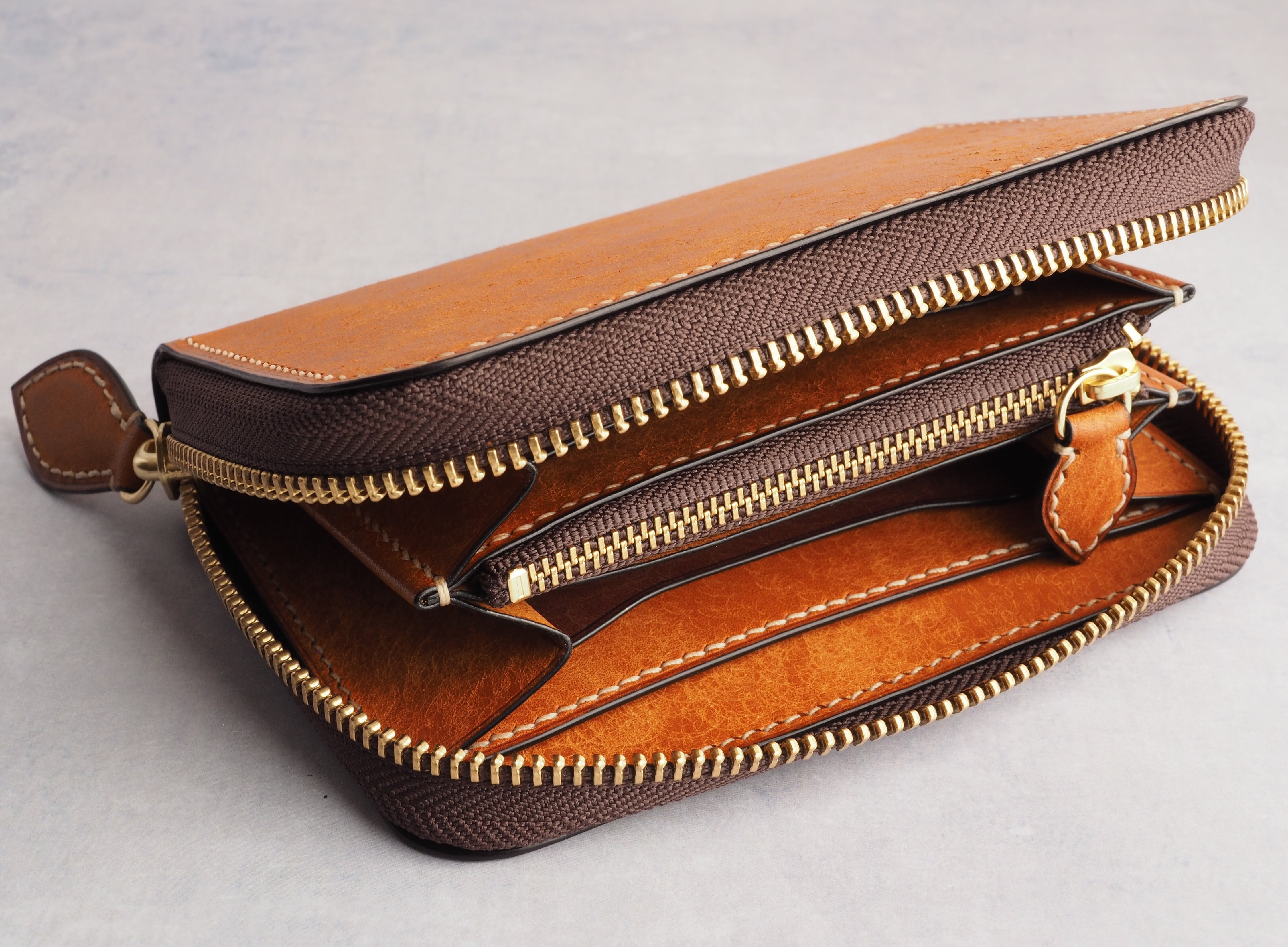こちらは、稀少なイタリアンレザー「マルゴー」を使用し、手縫いで丁寧に製作したラウンドファスナータイプのウォレットです。当店の長財布での約2/3ほどのサイズになり、内装はハーフサイズウォレットのものを採り入れています。コンパクトウォレットとロングウォレットの中間あたりの位置付けの商品になります。