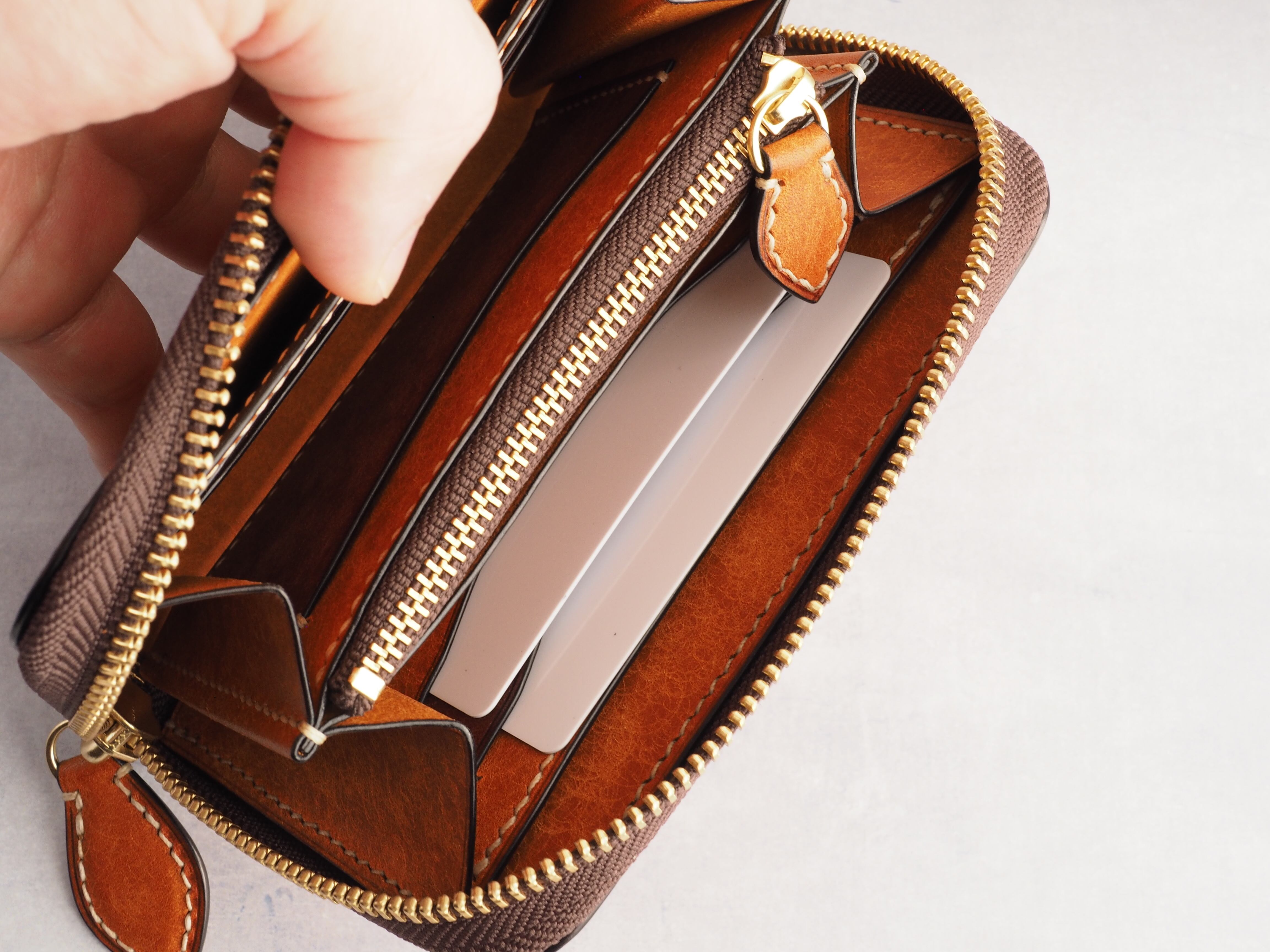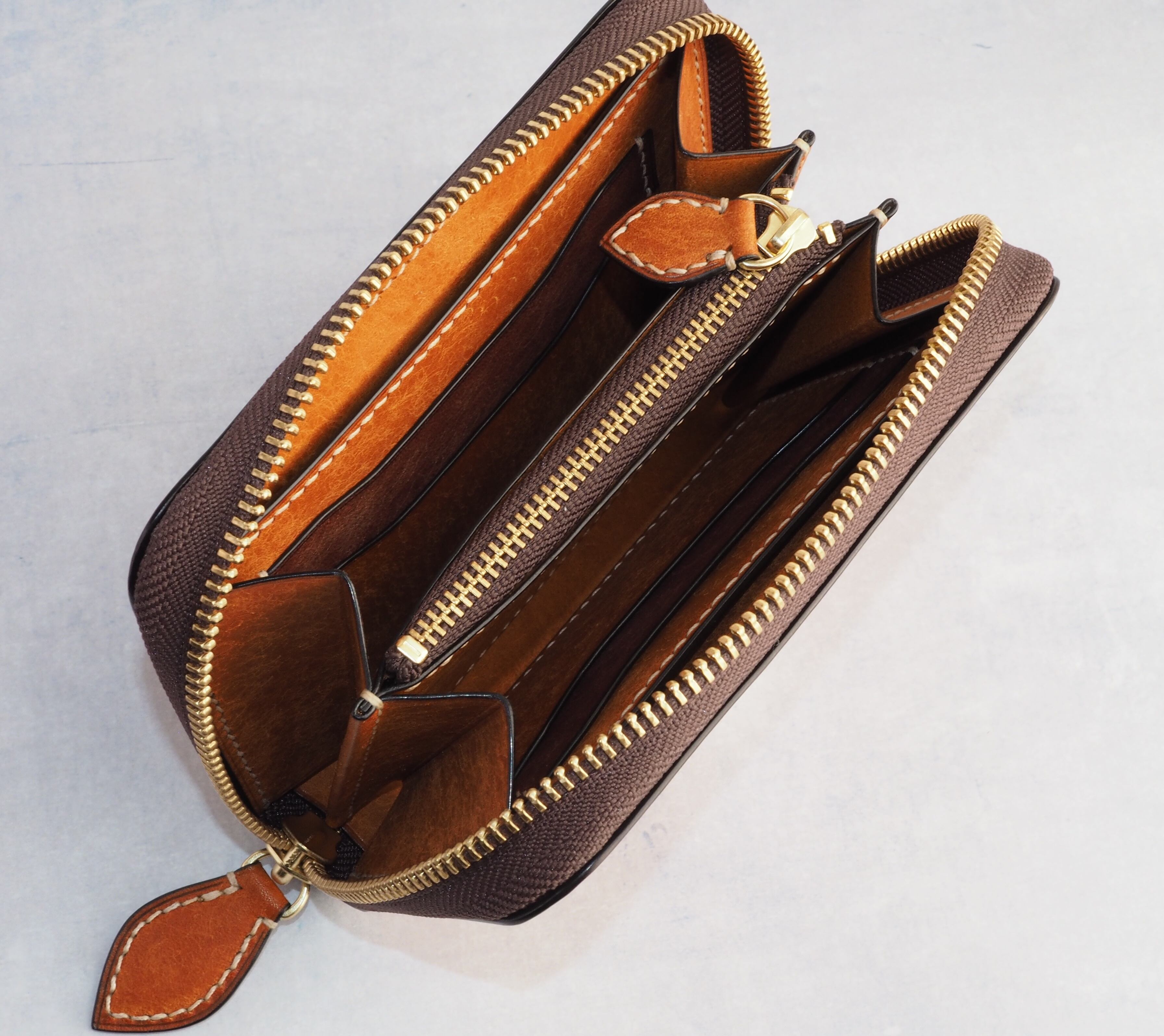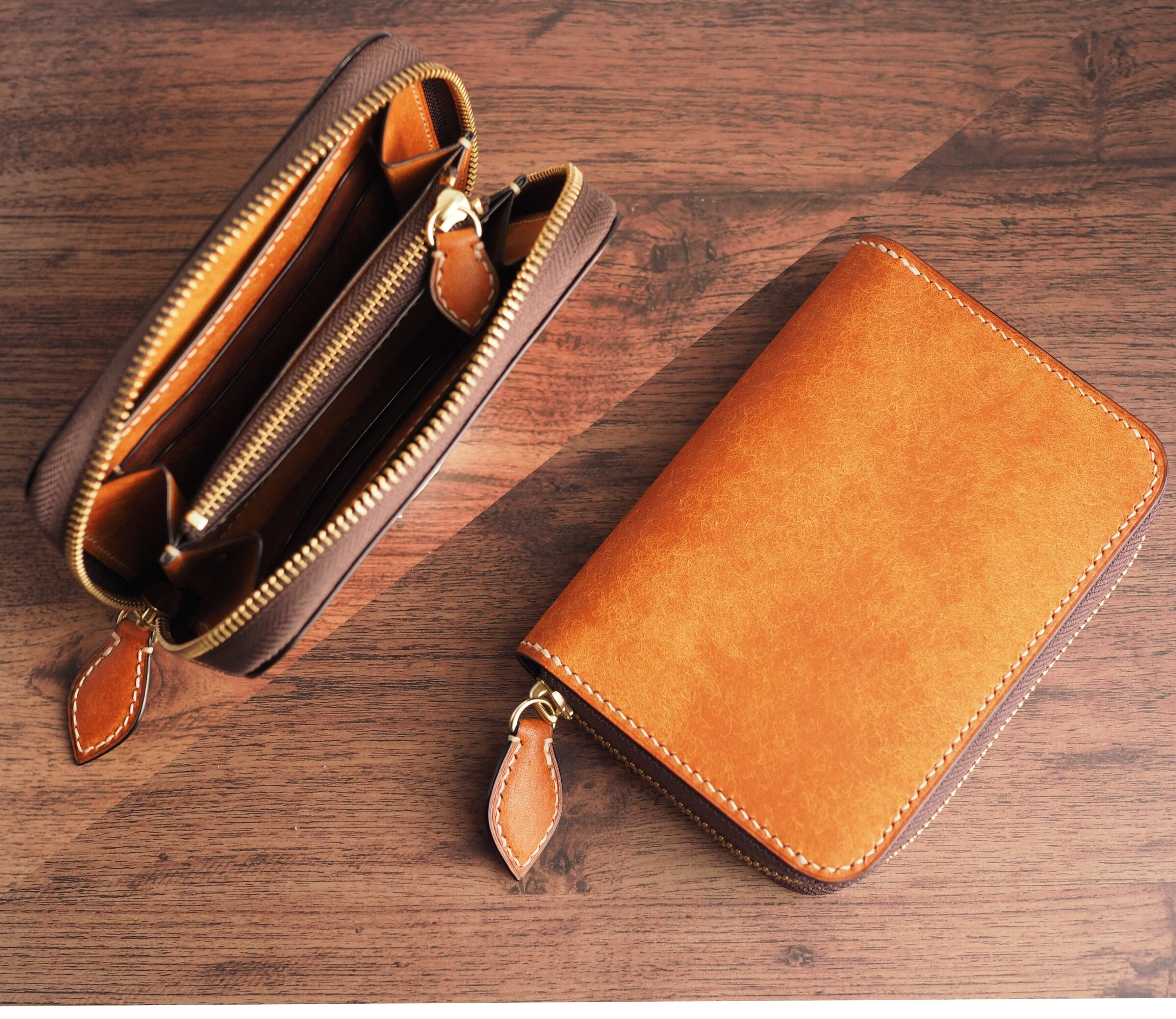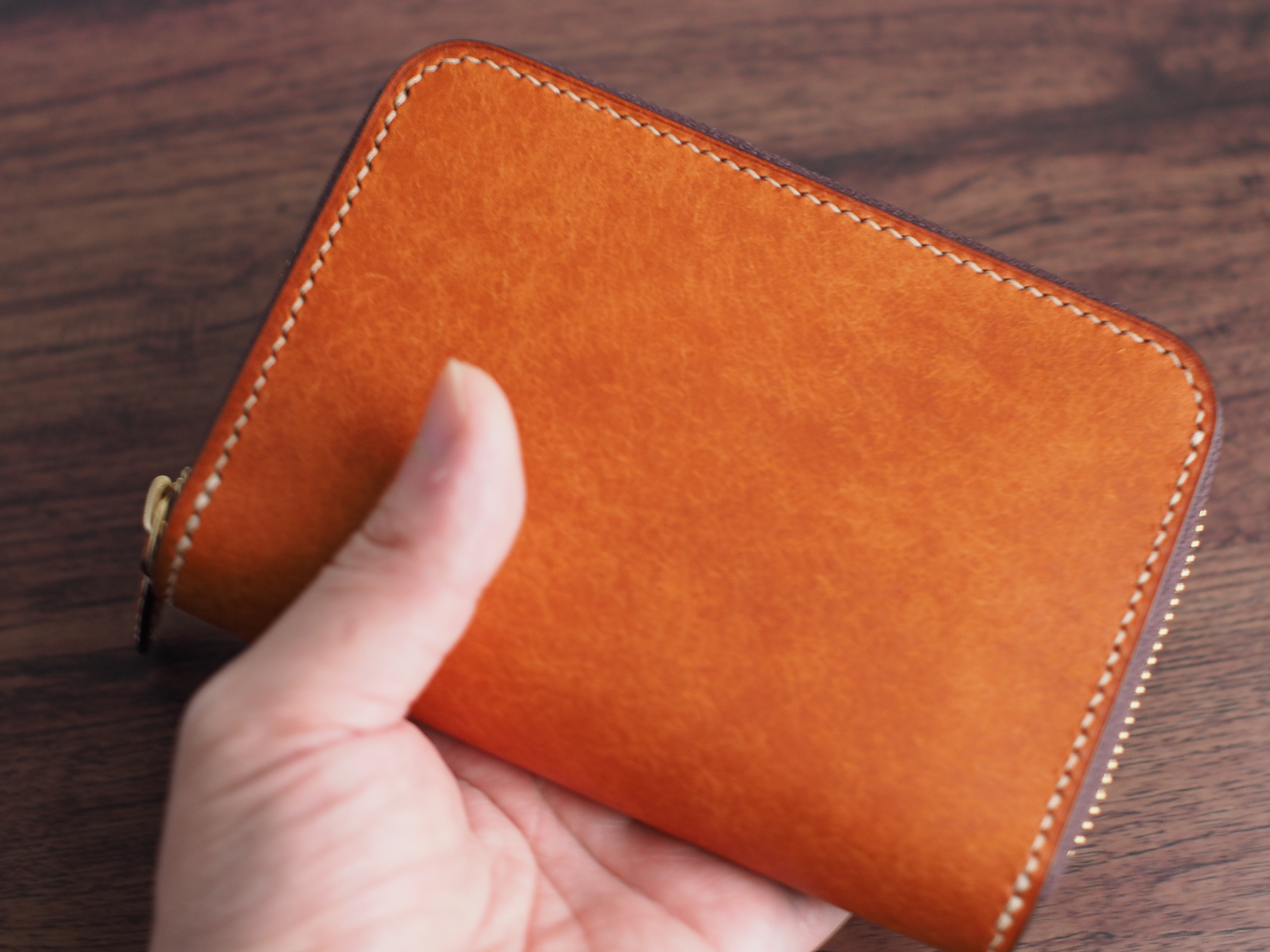 こちらは、稀少なイタリアンレザー「マルゴー」を使用し、手縫いで丁寧に製作したラウンドファスナータイプのウォレットです。当店の長財布での約2/3ほどのサイズになり、内装はハーフサイズウォレットのものを採り入れています。コンパクトウォレットとロングウォレットの中間あたりの位置付けの商品になります。