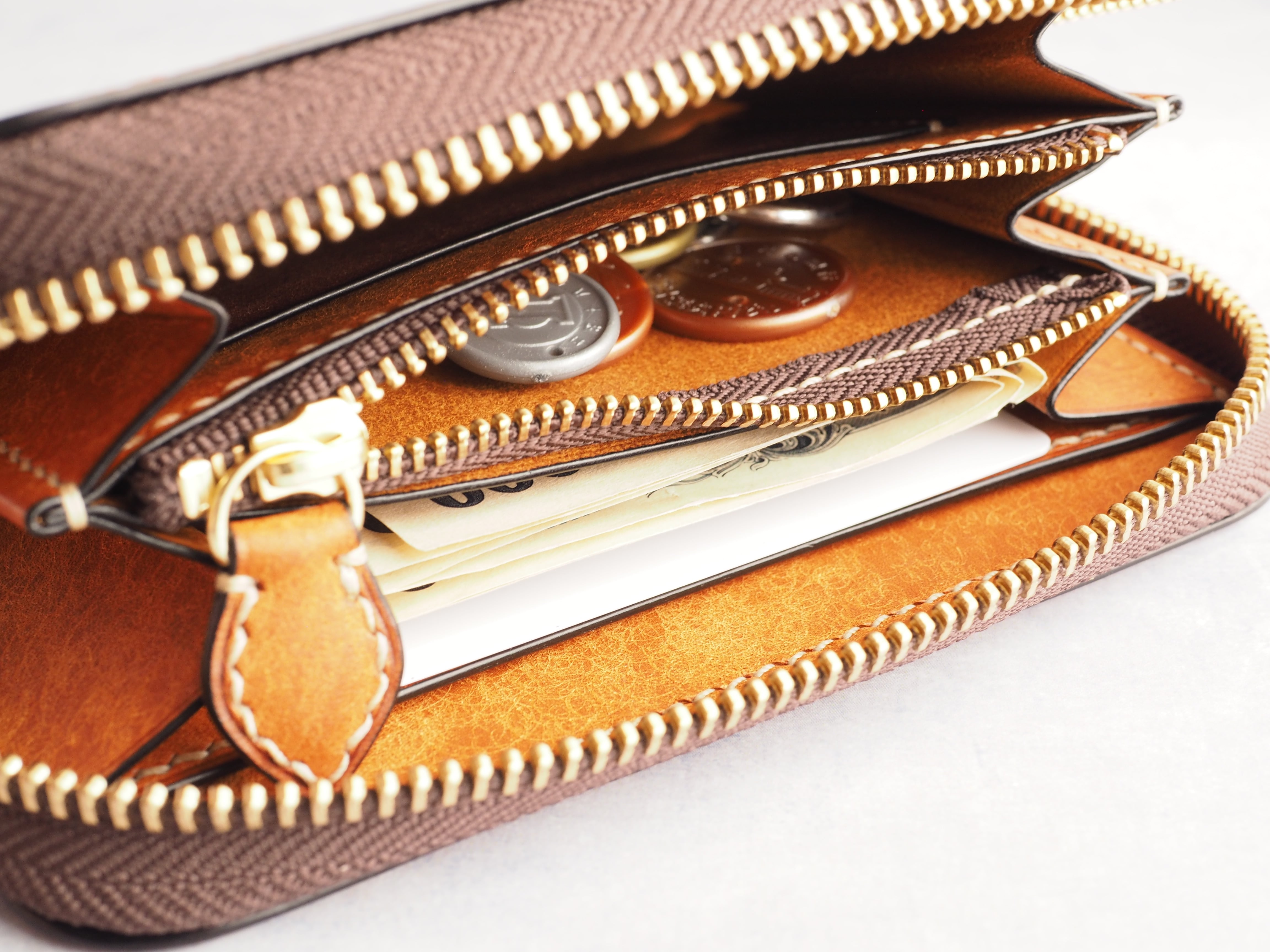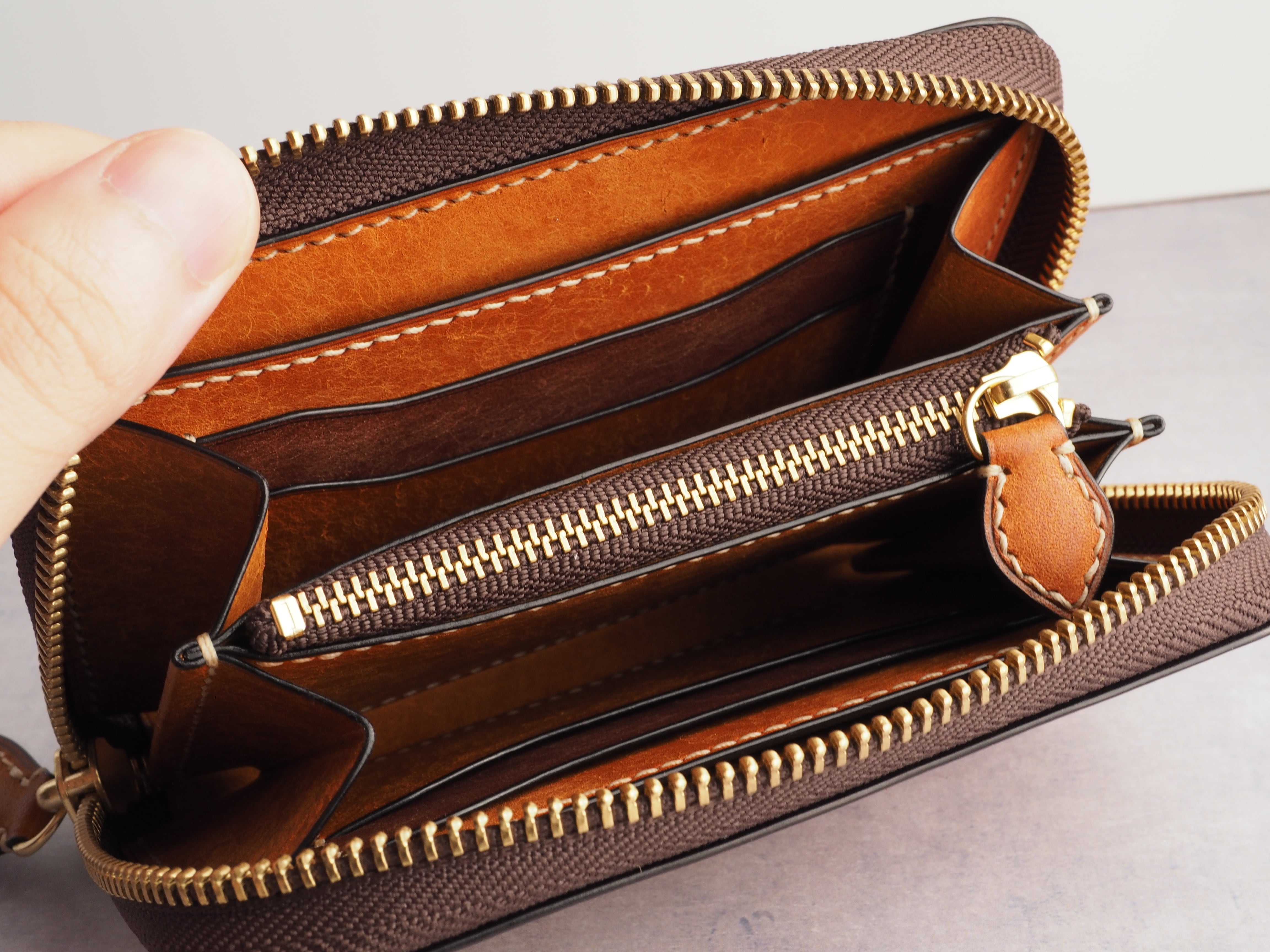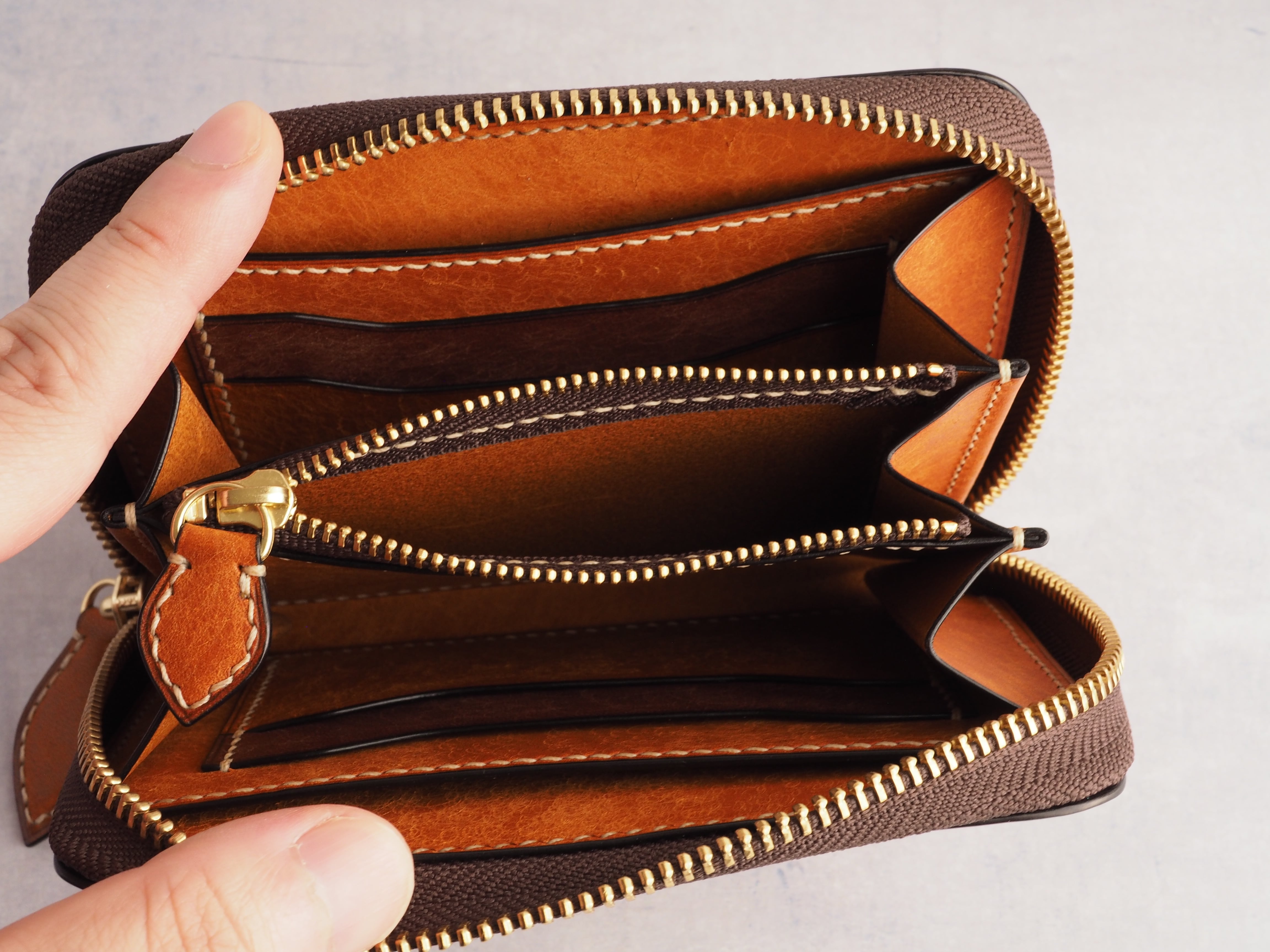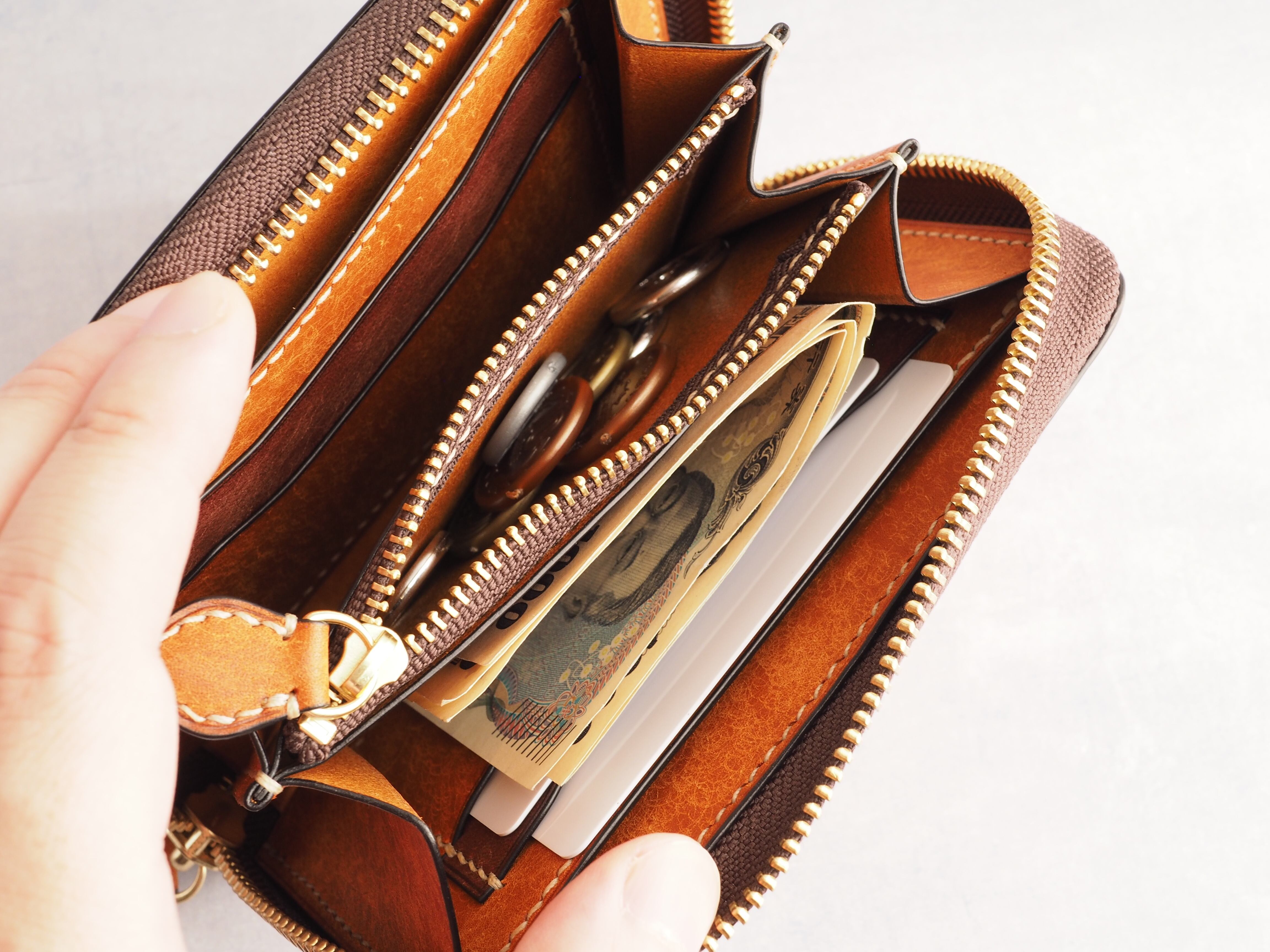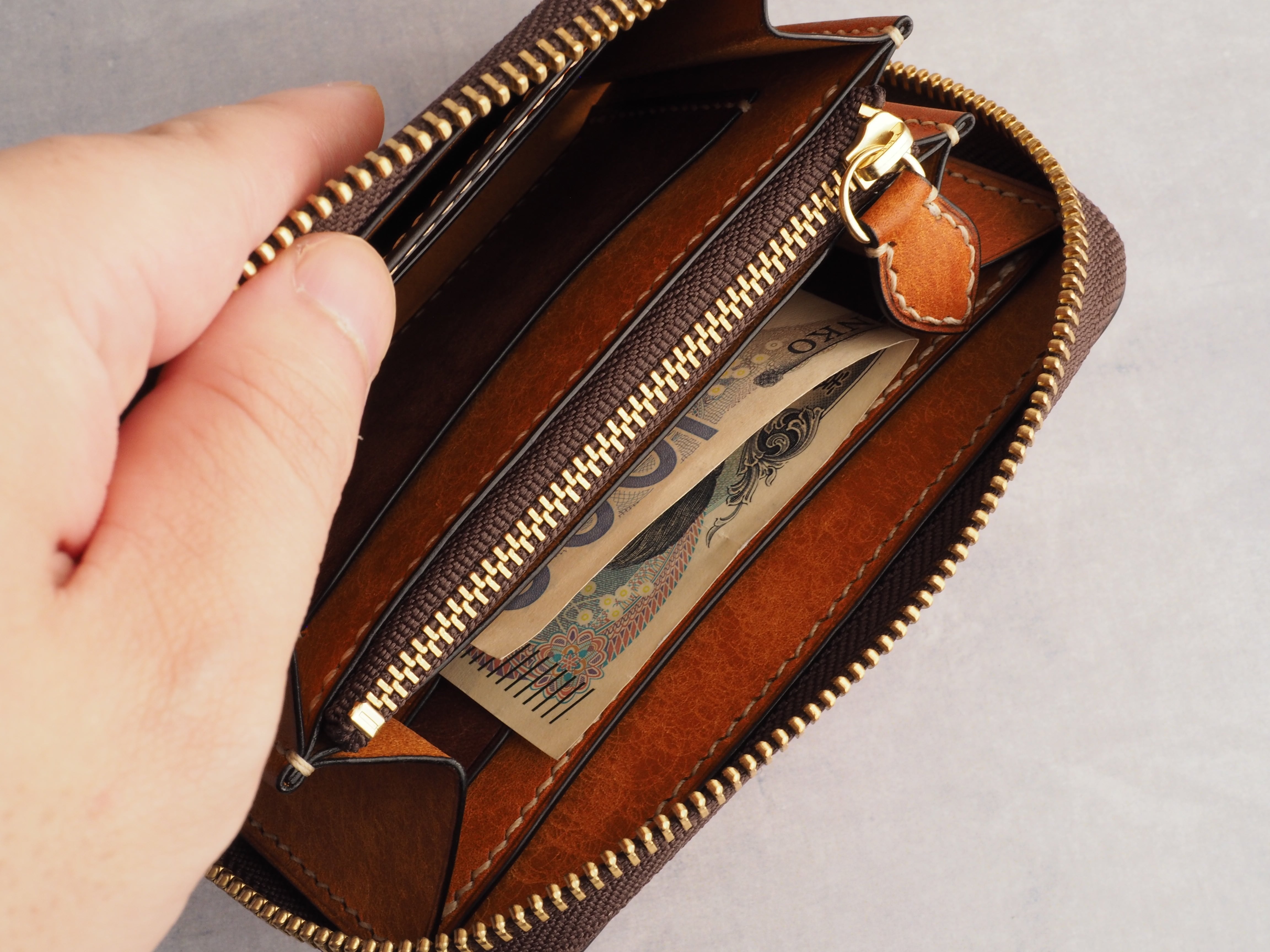 ファスナーを開ければカード、コイン、紙幣が一目で視認出来るよう設計されています。お札は二つ折りでマチに干渉しないように収納でき、スムーズな会計をサポートします。ラウンドファスナーの長財布の使い心地はそのままに面倒な操作なくお金を放り込むような感覚でお使いいただけます。