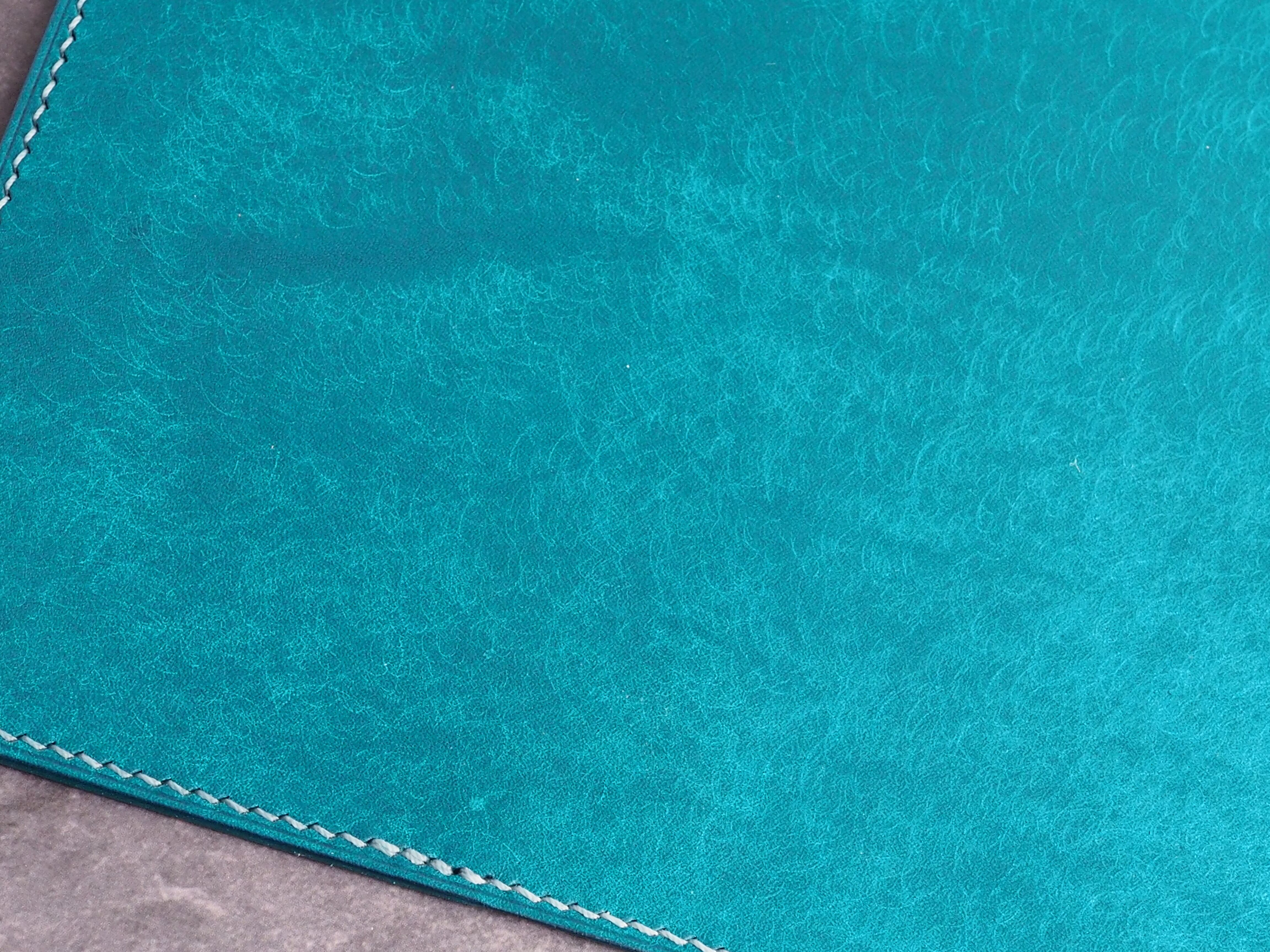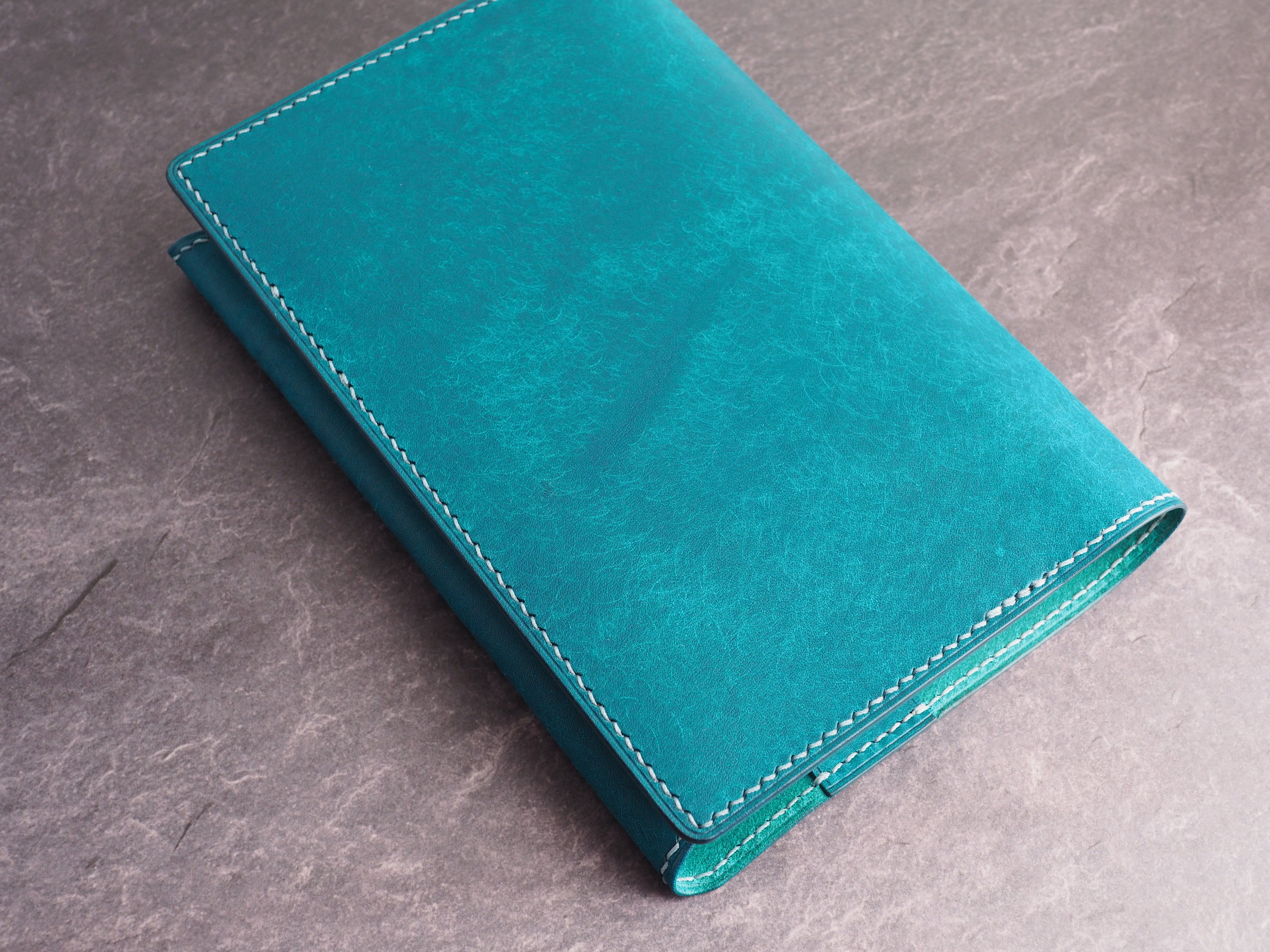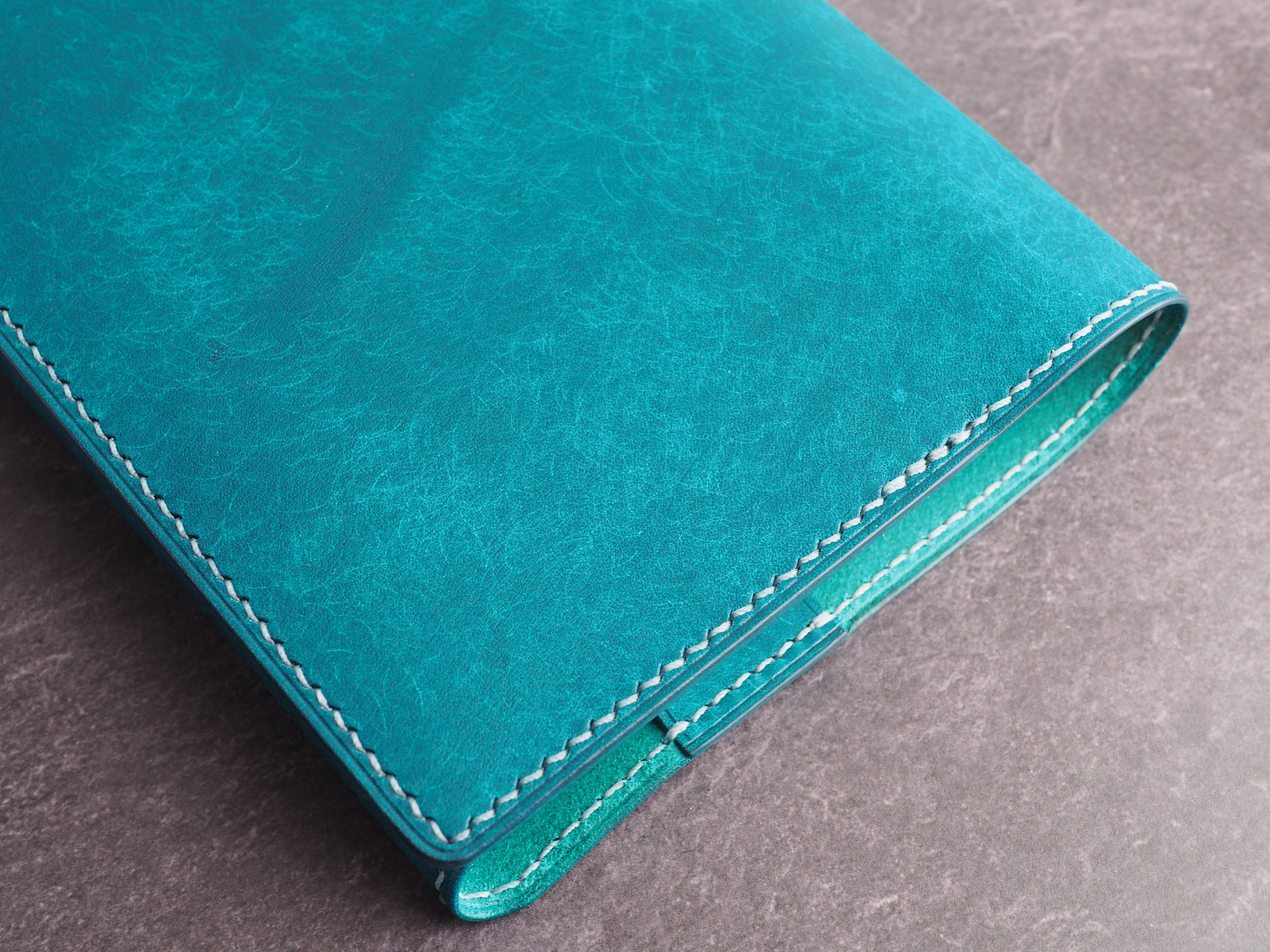 イタリアンレザーマルゴー、トルケーゼ(トルコ石色、ターコイズ)を使用した文庫本用のブックカバーになります。ハヤカワ文庫のトールサイズ(157㎜)に対応できるように通称版より一回り大きめに設計してあります。縫い糸は六花0.4ウィンターミストを使用しています。