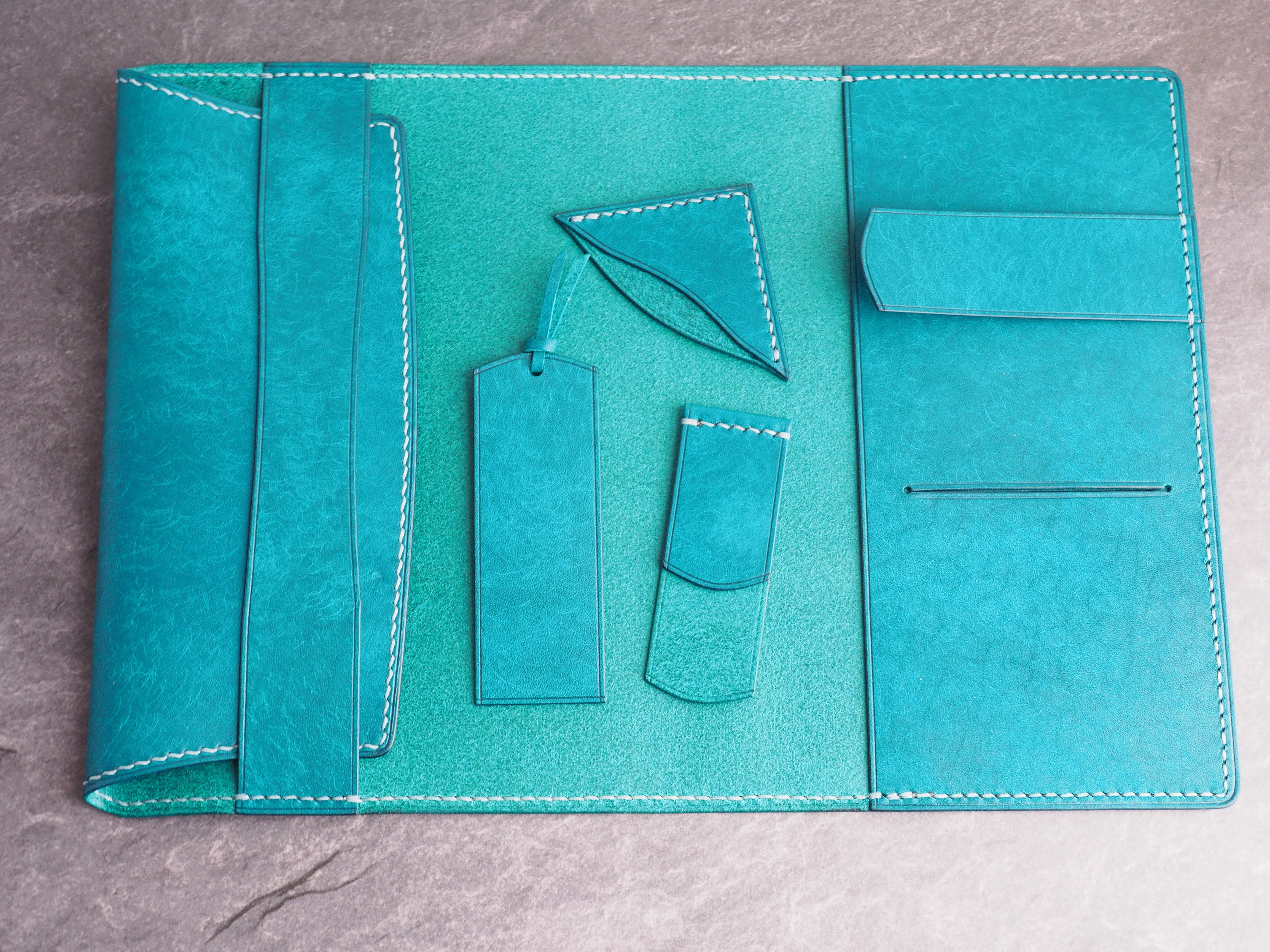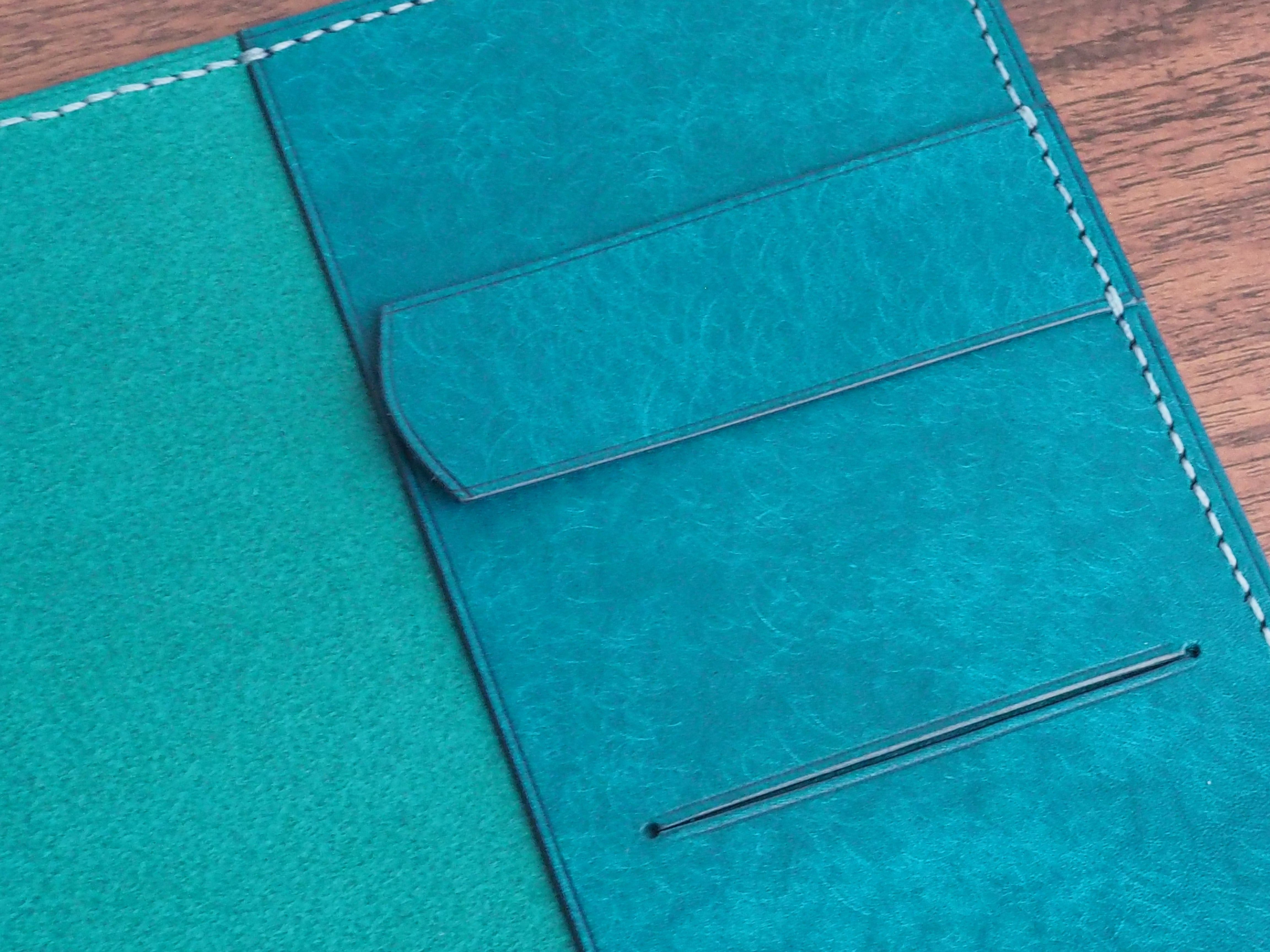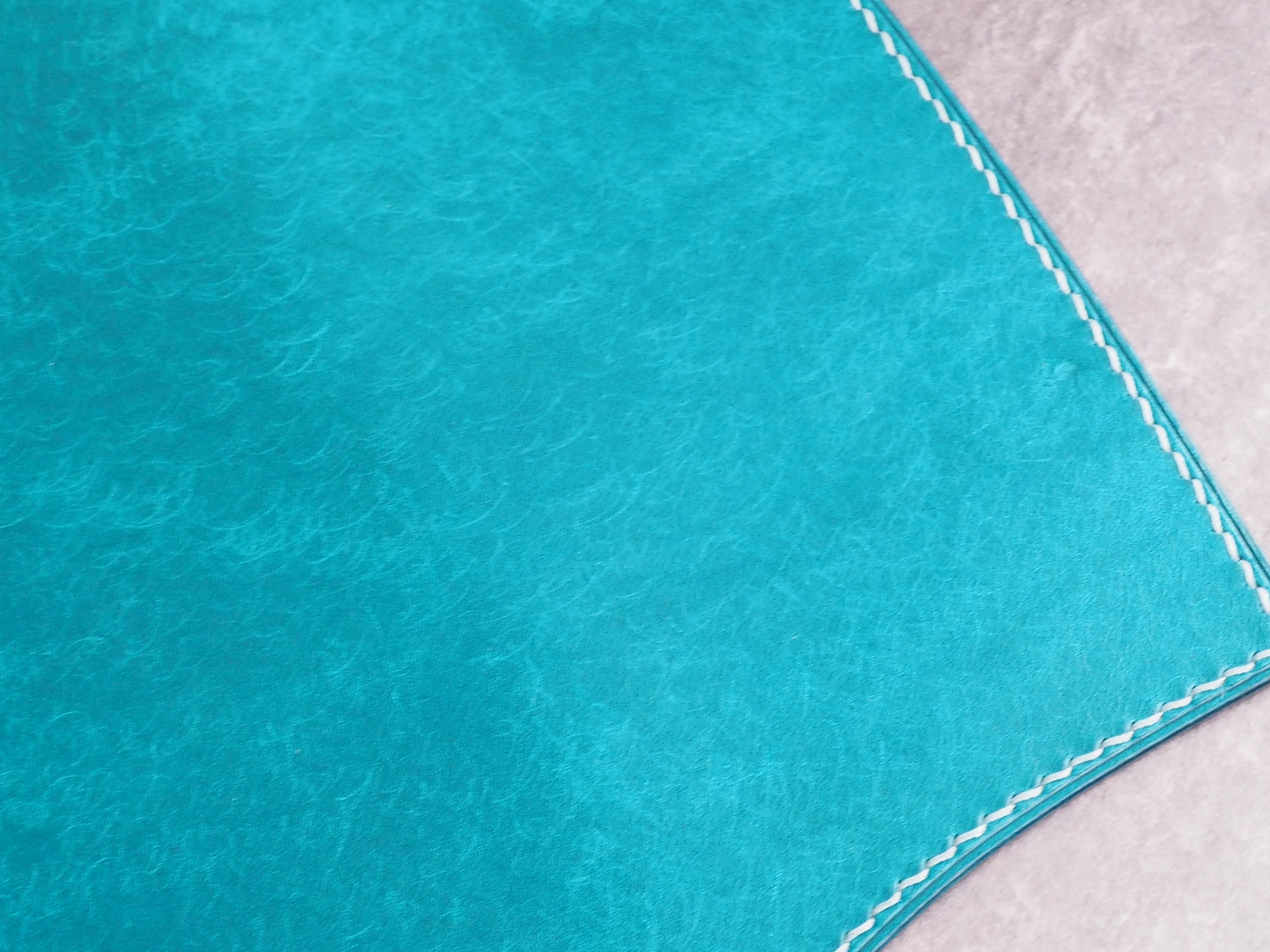 イタリアンレザーマルゴー、トルケーゼ(トルコ石色、ターコイズ)を使用した文庫本用のブックカバーになります。ハヤカワ文庫のトールサイズ(157㎜)に対応できるように通称版より一回り大きめに設計してあります。縫い糸は六花0.4ウィンターミストを使用しています。