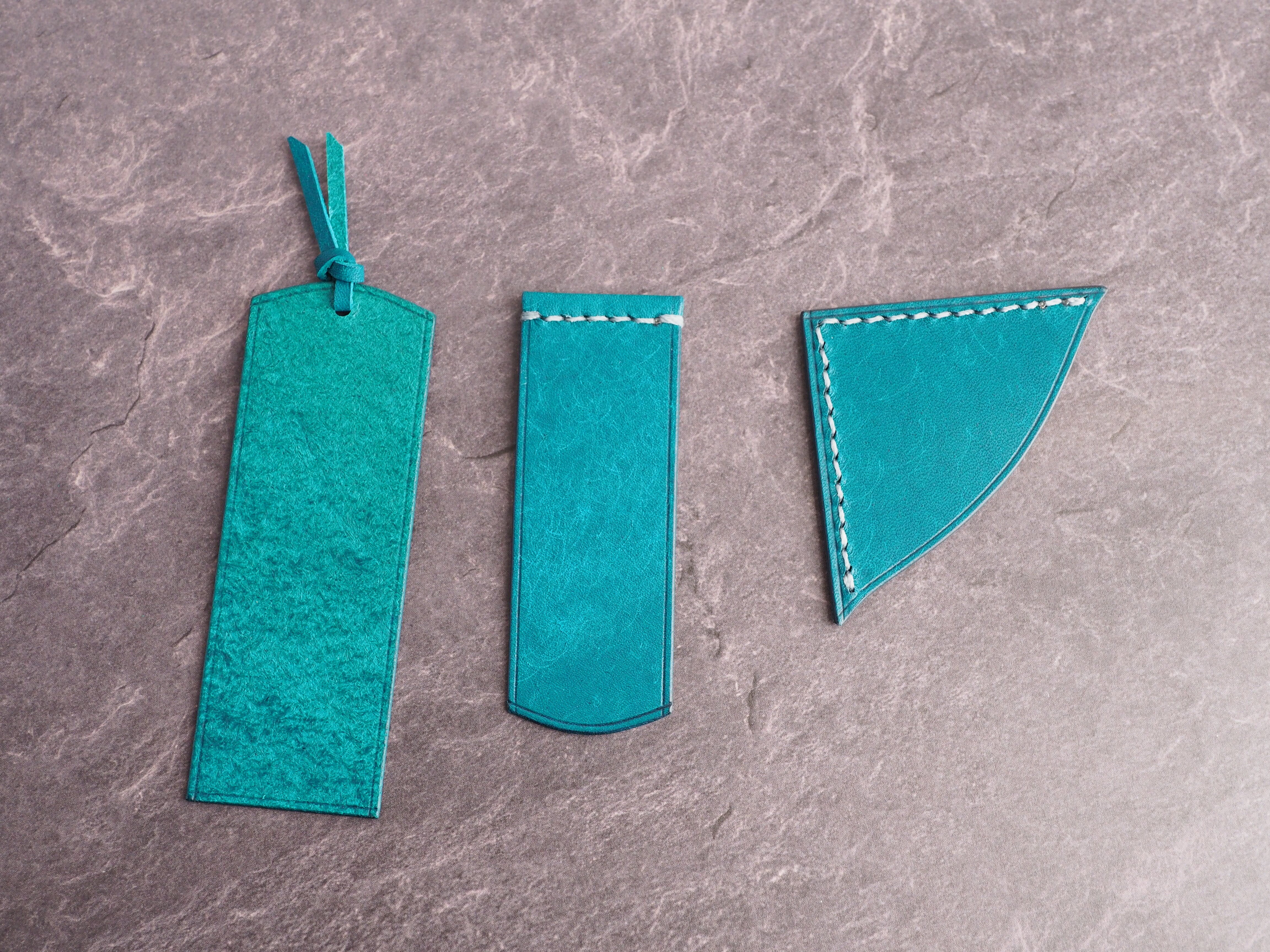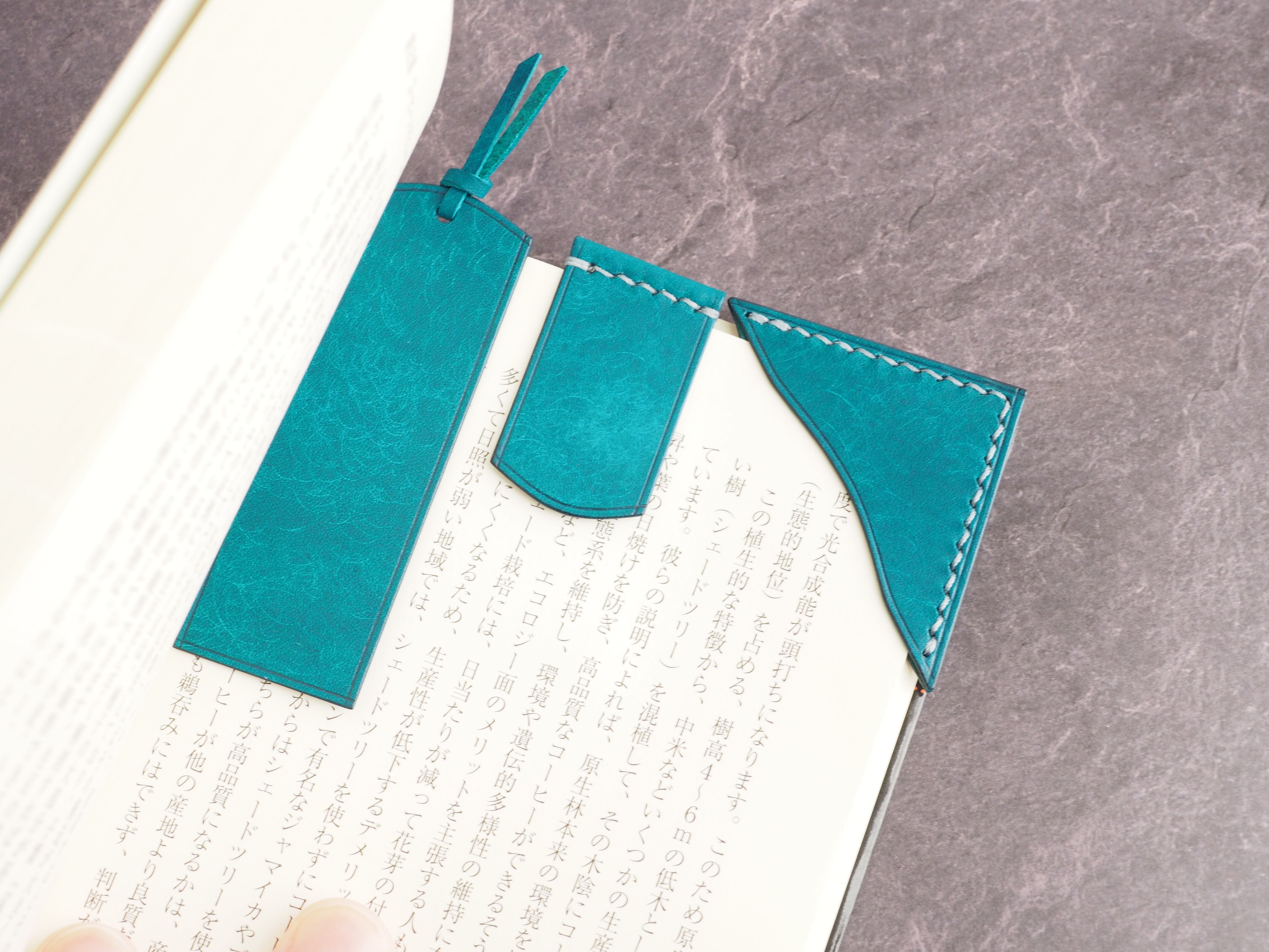 本体備え付けの帯状のブックマークと今回は形、付ける場所の違う3種類のブックマークを付属しています。自分好みの読書スタイルを選んでいただけるようにです。初めての方にも革に触れる機会を増やそうと思い扱いやすいように設計しました。革は1ミリ前後の厚さのものを使用おり、首や肩周り、背中から切り出しています。よく動かす部位であるため革の表面にトラ(皺が虎の模様に見えるため)が入りやすい部分です。しなやかで丈夫なためお腹側に比べて強度があります。今回は革の素材感を生かすためにあえてシワ等を避けずに使用しています。こういったトラや血筋は革の魅力の一つであり、一部の方々に大変人気があります。自分好みのトラ模様を探す人、血筋の個体差を楽しむ革好きの方が増えているようです。