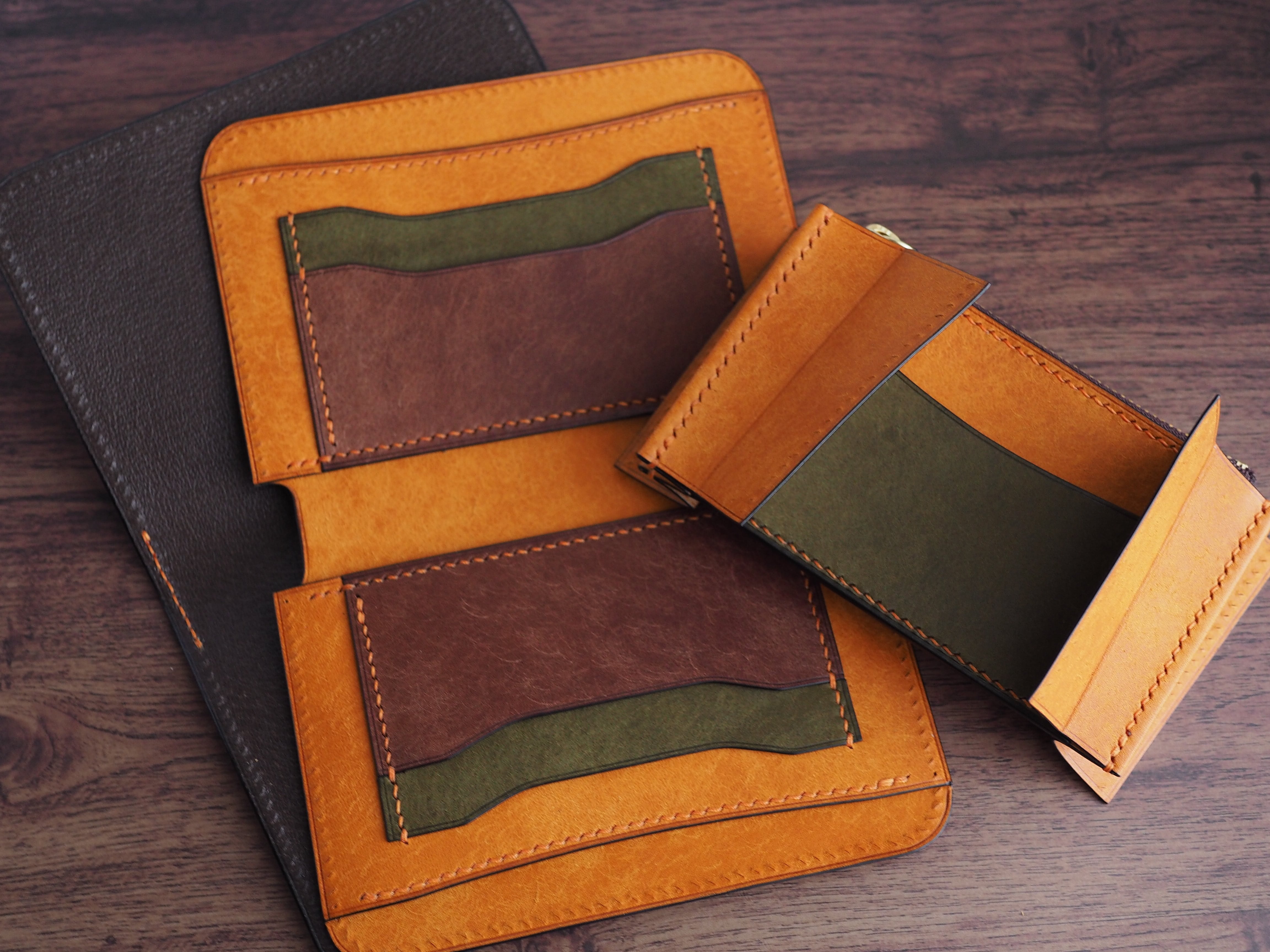 メインにボスコ(オリーブ色)とオルモ(イエローキャメル)の組み合わせで仕上げており(カードポケット一部にダークブラウン使用)、エイジングを早く楽しめる、本革を「育てる」喜びを知るためのアイテムです。