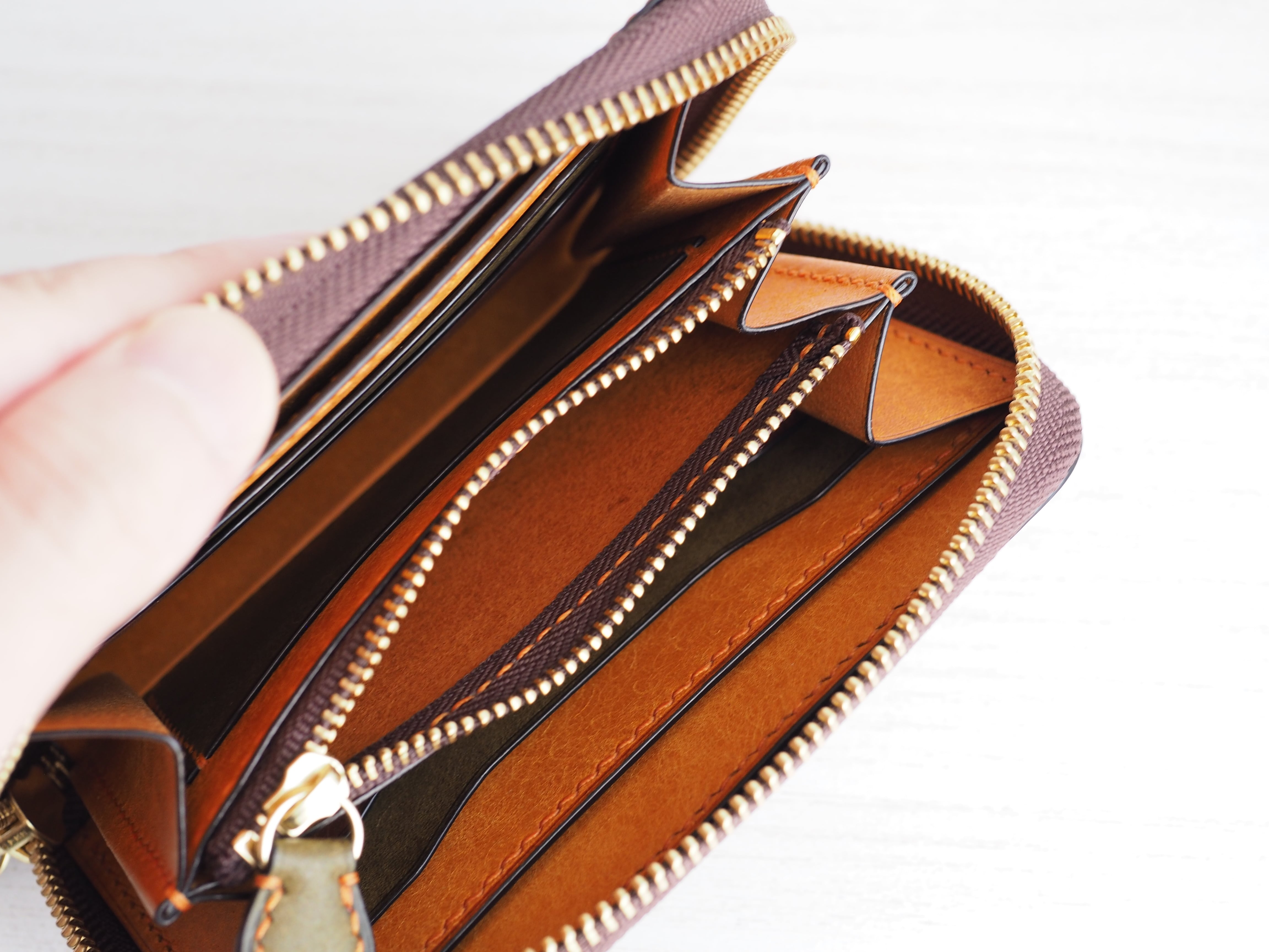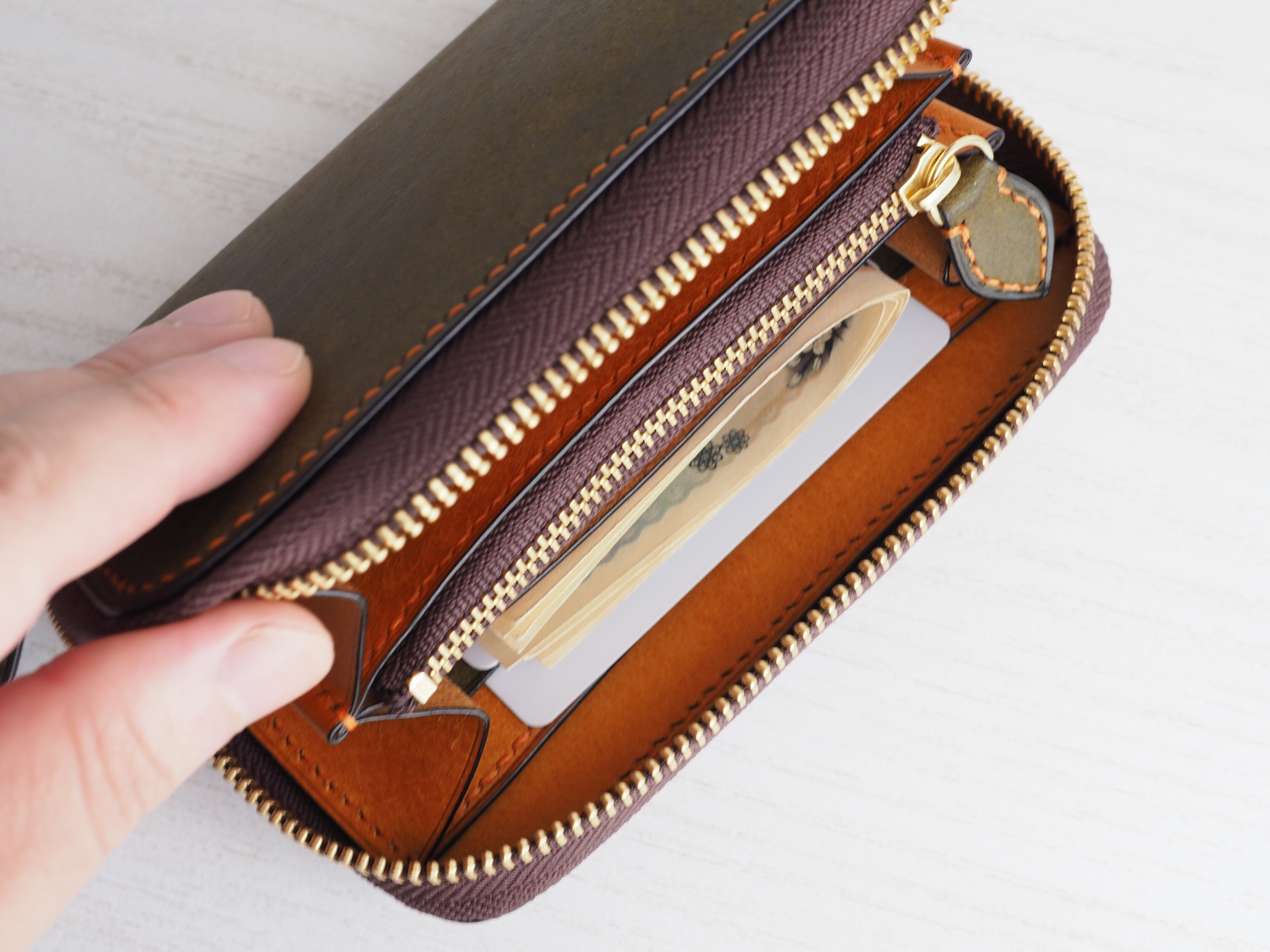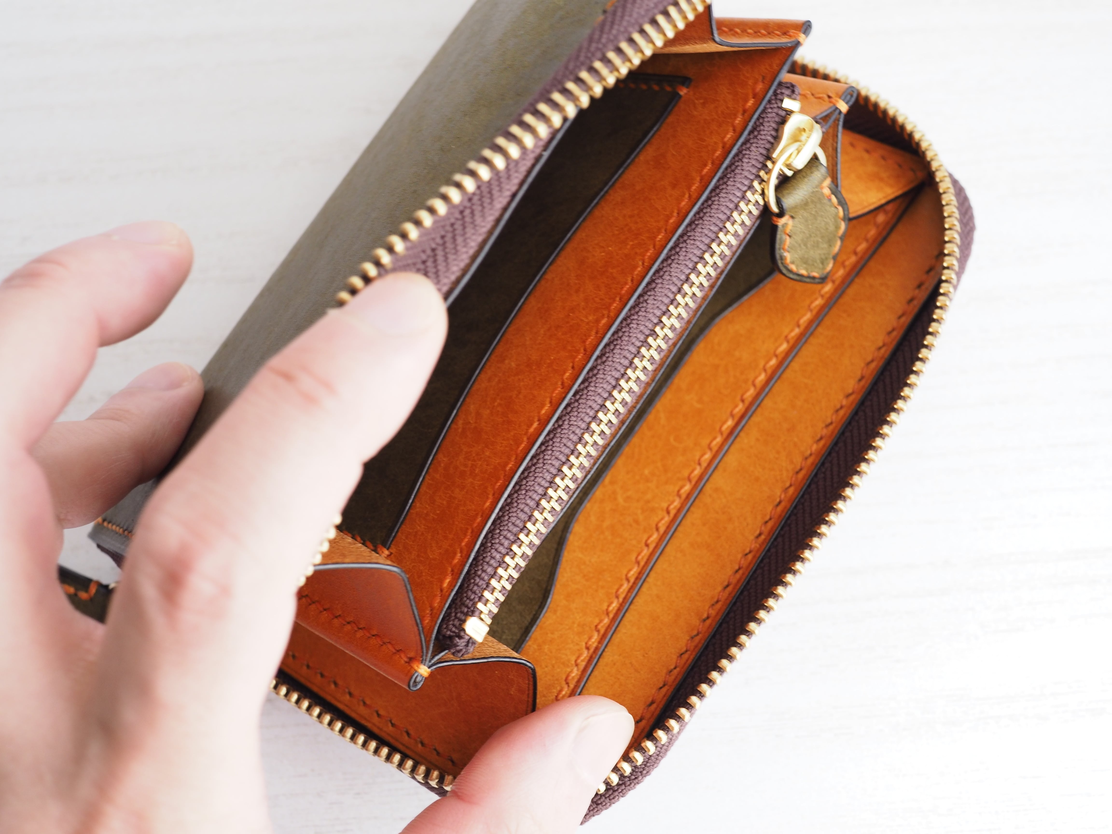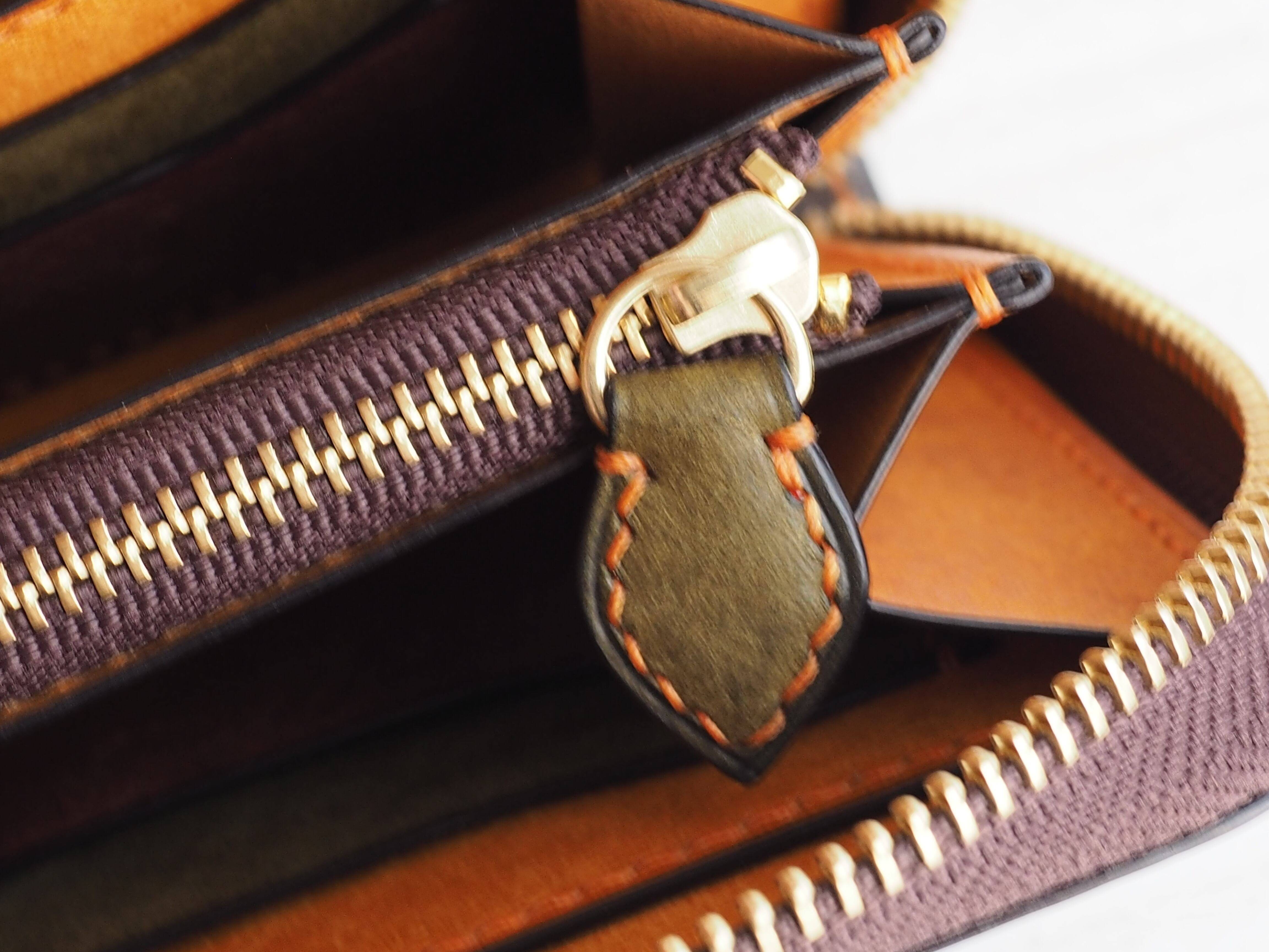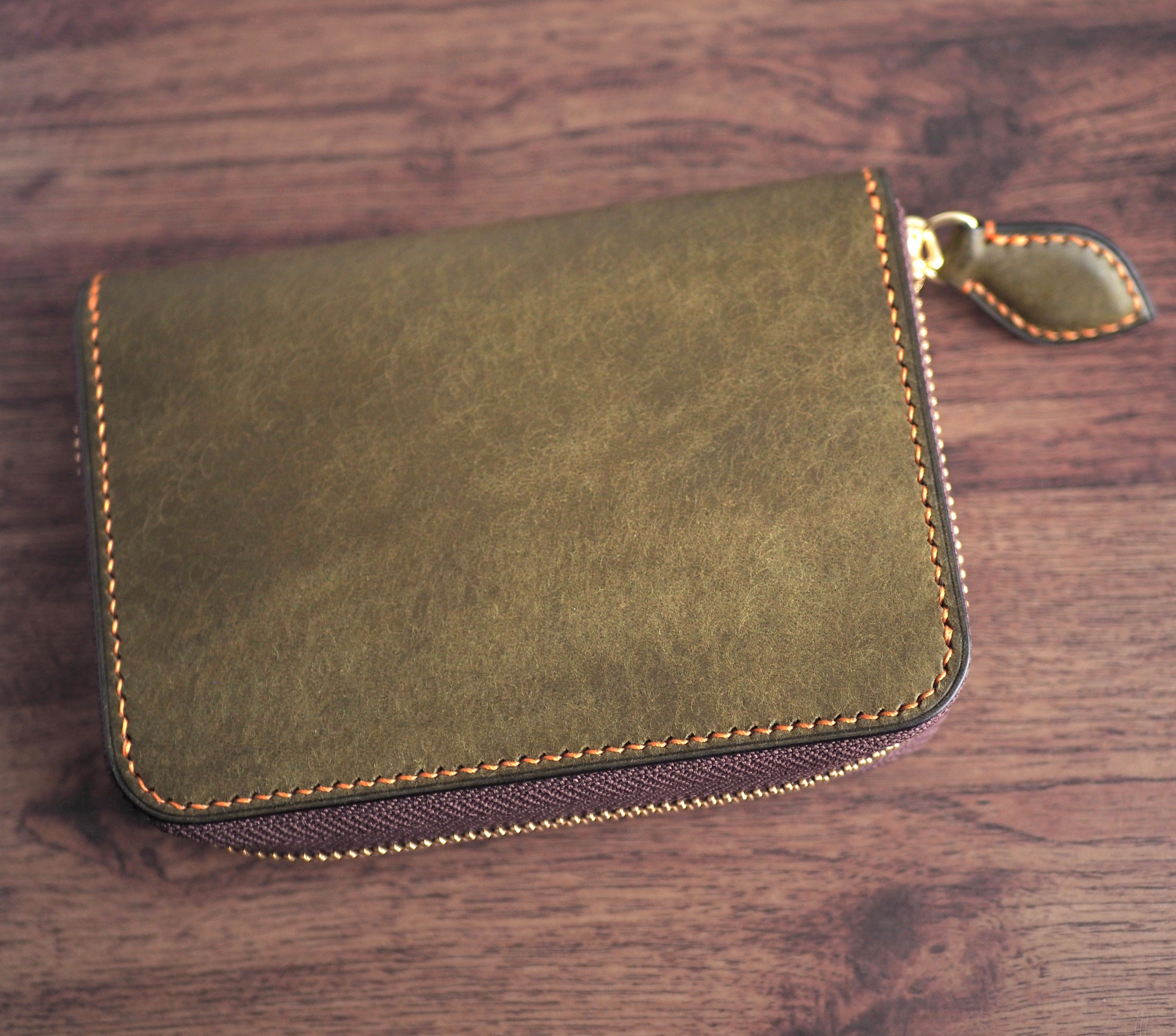こちらは、稀少なイタリアンレザー「マルゴー」を使用し、手縫いで丁寧に製作したラウンドファスナータイプのウォレットです。当店の長財布での約2/3ほどのサイズになり、内装はハーフサイズウォレットのものを採り入れています。コンパクトウォレットとロングウォレットの中間あたりの位置付けの商品になります。