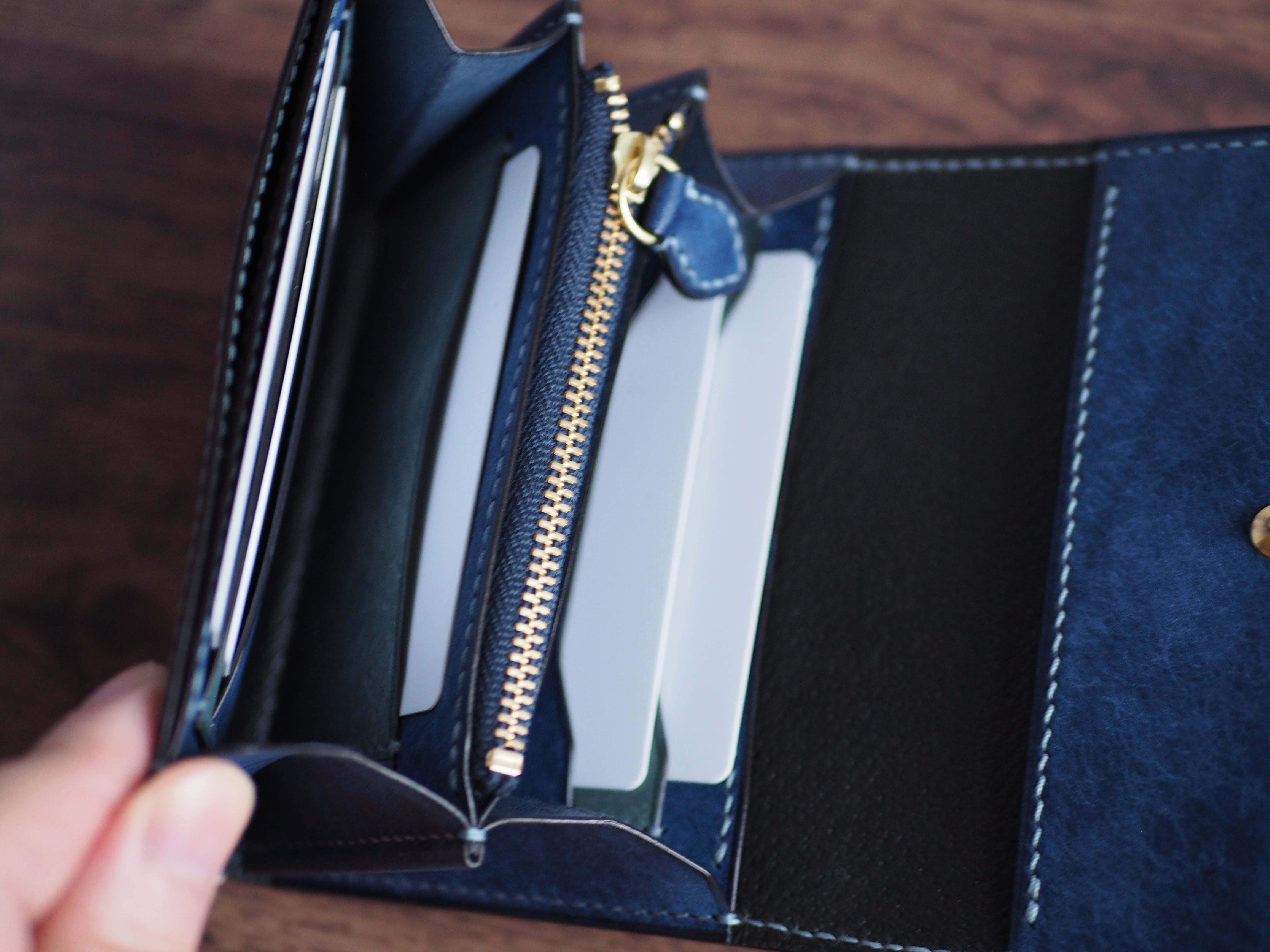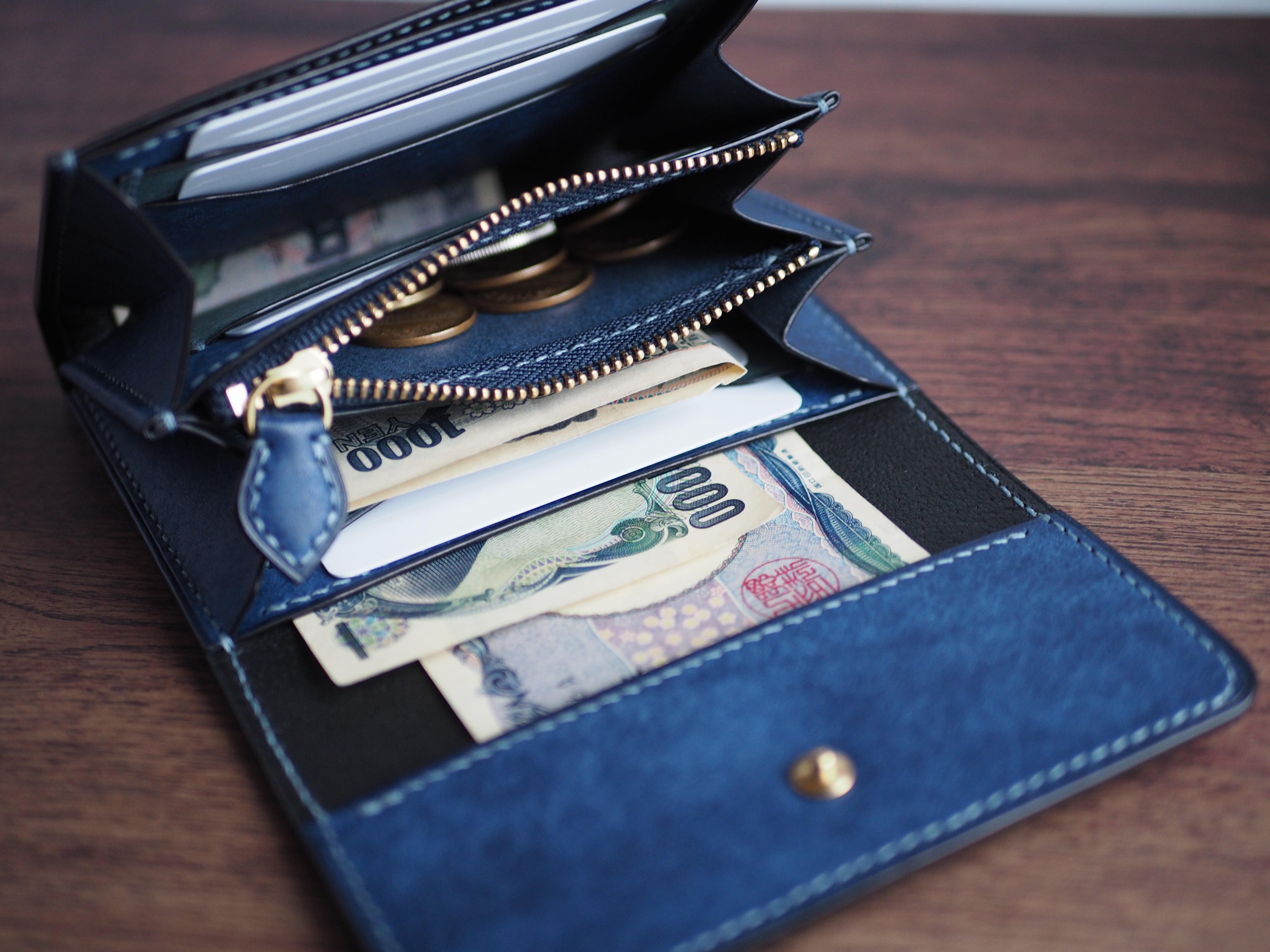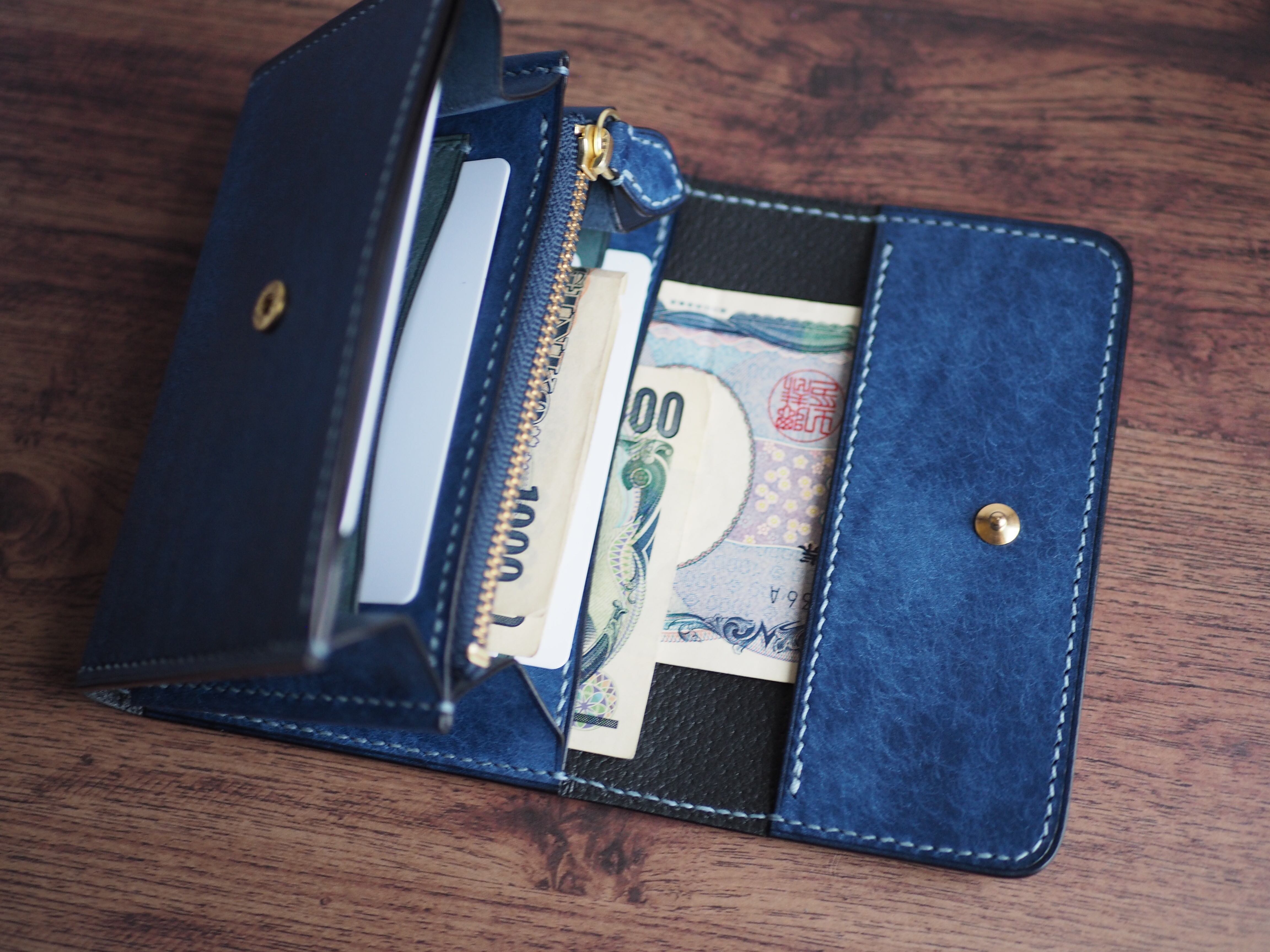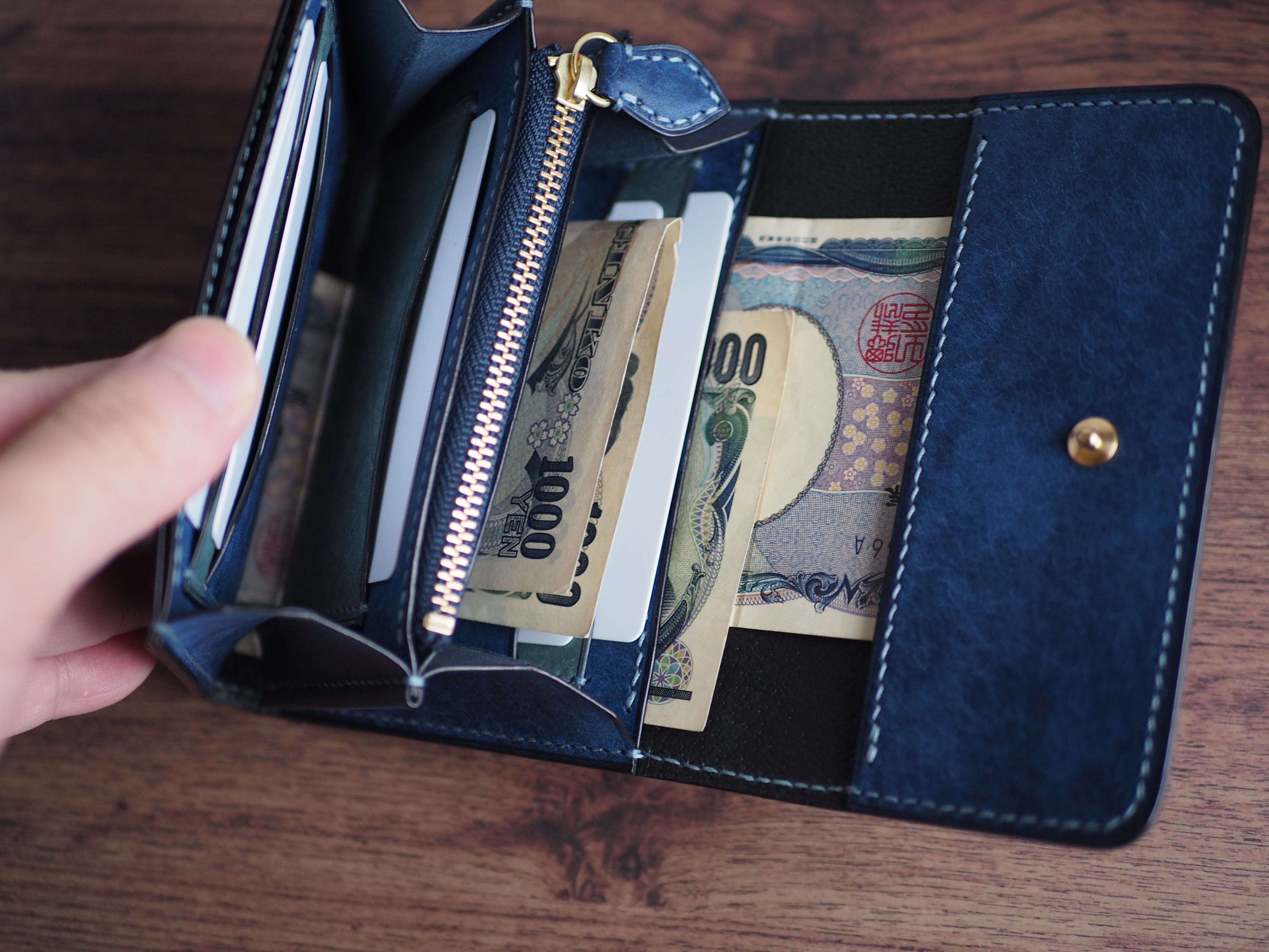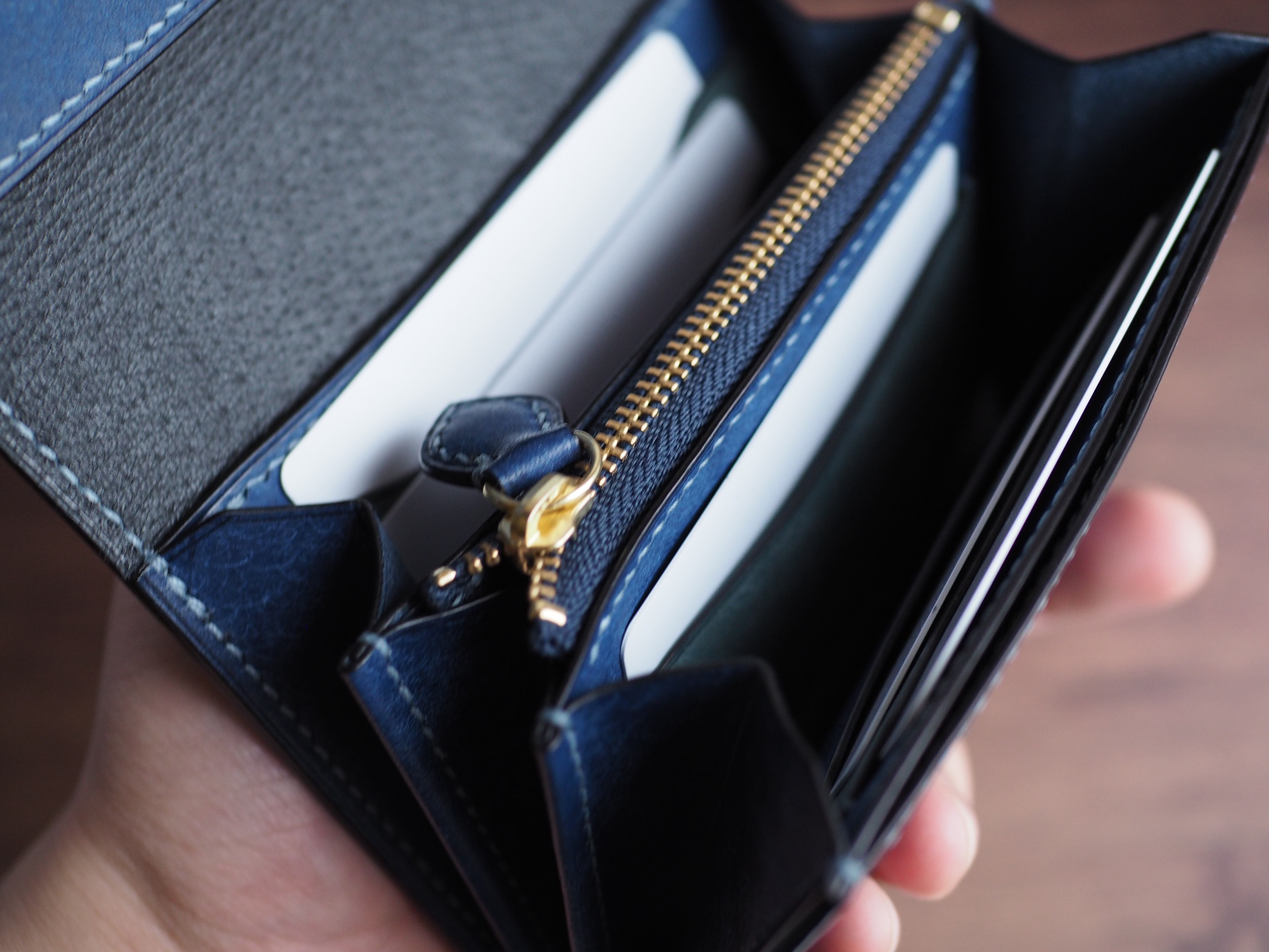 横サイズは一般的な長財布の約2/3程で縦はほぼ同程度といったところです。ふたを開ければカード、コイン、紙幣が一目で視認出来るようになっています。お札は二つ折りでマチに干渉しないように収納できます。カードポケット台座裏、かぶせ裏などにも挟み込めるようにサイズ調整しているのでお札に折り目を付けない収納も可能です。使用者のお好みに合わせた使い方が出来ます。