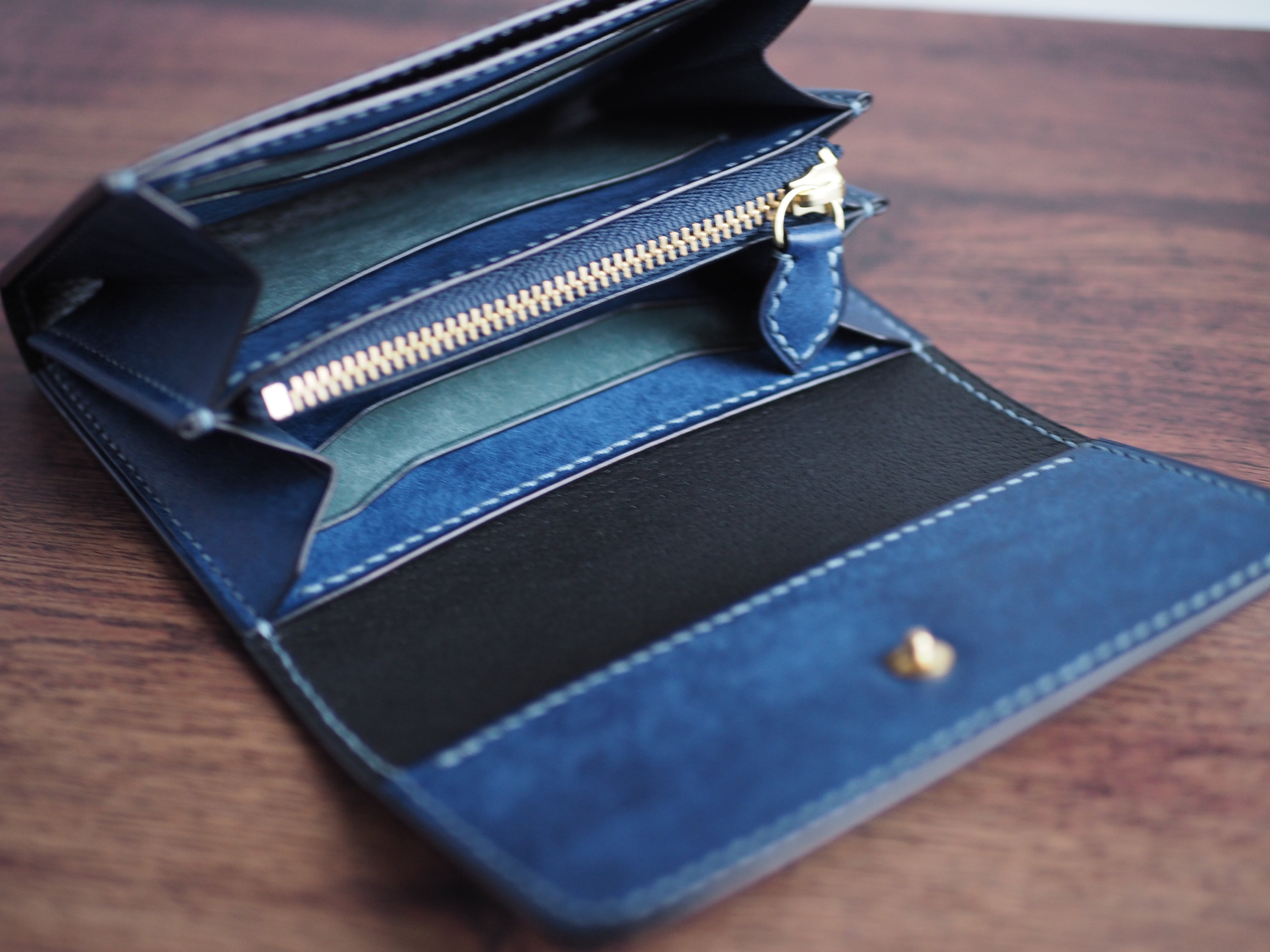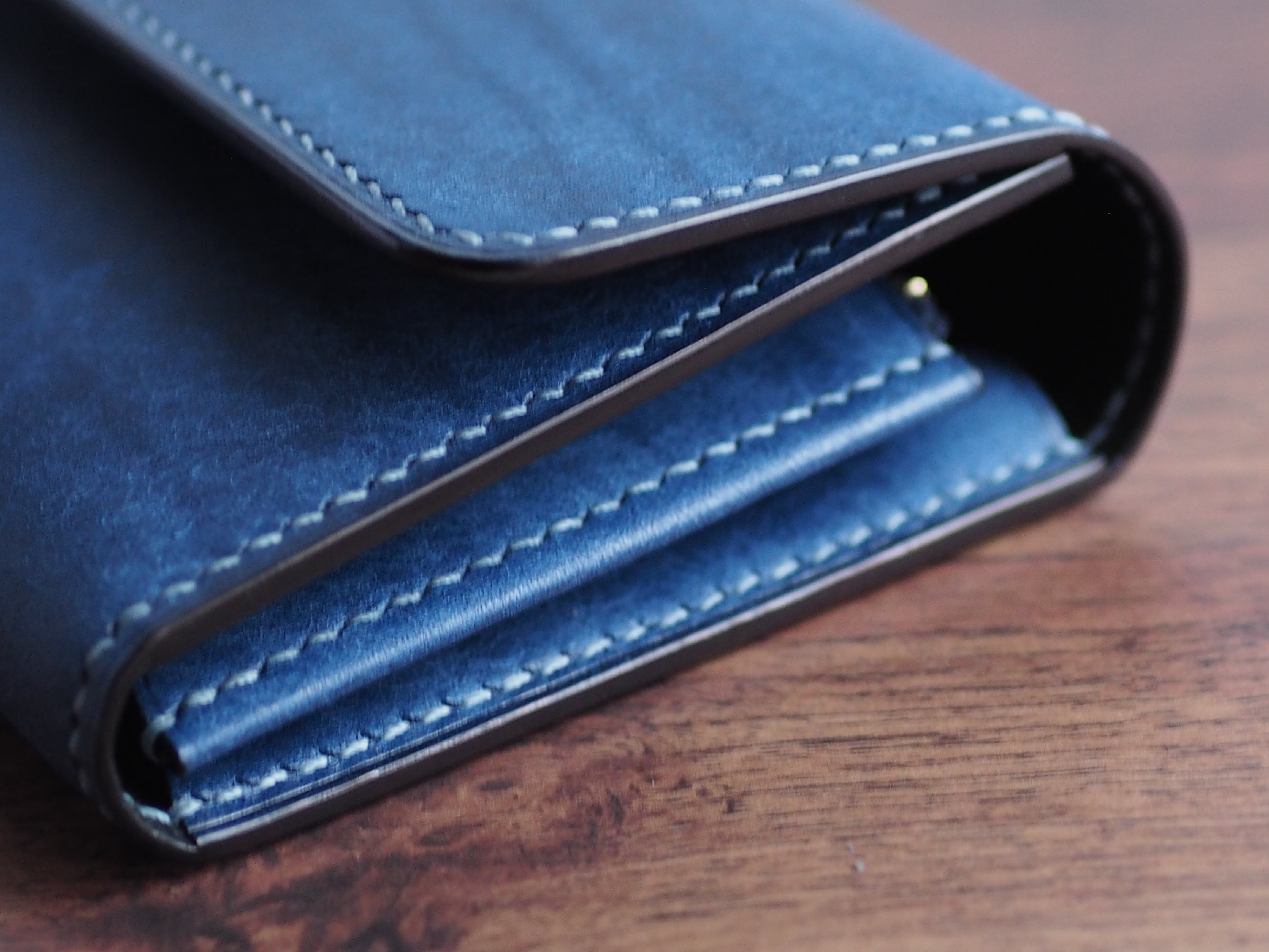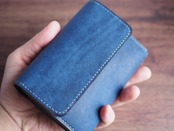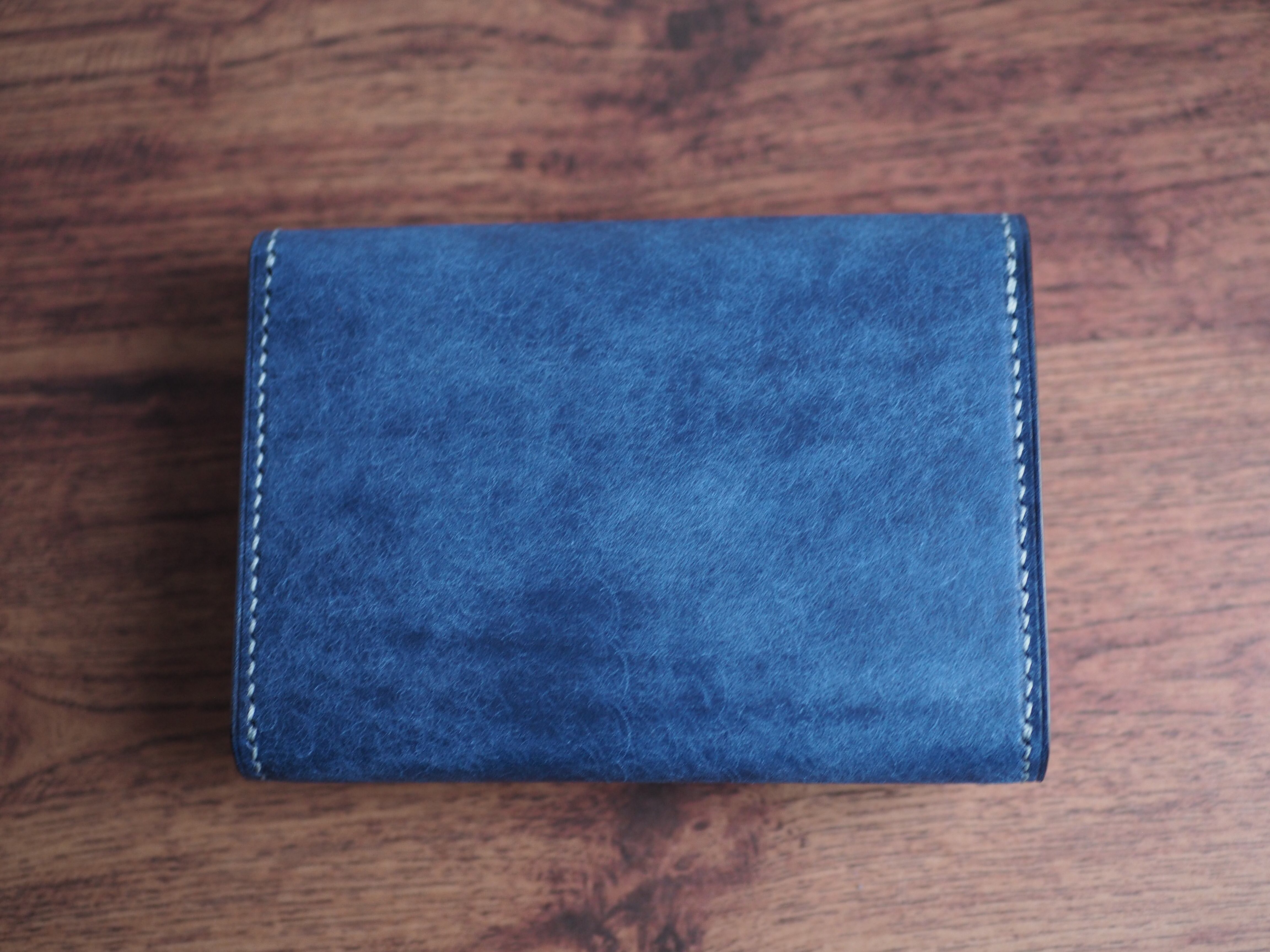 ご覧いただきありがとうございます。イタリアンレザー、マルゴーを使用したハーフウォレットになります。色はコバルトとカードポケットに新色のアヴィオを使い、台湾製の糸、六花0.4mm(ウィンターミスト)で手縫いで仕上げています。