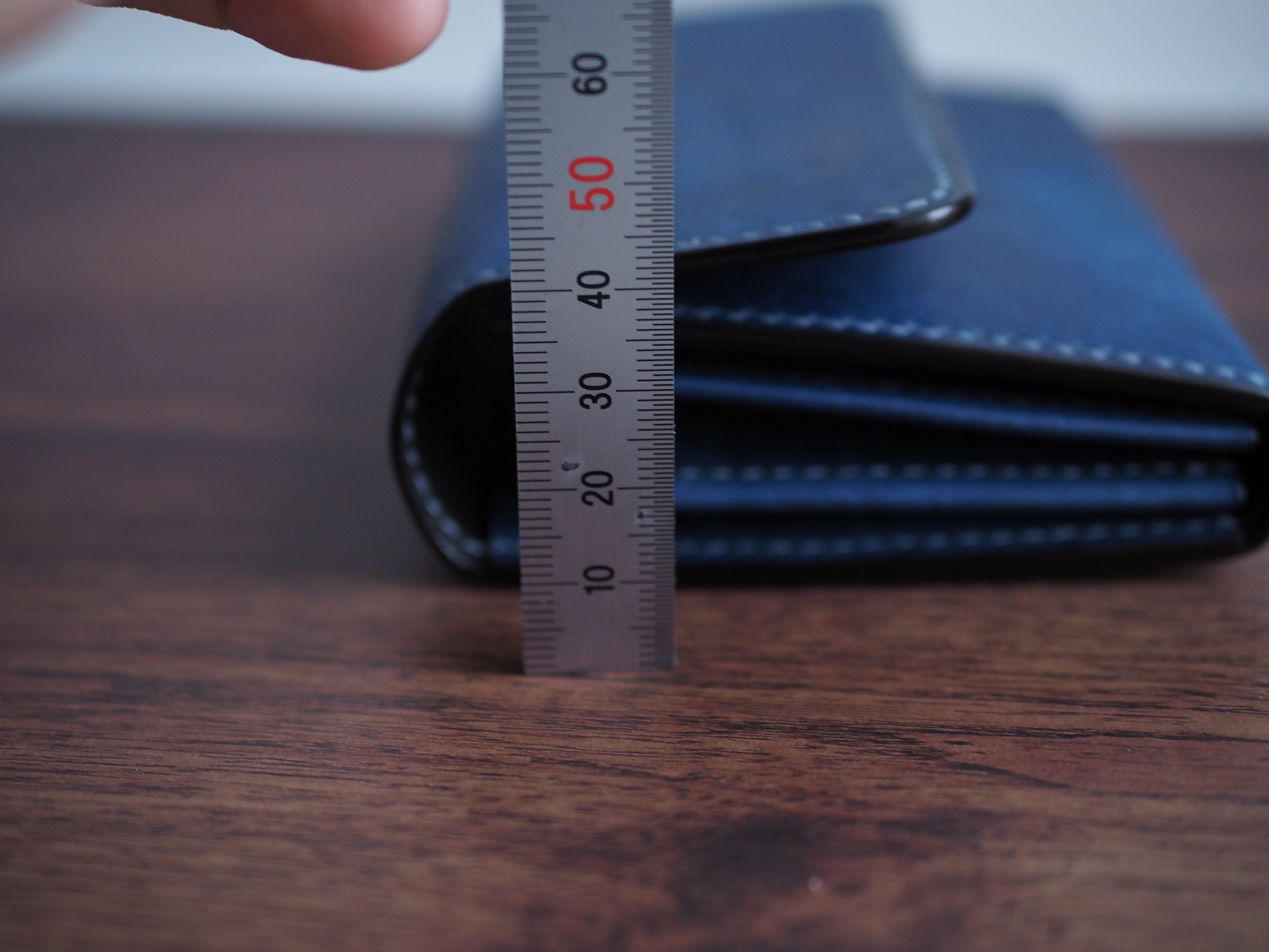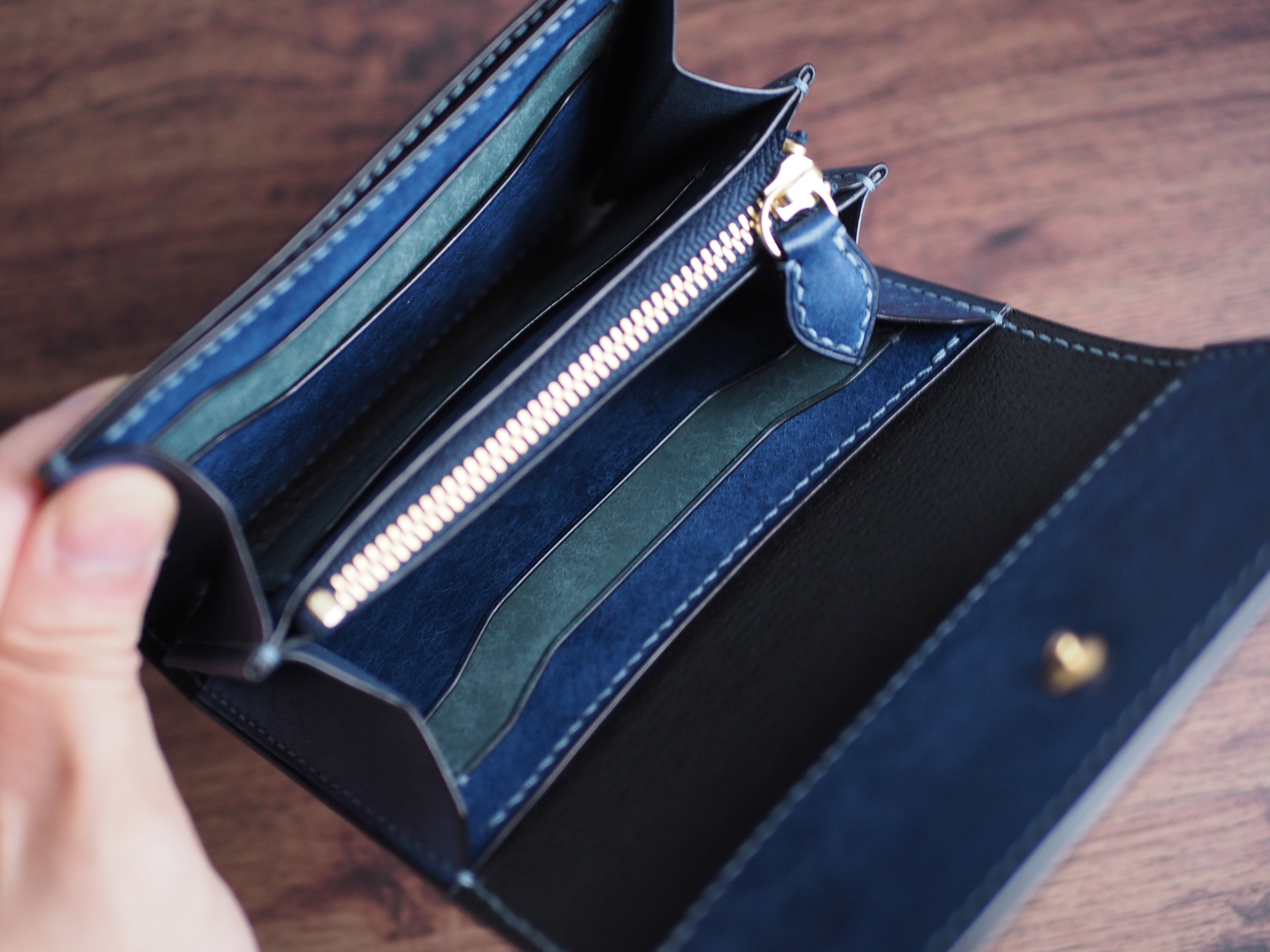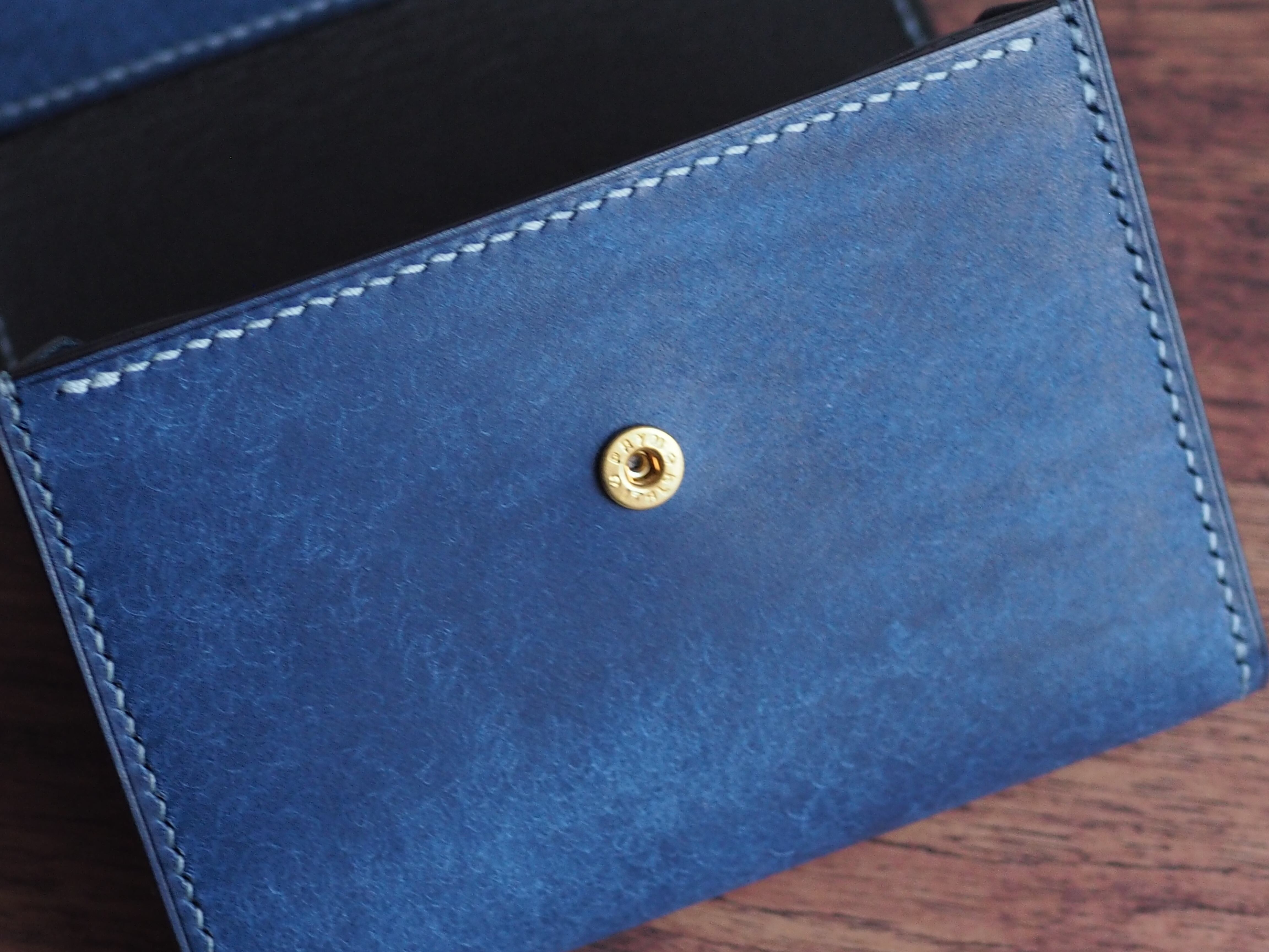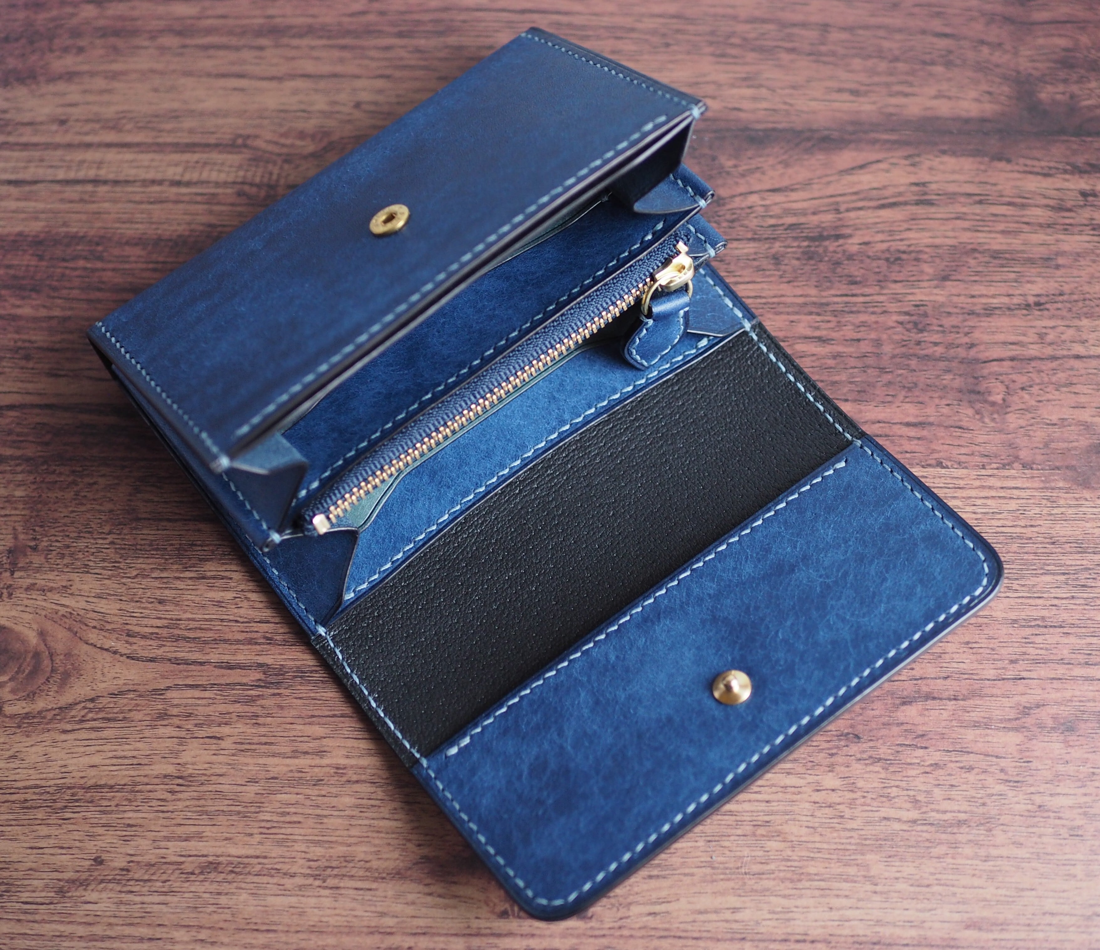 ご覧いただきありがとうございます。イタリアンレザー、マルゴーを使用したハーフウォレットになります。色はコバルトとカードポケットに新色のアヴィオを使い、台湾製の糸、六花0.4mm(ウィンターミスト)で手縫いで仕上げています。