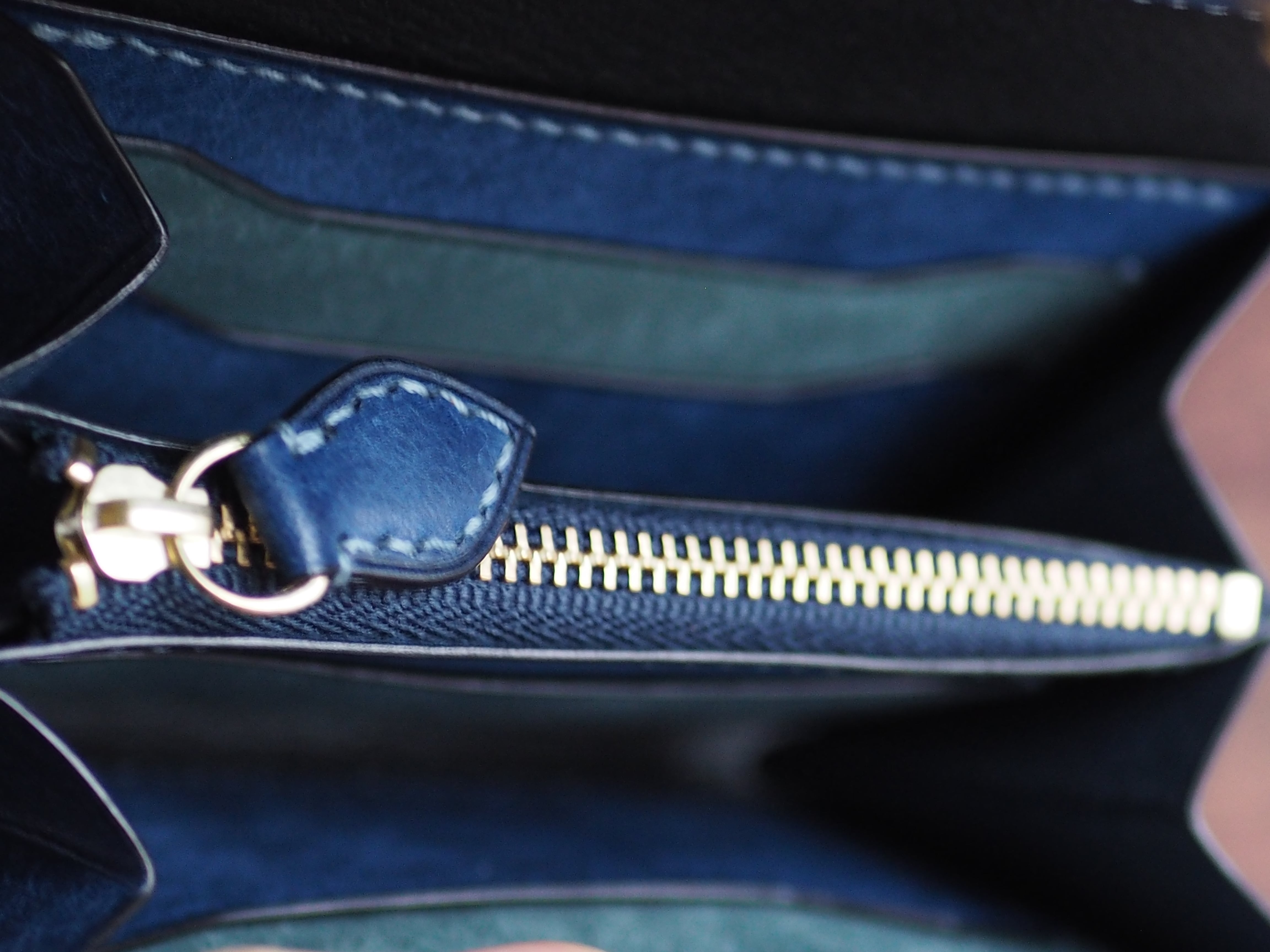 手縫いの利点としては糸のほつれにくさ、ほつれたあとの修理が可能といった点があります。ミシン縫いとは縫い目の向きが逆になり裏面まで斜めの縫目になるように調整しています。ヨーロッパ目打ちを使っているので通常の菱目打ちより角度がつき、より手縫いらしさを強調しています。永らくお付き合えるようにサポート致しますので修理の際はぜひ当店へご連絡下さい。