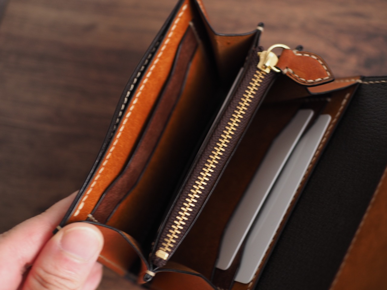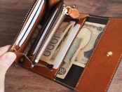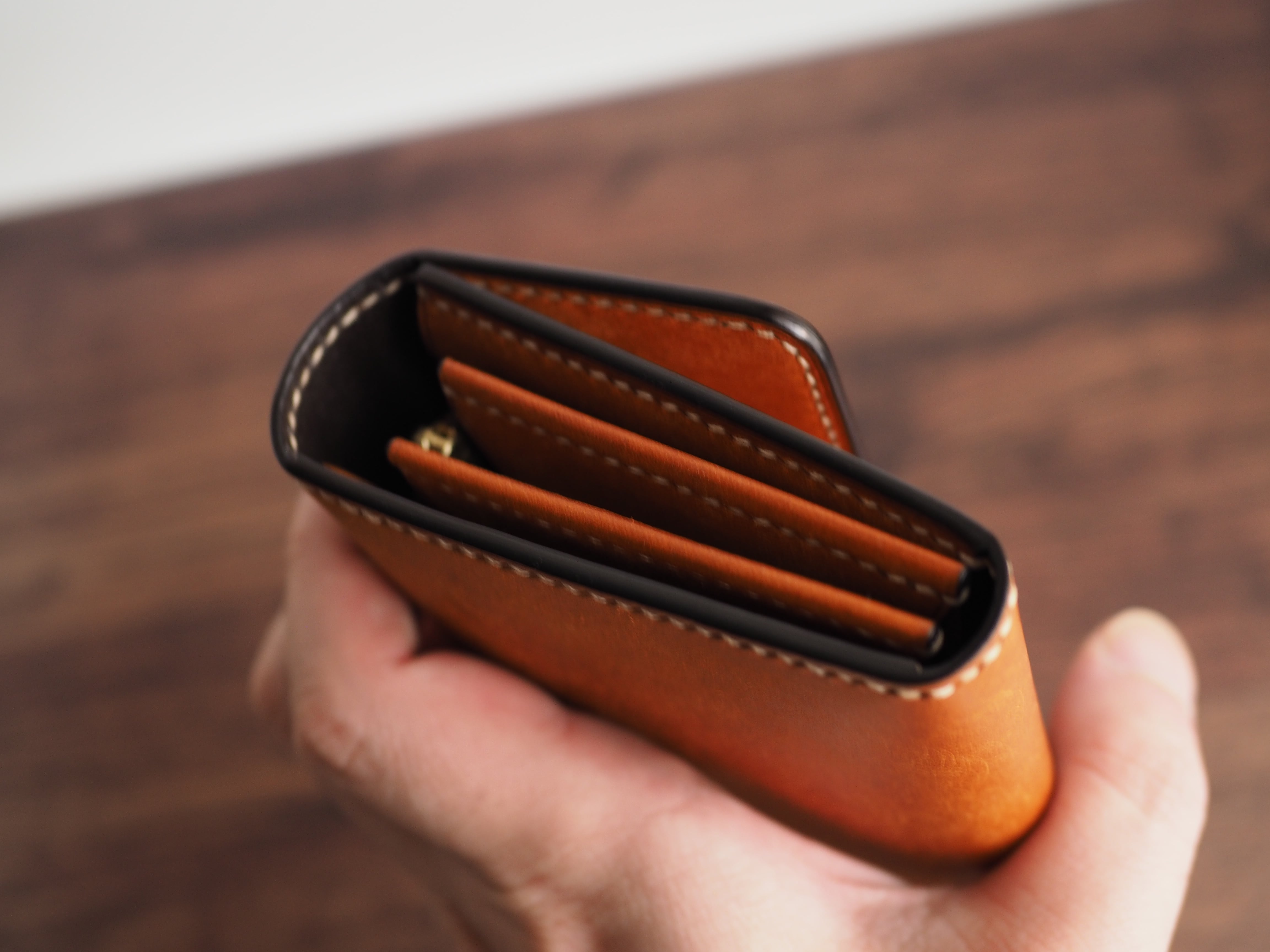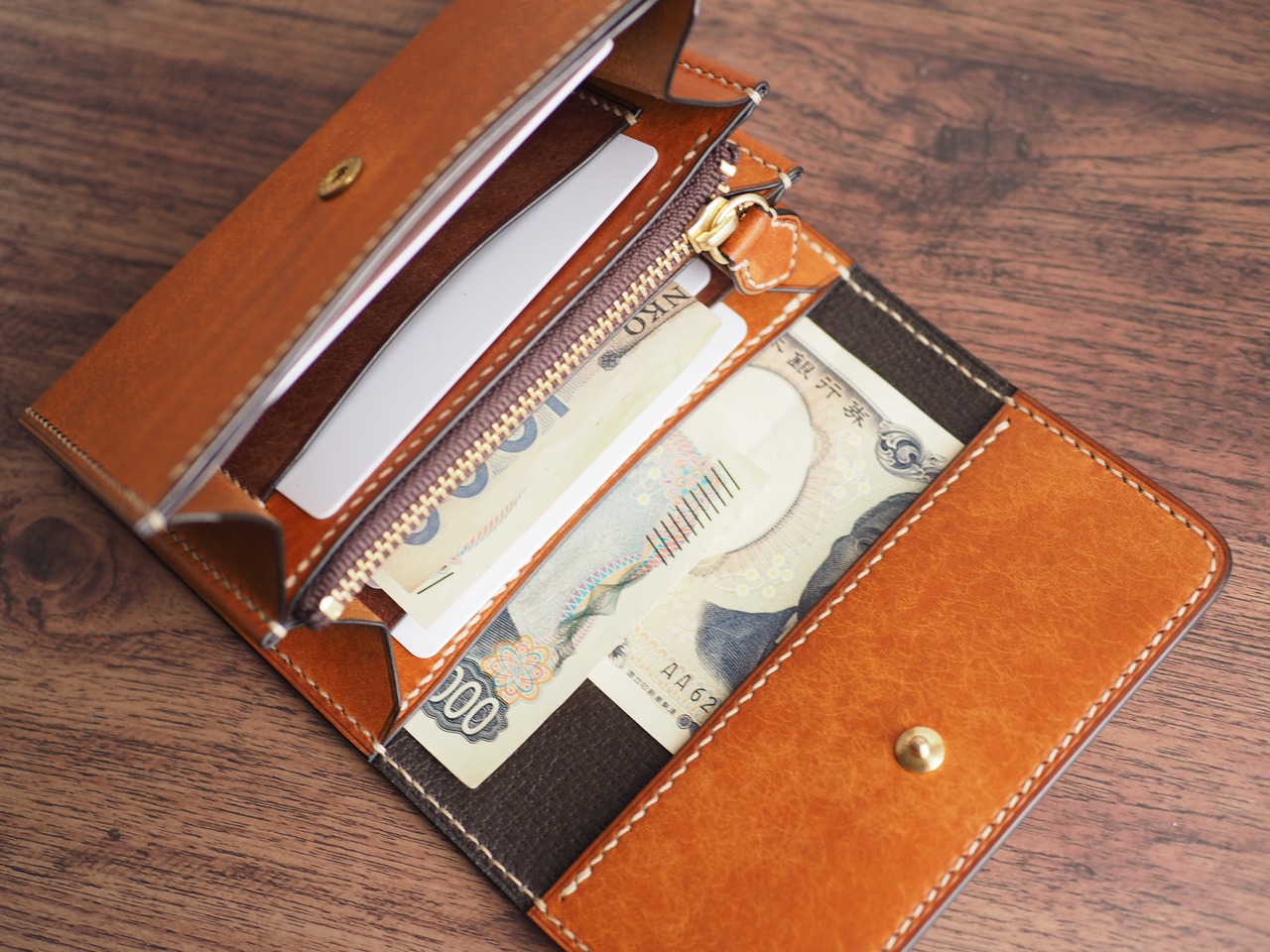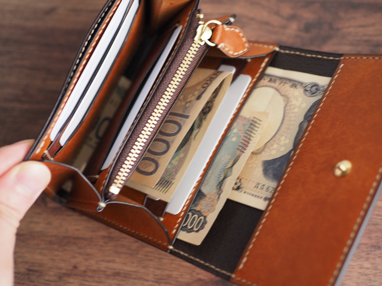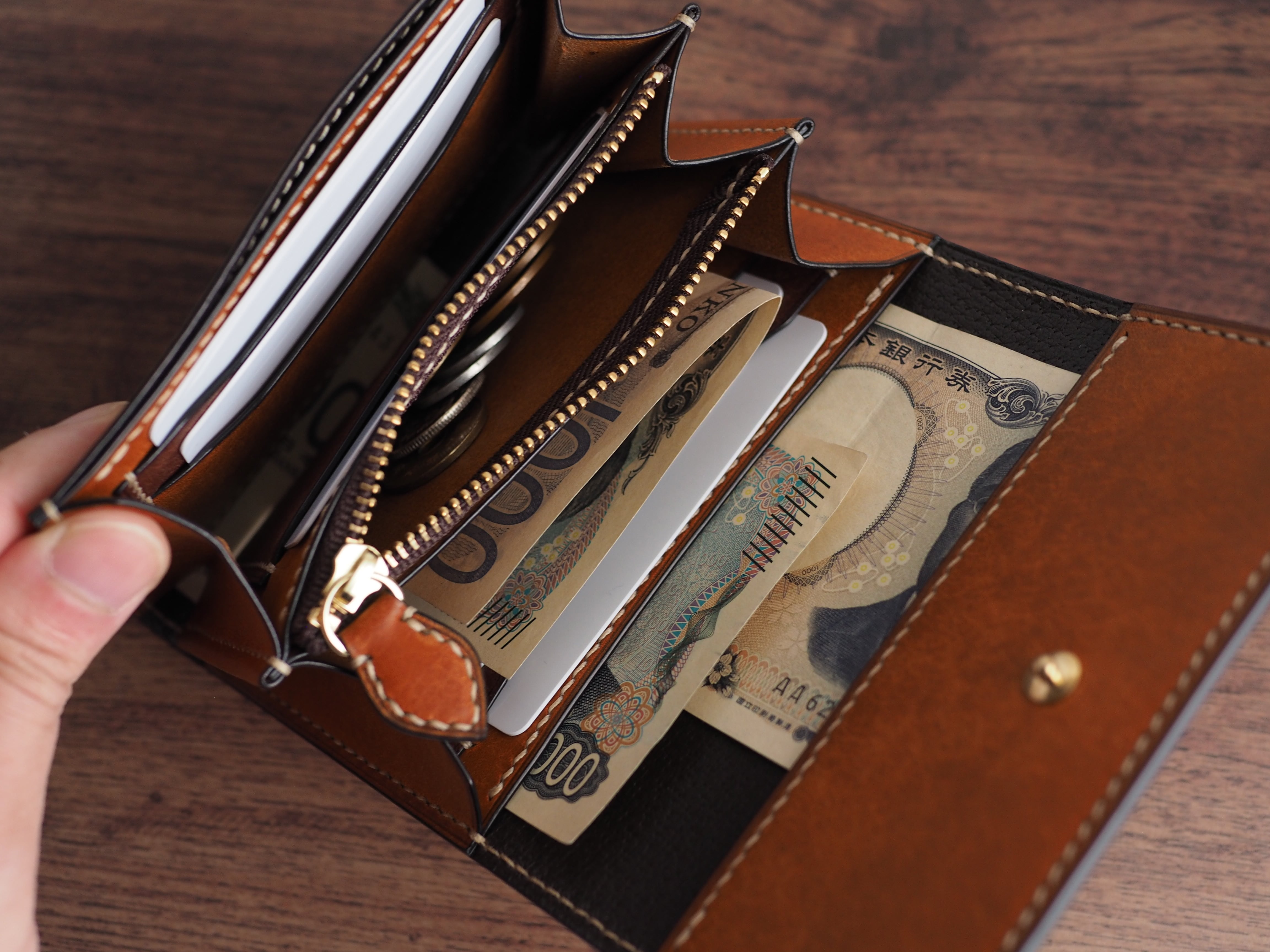 横サイズは一般的な長財布の約2/3程で縦はほぼ同程度といったところです。ふたを開ければカード、コイン、紙幣が一目で視認出来るようになっています。お札は二つ折りでマチに干渉しないように収納できます。カードポケット台座裏、かぶせ裏などにも挟み込めるようにサイズ調整しているのでお札に折り目を付けない収納も可能です。使用者のお好みに合わせた使い方が出来ます。