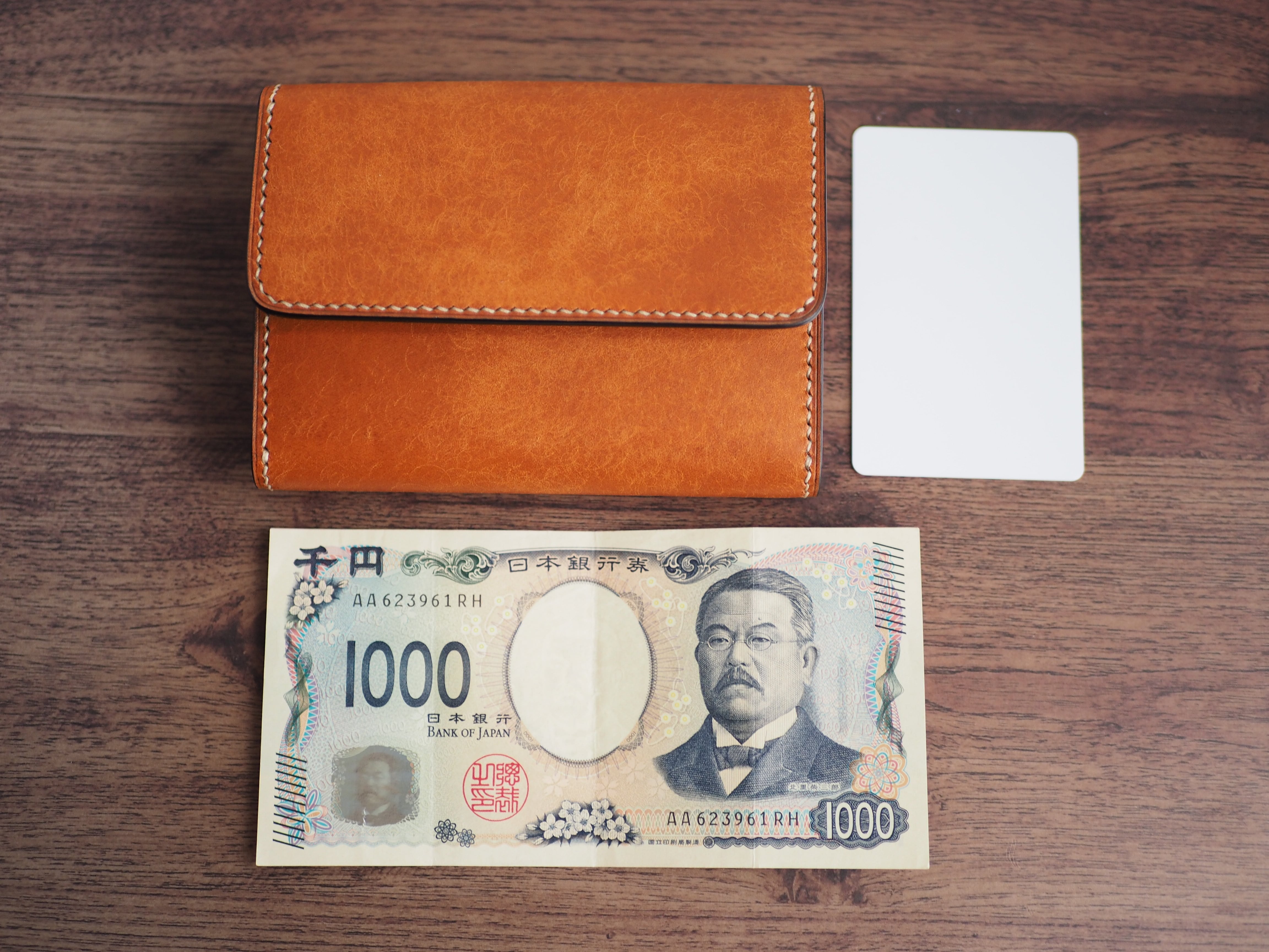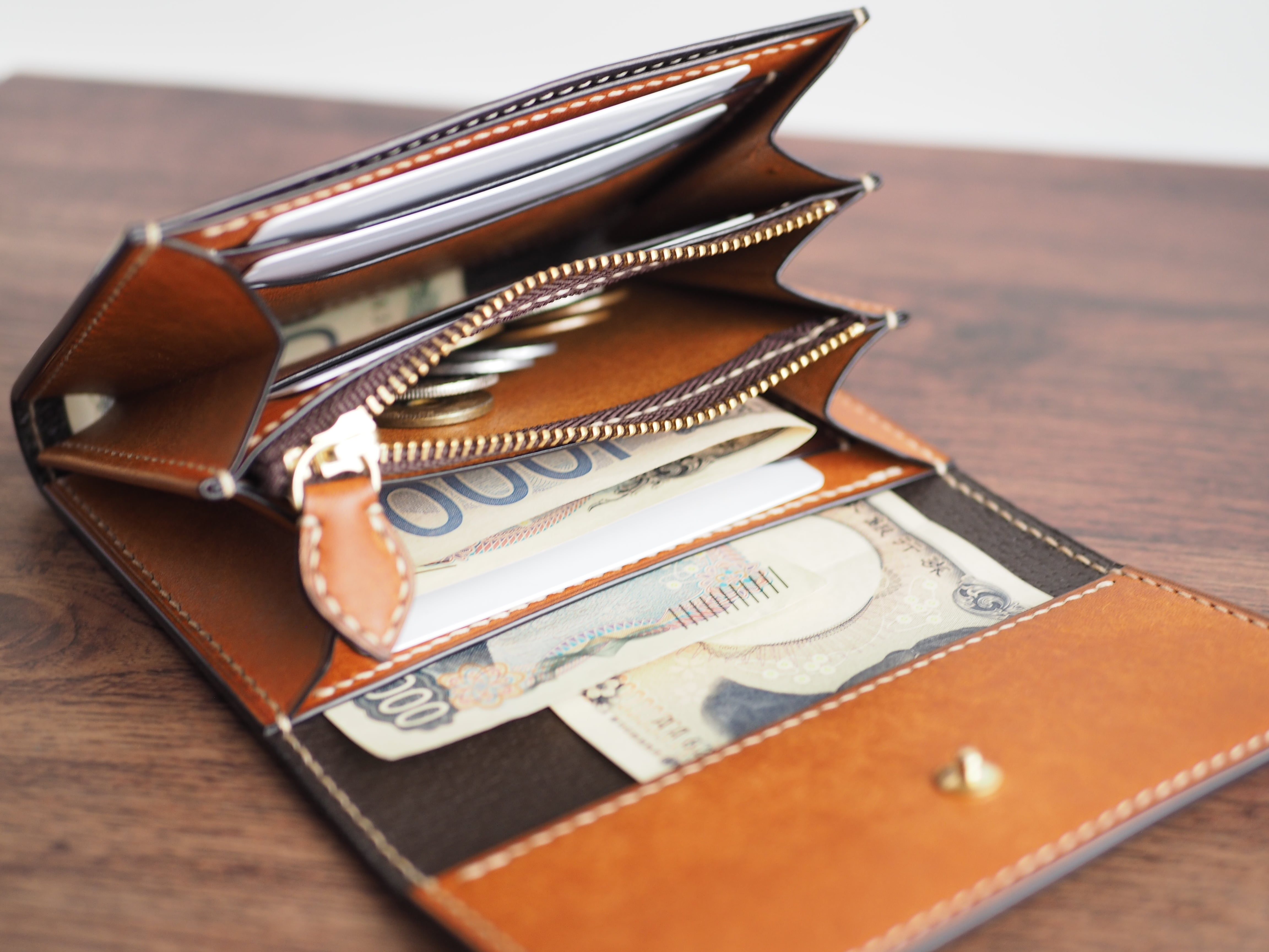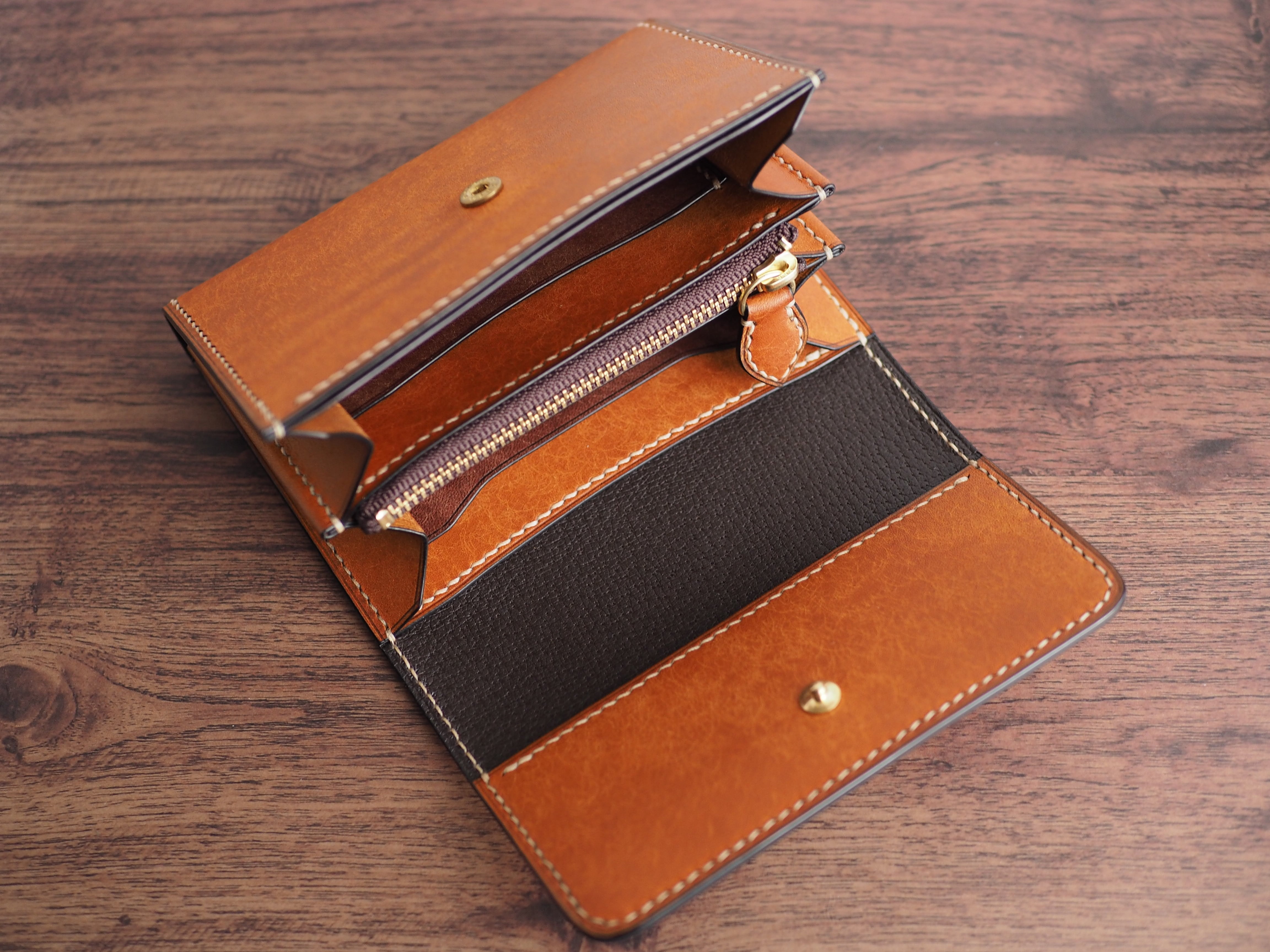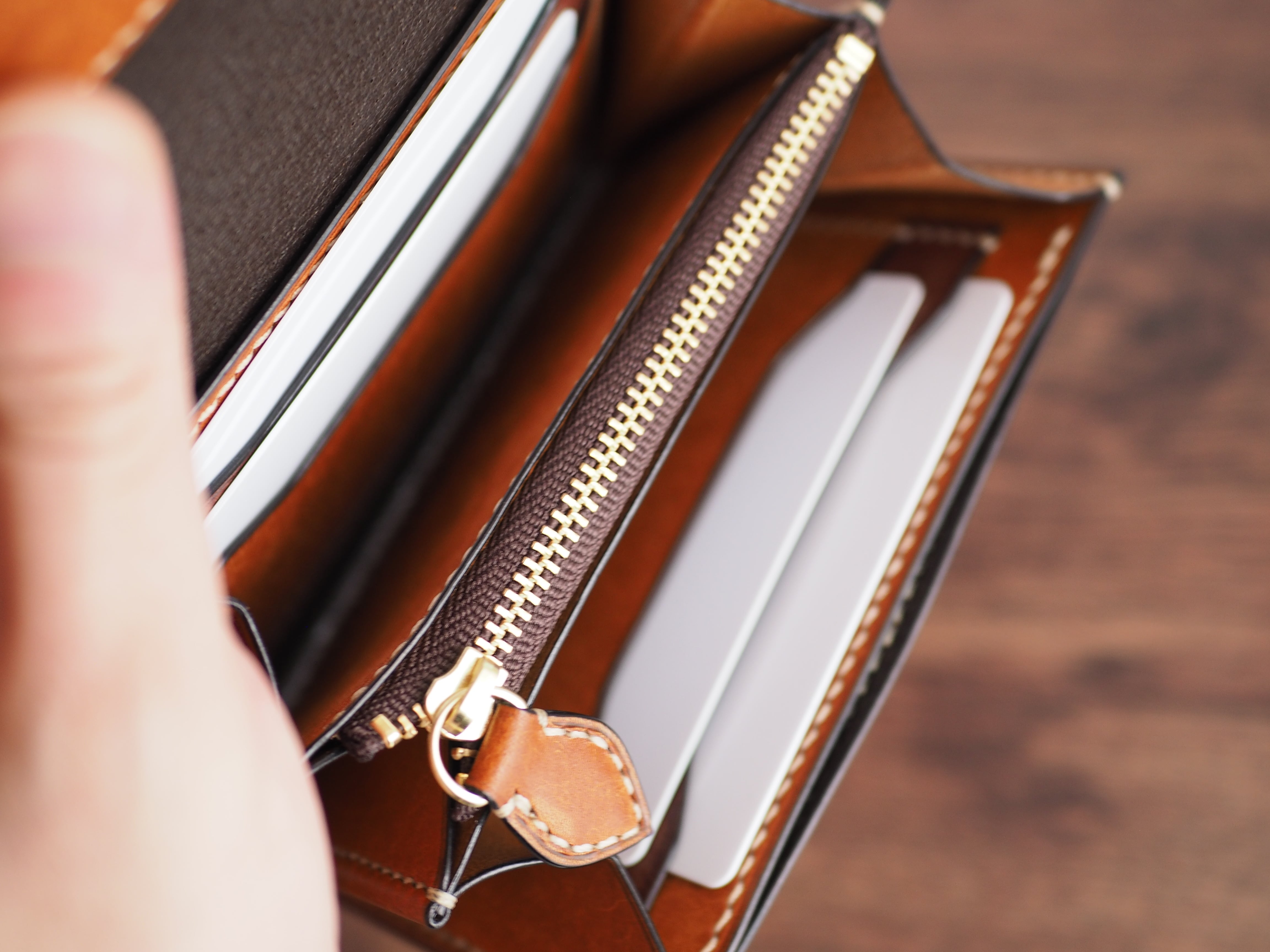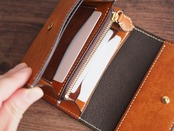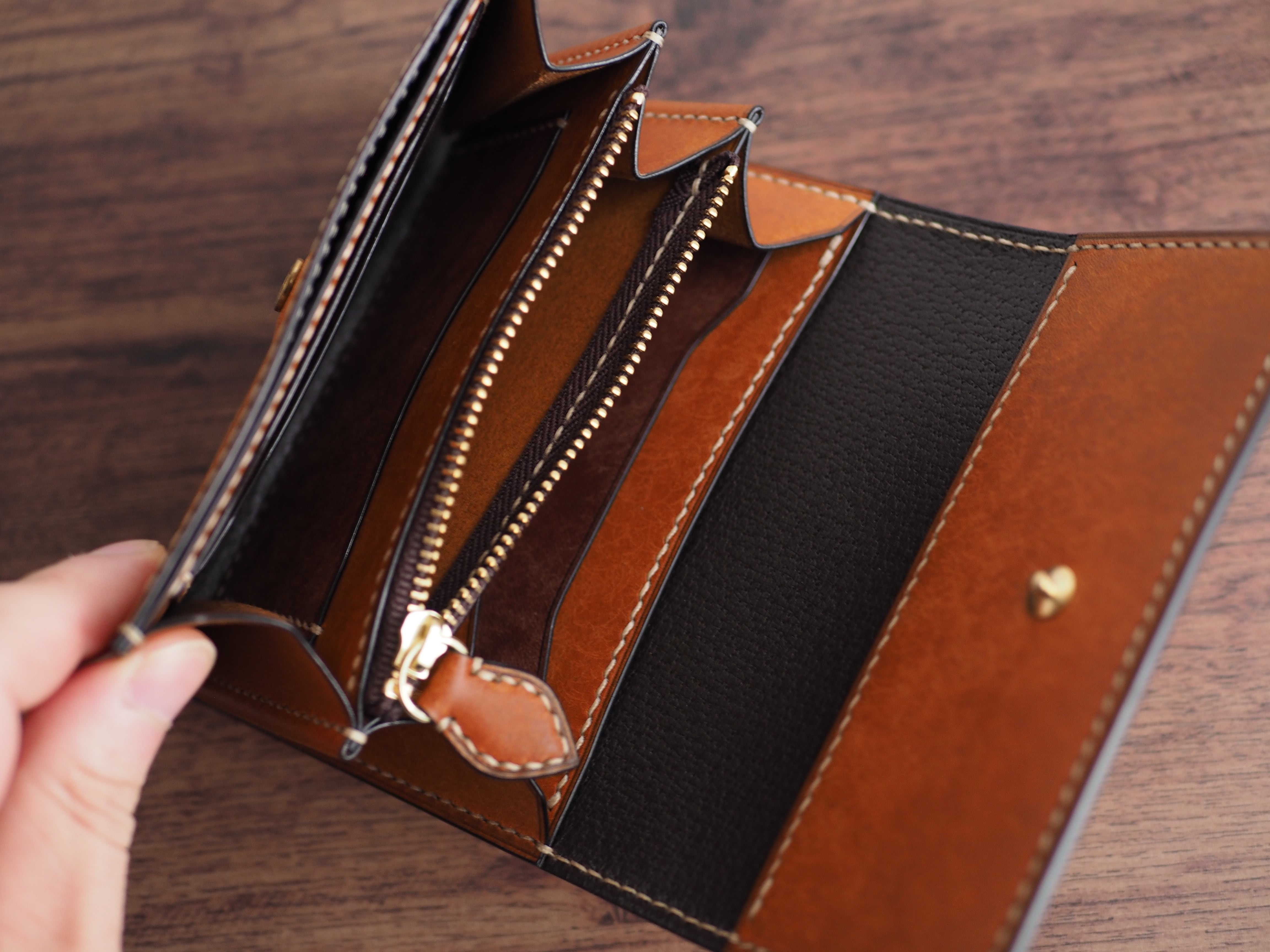 横サイズは一般的な長財布の約2/3程で縦はほぼ同程度といったところです。ふたを開ければカード、コイン、紙幣が一目で視認出来るようになっています。お札は二つ折りでマチに干渉しないように収納できます。カードポケット台座裏、かぶせ裏などにも挟み込めるようにサイズ調整しているのでお札に折り目を付けない収納も可能です。使用者のお好みに合わせた使い方が出来ます。