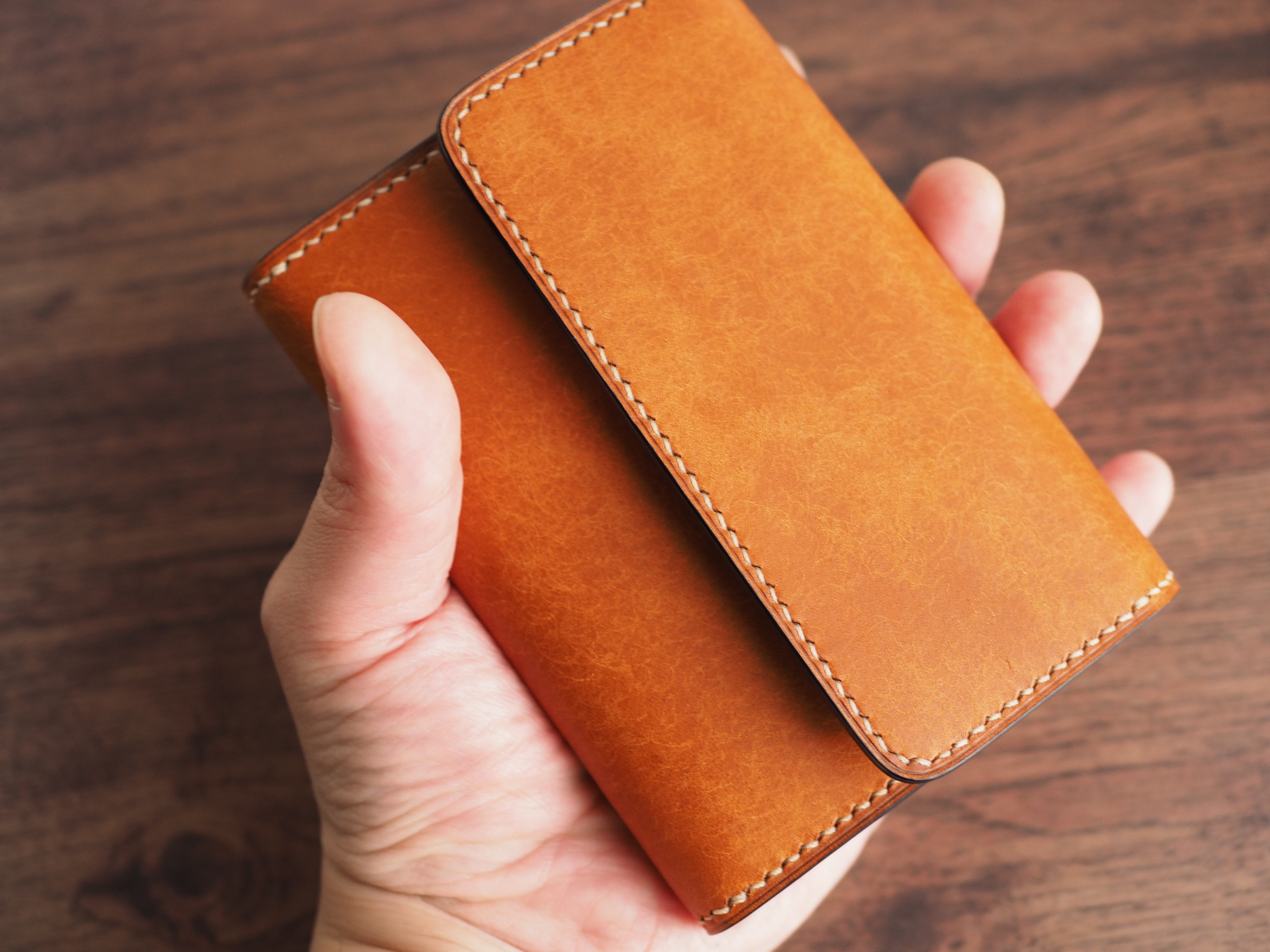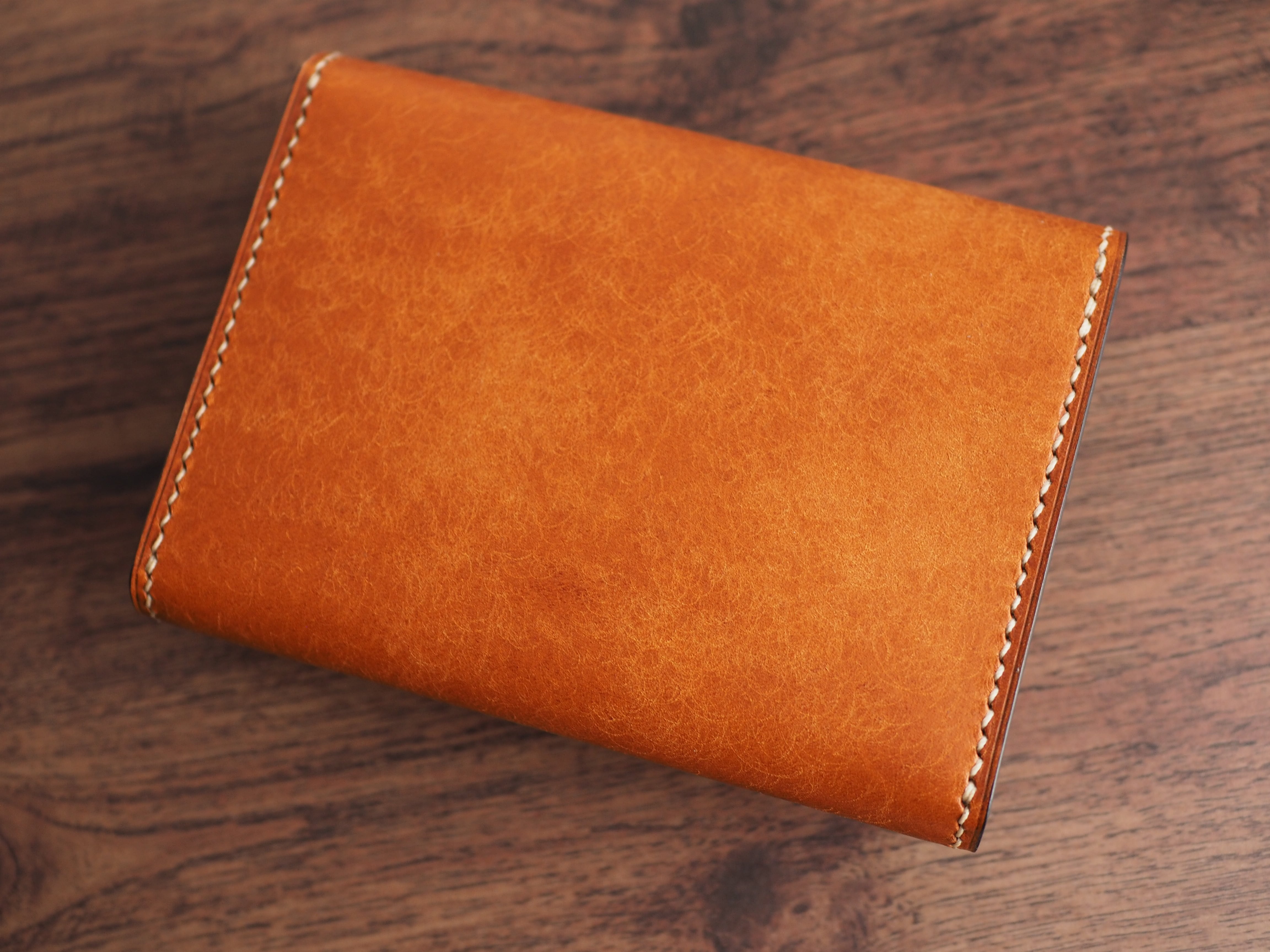ご覧いただきありがとうございます。イタリアンレザー、マルゴーを使用したハーフウォレットになります。色はフィエーノ(オレンジキャメル)とカードポケットにダークブラウンを使い、台湾製の糸、六花0.4mm(ジェントルマン)で手縫いで仕上げています。