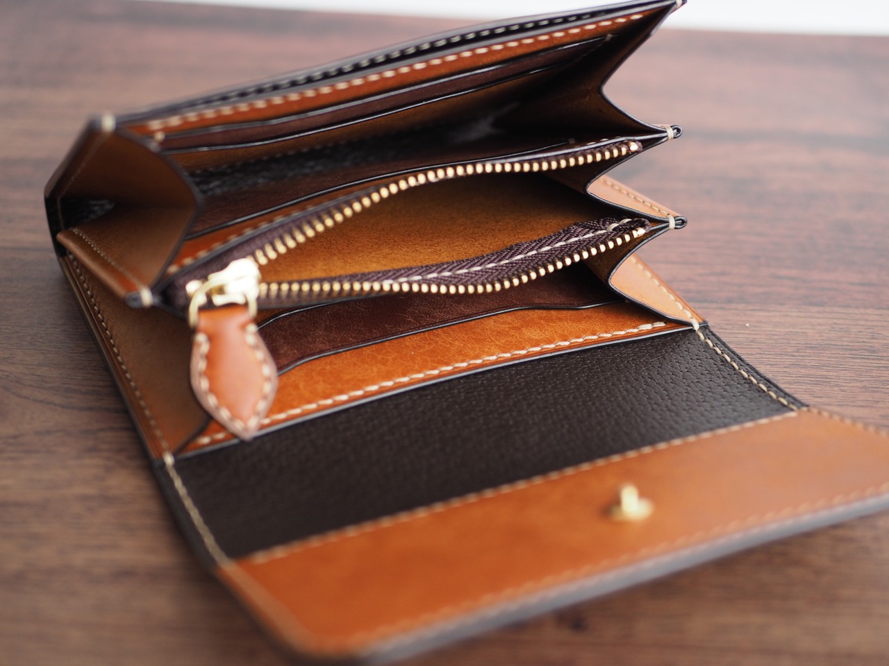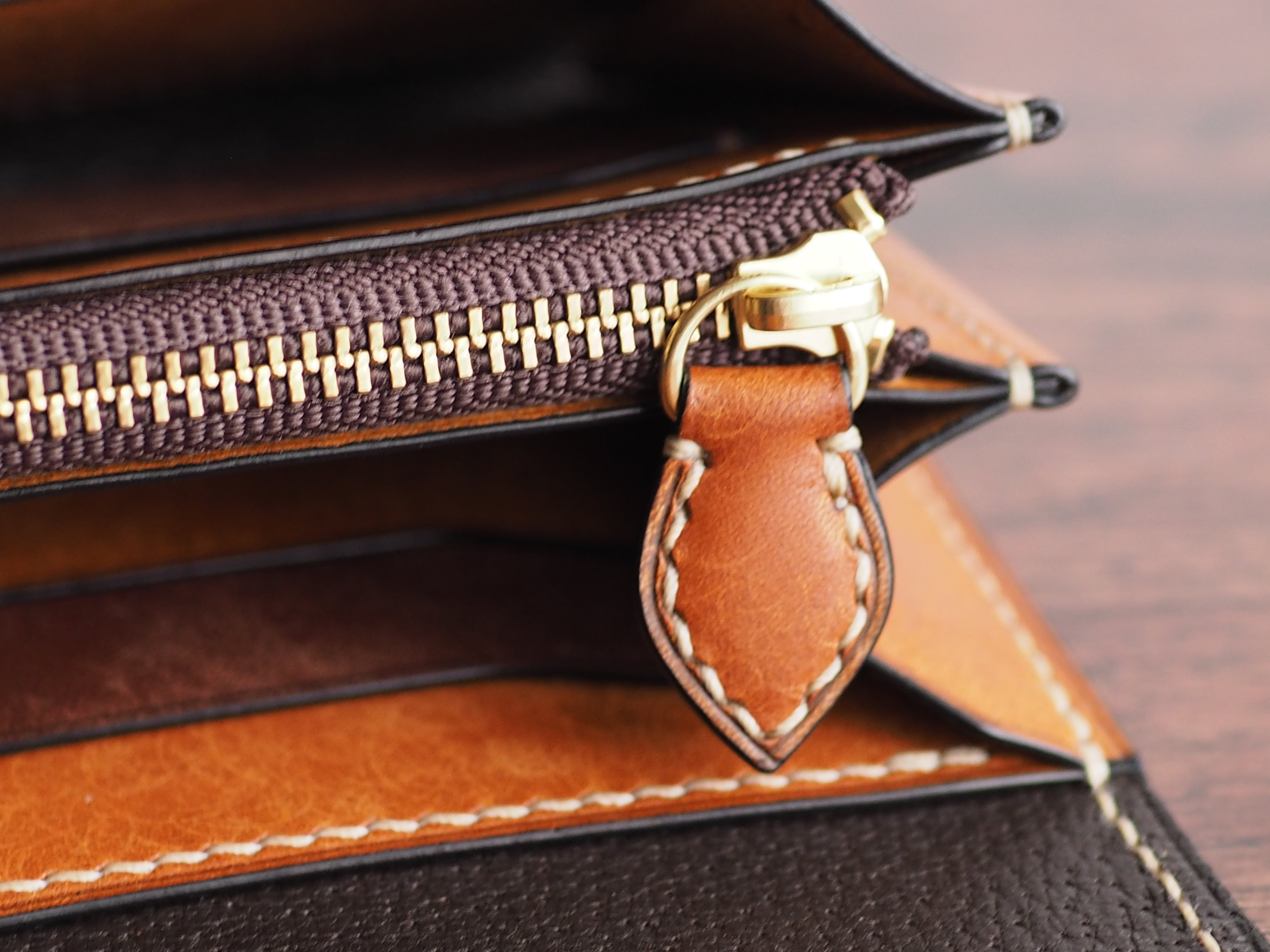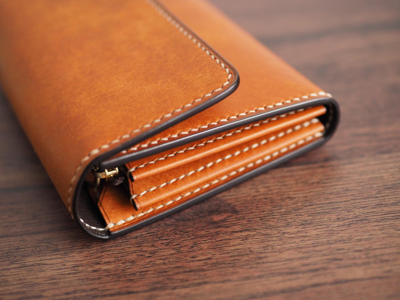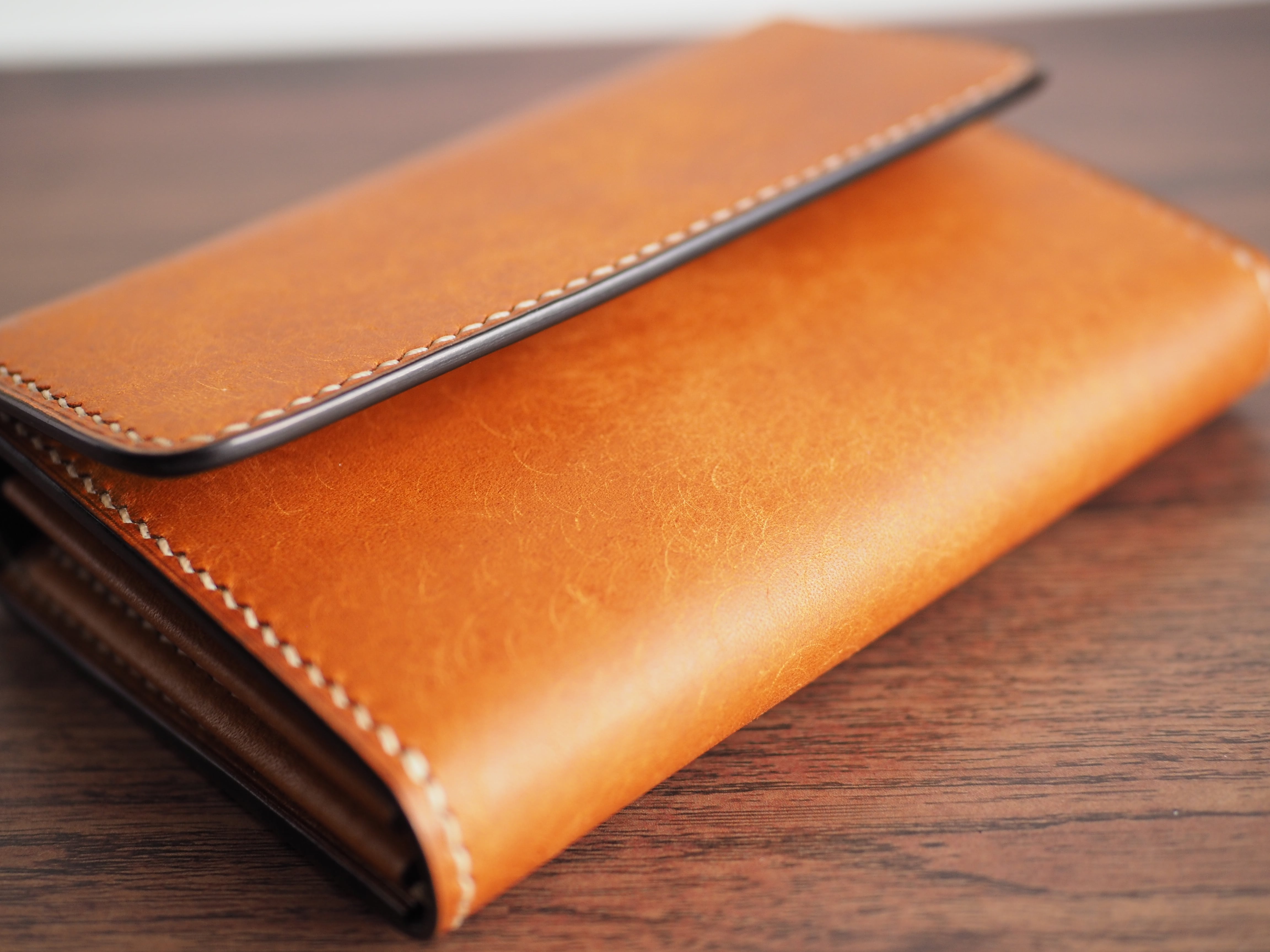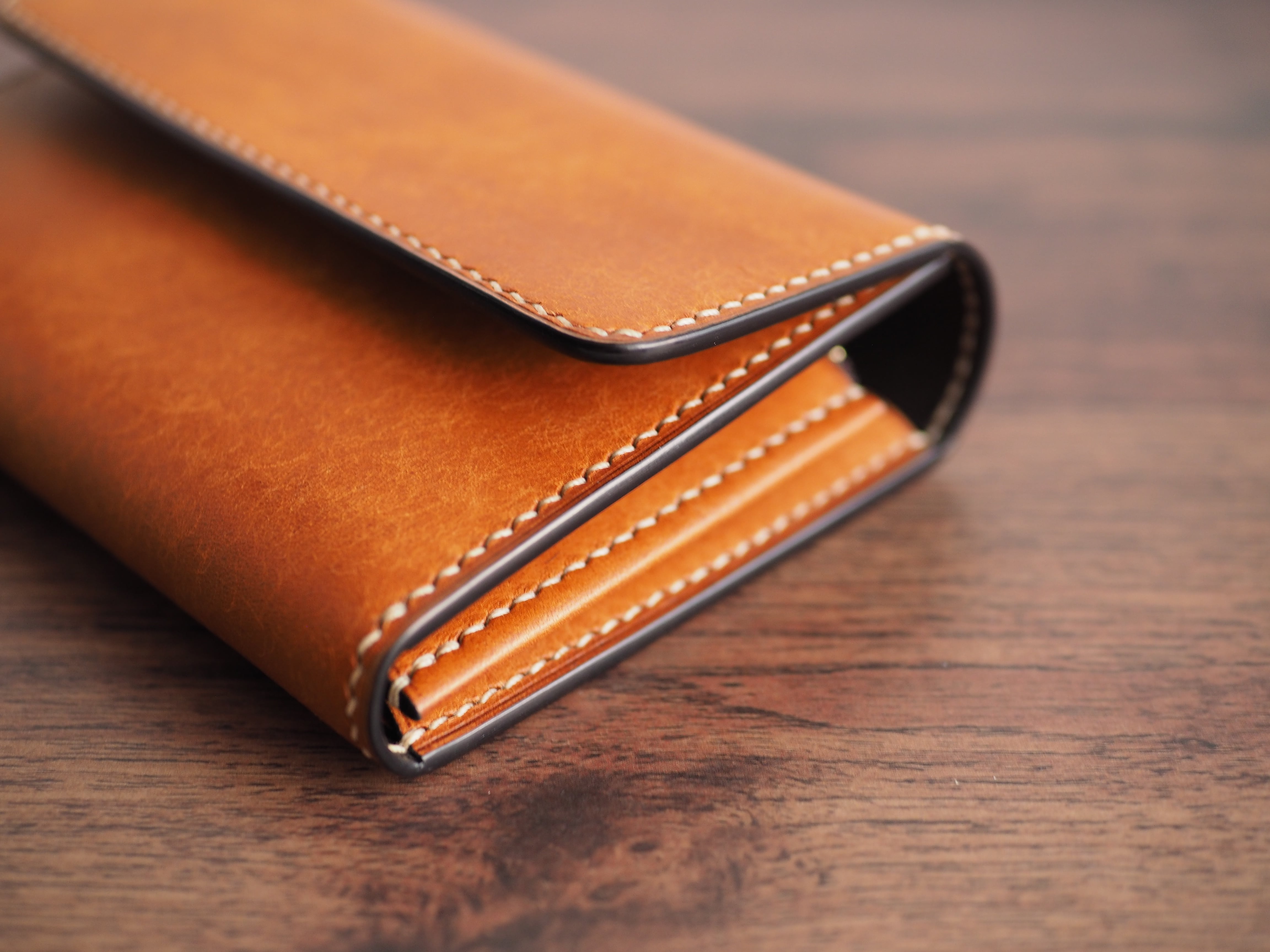 コバは染色後、仕上げ剤と蜜蝋を熱で溶かし込み磨き上げています。コバの仕上げには時間をかけているのでぜひご確認下さい。