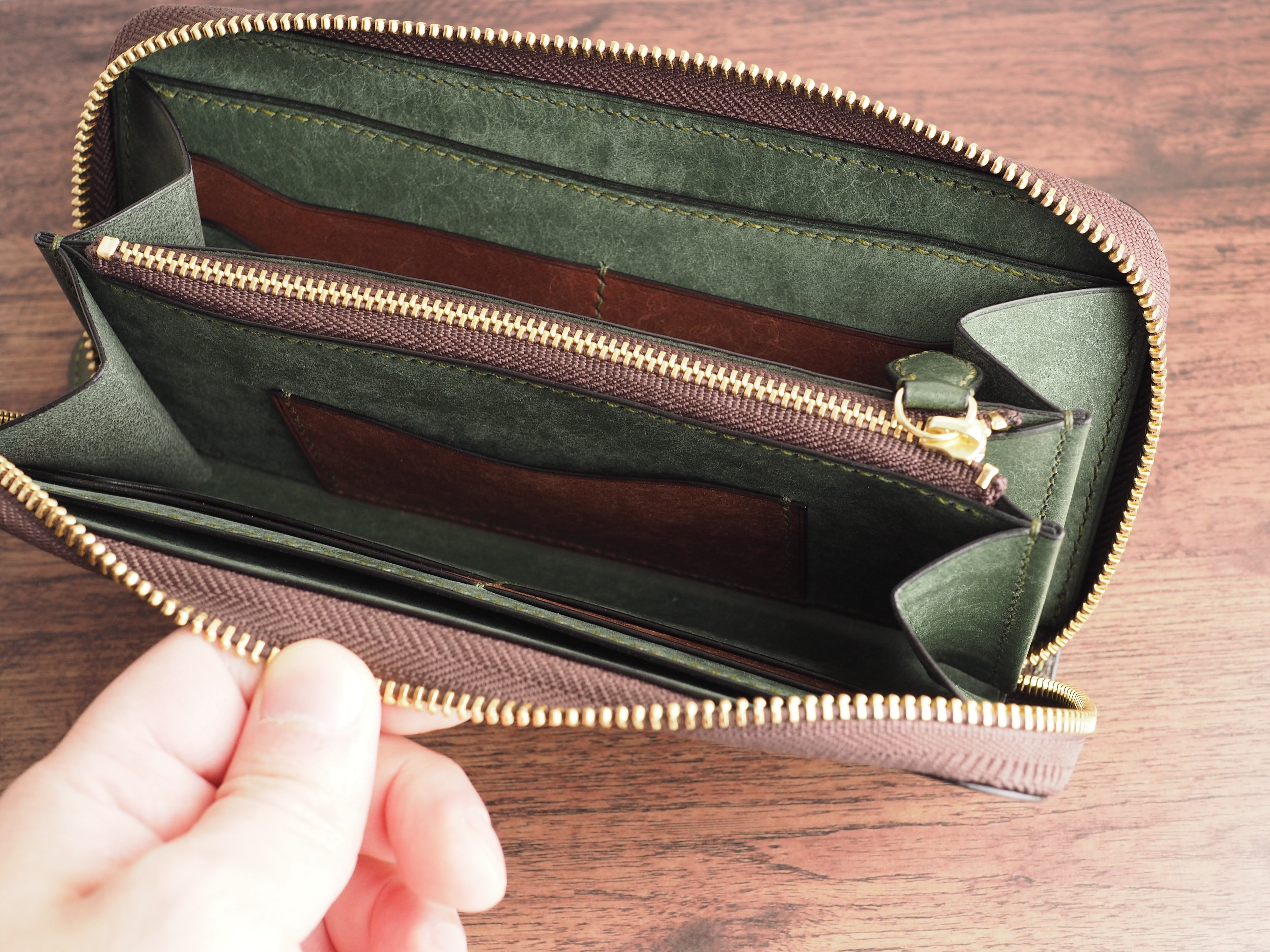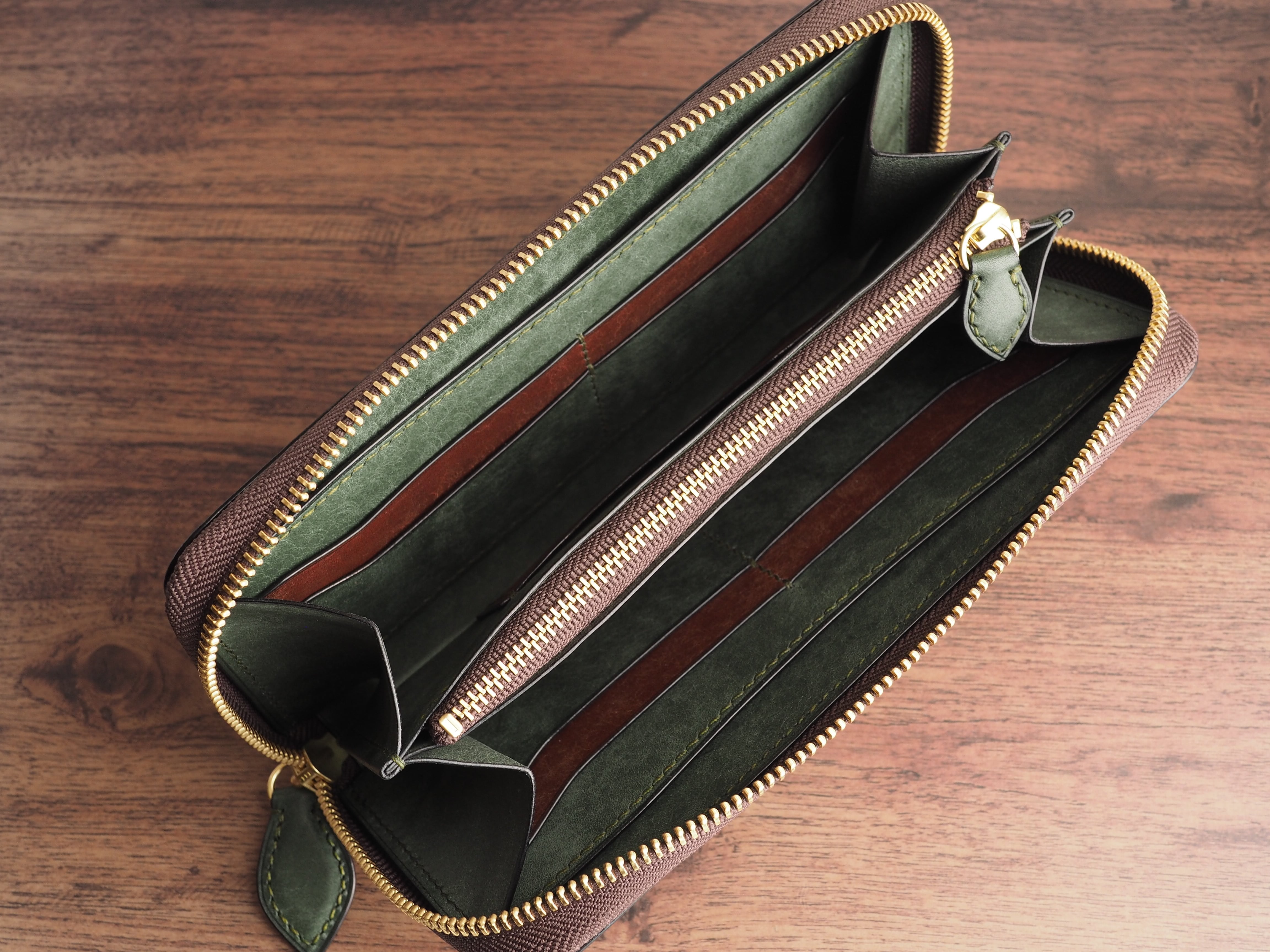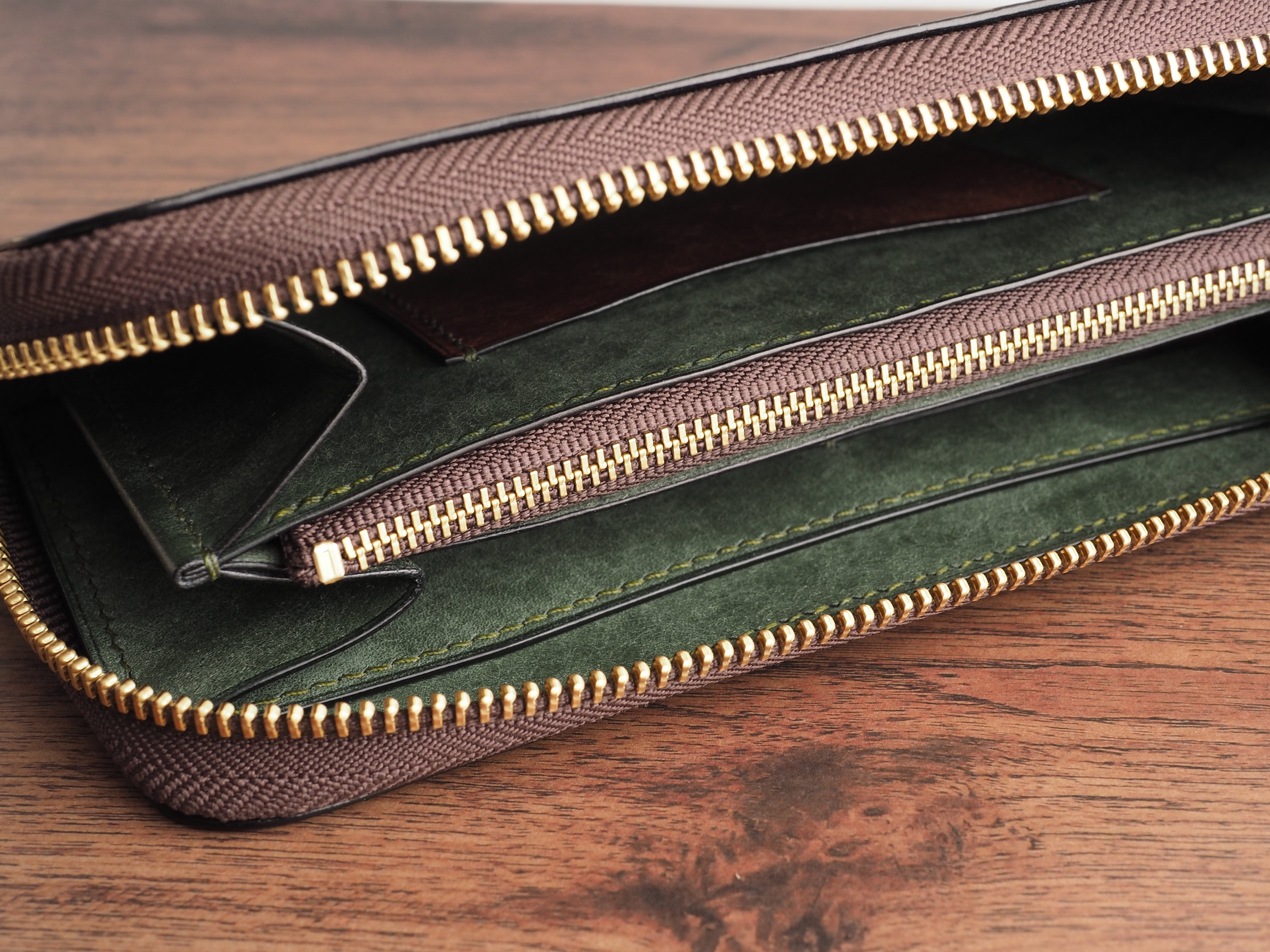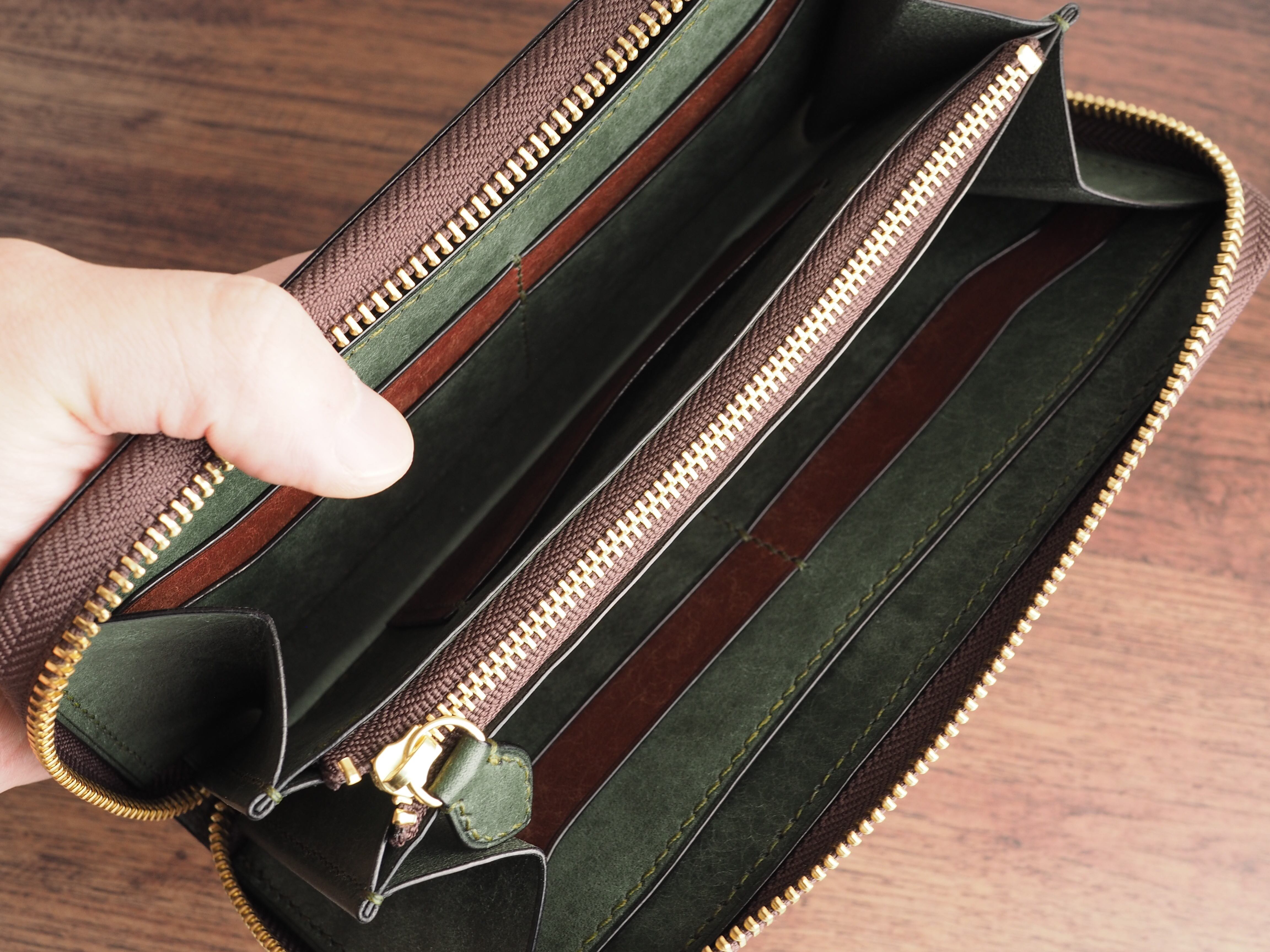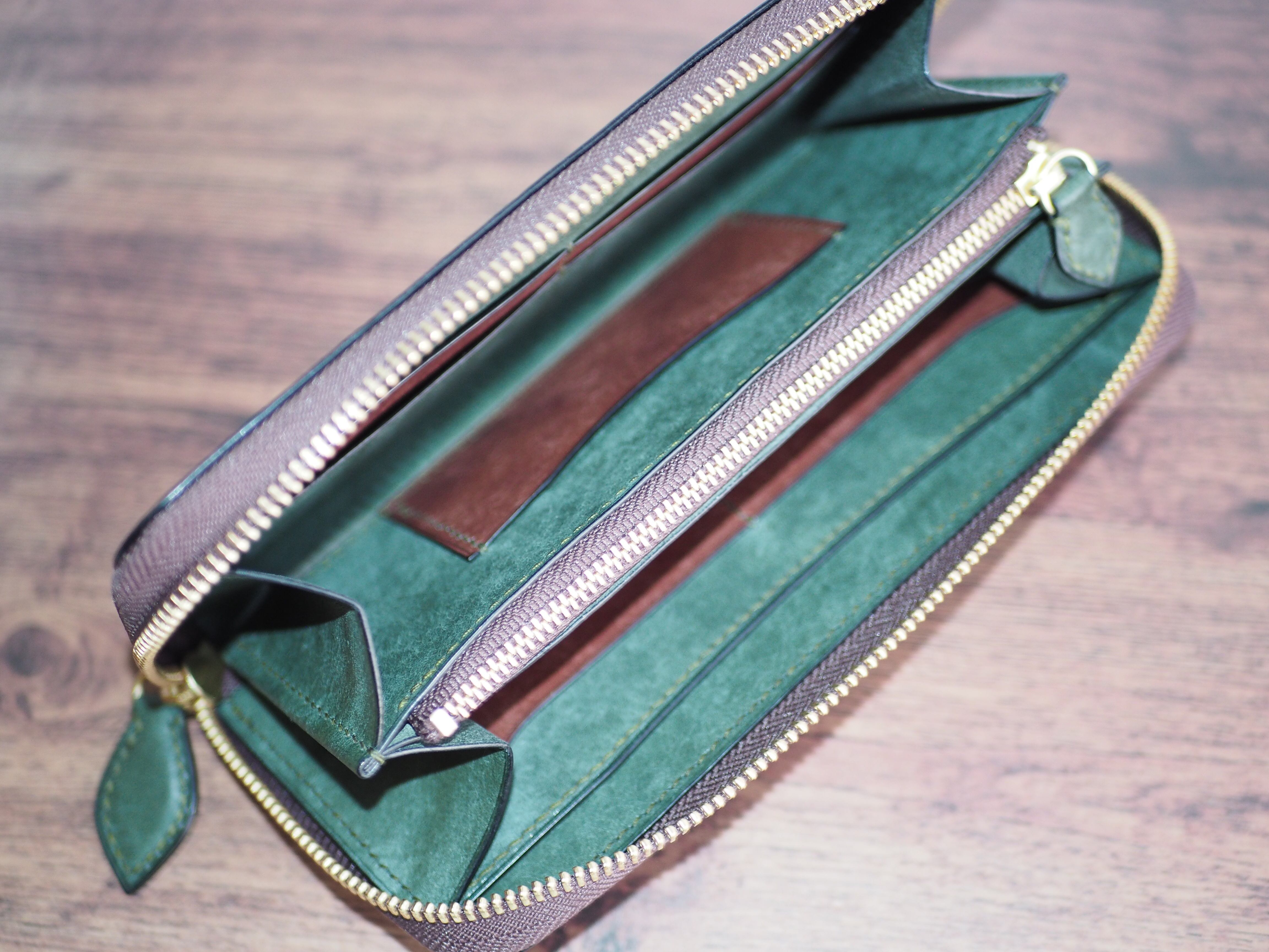 総手縫い│イタリアンレザーマルゴー│ラウンドファスナーの長財布│アローロ(深緑)×ダークブラウン