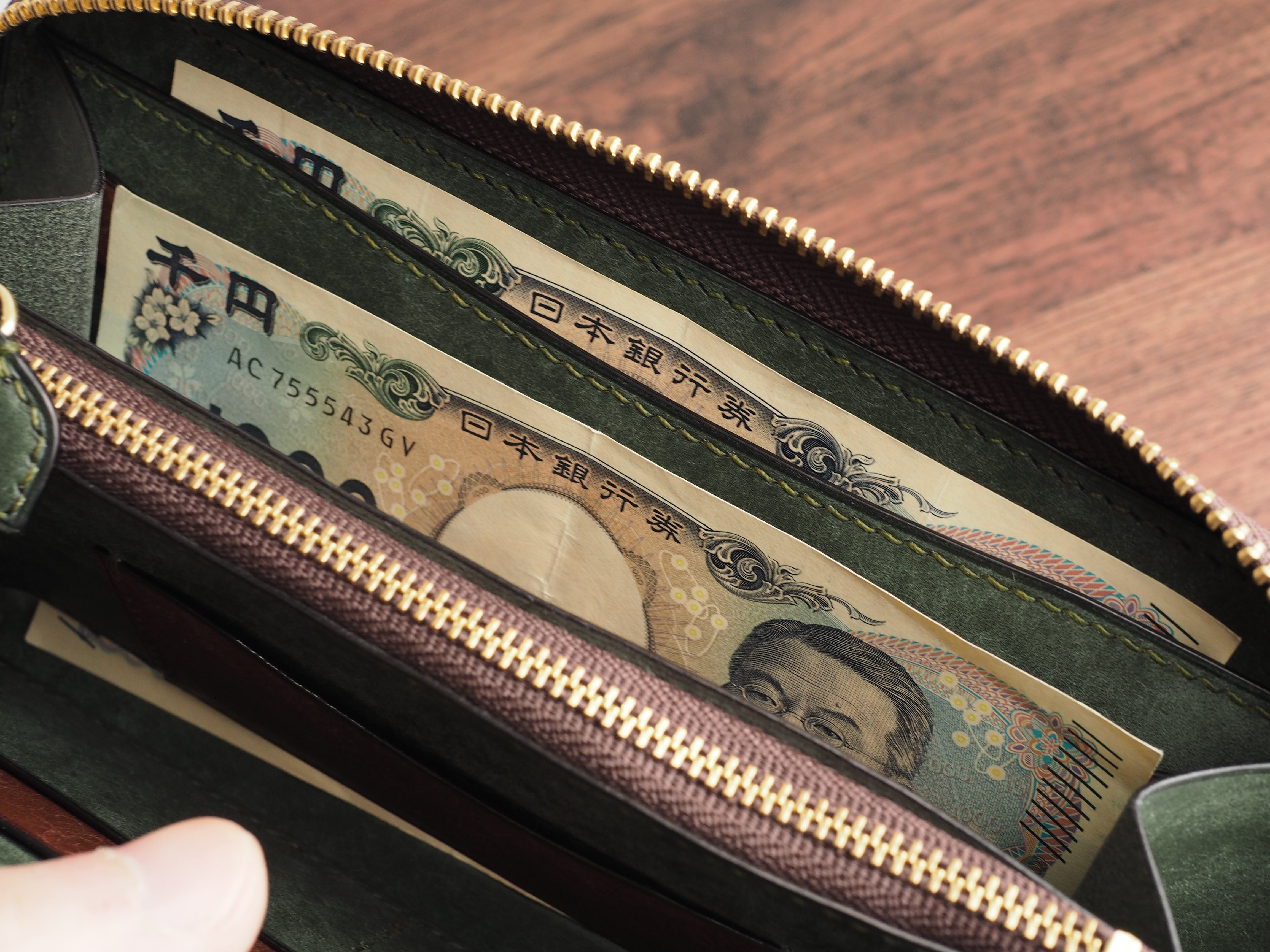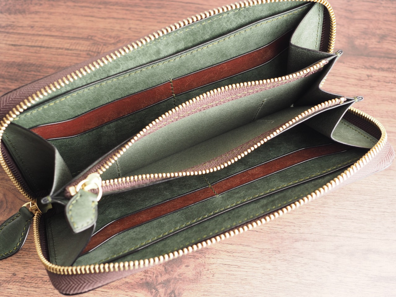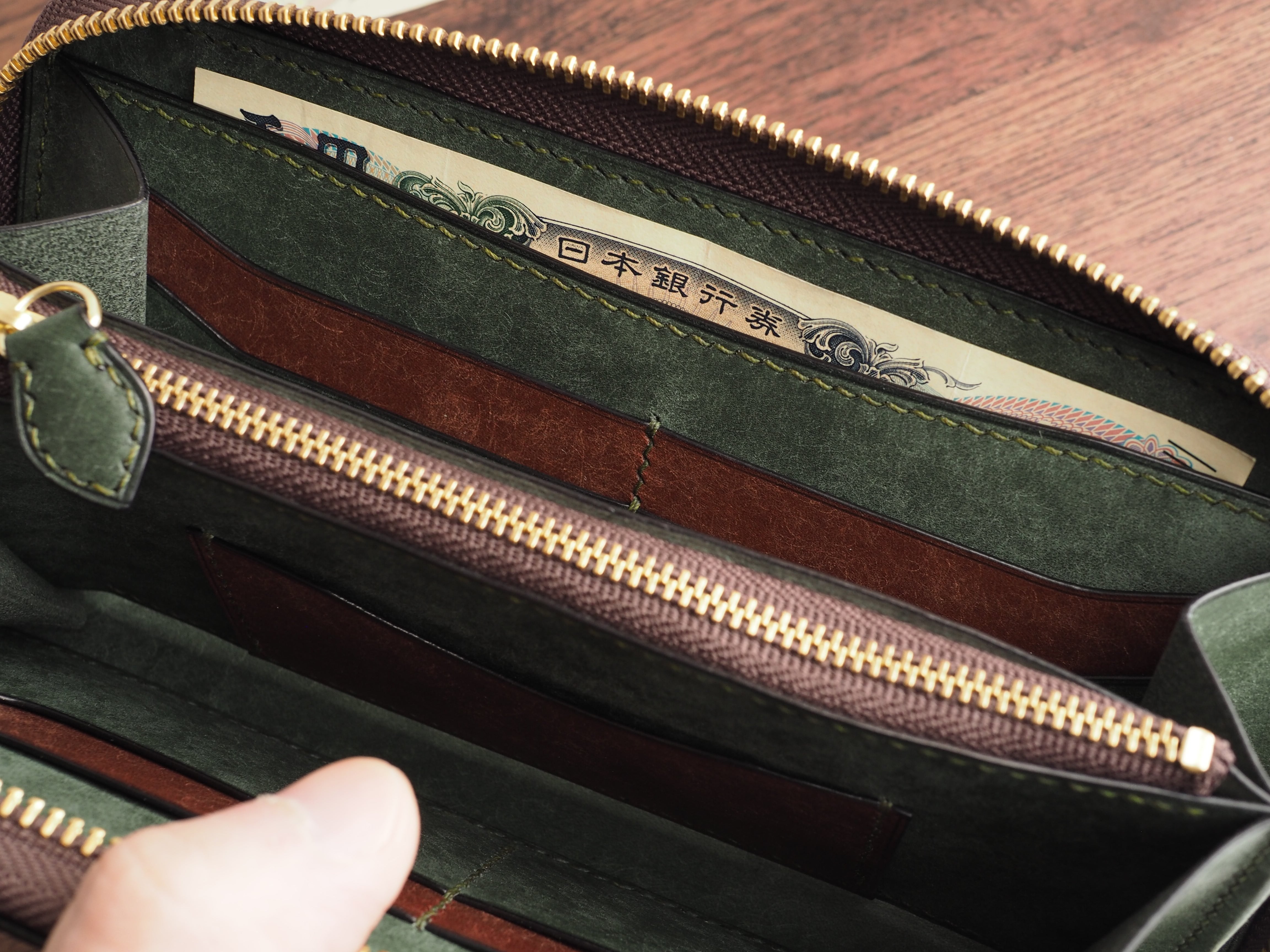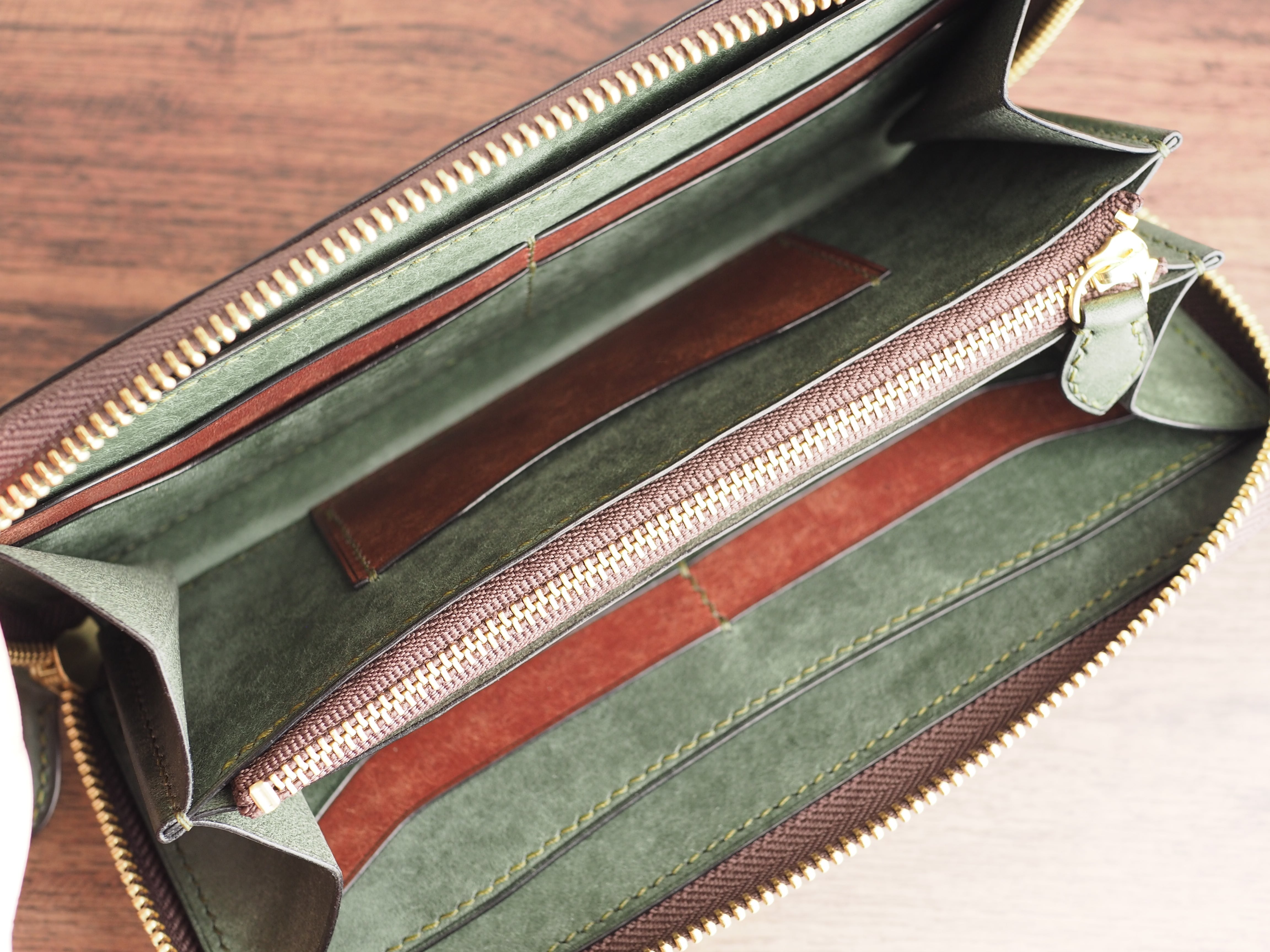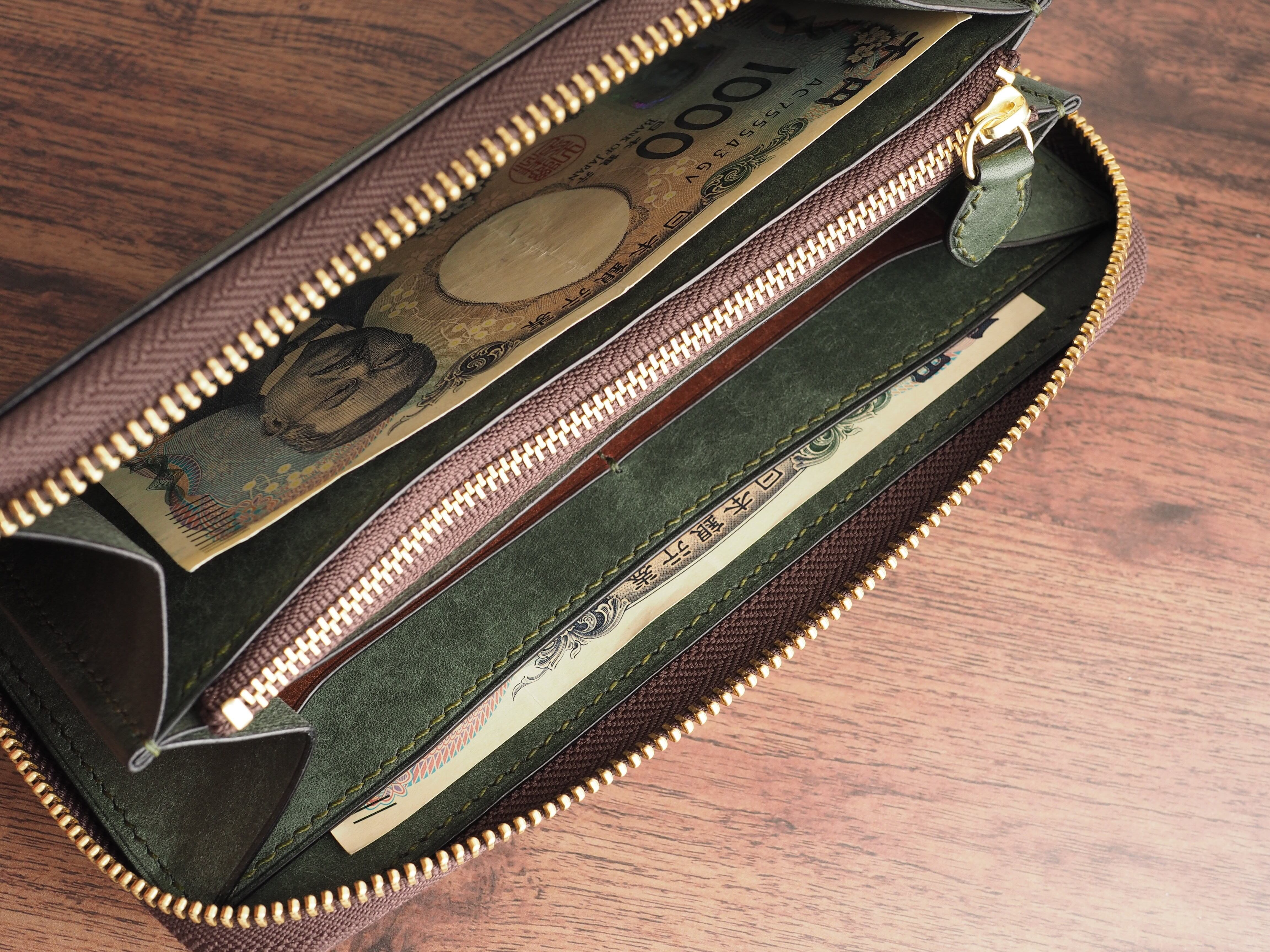 総手縫い│イタリアンレザーマルゴー│ラウンドファスナーの長財布│アローロ(深緑)×ダークブラウン