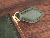 アローロ(深緑)をメインに使用し、カードポケットの一部にダークブラウンを採用。2色の革を配置するバイカラーデザインは、開いた時に豊かな表情を見せ、長く使っても飽きさせません。