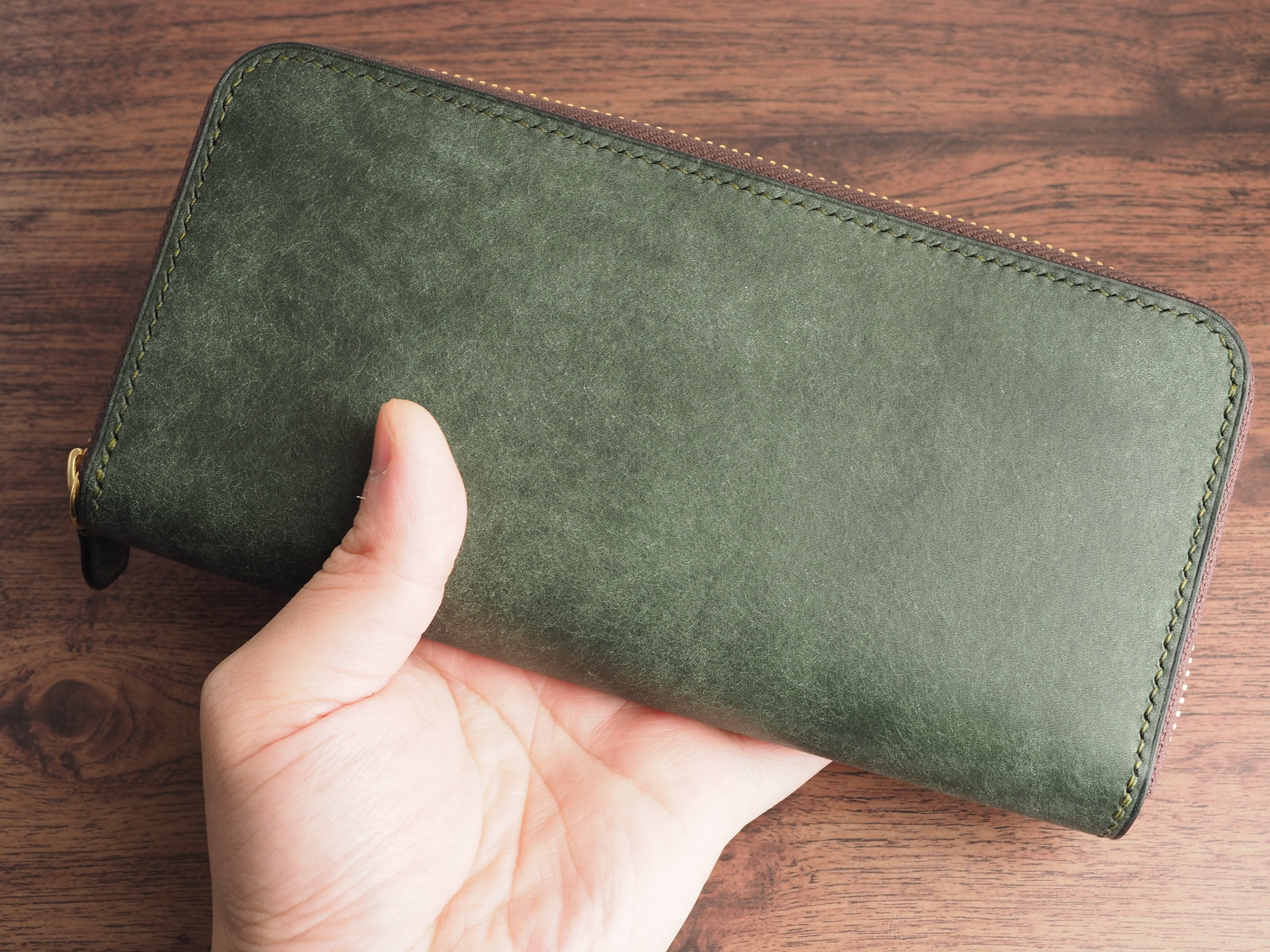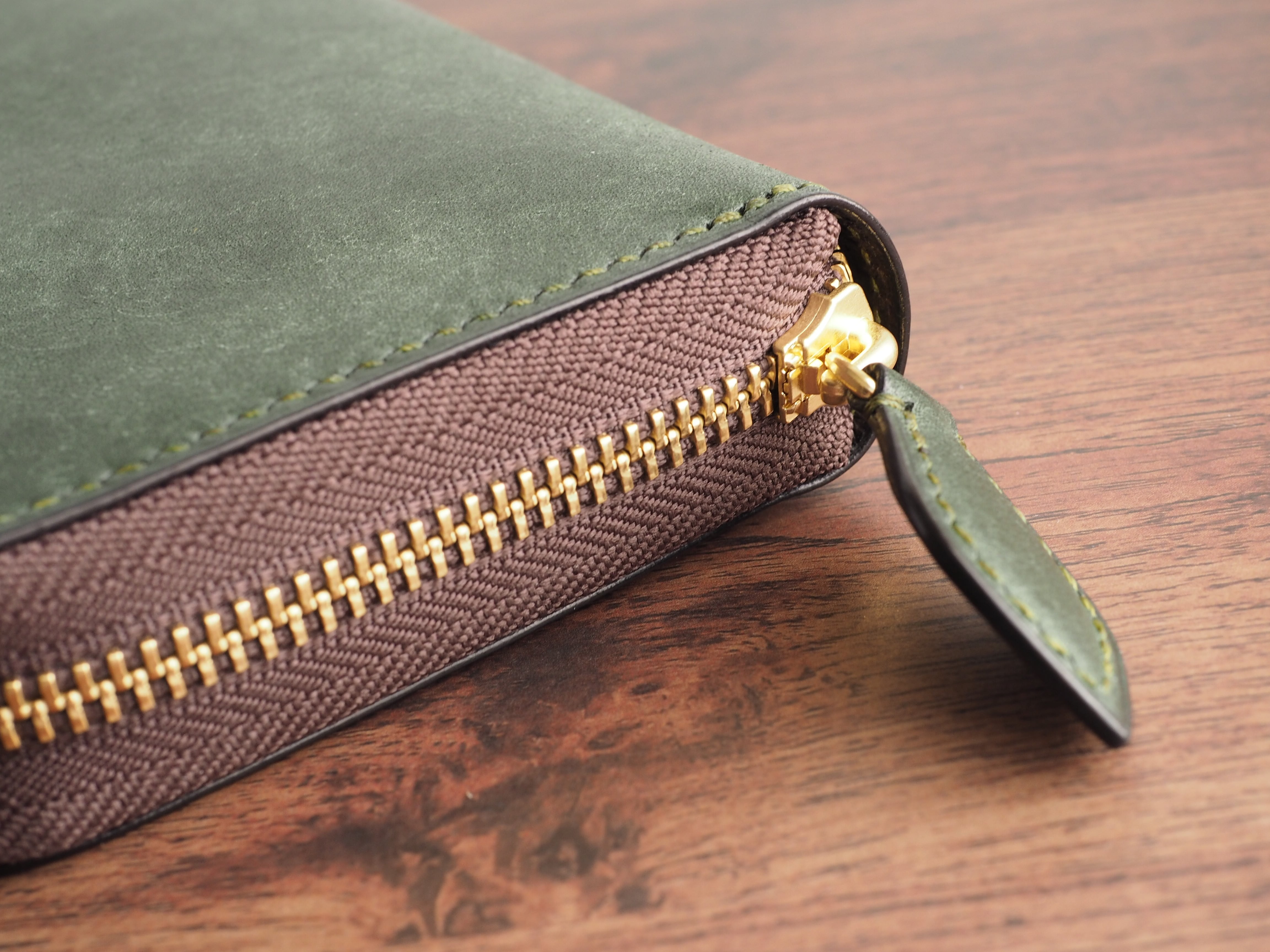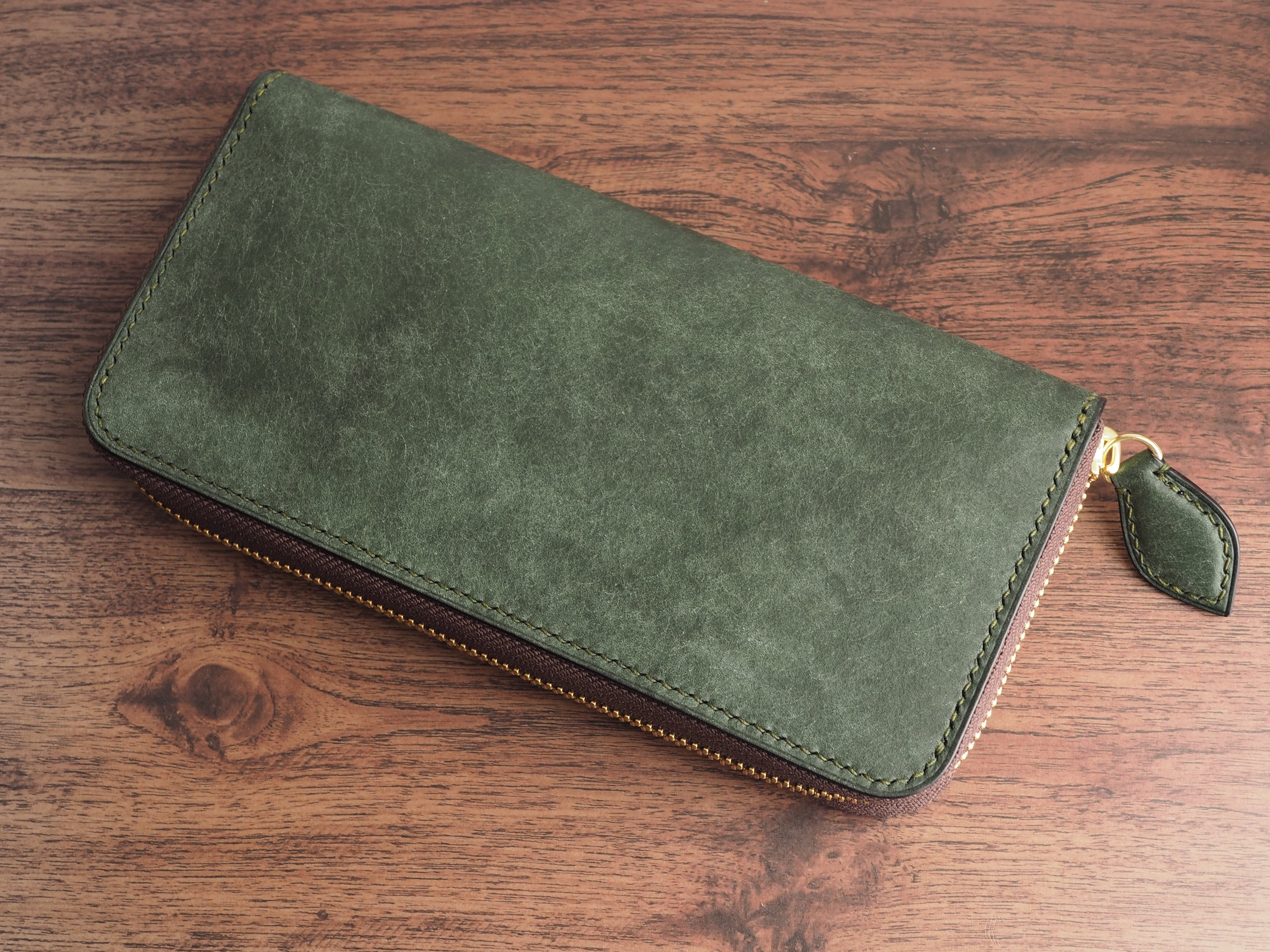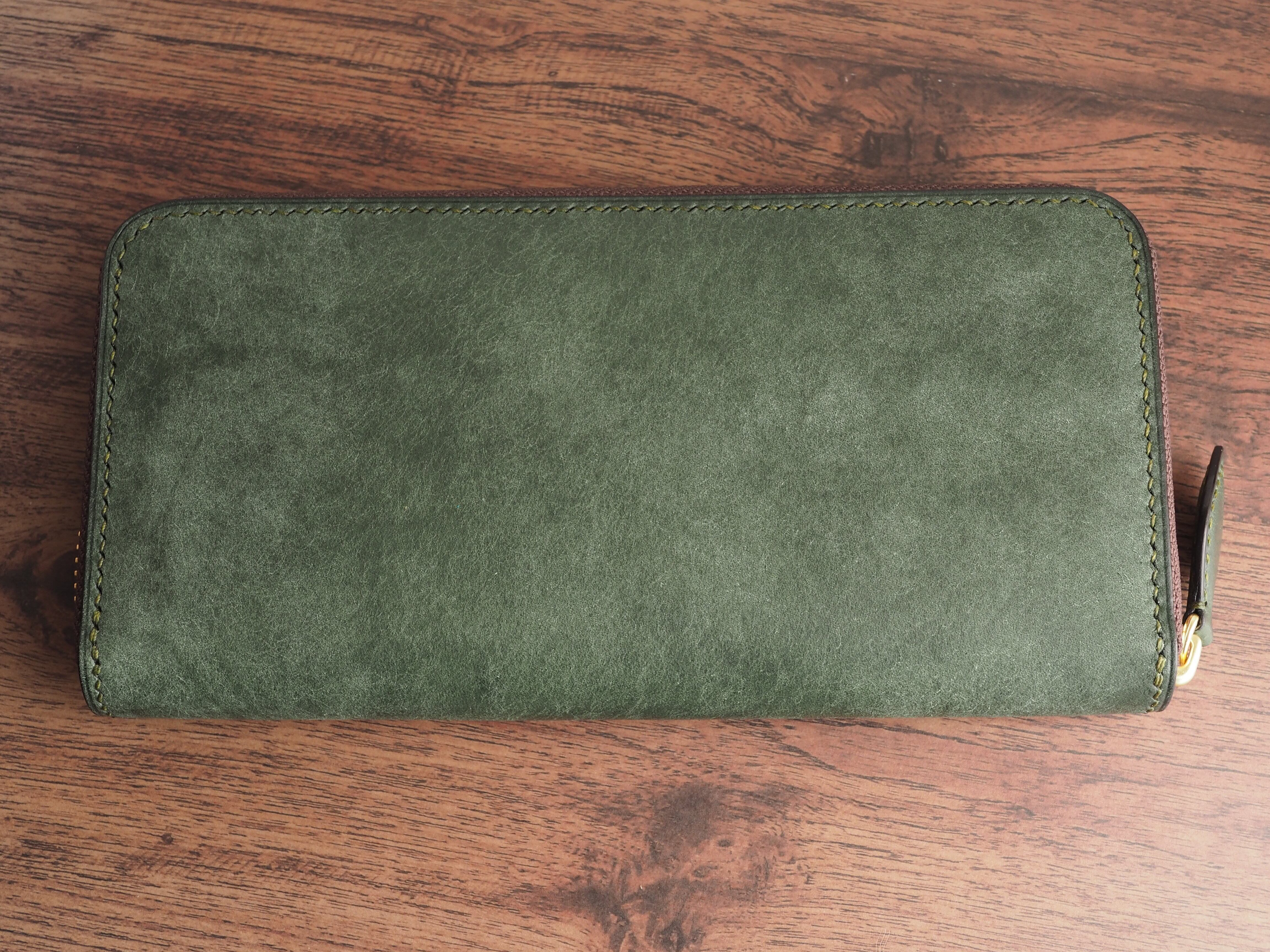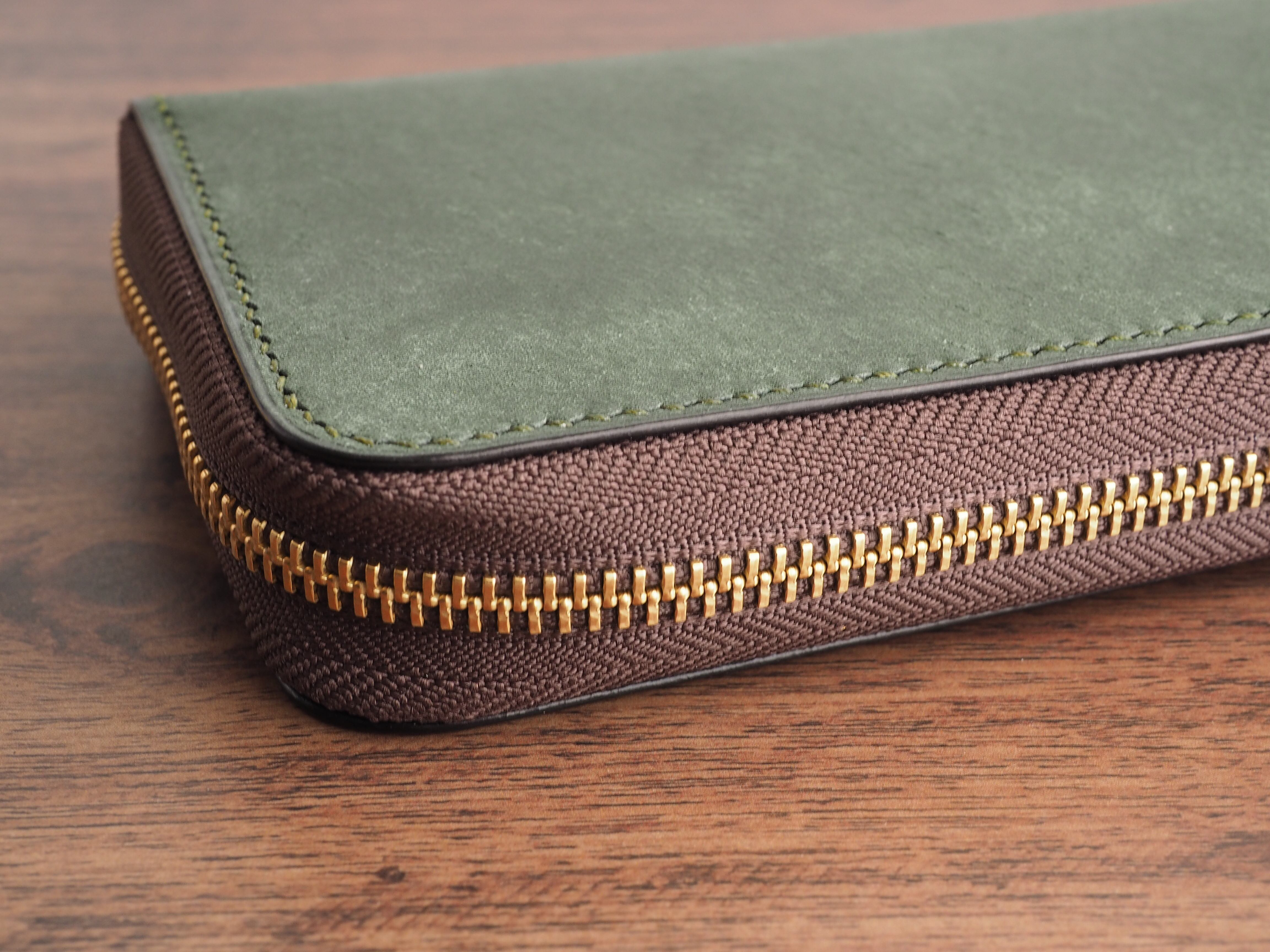 こちらは、稀少なイタリアンレザー「マルゴー」を使用し、手縫いで丁寧に製作したラウンドファスナー長財布です。深みのあるアローロ(深緑)と差し色にダークブラウンを使用しています。エイジングを早く楽しめる、本革好きのための特別な逸品です。