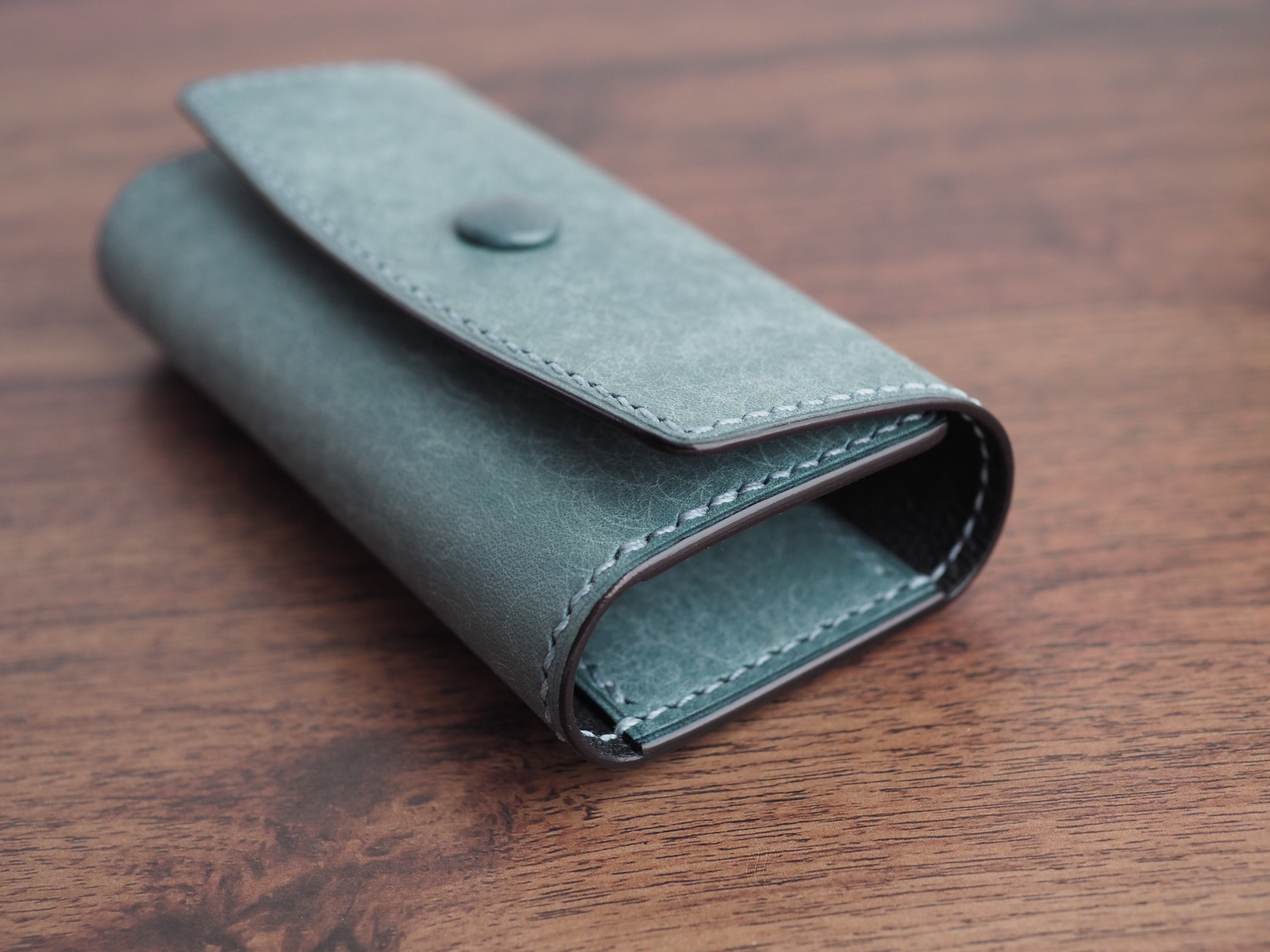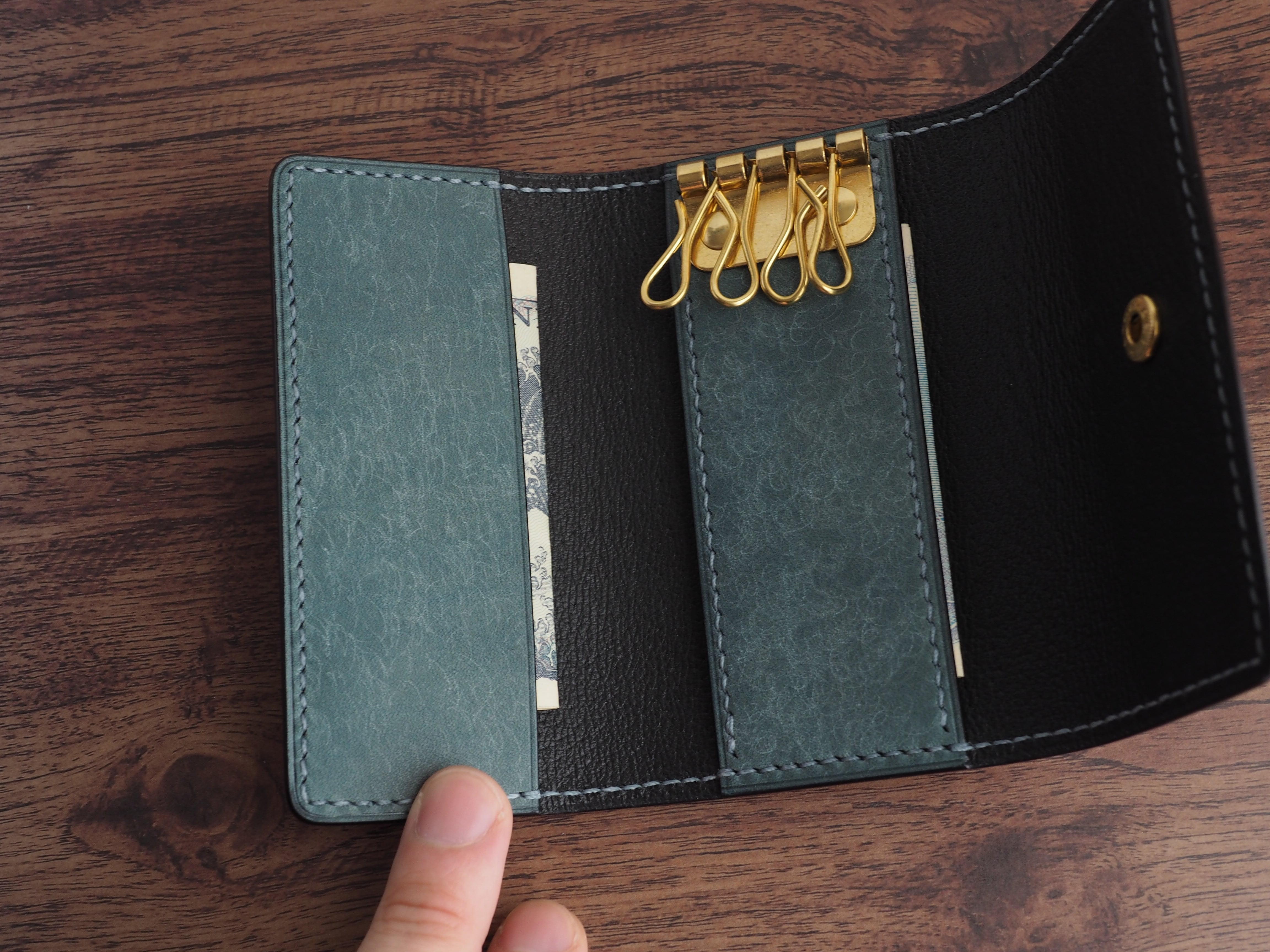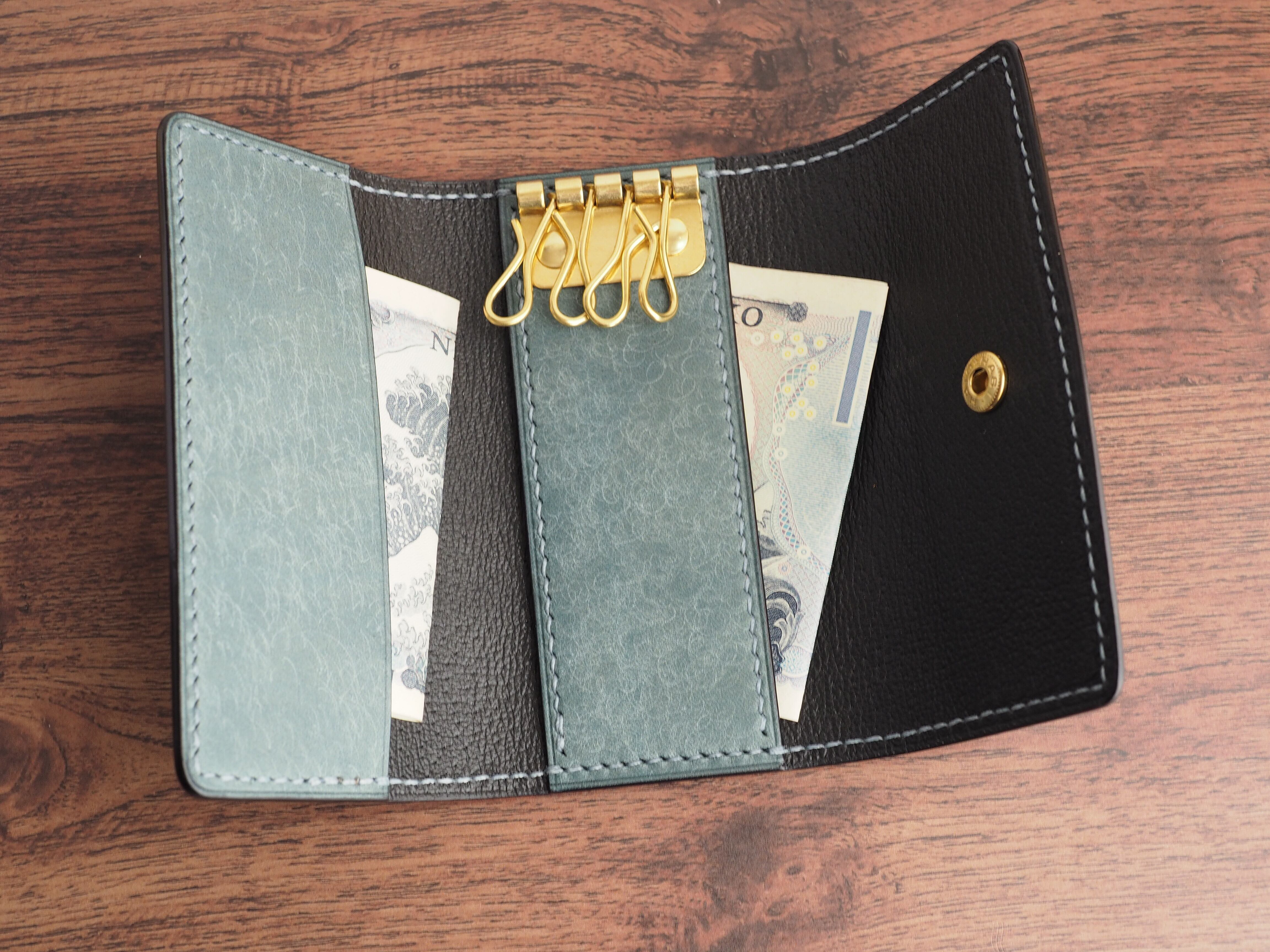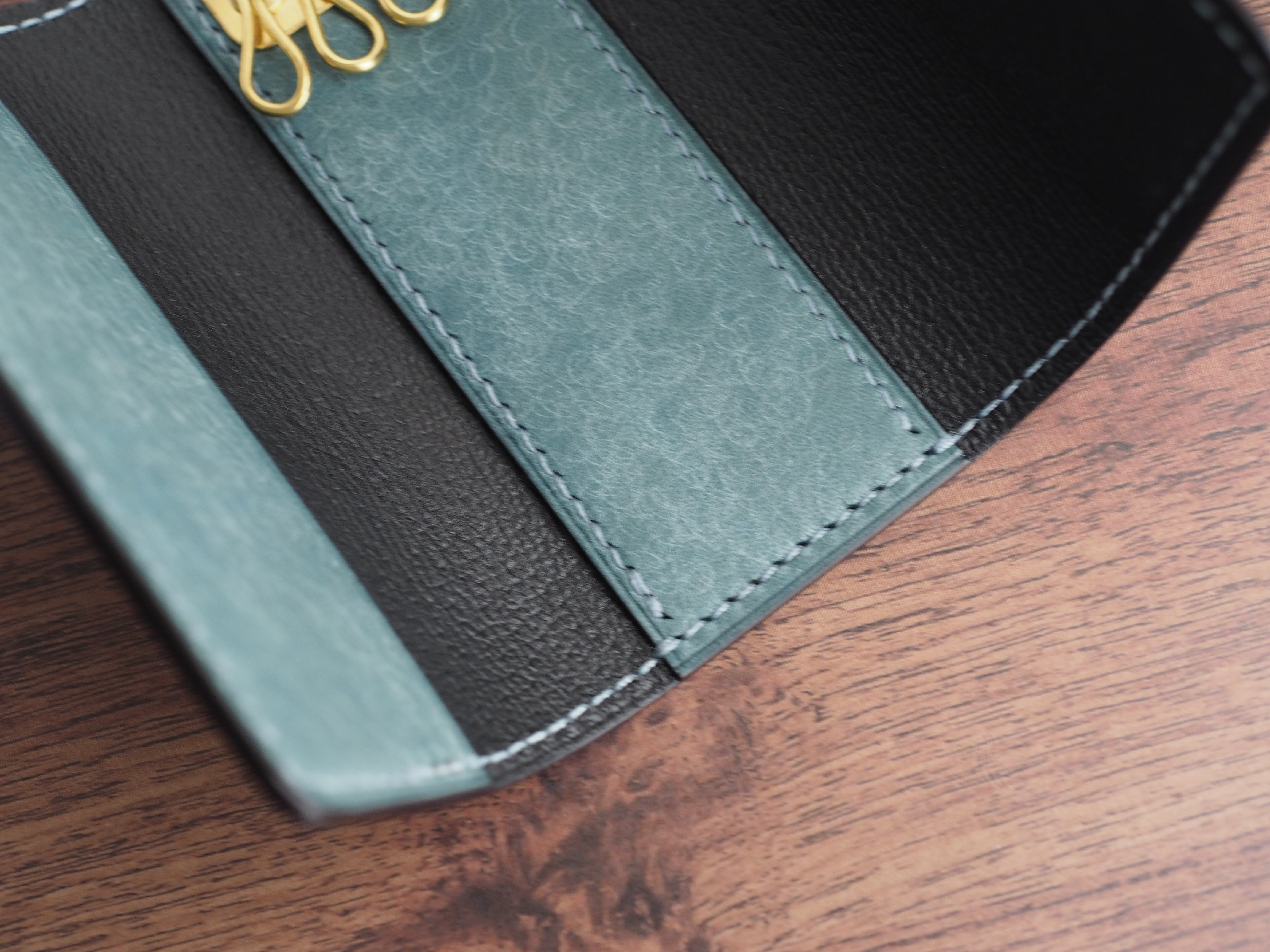 ご覧いただきありがとうございます。イタリアンレザー、マルゴーを使用したキーケースになります。色はアヴィオとアメ豚ソフト(黒)を使い、台湾製の糸、六花0.4mm(ウィンターミスト)で手縫いで仕上げています。
