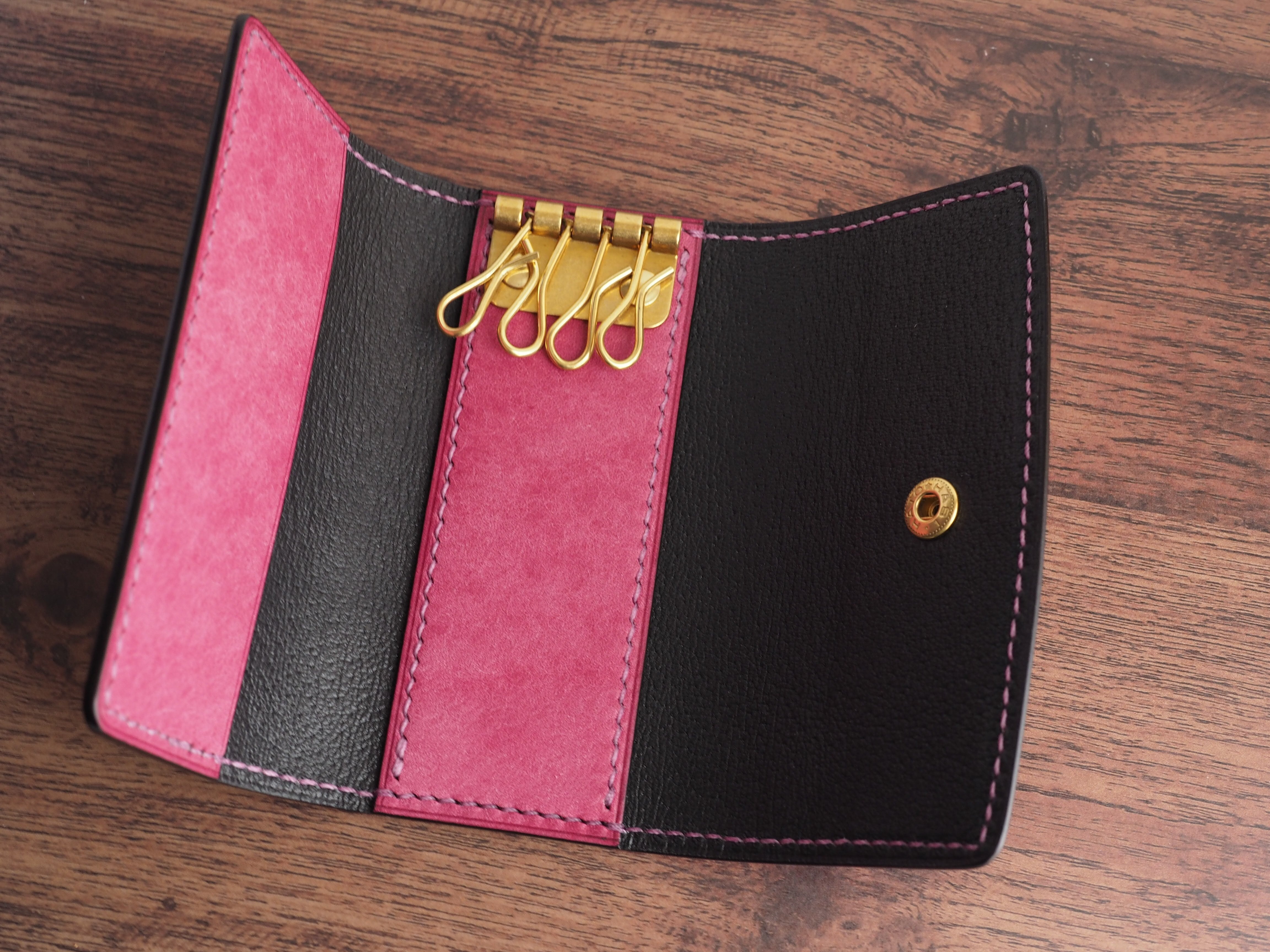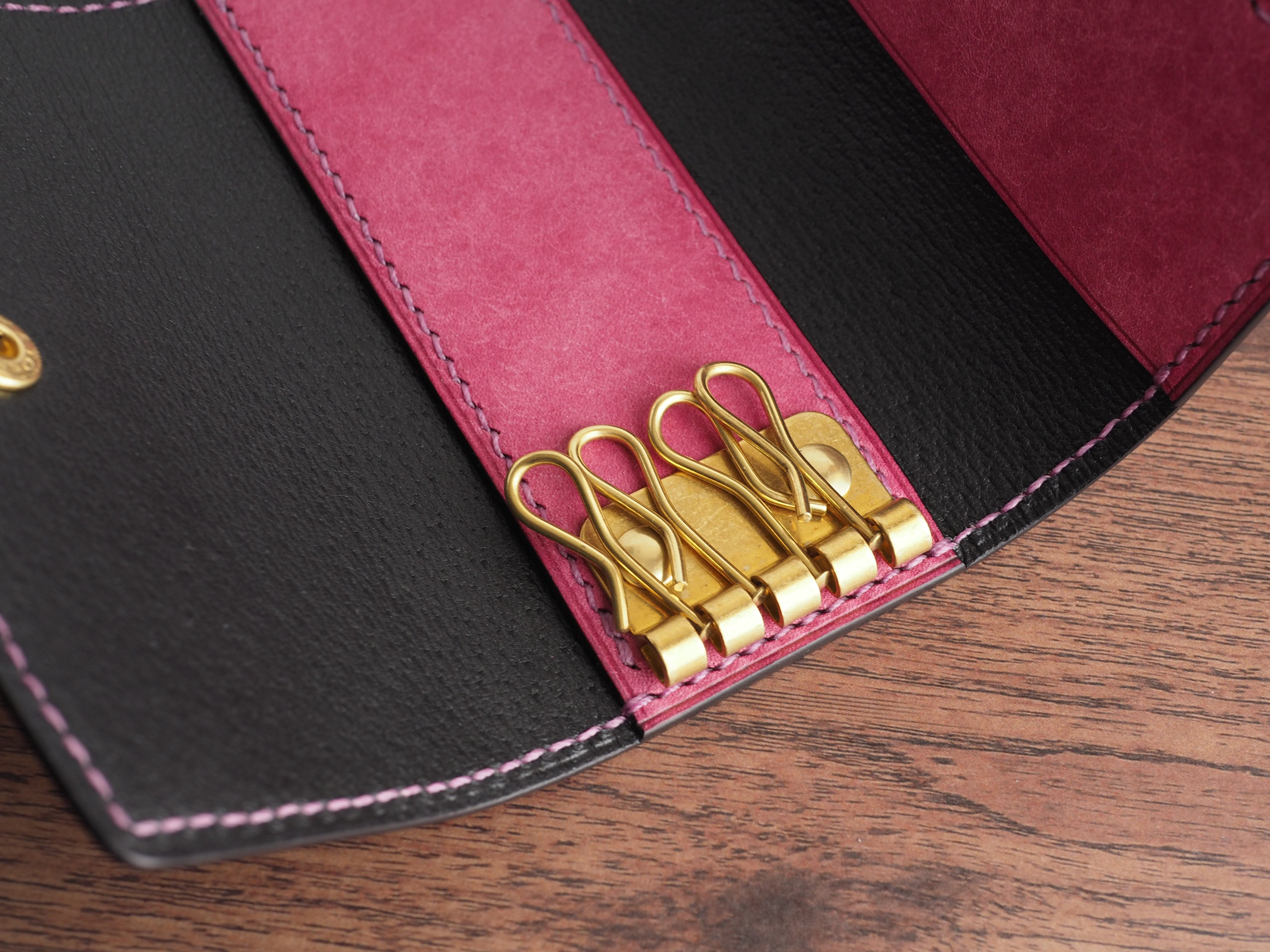 ご覧いただきありがとうございます。イタリアンレザー、マルゴーを使用したキーケースになります。色はリラ(ライラック)とアメ豚ソフト(黒)を使い、台湾製の糸、六花0.4mm(ライラック)で手縫いで仕上げています。