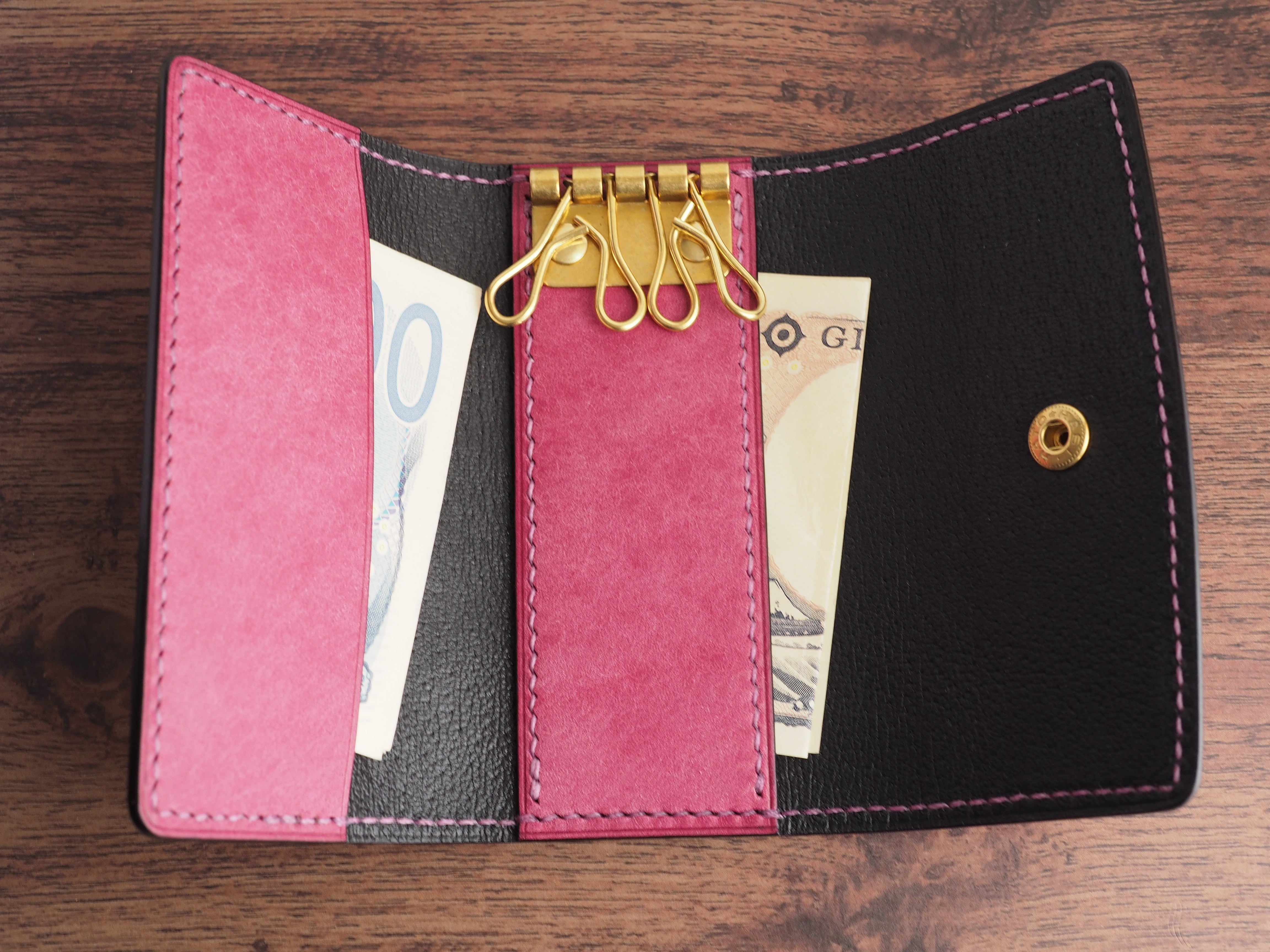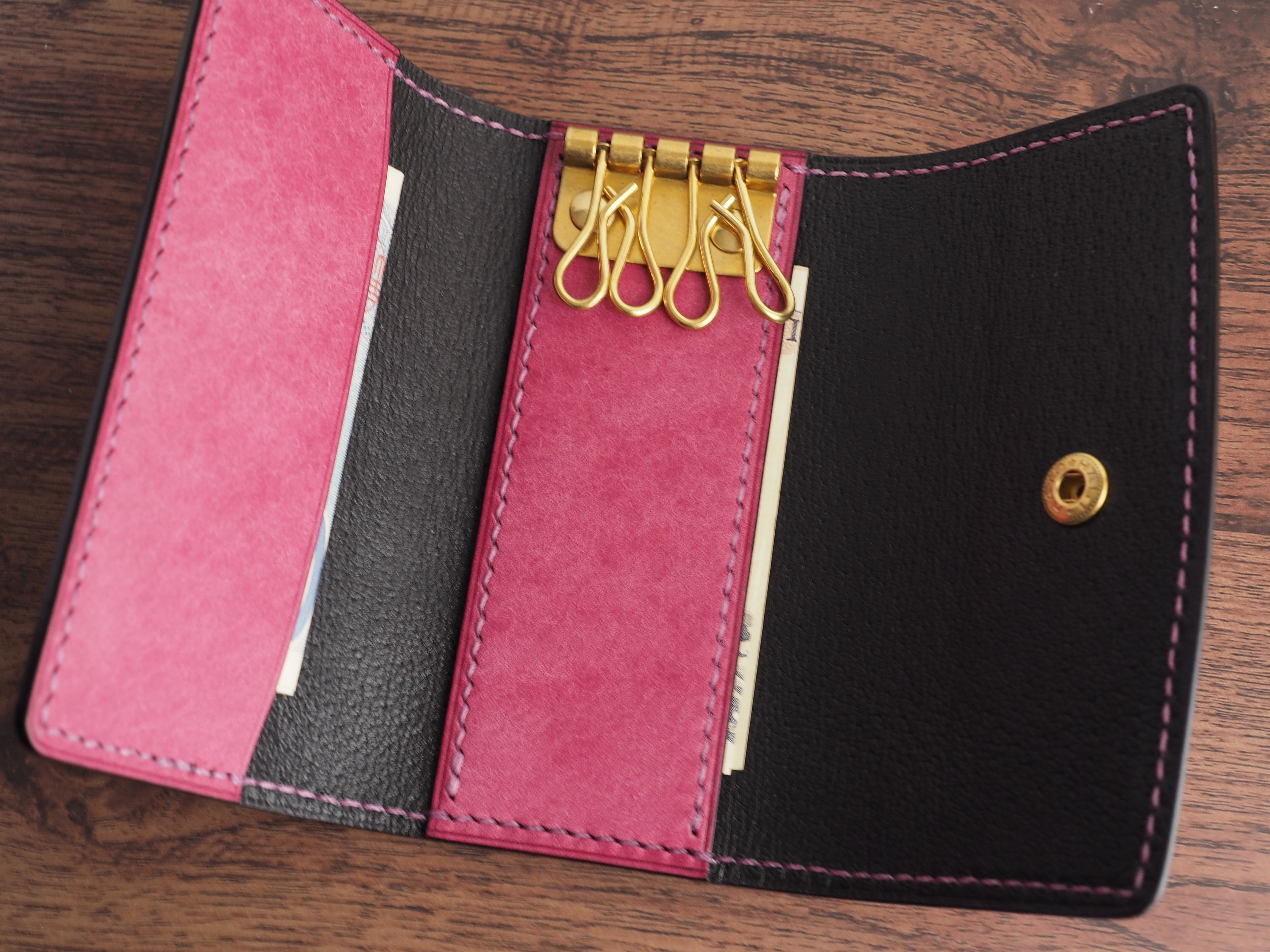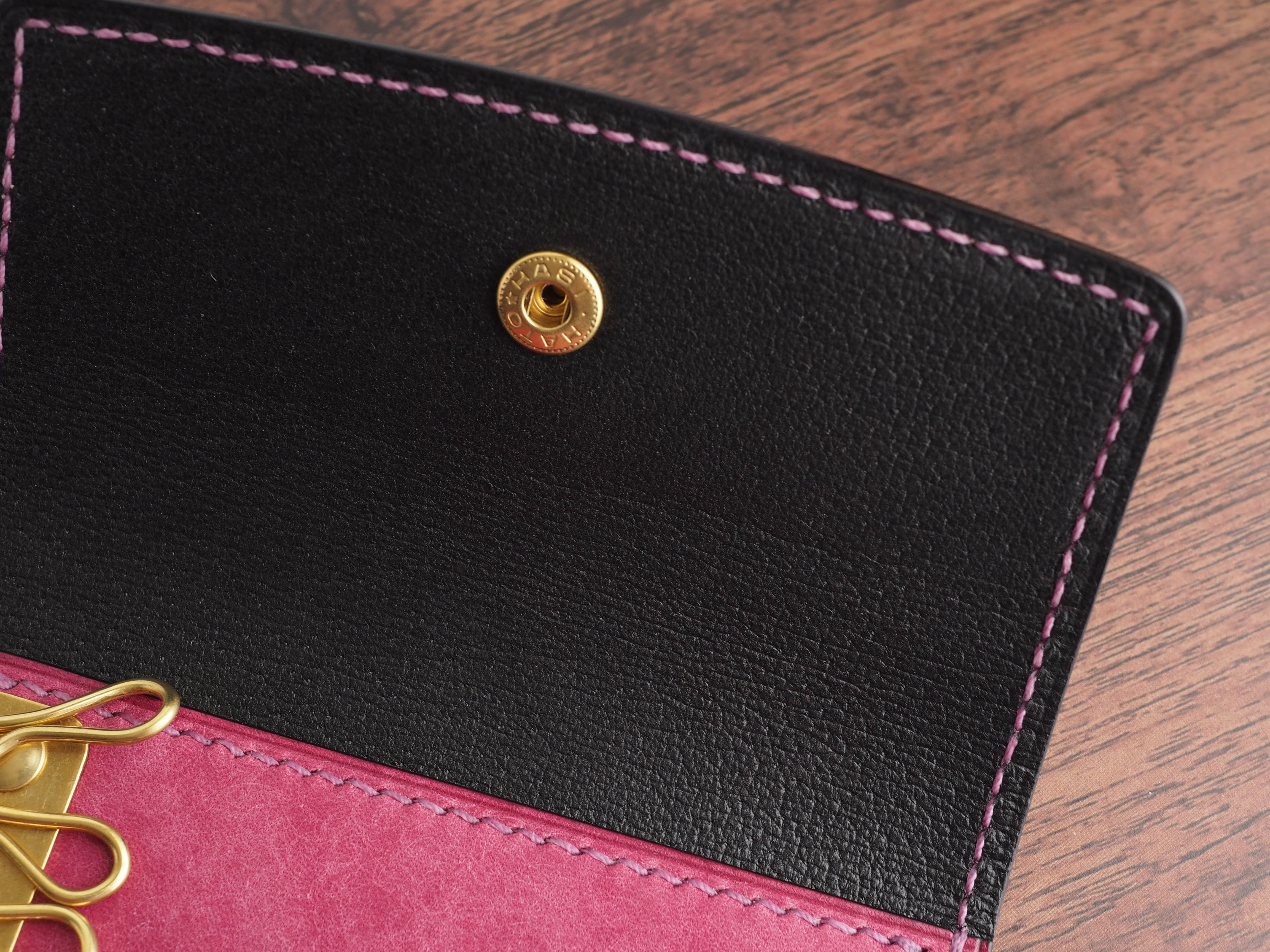・かぶせ、キーケースの台座に芯材(ボンテックス0.4㎜)をいれた多層構造になっており型崩れしにくいコシと柔軟性を確保しています。
