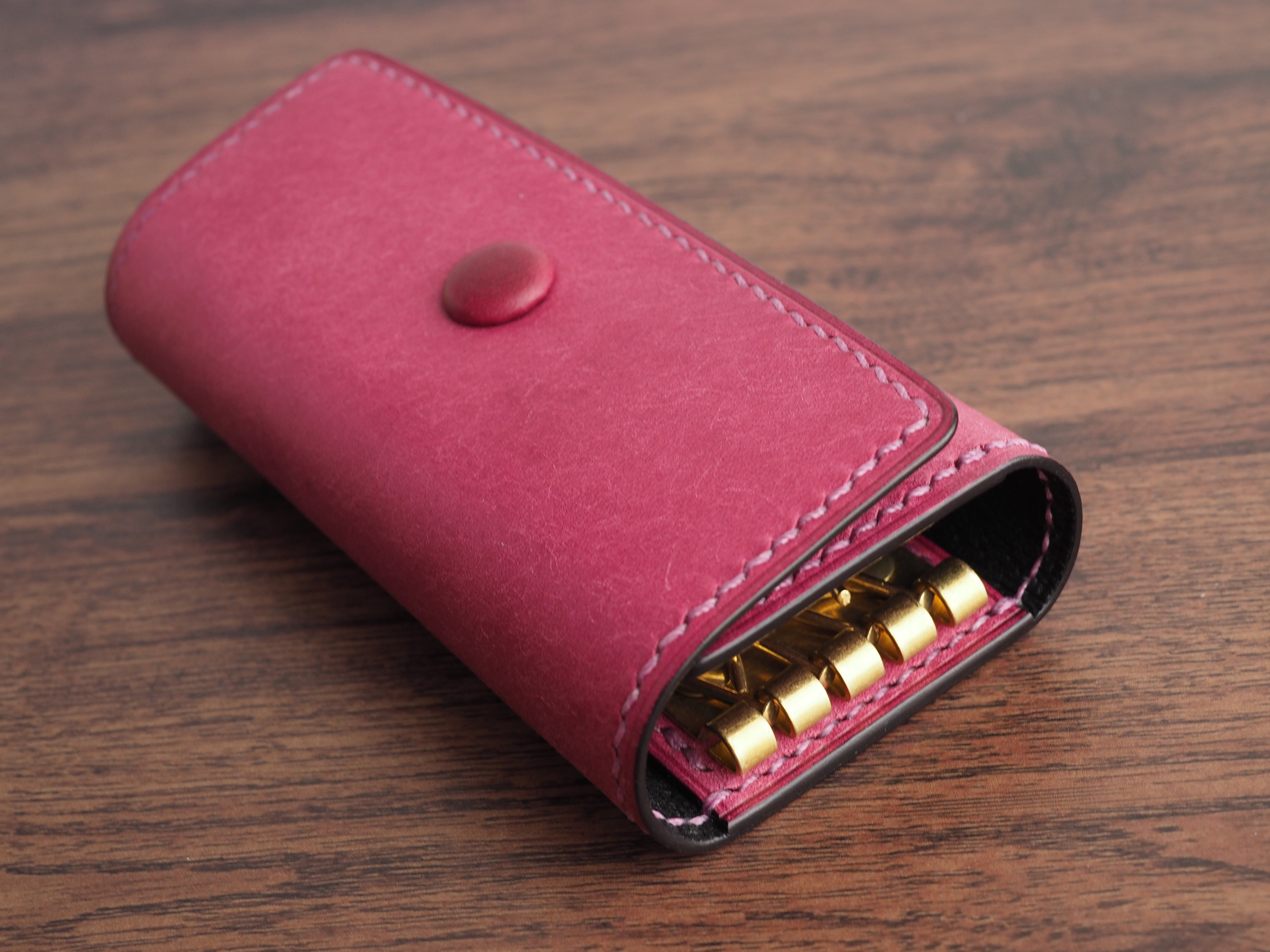 総手縫い│マルゴー│真鍮金具の四連キーケース│くるみボタン仕様│リラ(ライラック)